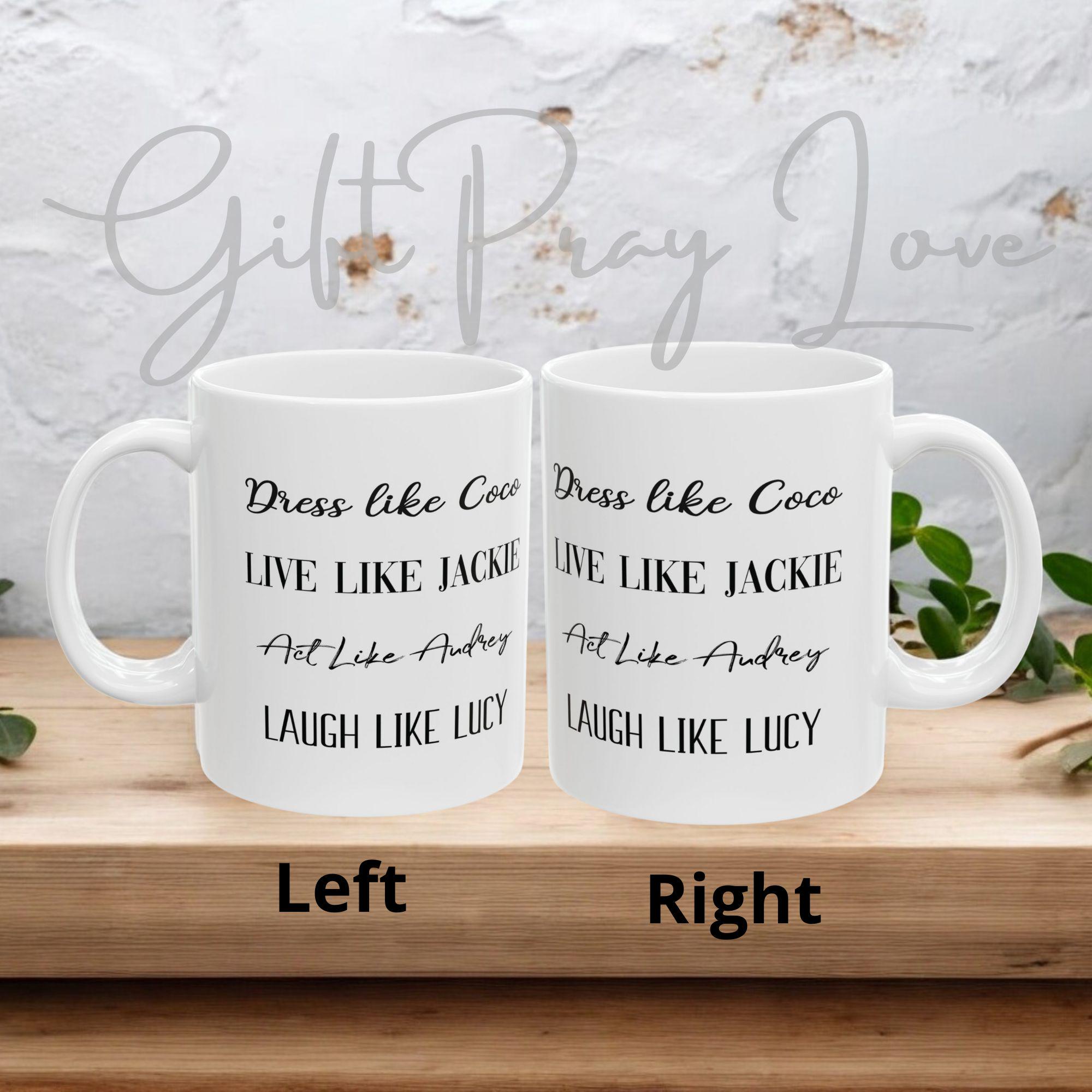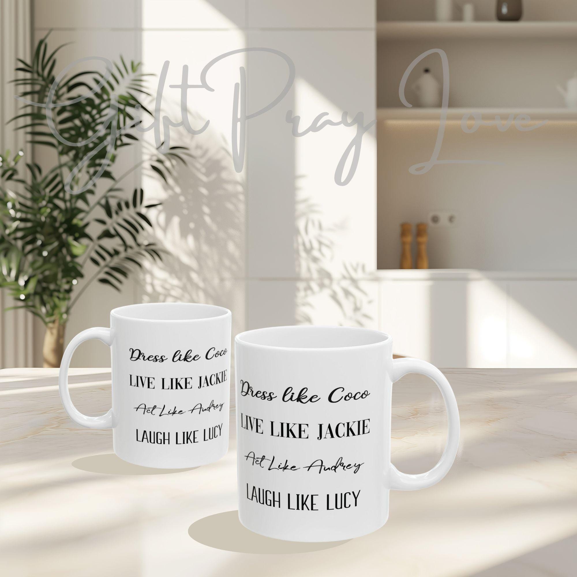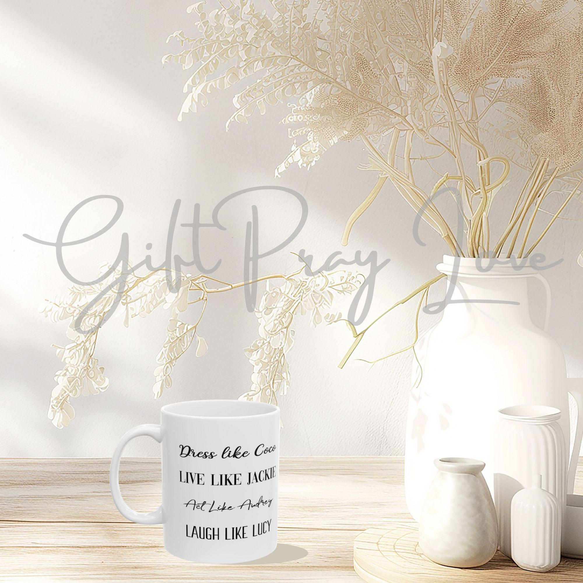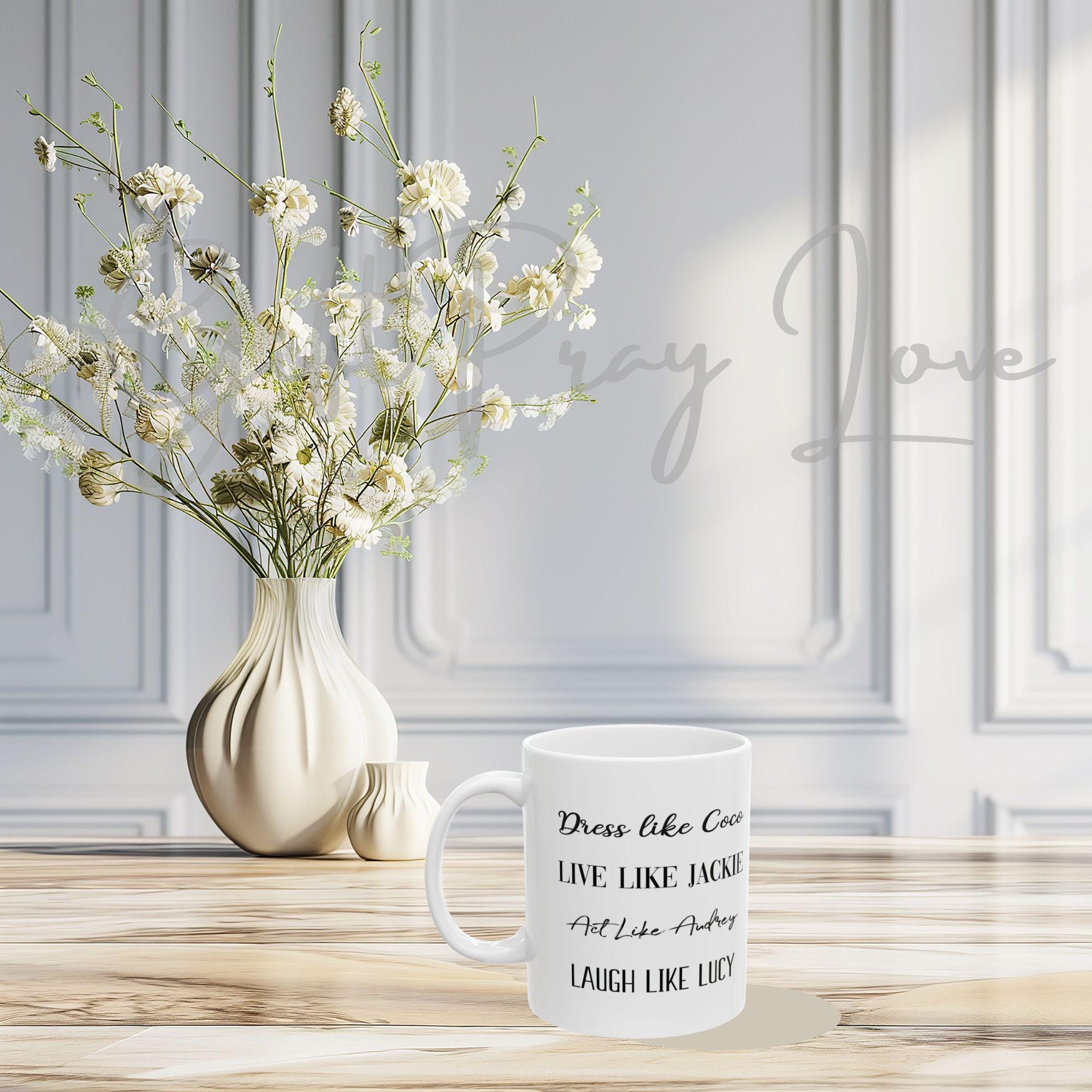 Introducing our stunning coffee mug featuring the legendary Coco, Jackie, Audrey, and Lucy, all icons of our time. Sip your morning brew in style with this captivating mug that pays homage to these timeless inspirational beauties. Crafted with high-quality materials, this mug ensures durability and a comfortable grip. Perfect for adding a touch of elegance to your morning routine or gifting to the vintage enthusiast in your life. Embrace the charm and sophistication of these iconic women as you indulge in your favorite hot beverage. Start your day with a dose of inspiration and glamour – grab this coffee mug today!