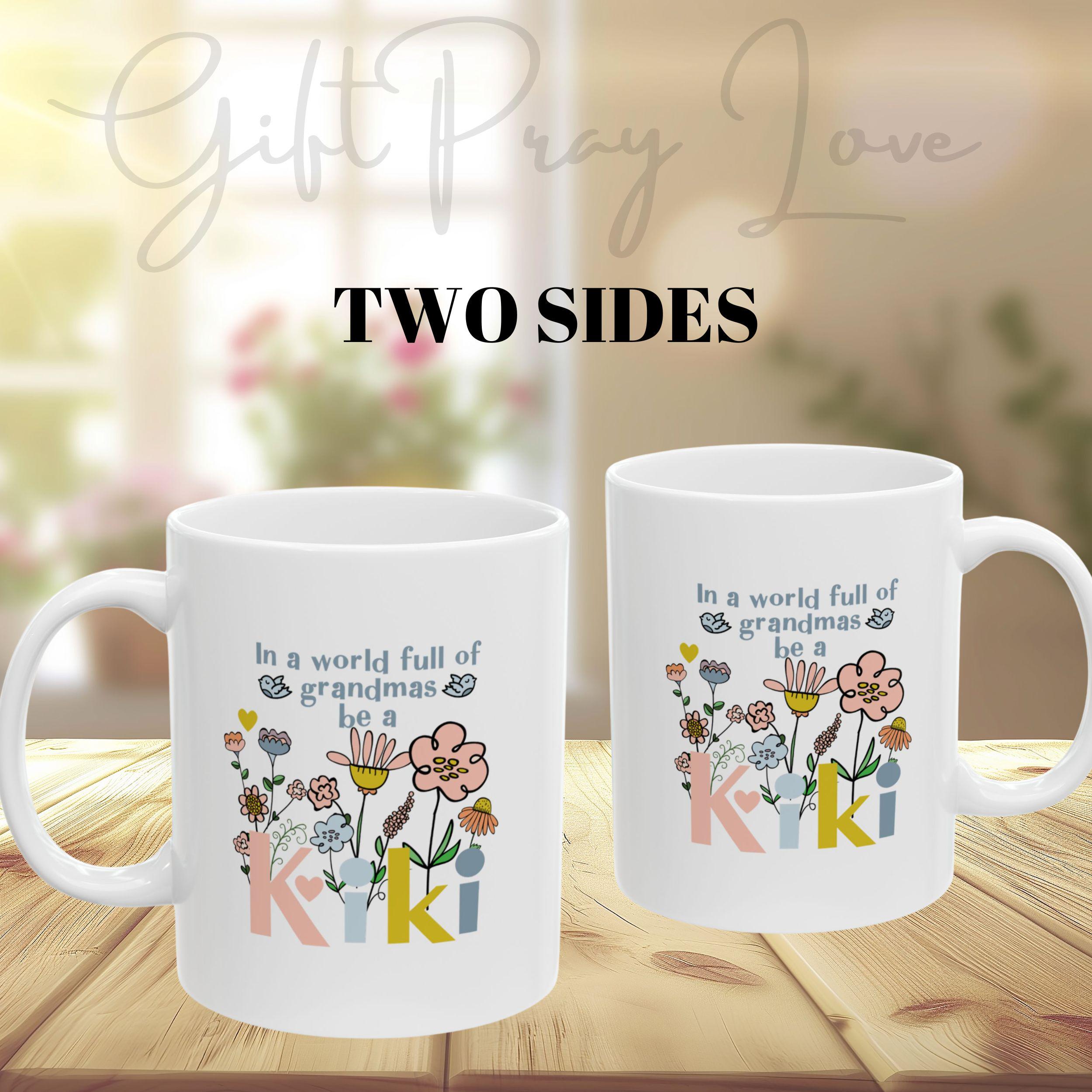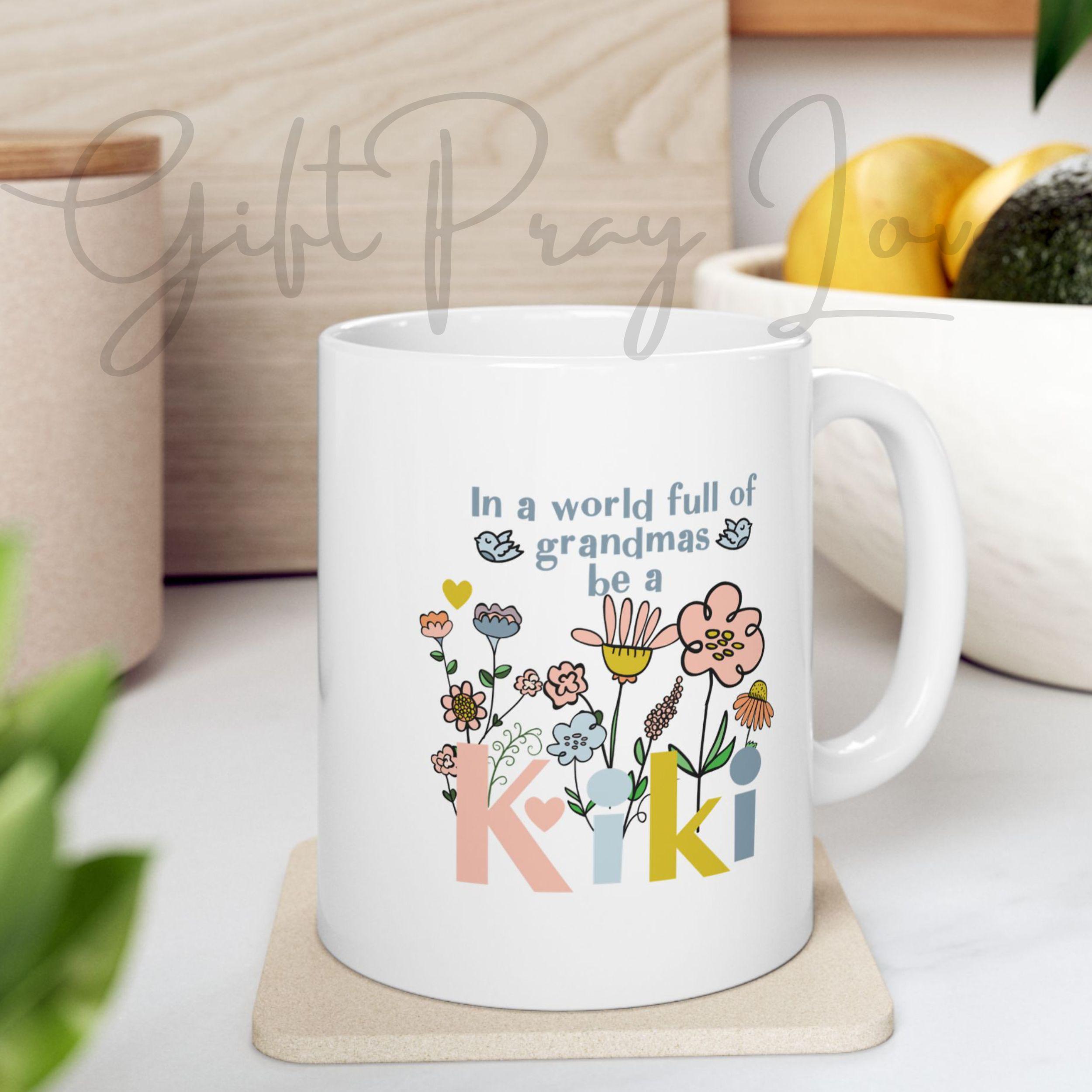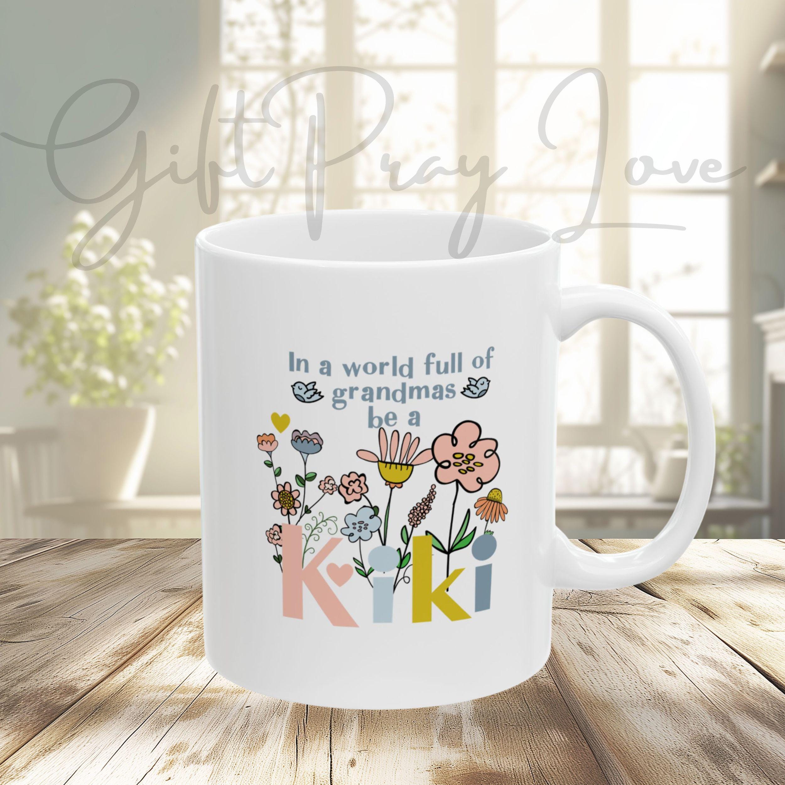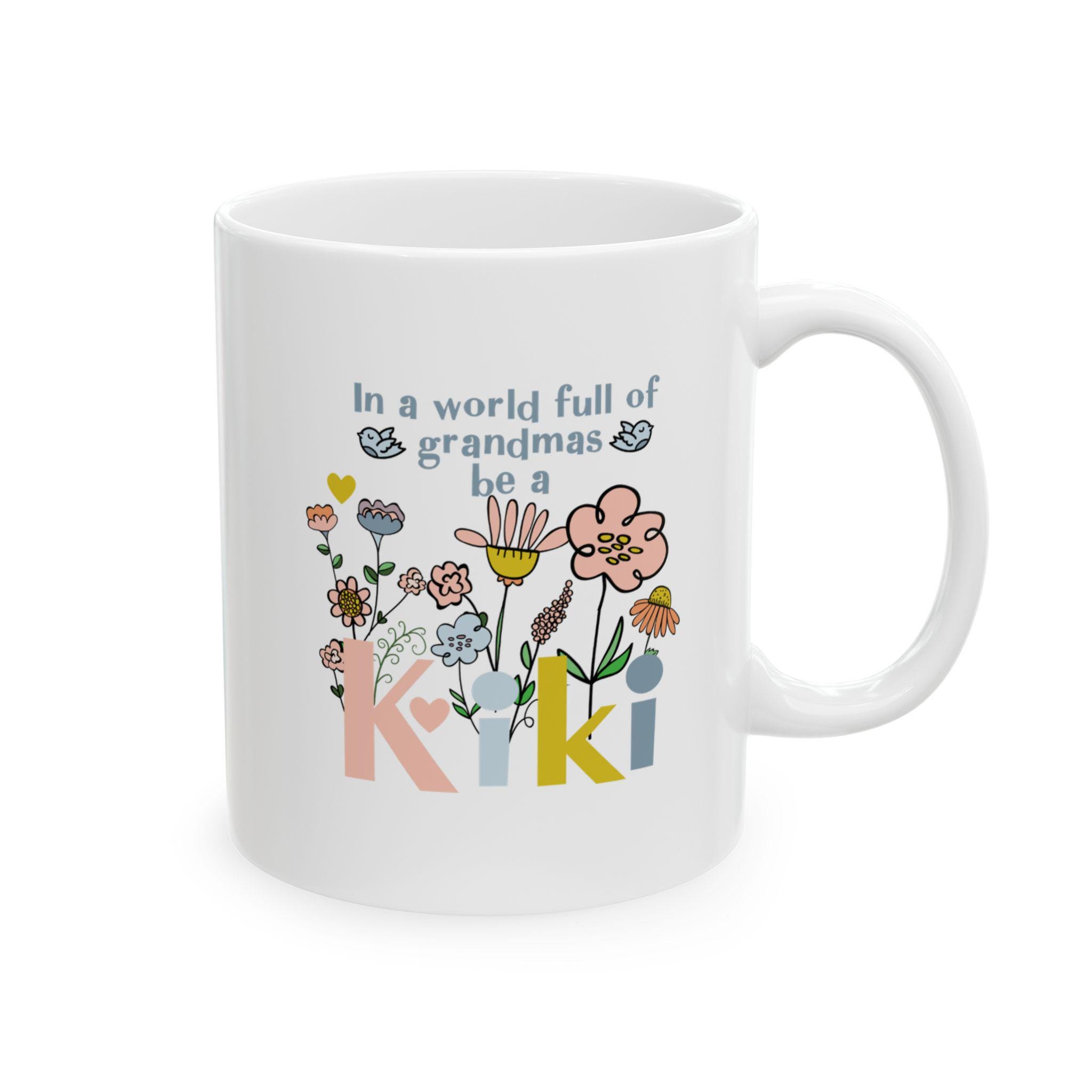 Celebrate your favorite grandmother with this vibrant “Kiki” coffee mug, featuring a fun, modern floral design bursting with color and joy. Whether she’s sipping morning coffee, tea, or cocoa, this mug will bring a smile to her face with every cup.