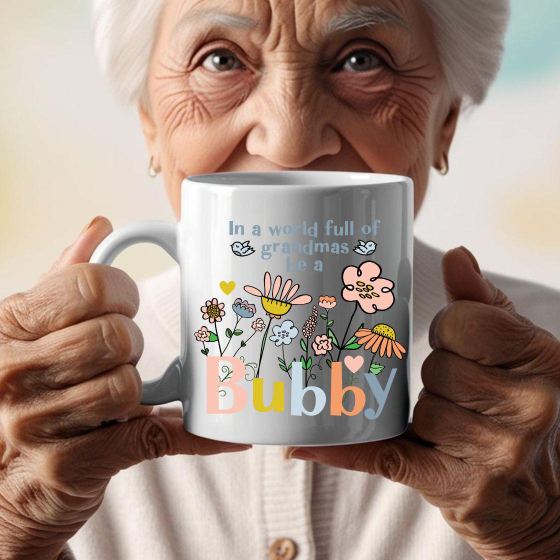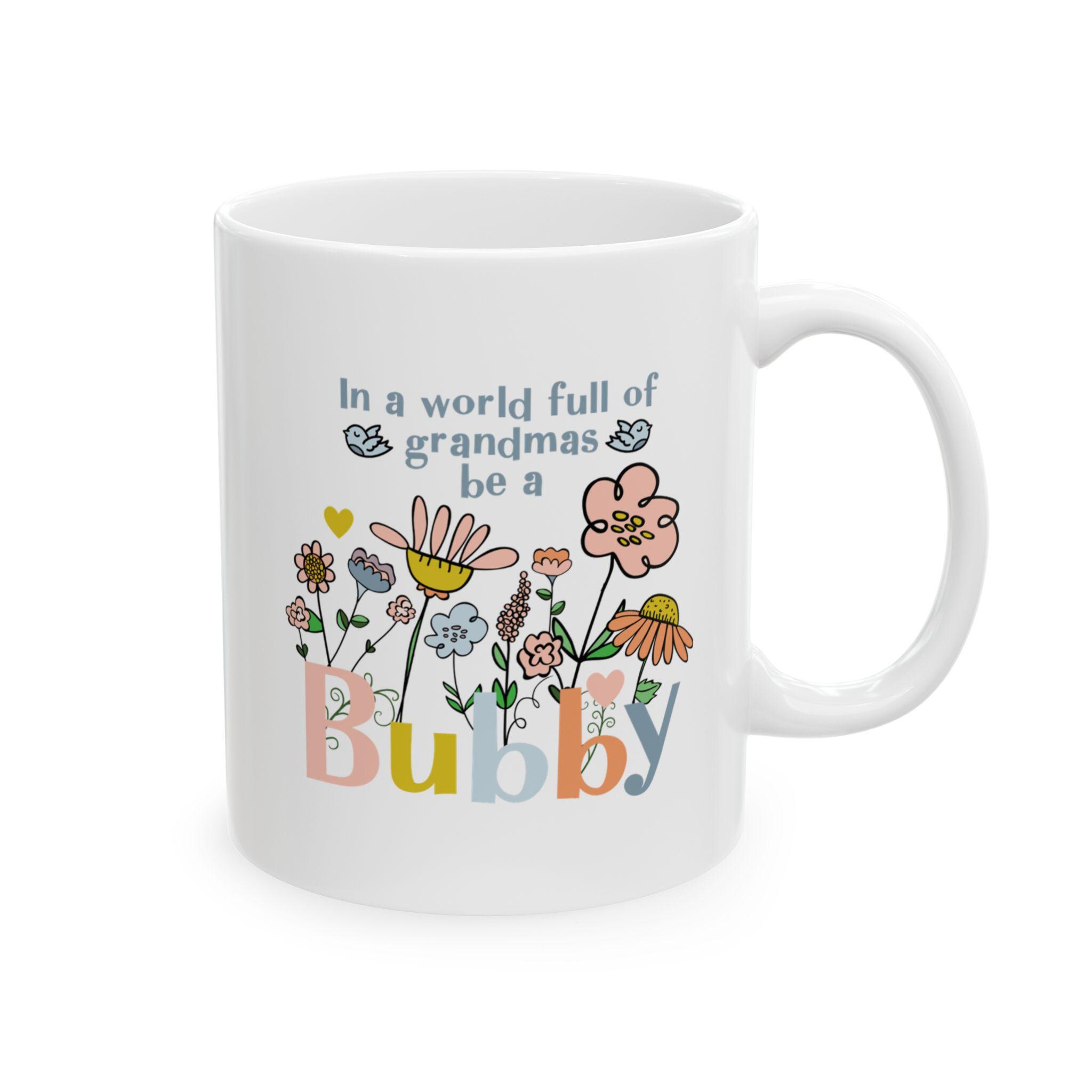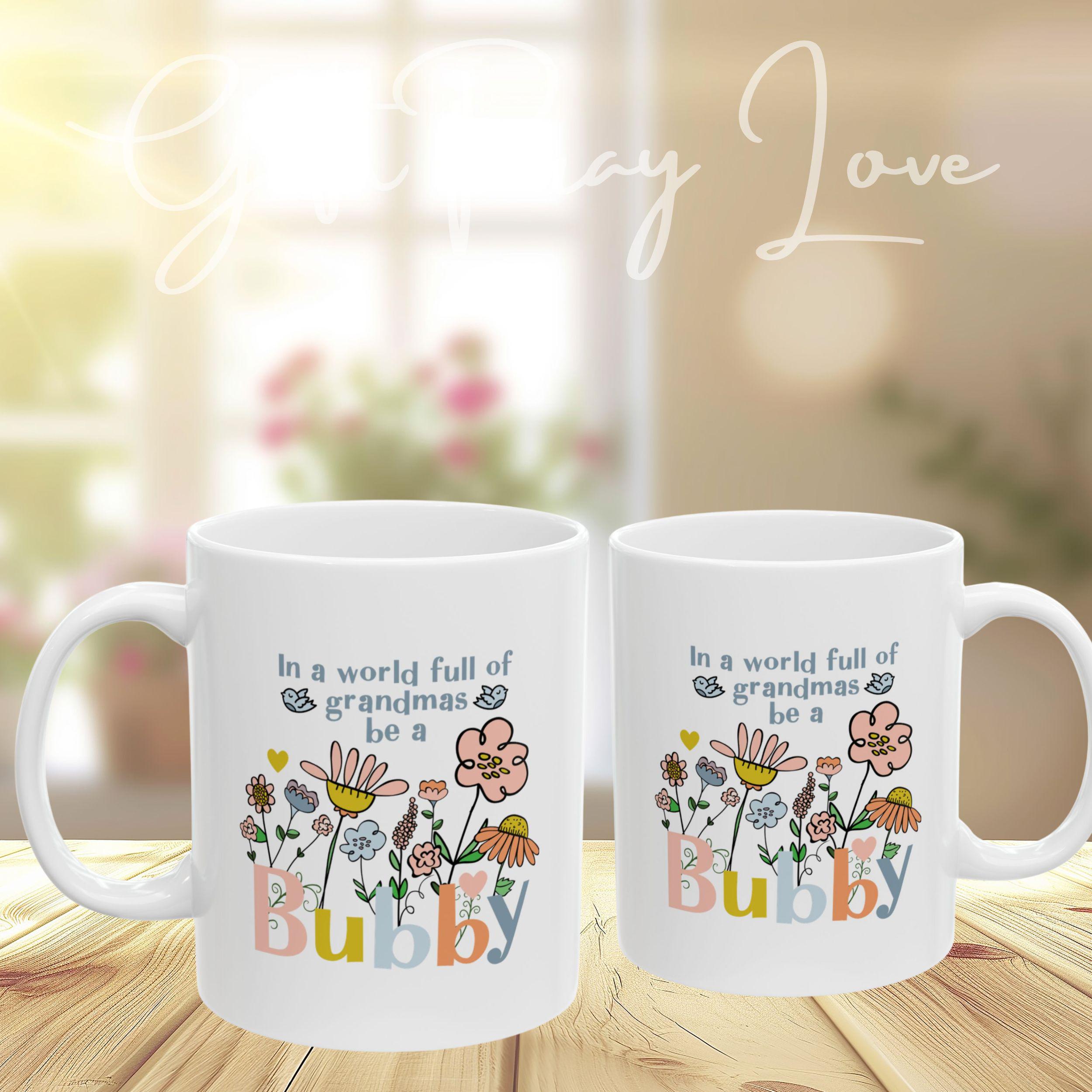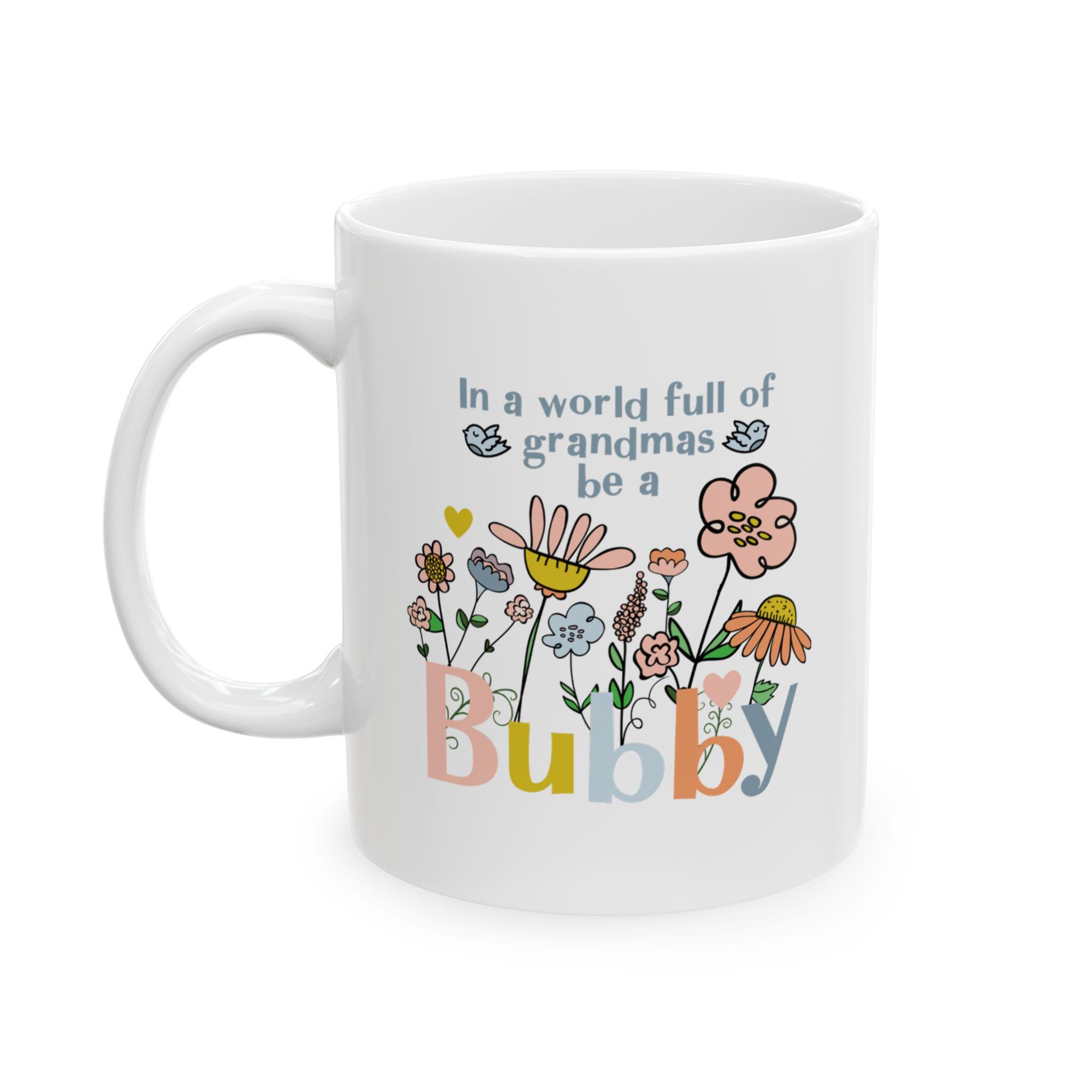 Celebrate your favorite grandmother with this vibrant “Bubby” coffee mug, featuring a fun, modern floral design bursting with color and joy. Whether she’s sipping morning coffee, tea, or cocoa, this mug will bring a smile to her face with every cup.