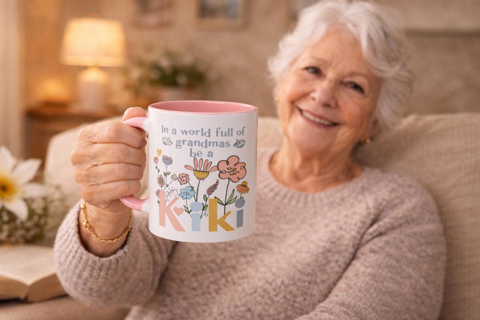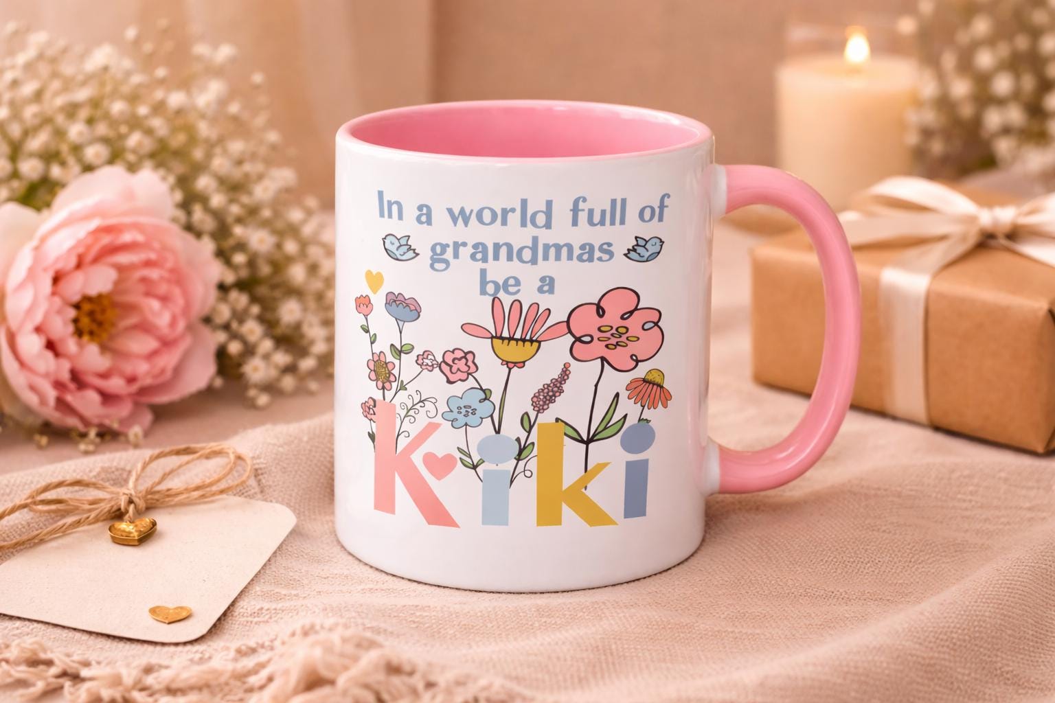 A fun mug to celebrate grandmas call 'Kiki'. This adorable mug is perfect for grandmothers who go by the nickname 'Kiki'. Select her favorite color! It brings a warm and familial feeling to any coffee or tea break, making it a great gift for Mother's Day, Grandparents Day, or just to show some love and appreciation to the special 'Kiki' in your life.