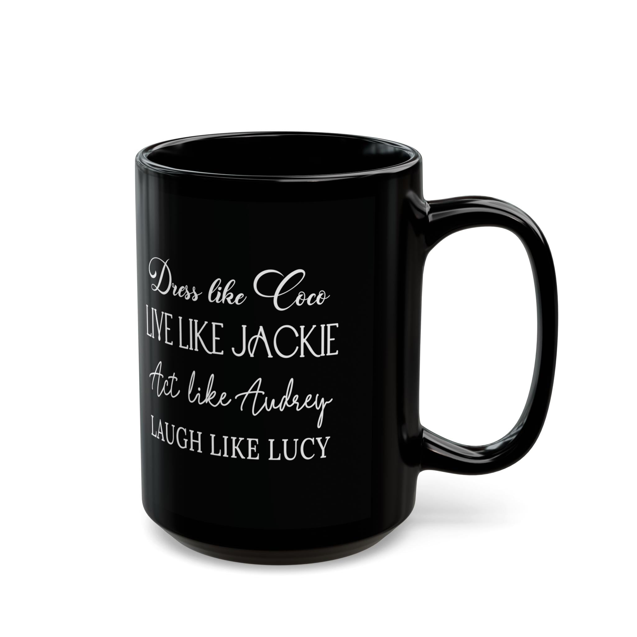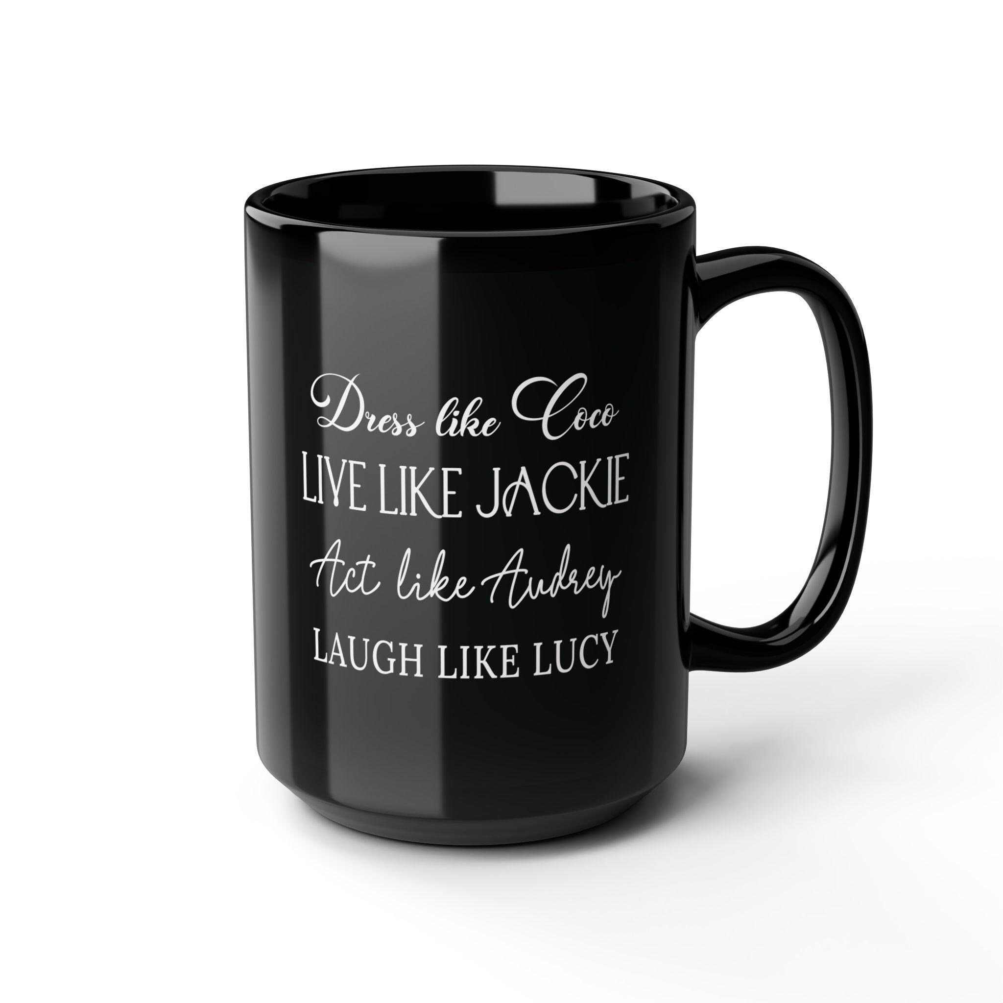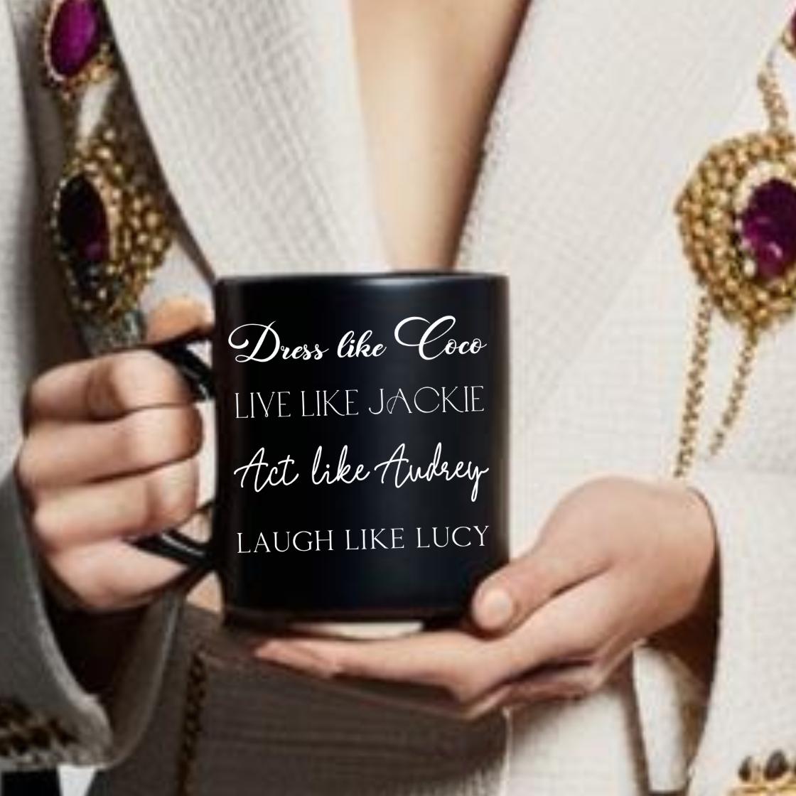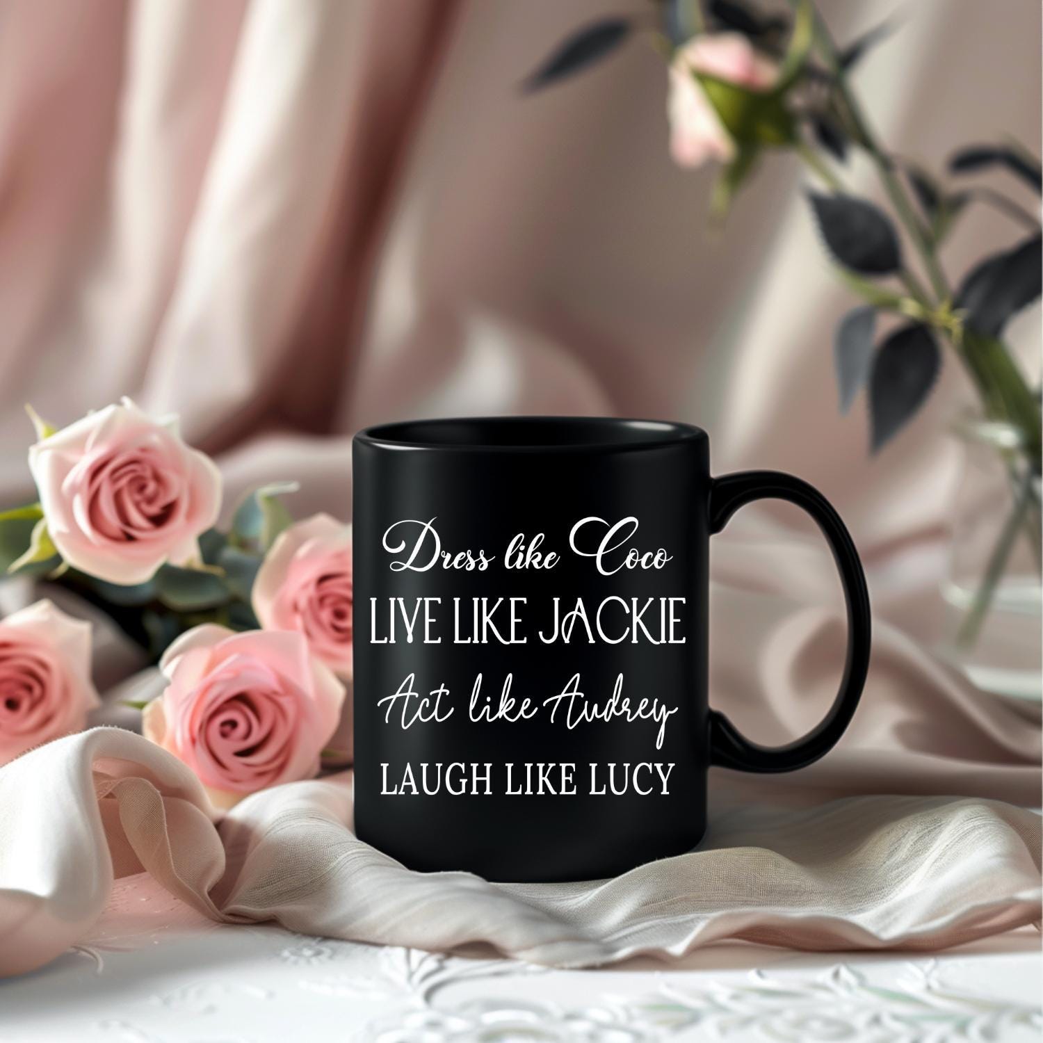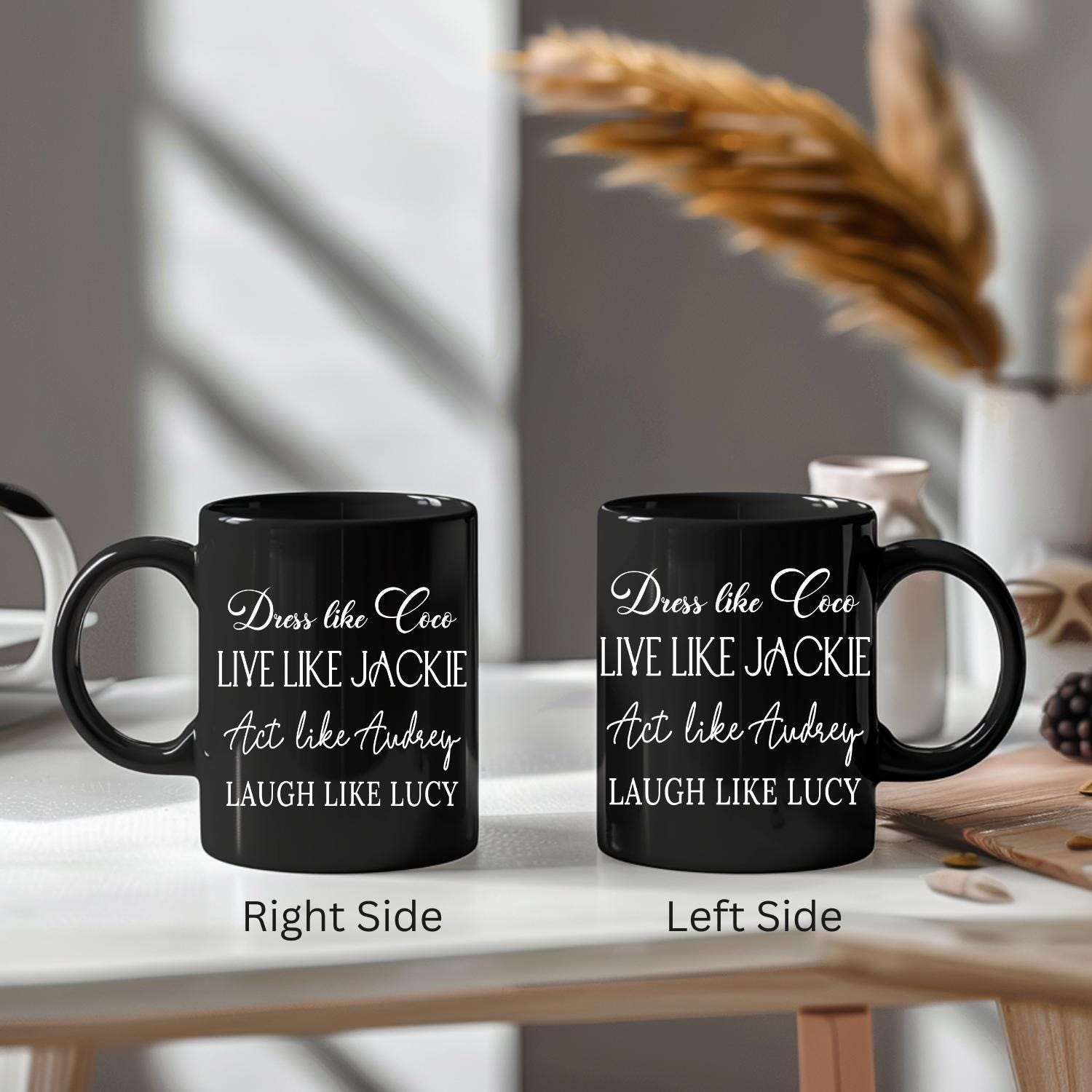 Celebrate the timeless influence of Coco Chanel, Jackie Kennedy, Audrey Hepburn, and Lucille Ball with this stylish black coffee mug, featuring their names and legacy in bold white lettering. Perfect for those who appreciate elegance, beauty, and a touch of classic sophistication, this mug is a daily reminder of their impact on fashion, culture, and entertainment. Sophisticated, timeless, and iconic—sip in style! Order your Iconic Women Coffee Mug today and bring a touch of classic elegance to your everyday!