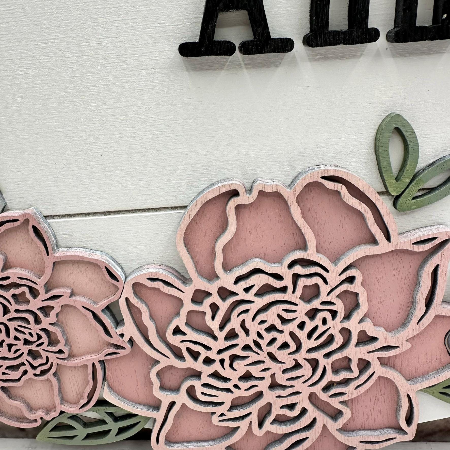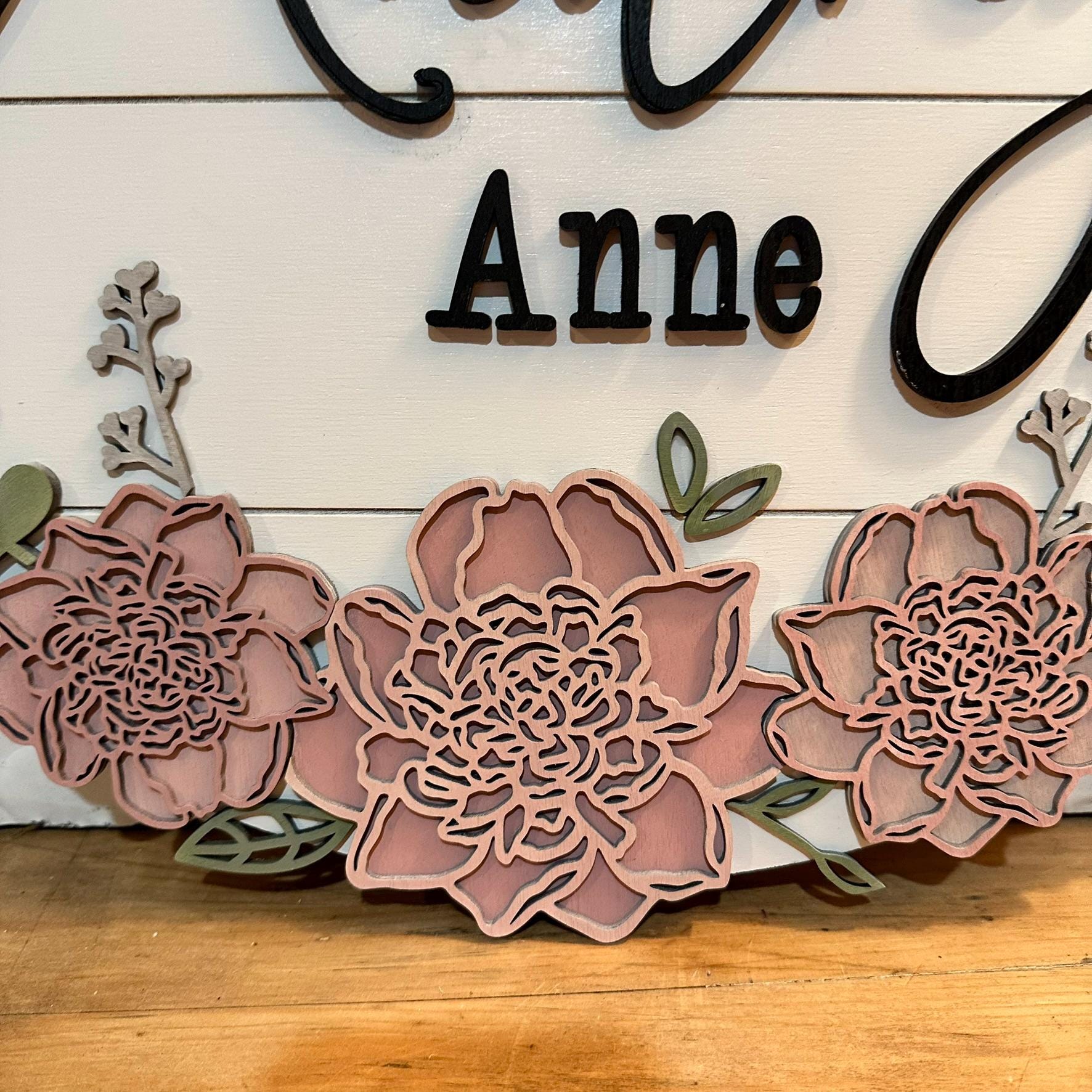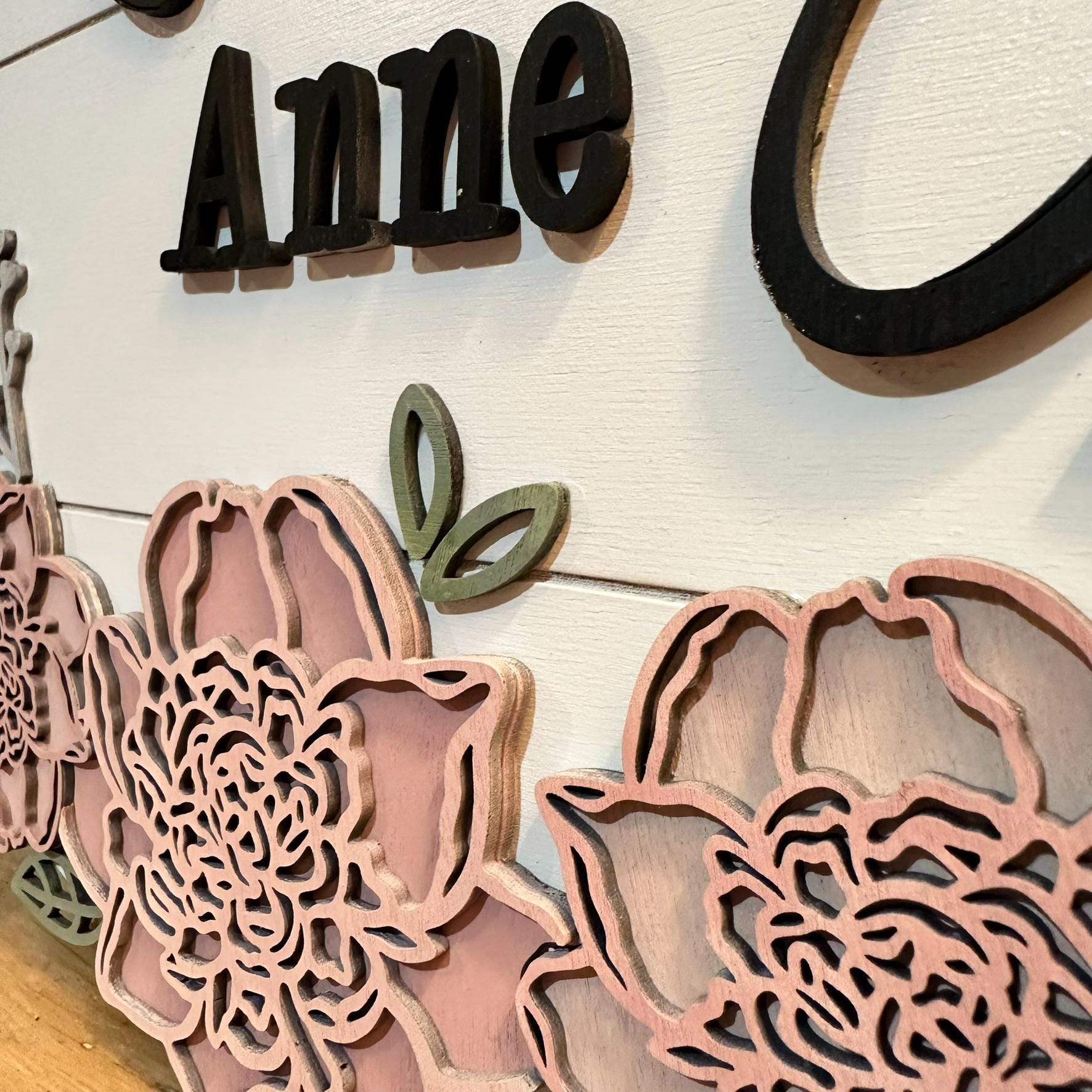 Introducing our handmade Custom Wood Baby Girl Peony Name Sign! This beautiful and personalized piece is the perfect addition to any nursery or child's room. Each sign is carefully crafted from high-quality wood, ensuring durability and a timeless look. The dimensions of this sign can be customized to suit your needs, making it a unique and special decor piece for your little one's space. Add a touch of charm and individuality with this one-of-a-kind name sign that will be treasured for years to come. Perfect for baby showers, birthdays, or any special occasion. Make a statement with our Custom Wood Baby Name Sign today! The colors featured in this design are pink, blush, and sage.