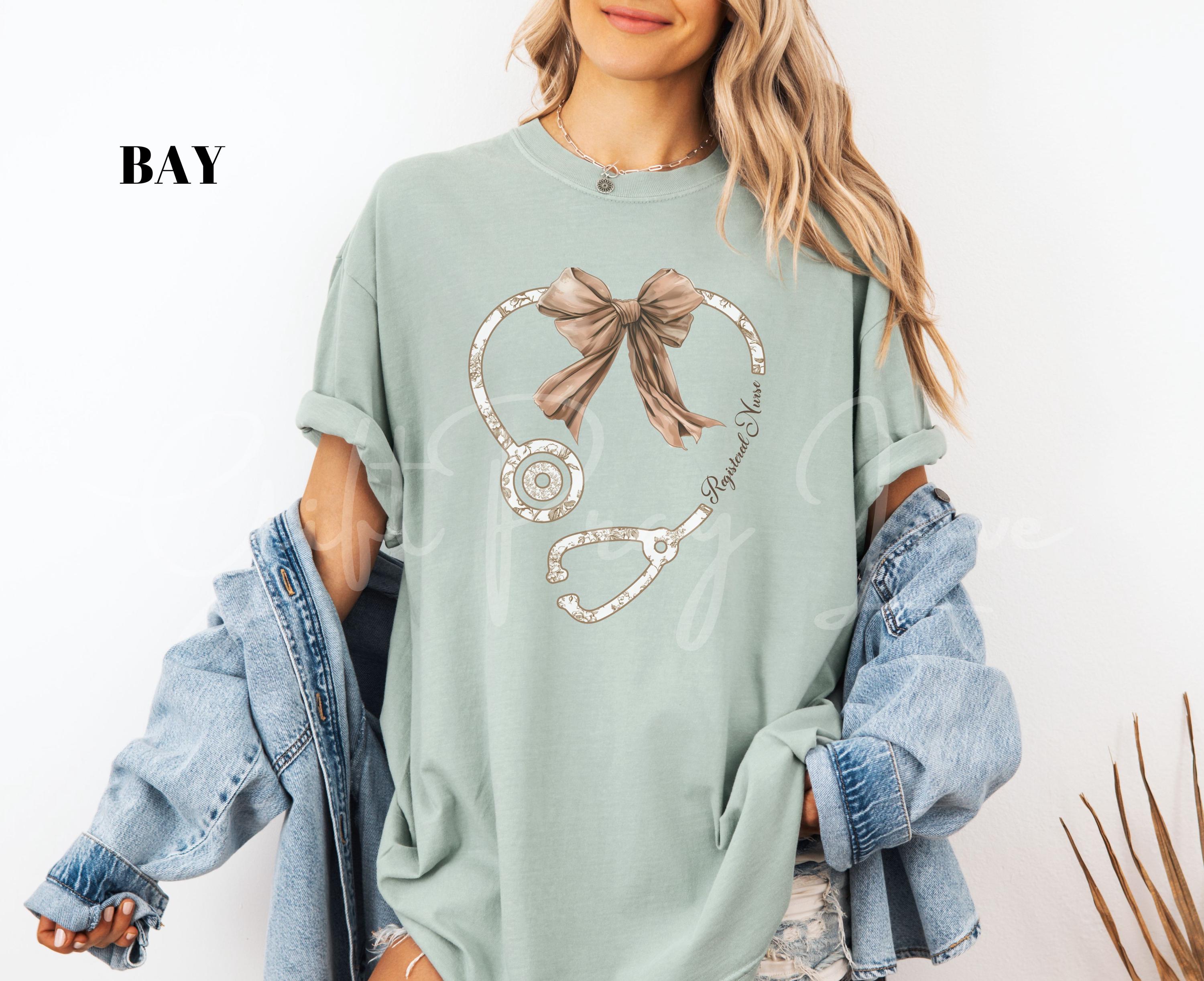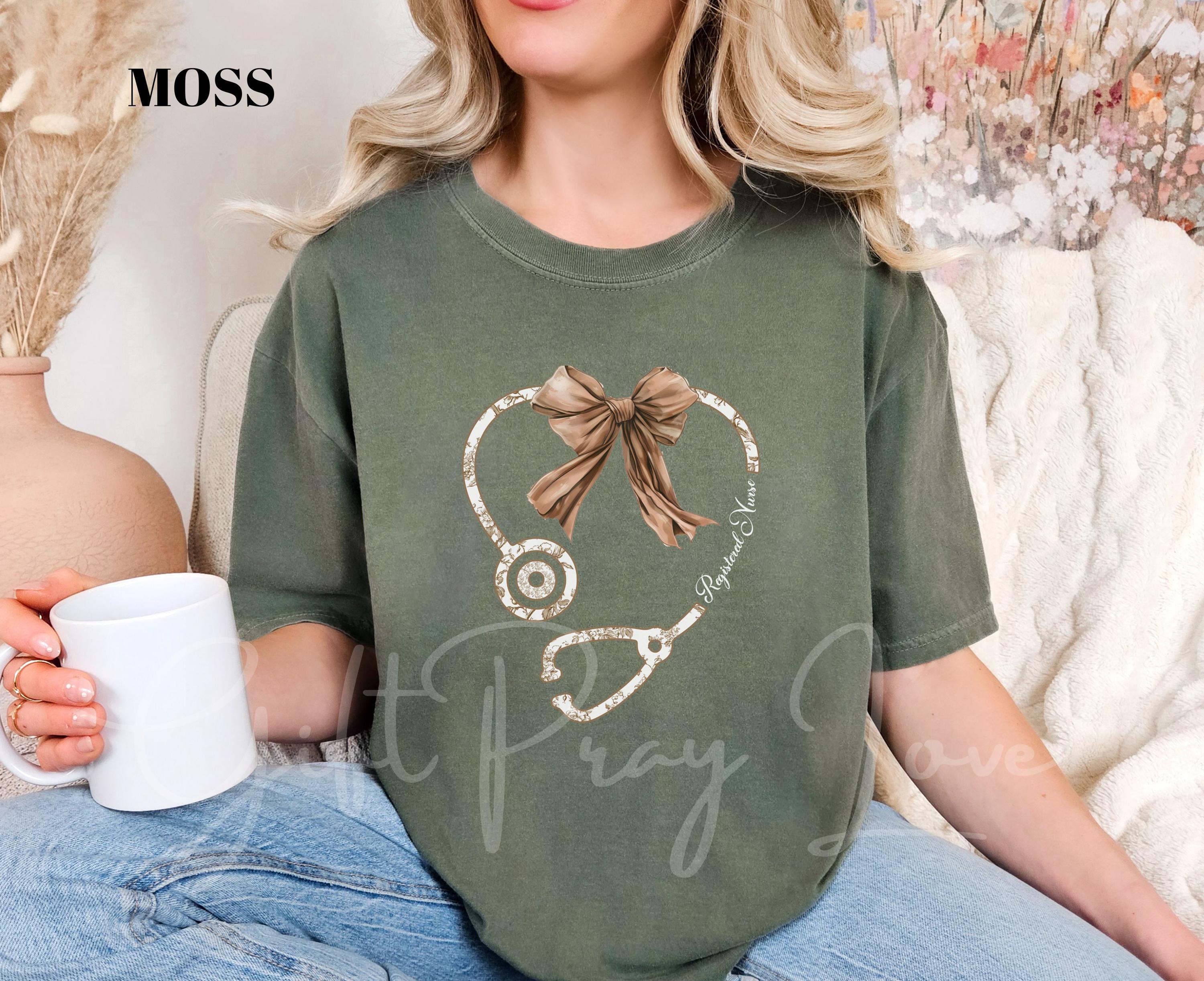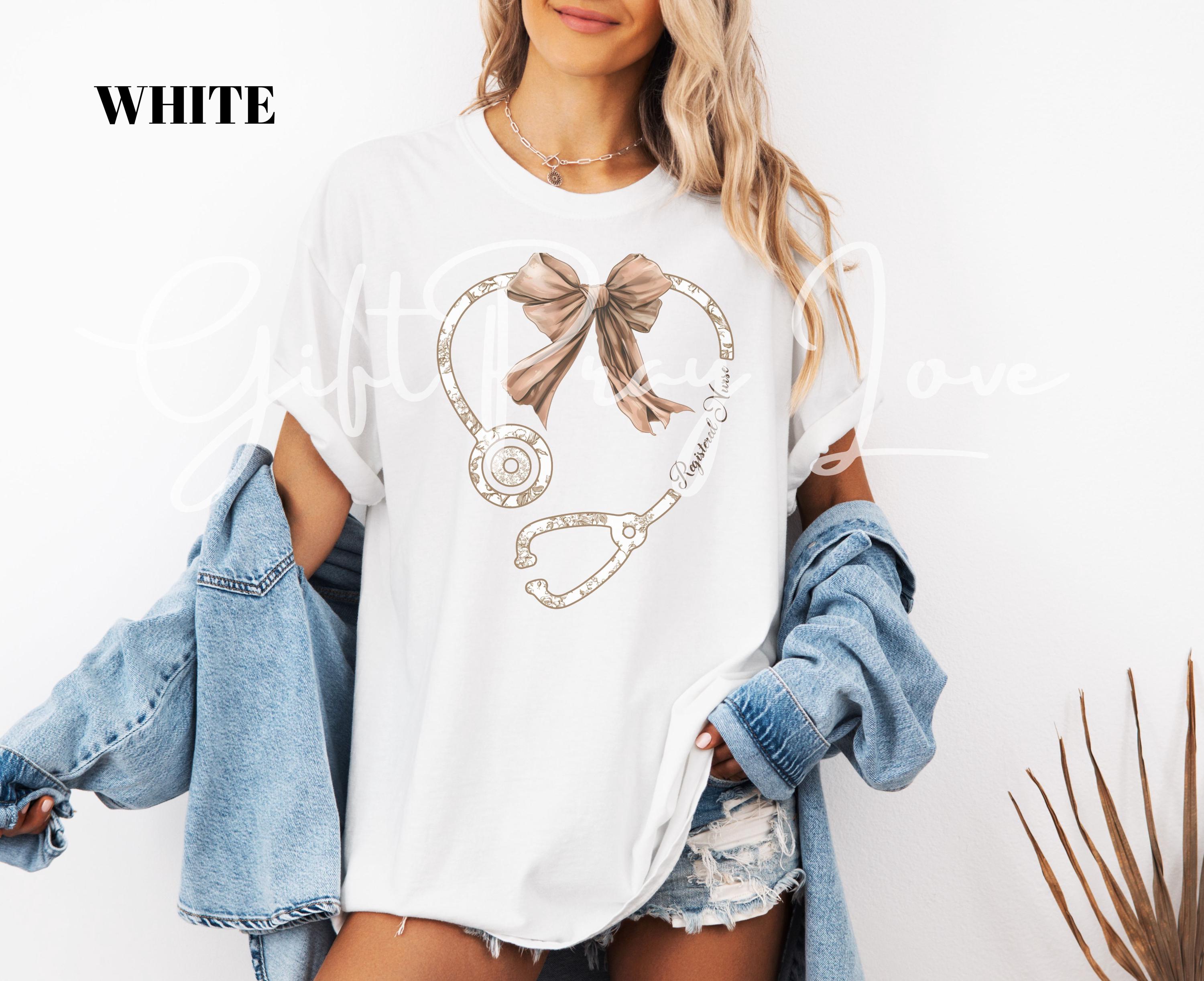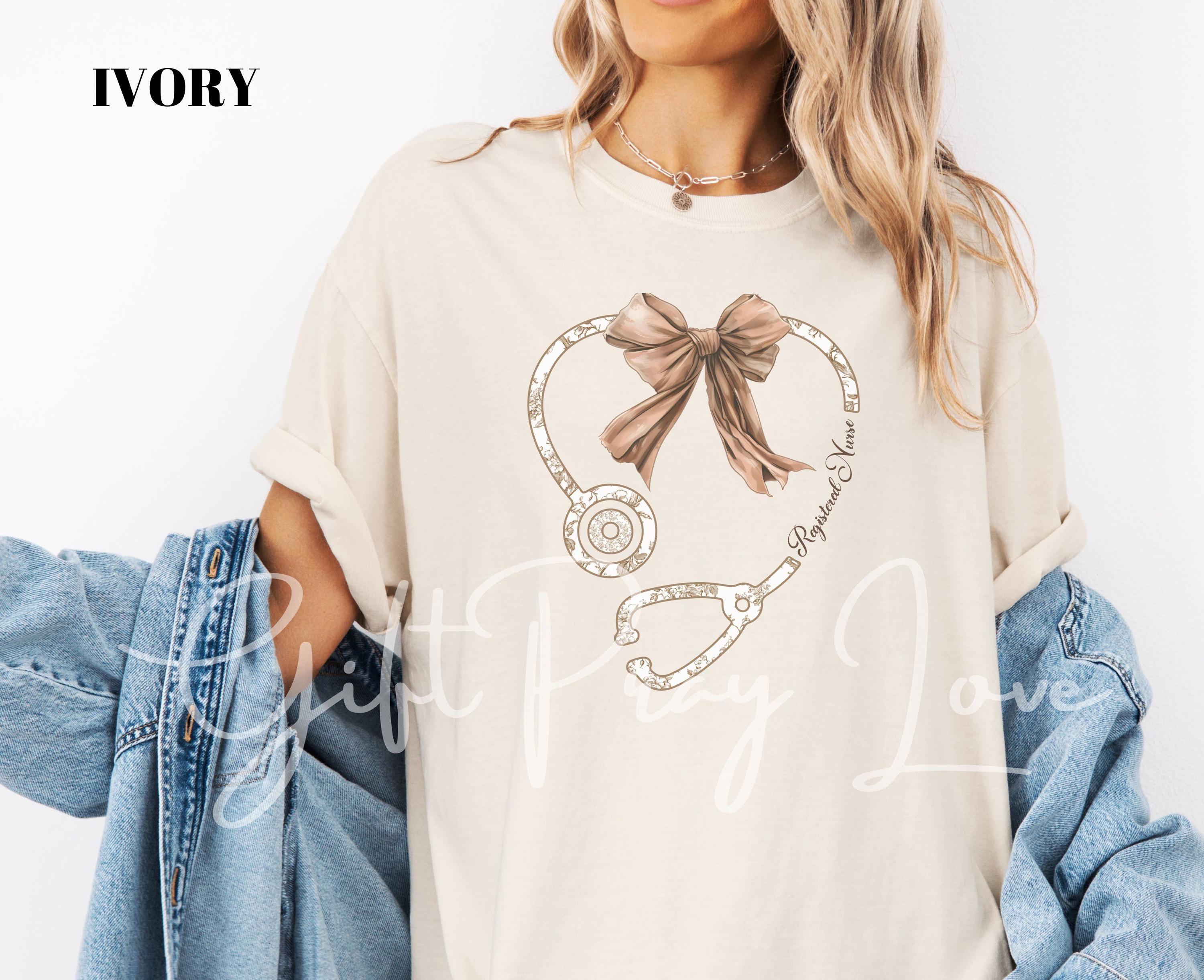 Cute coquette style Registered Nurse Tee in warm neutral colors! This cute shirt features a stethoscope in an elegant beige toile pattern. Perfect for RNs who take pride in their profession and want to show it. A perfect gift for nurses, medical professionals, and healthcare heroes, or for your doctor's office for as a group shirt! Made with the supersoft, preshrunk Comfort Colors T-Shirts.