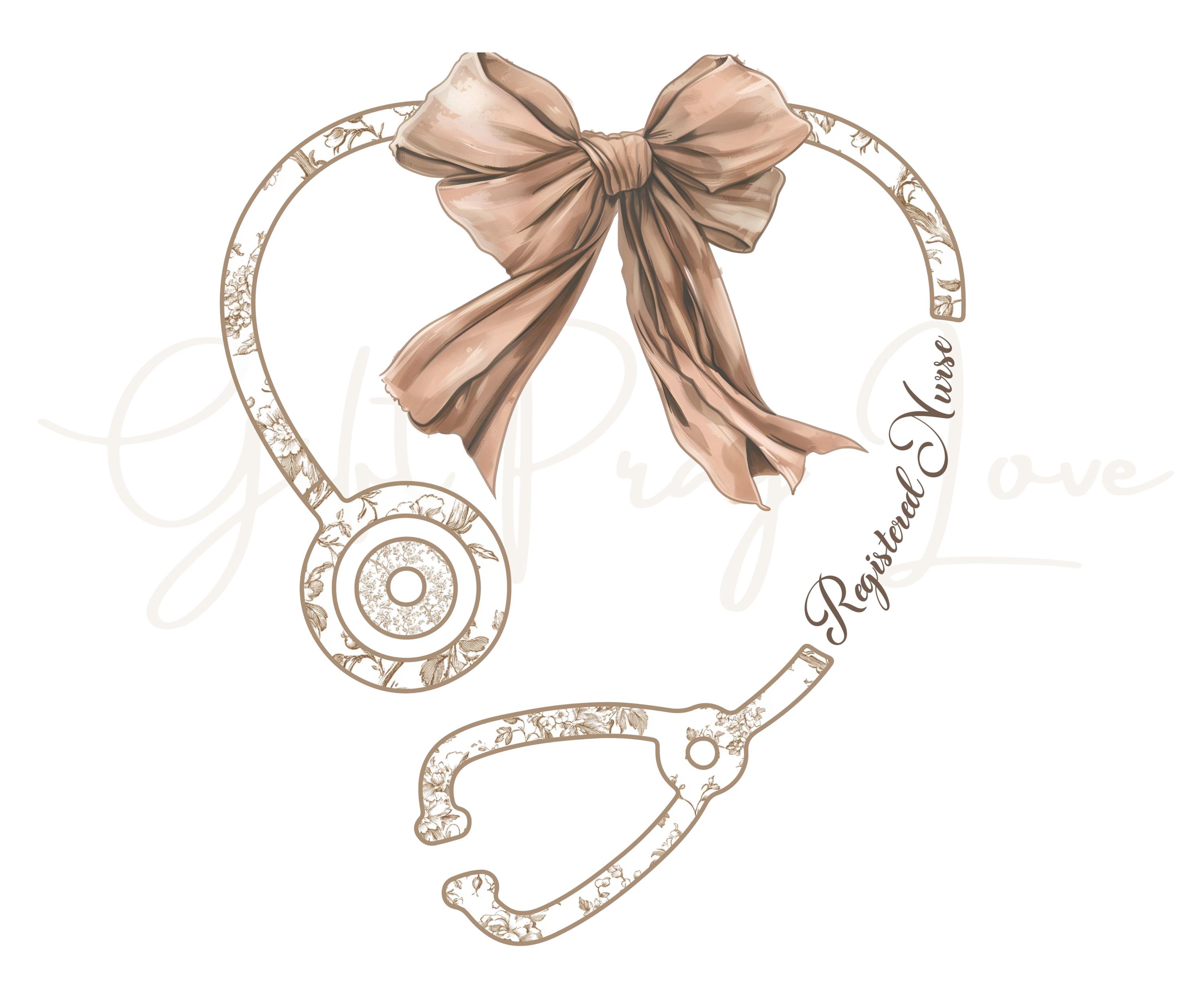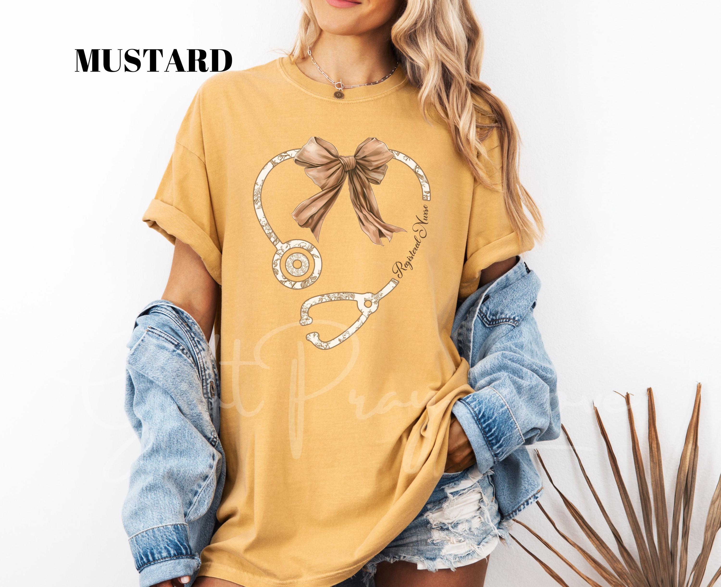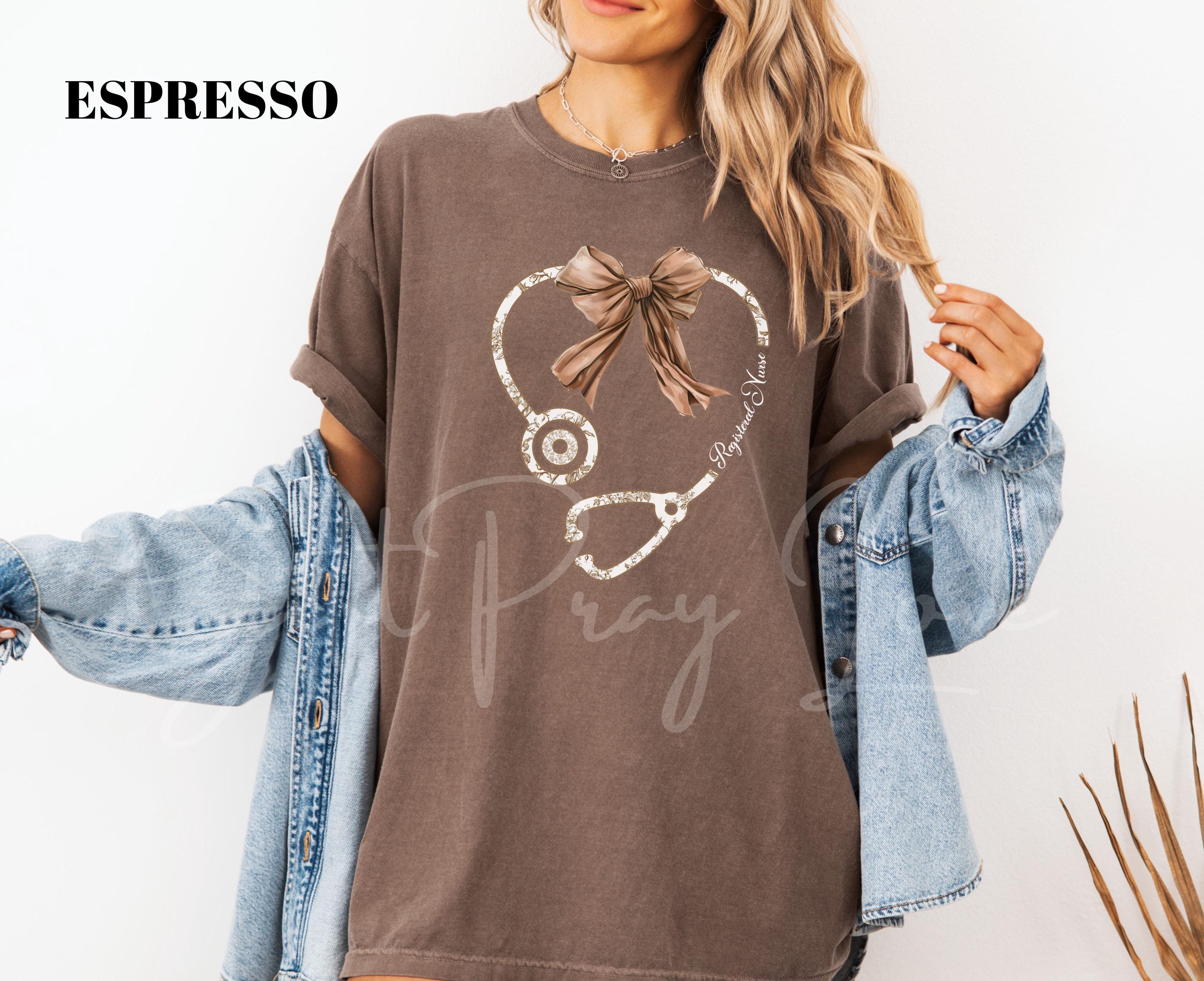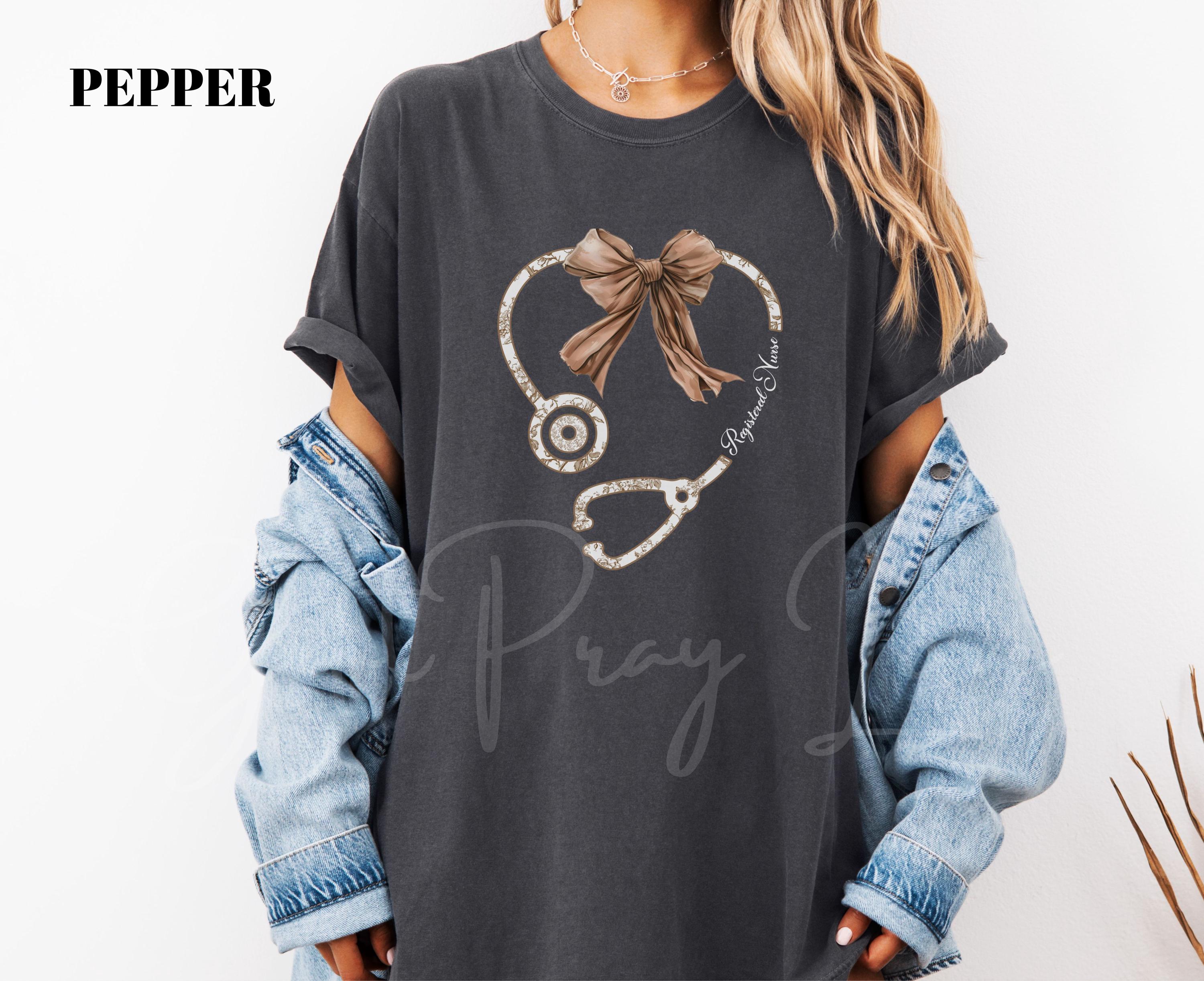 Cute coquette style Registered Nurse Tee in warm neutral colors! This cute shirt features a stethoscope in an elegant beige toile pattern. Perfect for RNs who take pride in their profession and want to show it. A perfect gift for nurses, medical professionals, and healthcare heroes, or for your doctor's office for as a group shirt! Made with the supersoft, preshrunk Comfort Colors T-Shirts.