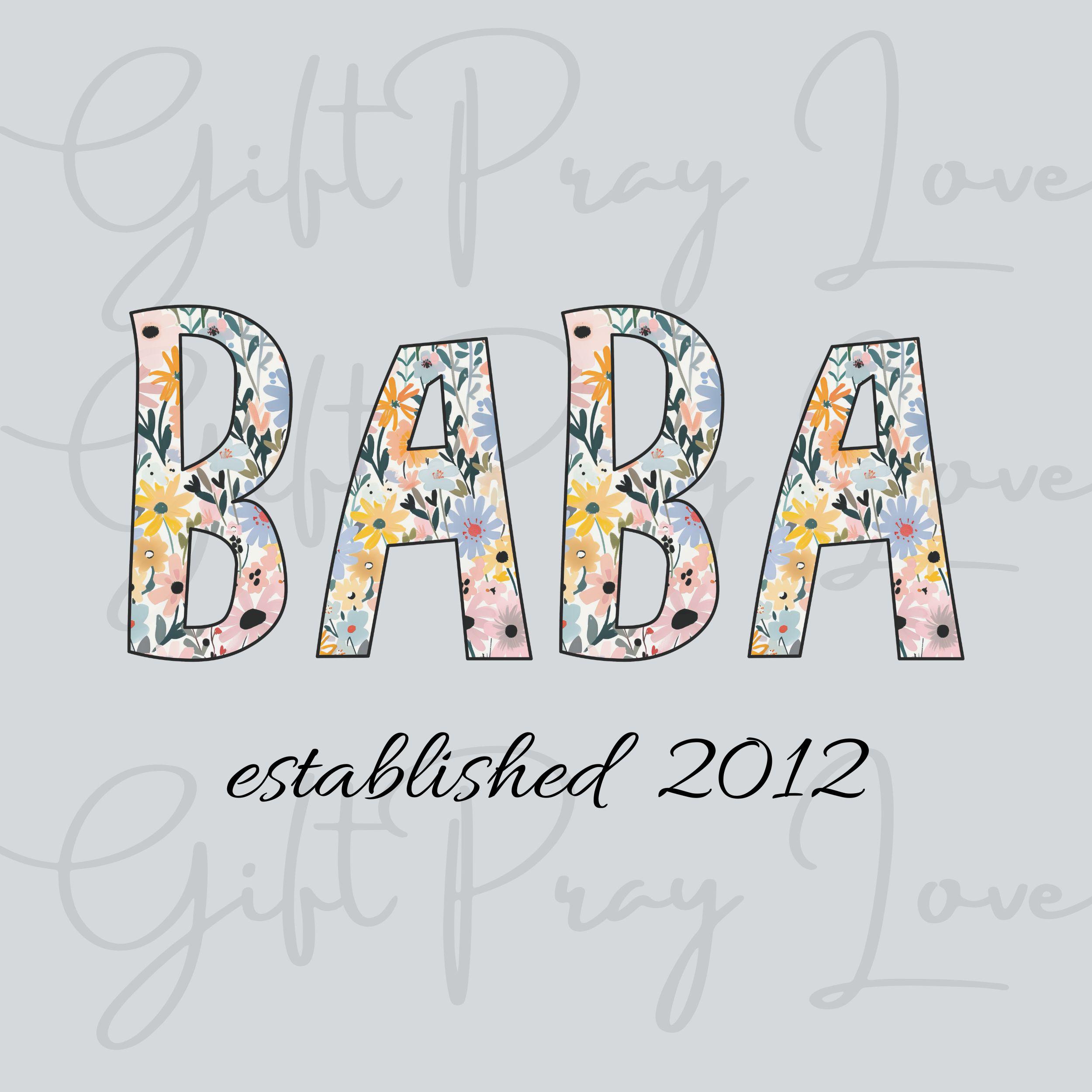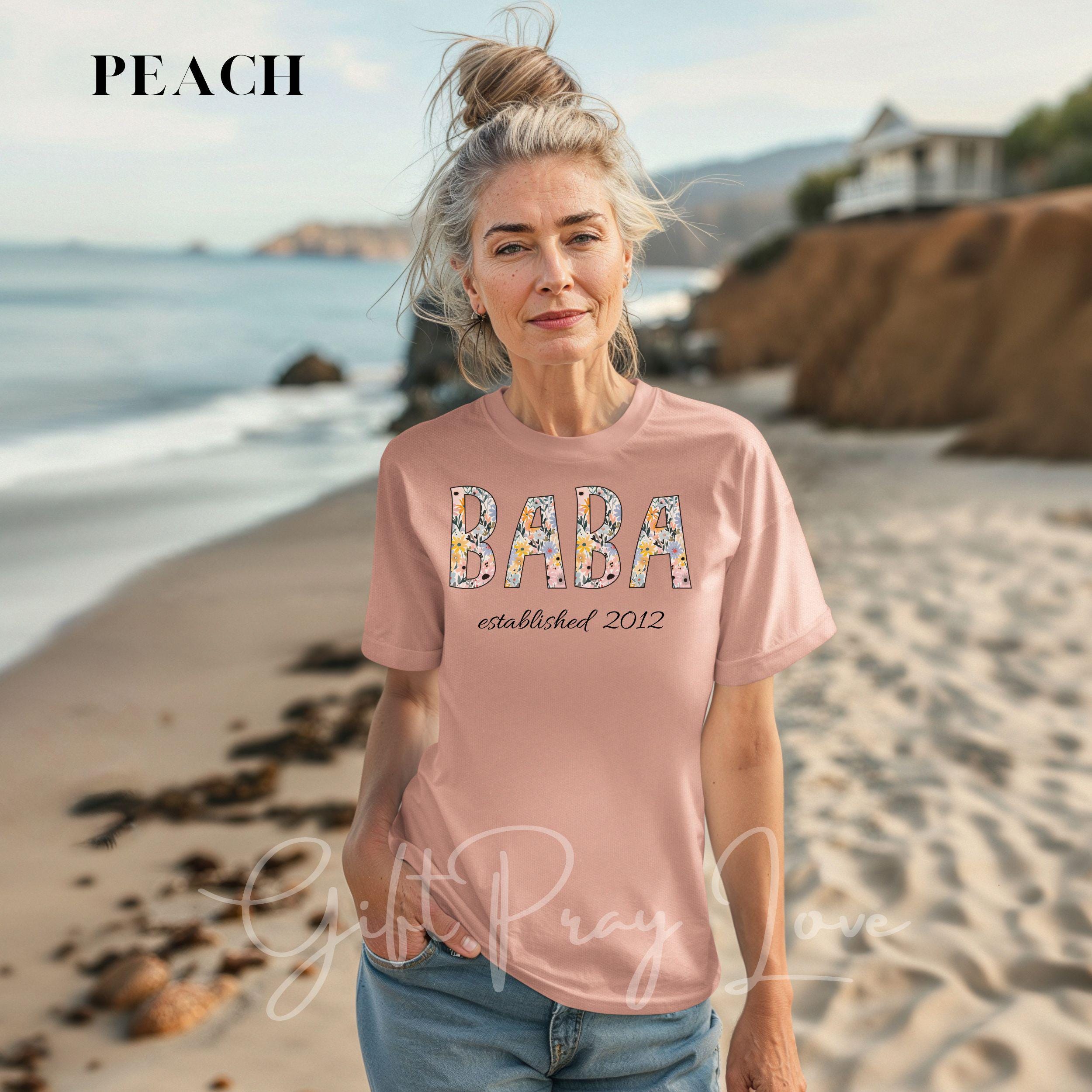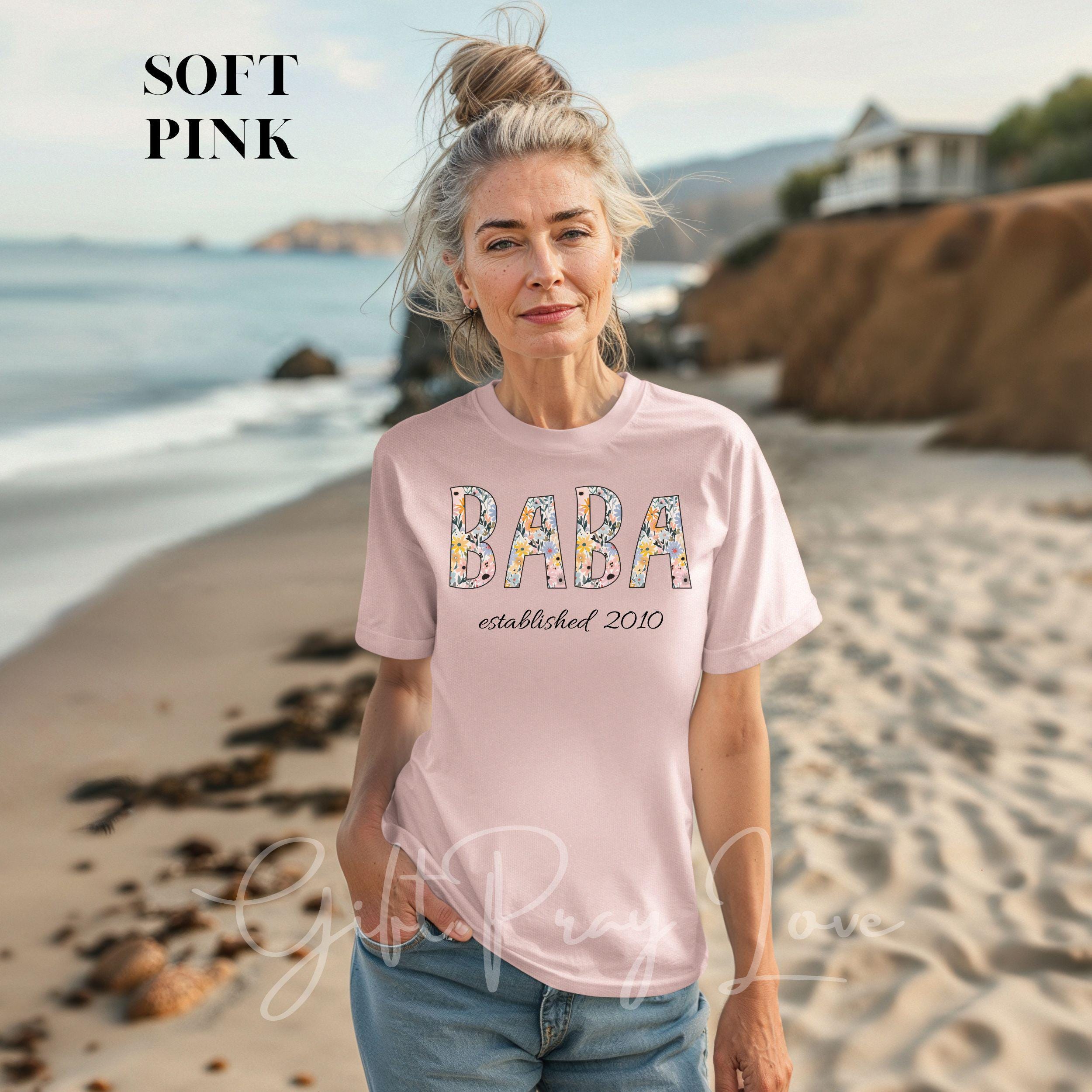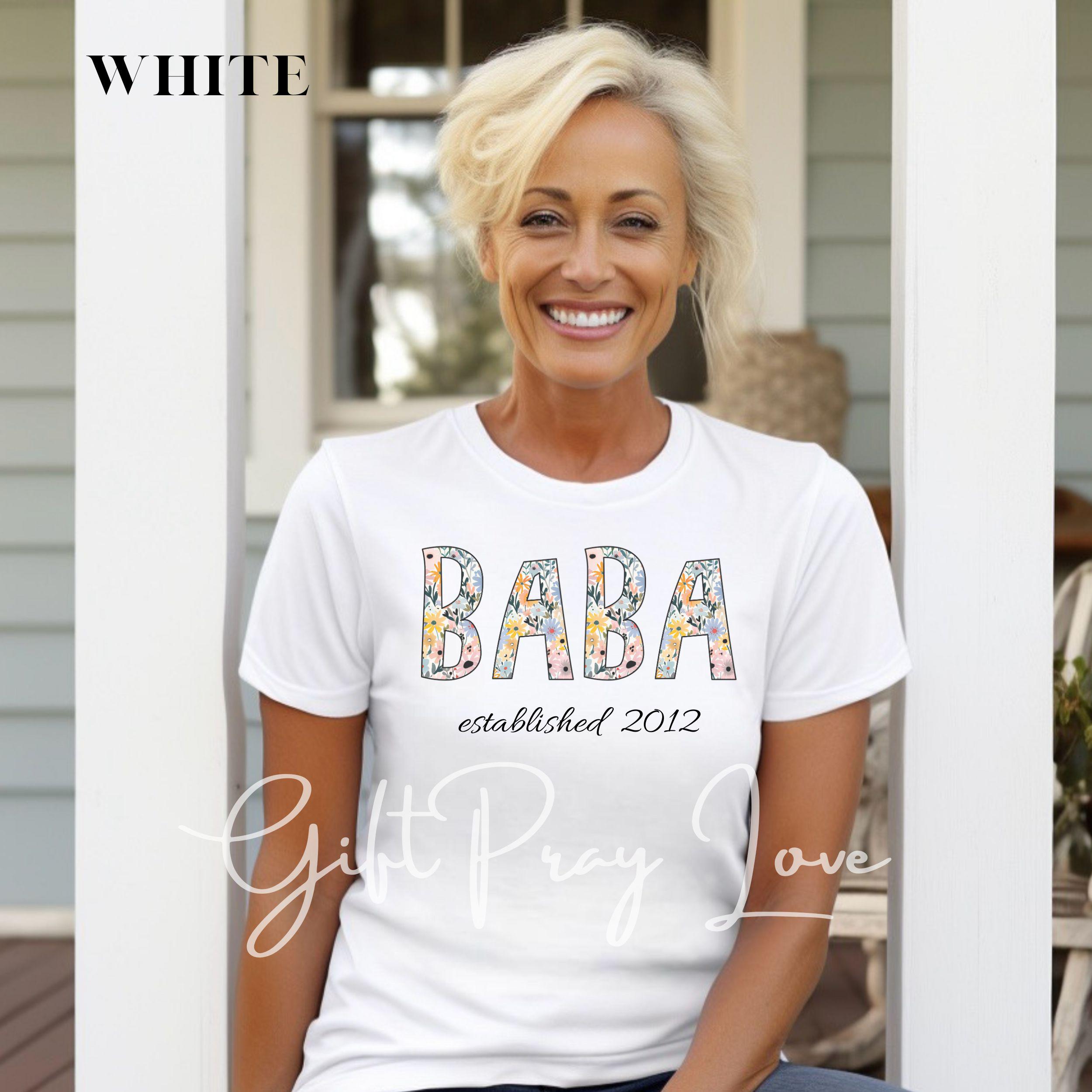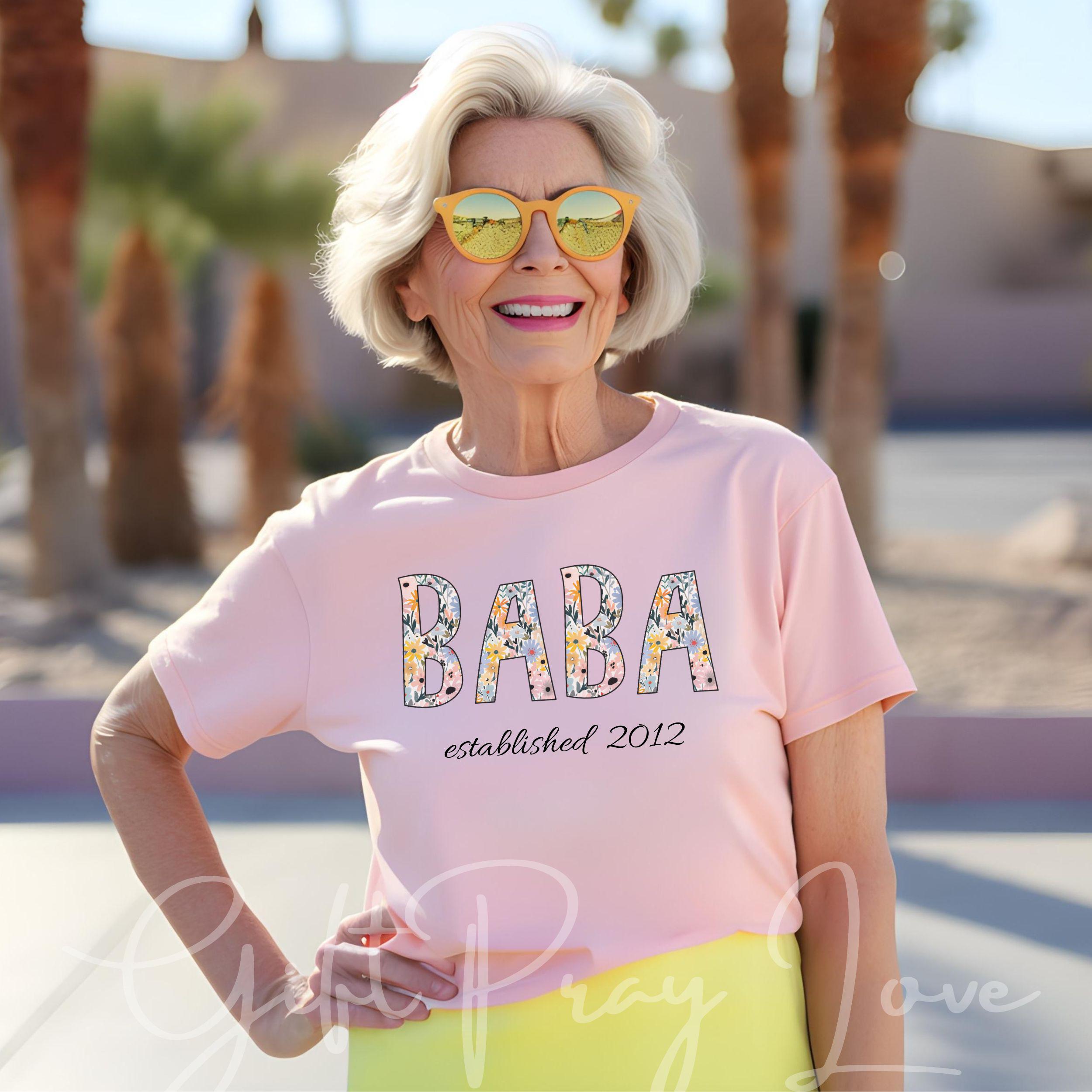 A grandmother established T-shirt with personalized year for the proud grandmother. This versatile tee is perfect for everyday wear, showcasing a classic retail fit that is comfortable and stylish. It can be layered for different looks and occasions, making it a great addition to any wardrobe. Ideal for gifting on Mother's Day, Grandparents Day, or birthdays.