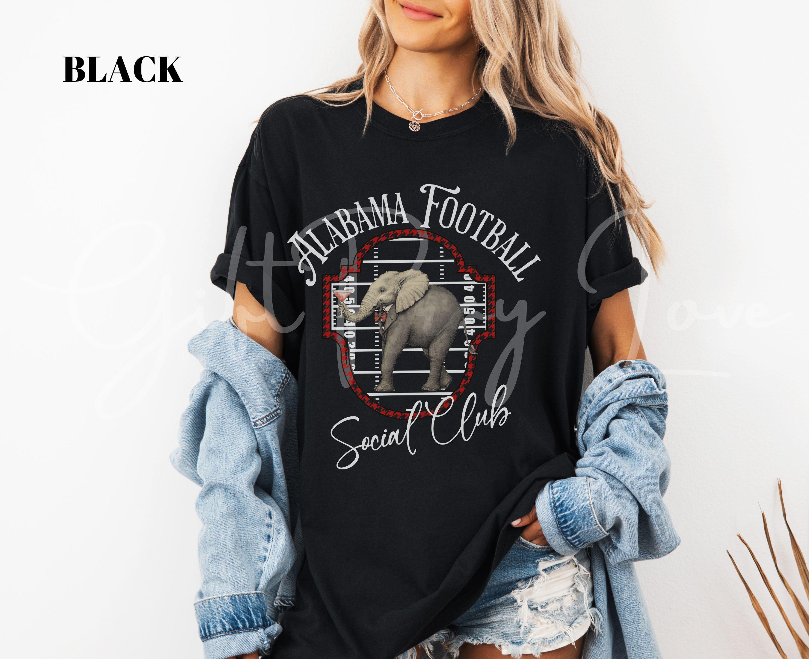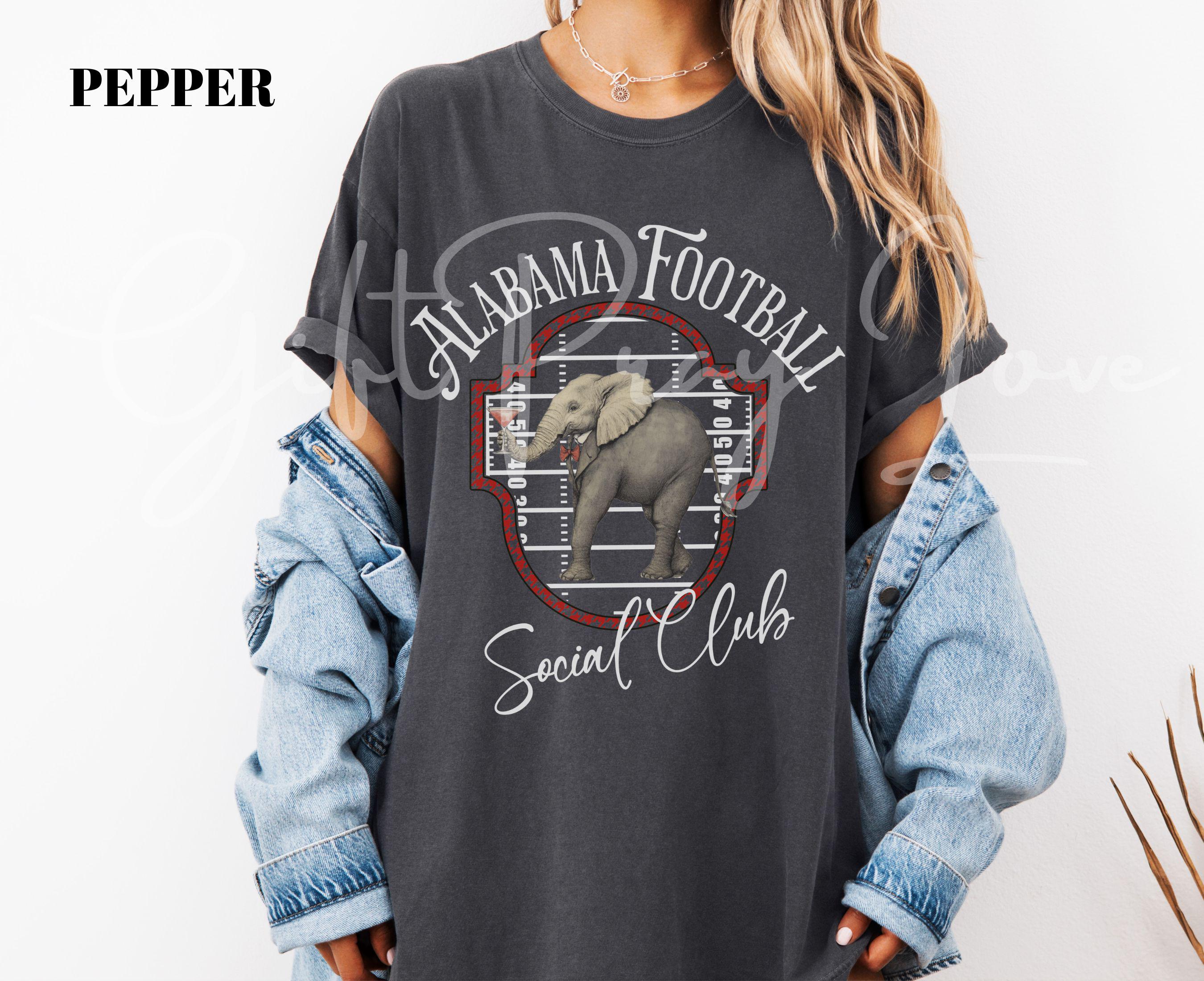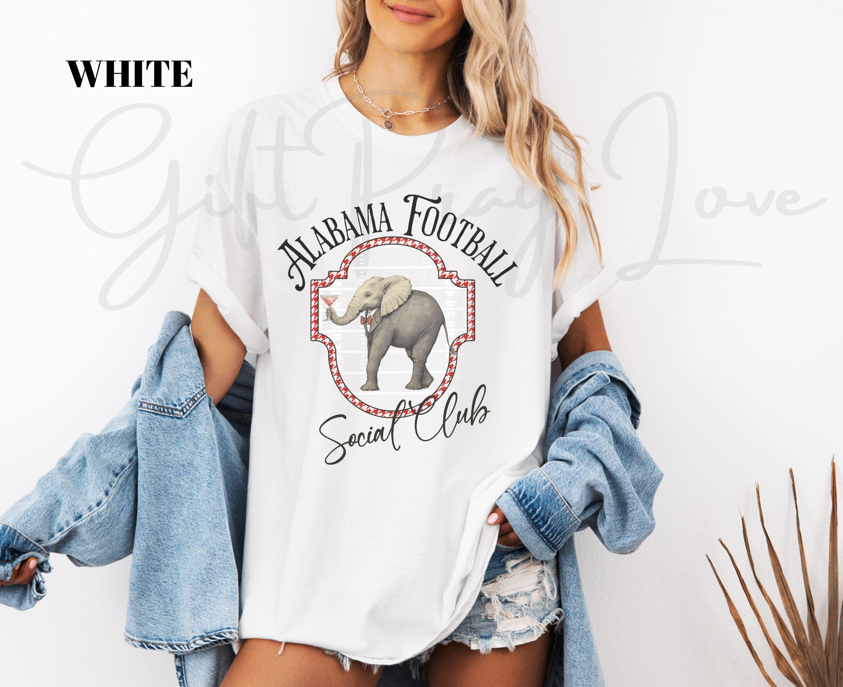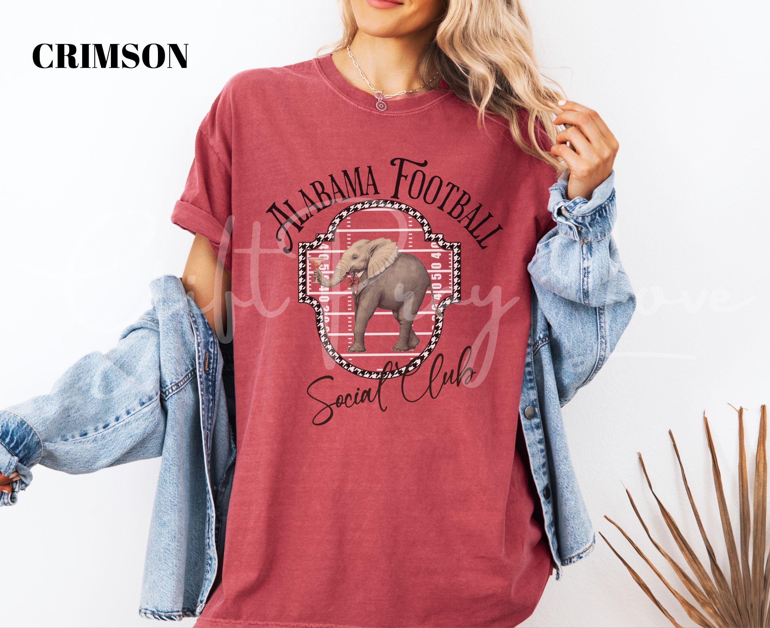 Show your Alabama football pride with this Alabama Football Social Club t-shirt! Designed on a premium Comfort Colors tee, this shirt offers a soft, vintage feel with a relaxed fit—perfect for game days, tailgates, or everyday wear. Designed in the cute Social Club style featuring Big Al with a martini. Whether you're cheering from Bryant-Denny Stadium or watching from home, this Bama fan shirt is a must-have for any Alabama football lover. Makes a great gift for Alabama alumni, students, and Bama football fans and new admissions! Order yours today and show your Bama football spirit. Roll Tide!