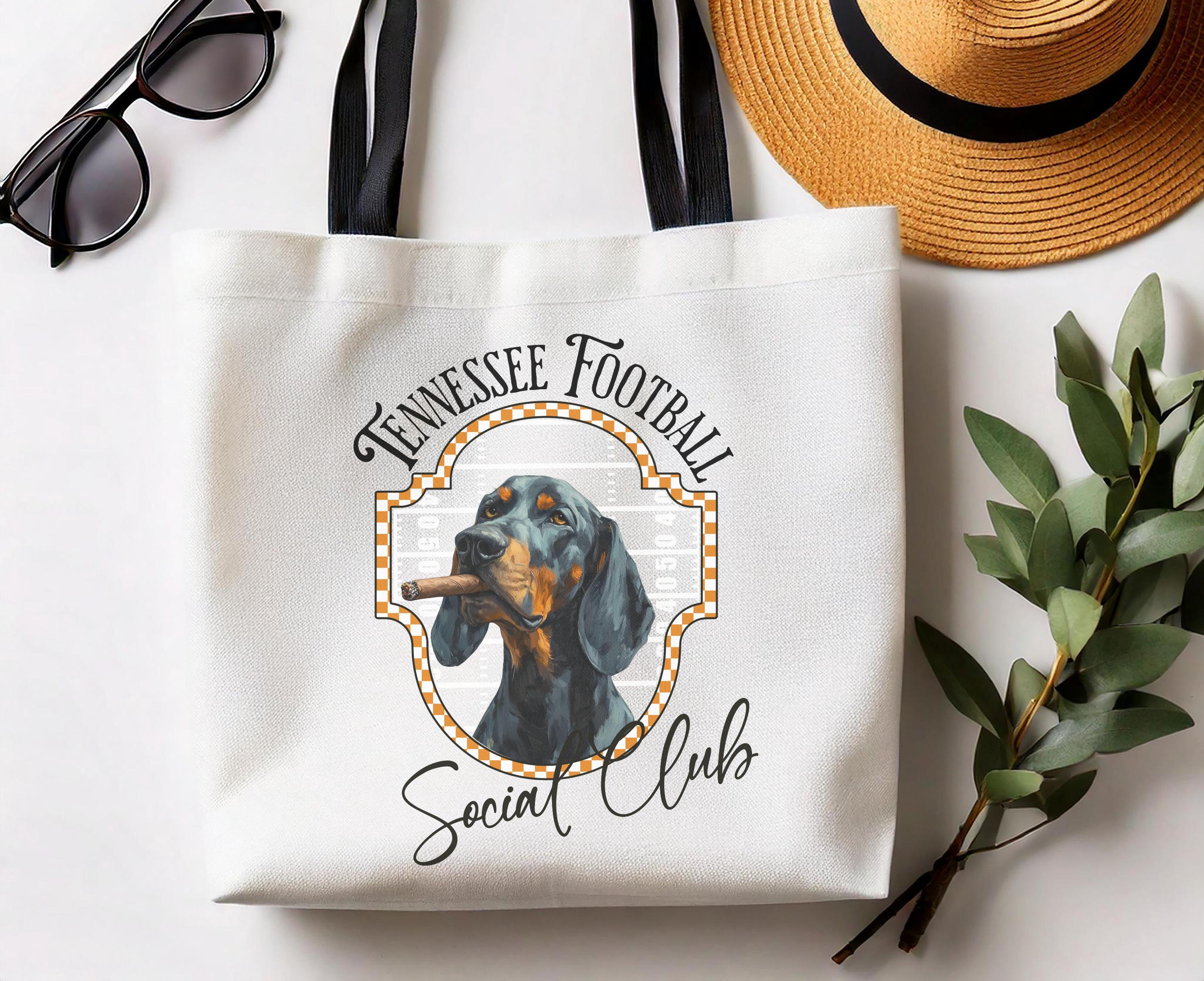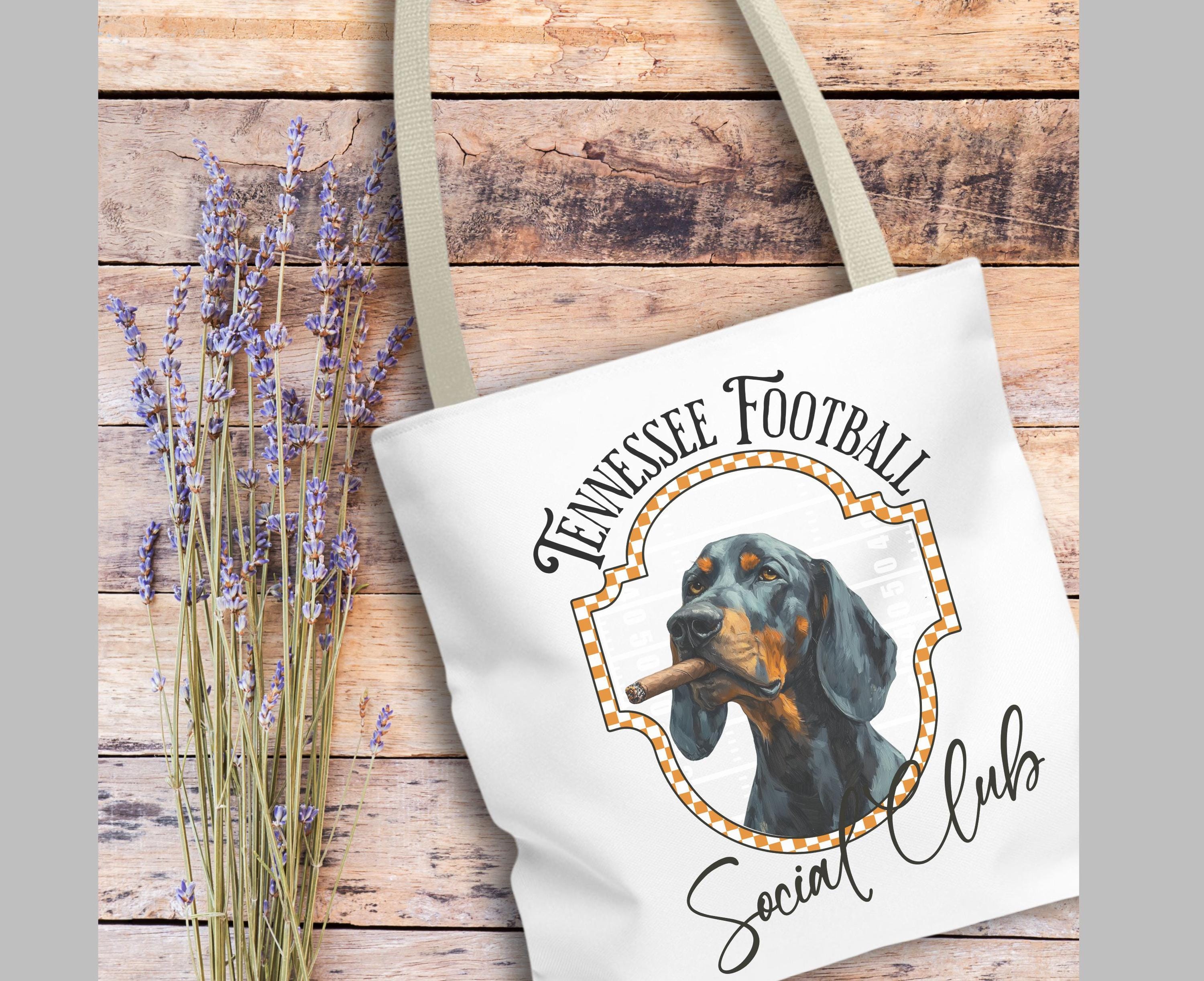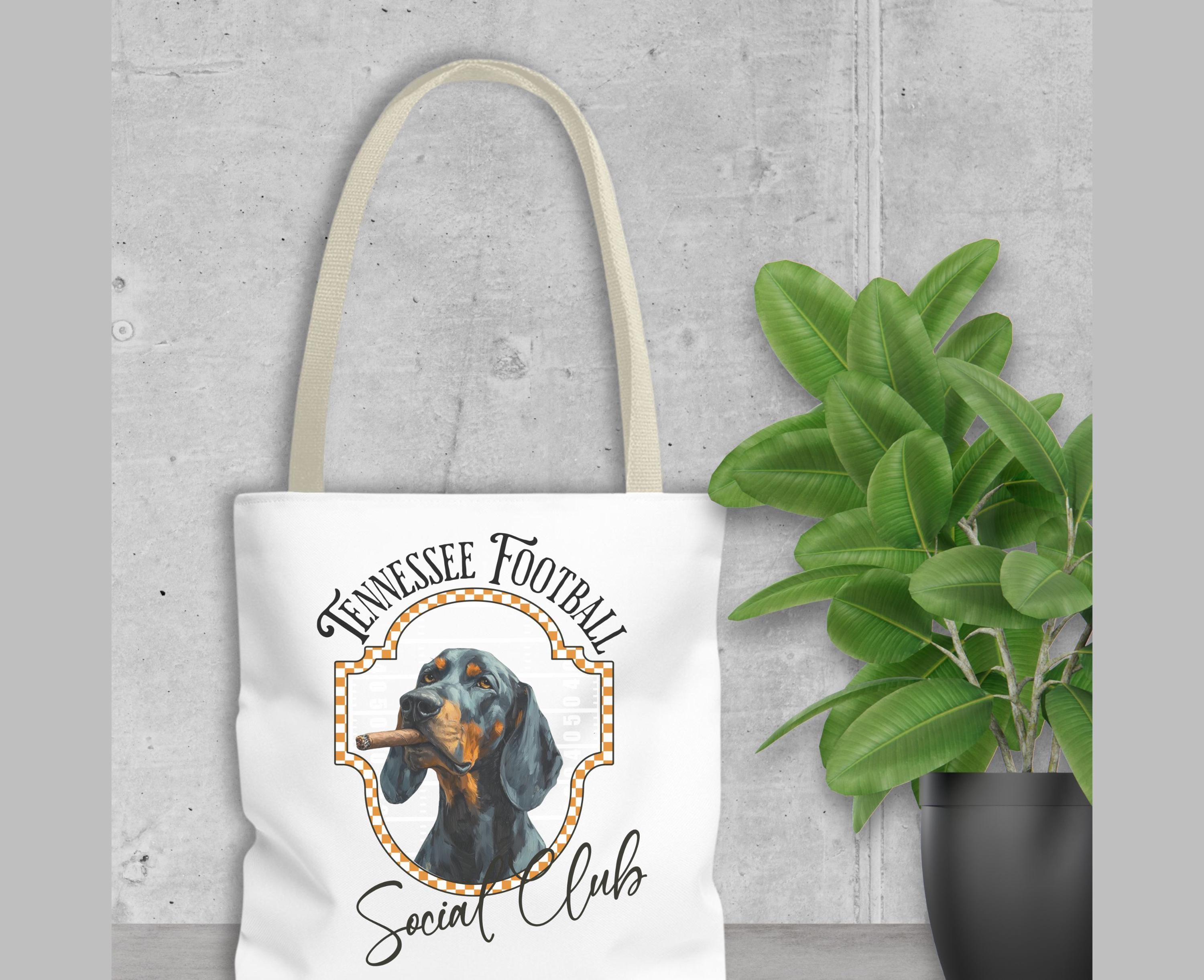 Show off your Tennessee pride with this stylish Tennessee Football Tote Bag, featuring a sophisticated Smokey with a cigar—a perfect nod to UT game-day spirit with social club vibes! Whether you're heading to a tailgate, grocery shopping in Knoxville, or carrying game-day essentials, this durable and reusable tote is both functional and fashionable. 3 Sizes available with 5 handle color options. Makes a great Vol Graduation gift. Go Vols and hat tip to Smokey!