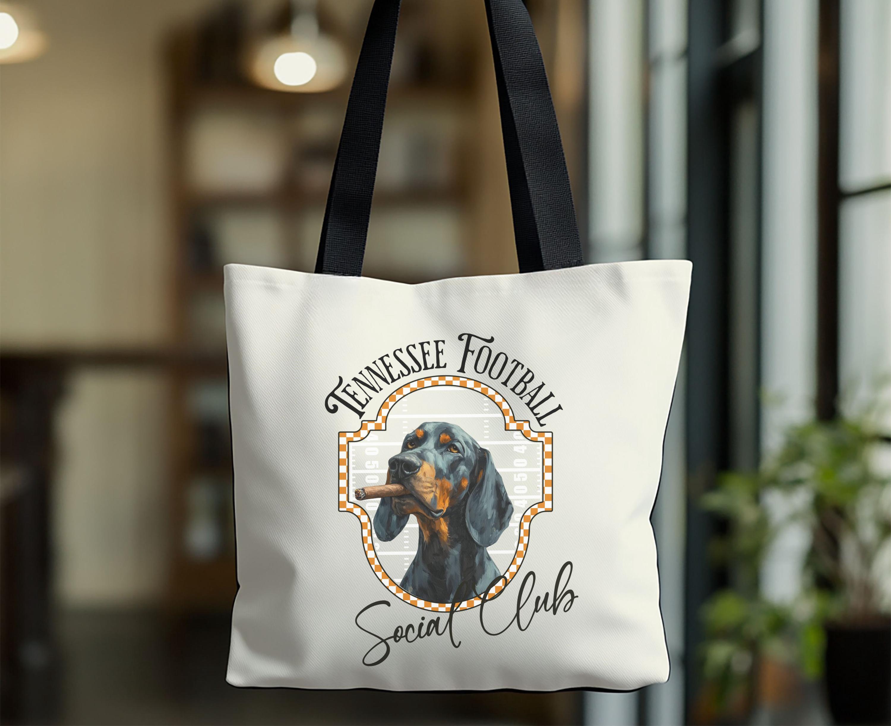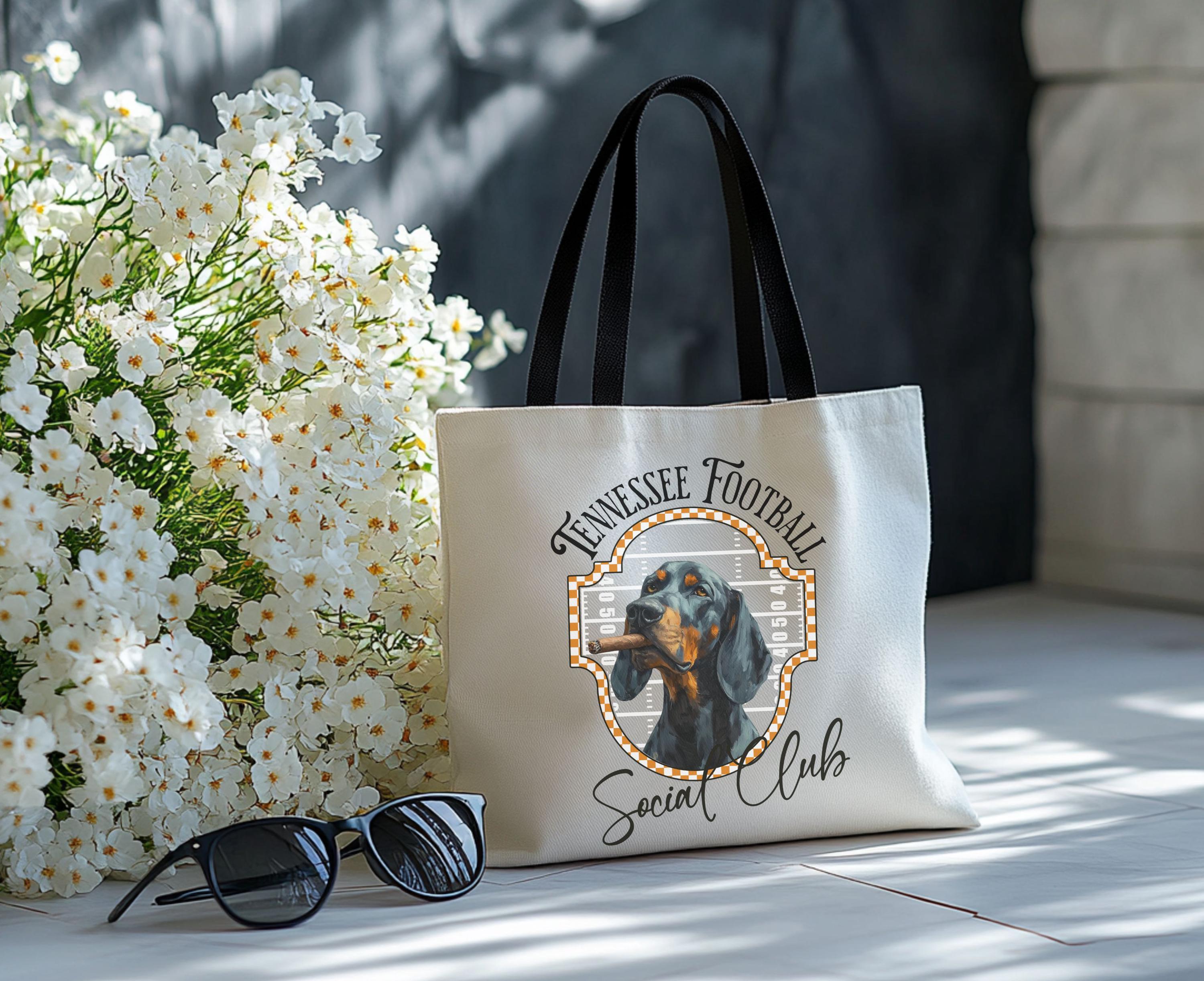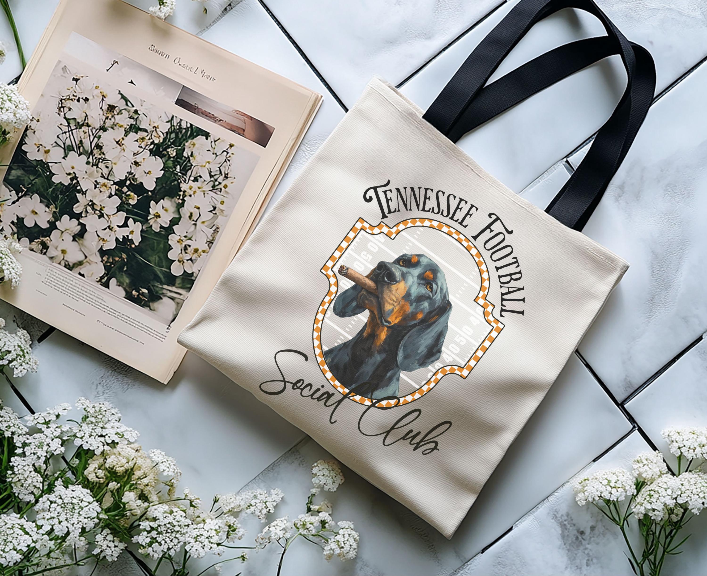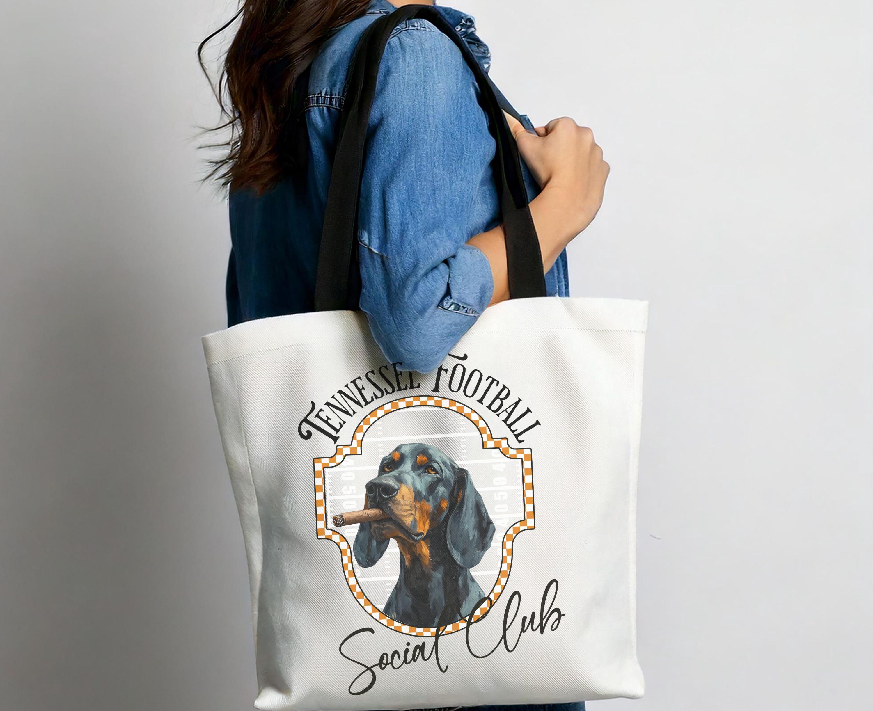 Show off your Tennessee pride with this stylish Tennessee Football Tote Bag, featuring a sophisticated Smokey with a cigar—a perfect nod to UT game-day spirit with social club vibes! Whether you're heading to a tailgate, grocery shopping in Knoxville, or carrying game-day essentials, this durable and reusable tote is both functional and fashionable. 3 Sizes available with 5 handle color options. Makes a great Vol Graduation gift. Go Vols and hat tip to Smokey!