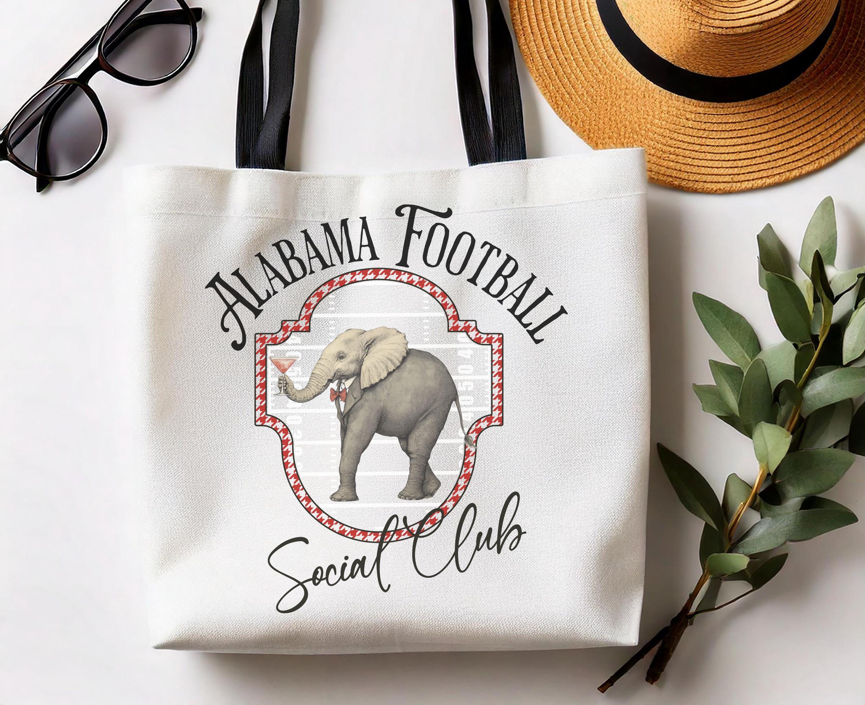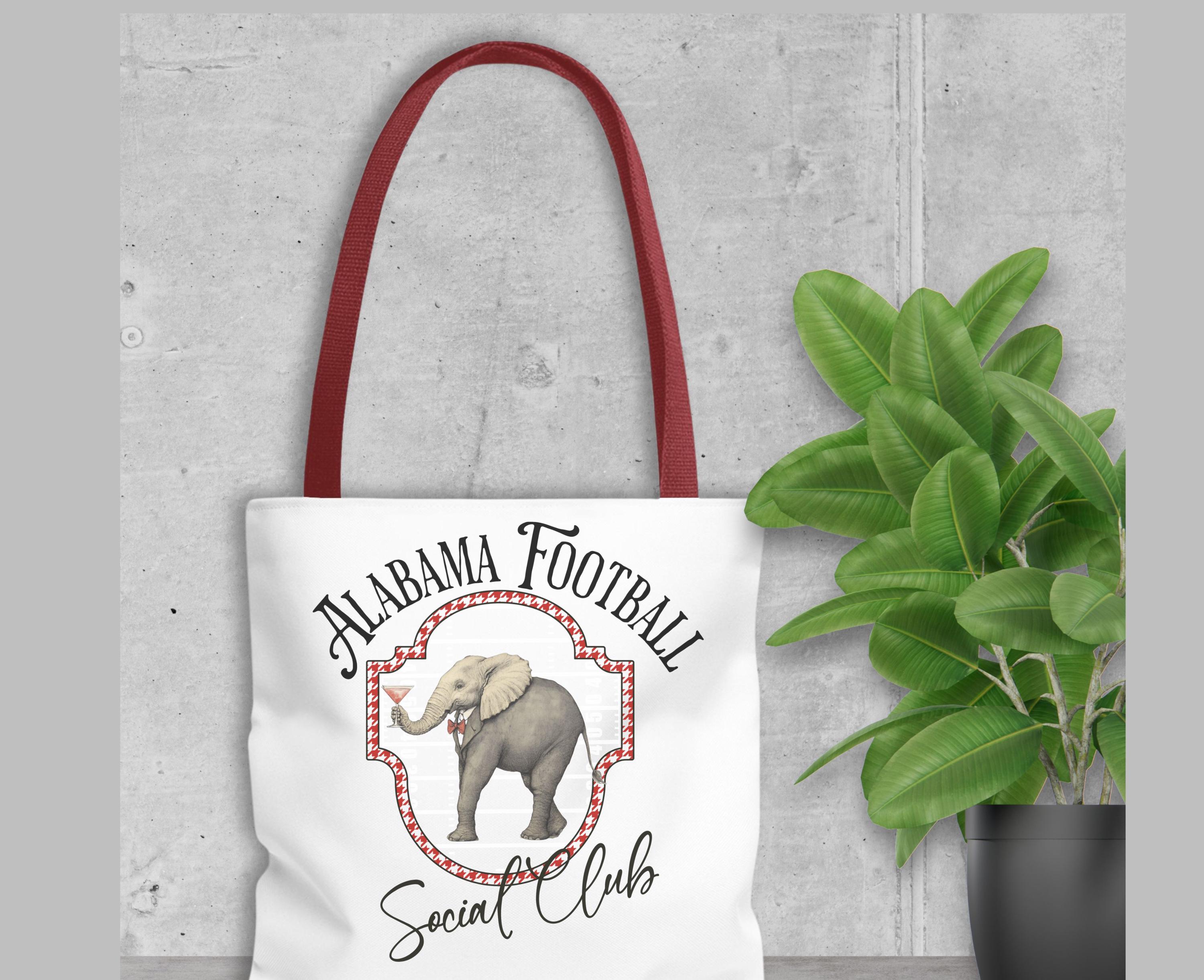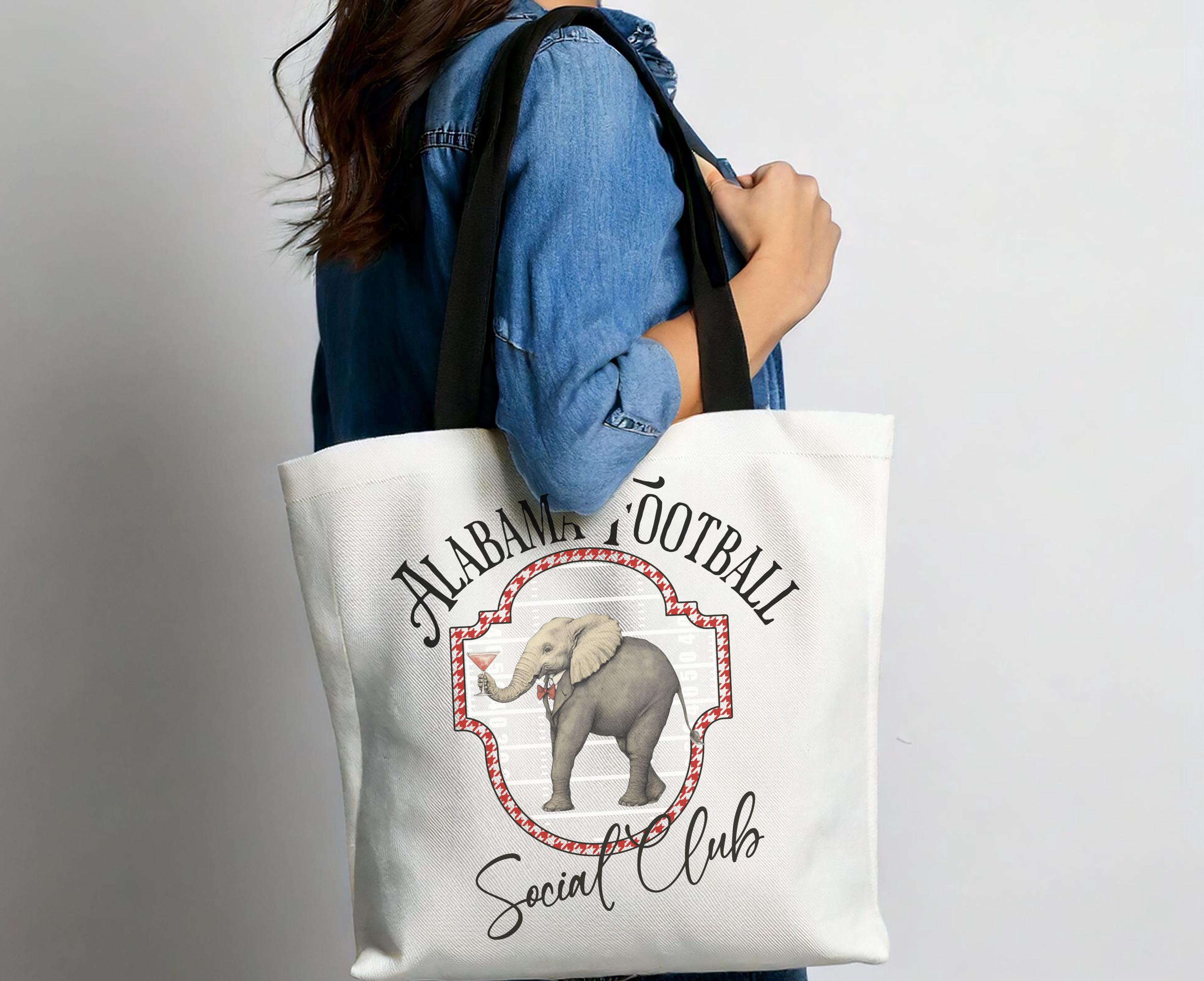 Show off your Alabama pride with this stylish Alabama Football Tote Bag, featuring a sophisticated elephant holding a martini—a perfect nod to game-day spirit and social club vibes! Whether you're heading to a tailgate, grocery shopping, or carrying game-day essentials, this durable and reusable tote is both functional and fashionable. 3 Sizes available with 5 handle color options. Makes a great Bama Graduation gift. Roll Tide and hat tip to Big Al!