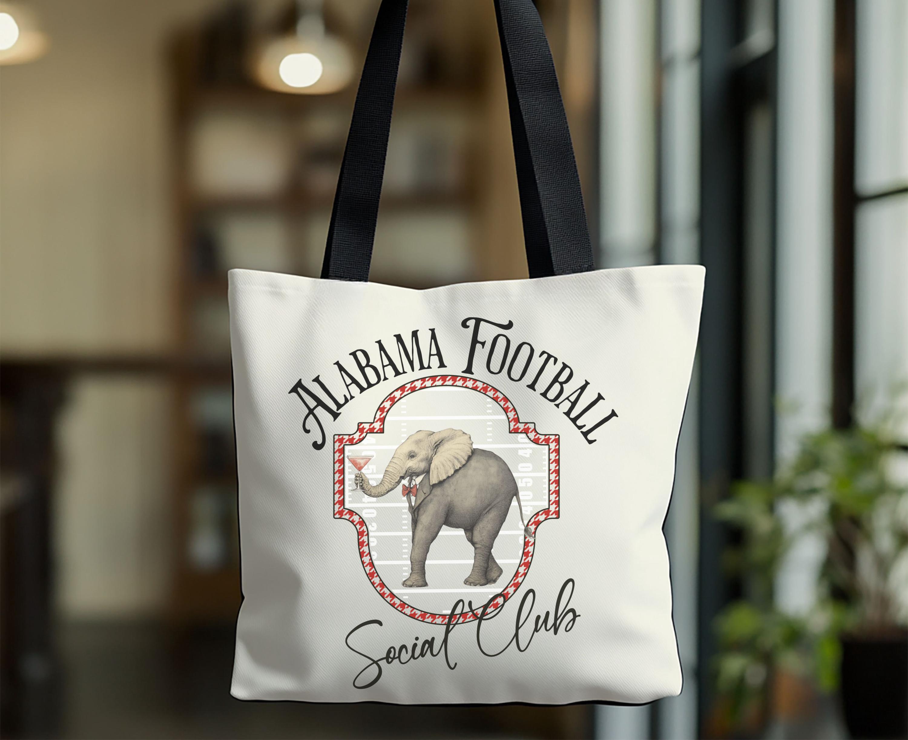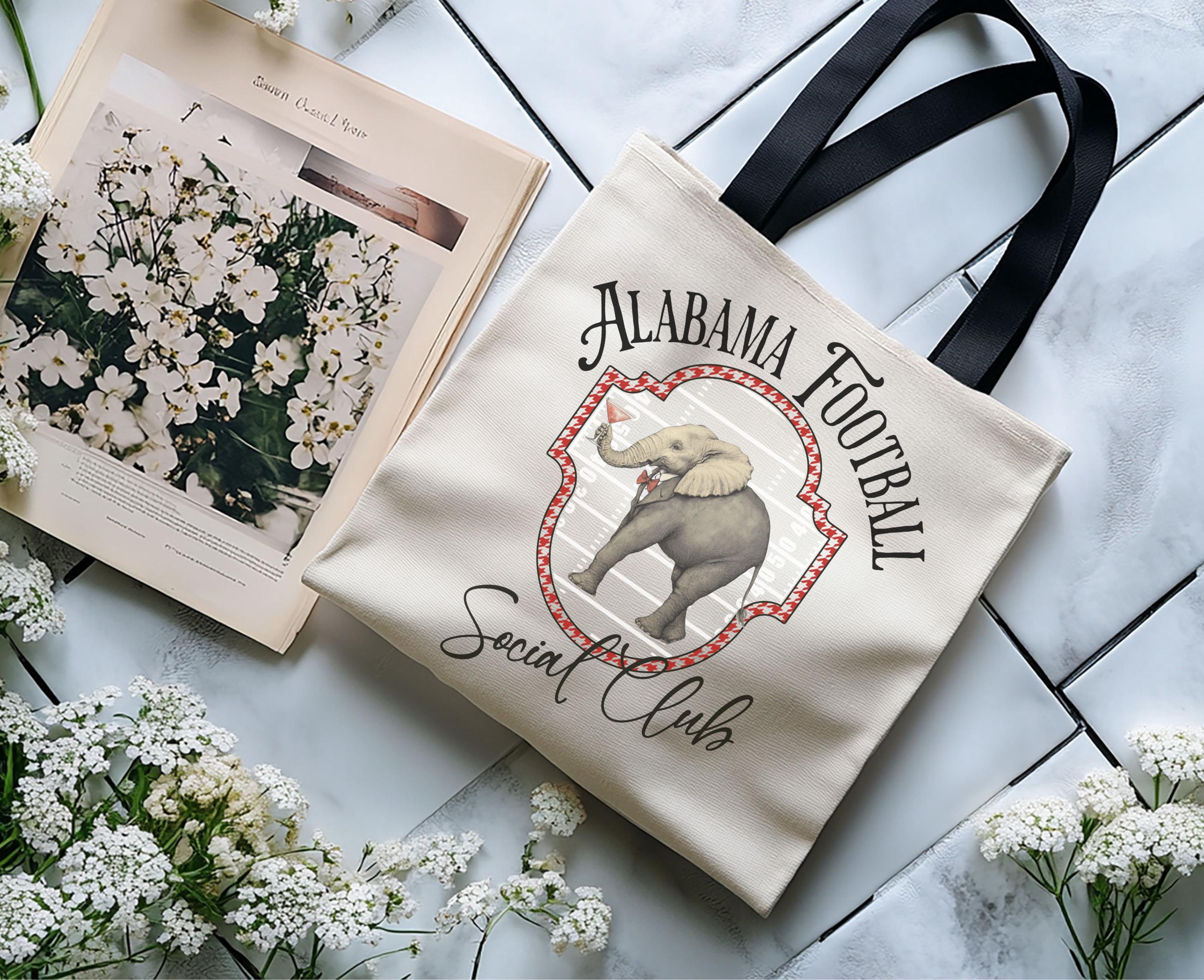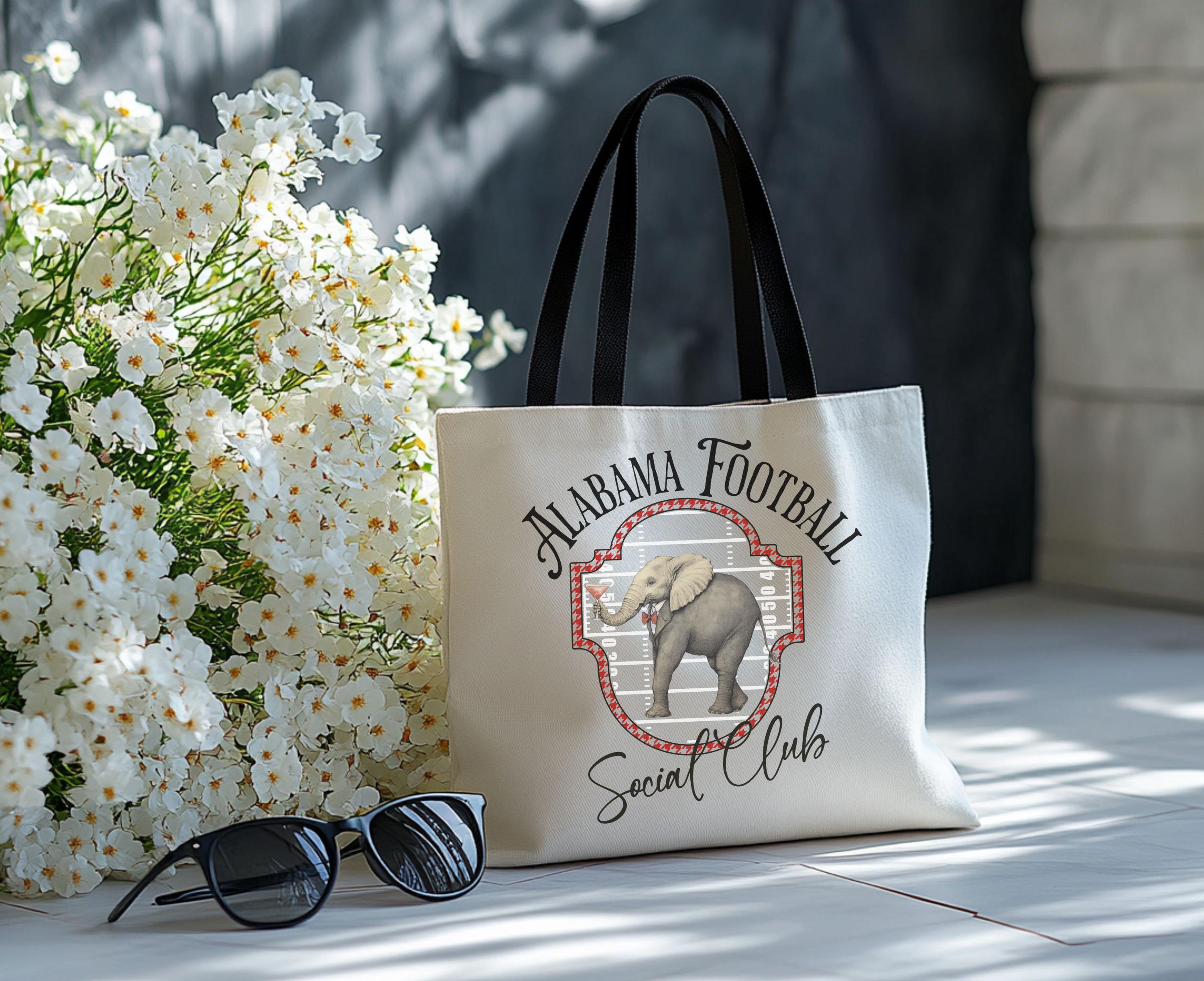 Show off your Alabama pride with this stylish Alabama Football Tote Bag, featuring a sophisticated elephant holding a martini—a perfect nod to game-day spirit and social club vibes! Whether you're heading to a tailgate, grocery shopping, or carrying game-day essentials, this durable and reusable tote is both functional and fashionable. 3 Sizes available with 5 handle color options. Makes a great Bama Graduation gift. Roll Tide and hat tip to Big Al!
