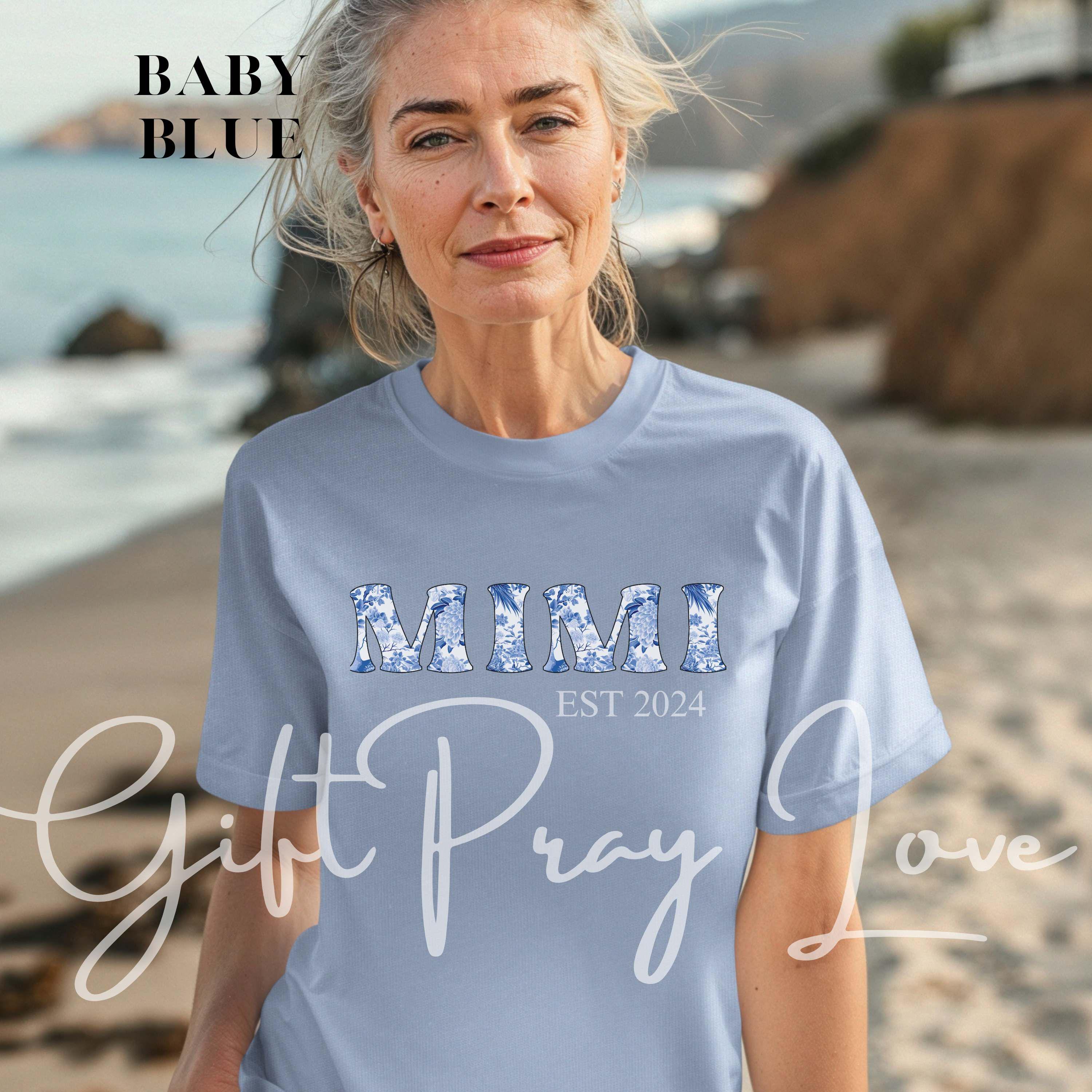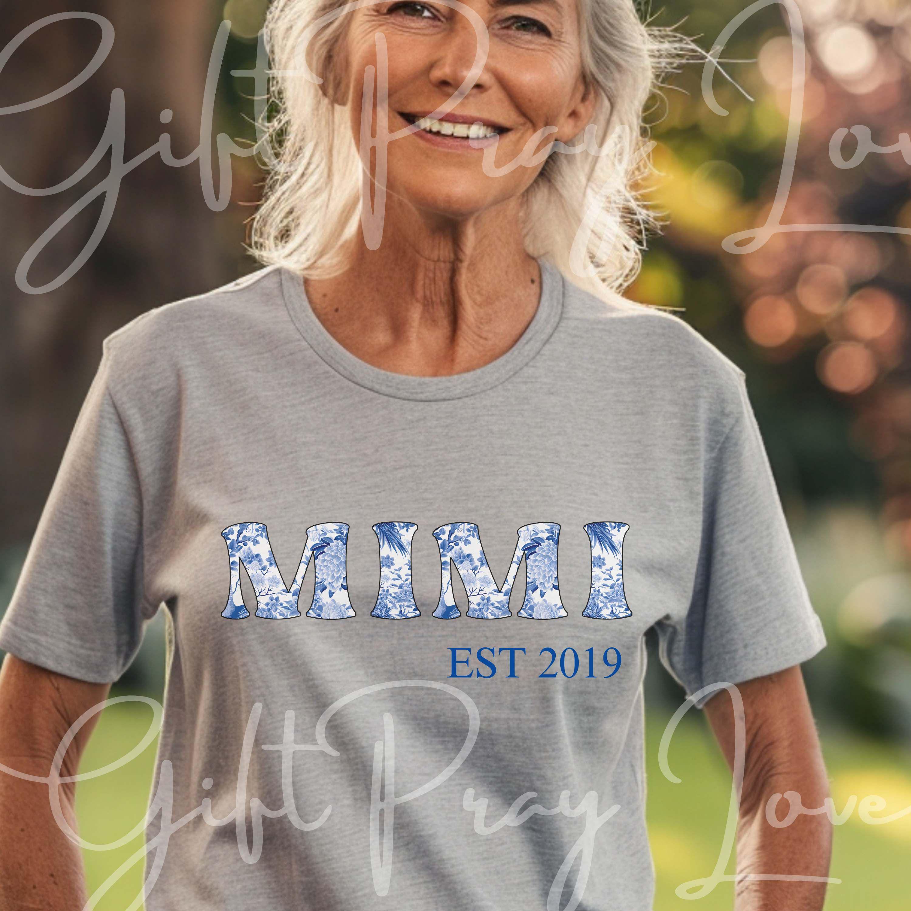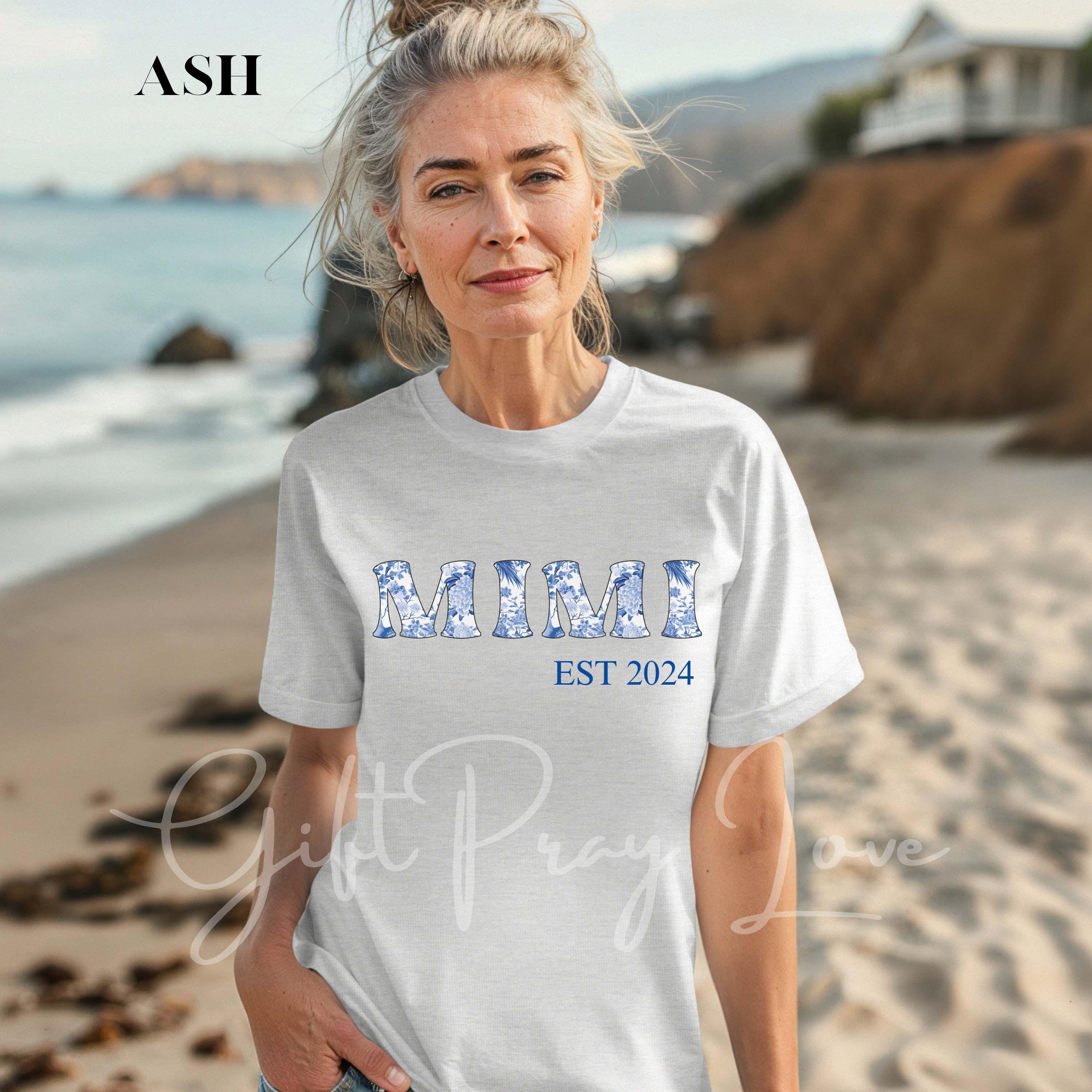 Celebrate the moment she became a grandmother with this personalized “Mimi Est. [Year]” t-shirt, featuring a soft and delicate blue and white toile print—perfect for the new Mimi in your life. Made with premium Bella+Canvas fabric, this tee offers a flattering, lightweight fit and a romantic cottagecore-inspired design she’ll treasure. Whether she’s embracing her new title or proudly announcing it to the world, this t-shirt is the perfect way to honor her with comfort, beauty, and personal meaning. Gift the joy of Mimi’s new chapter—with a shirt as lovely as the role she’s stepping into.