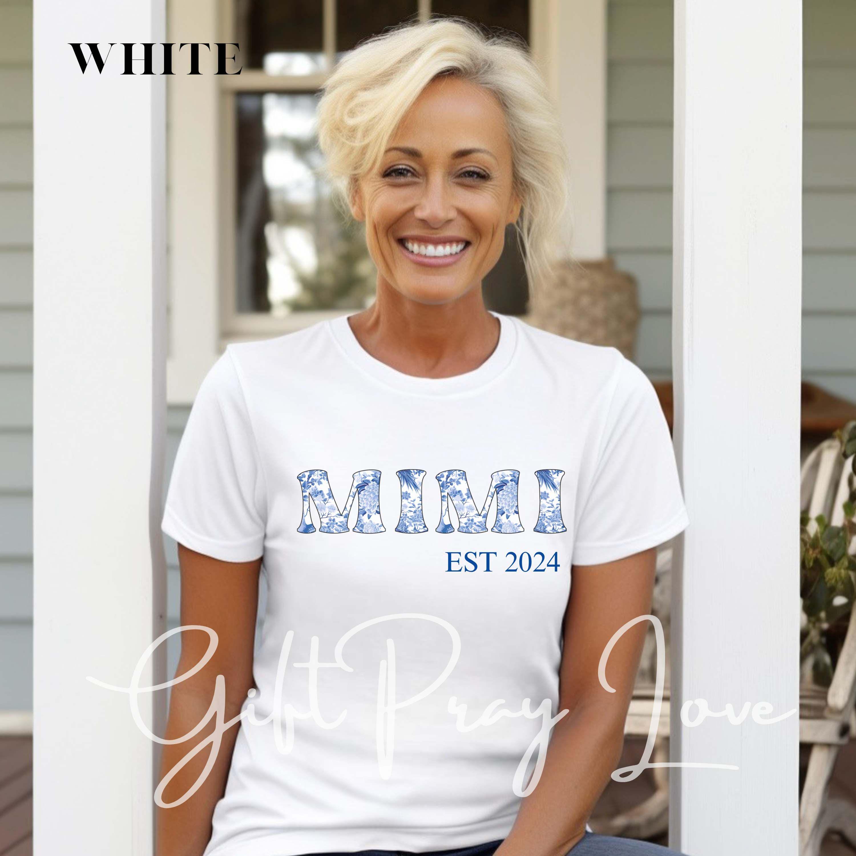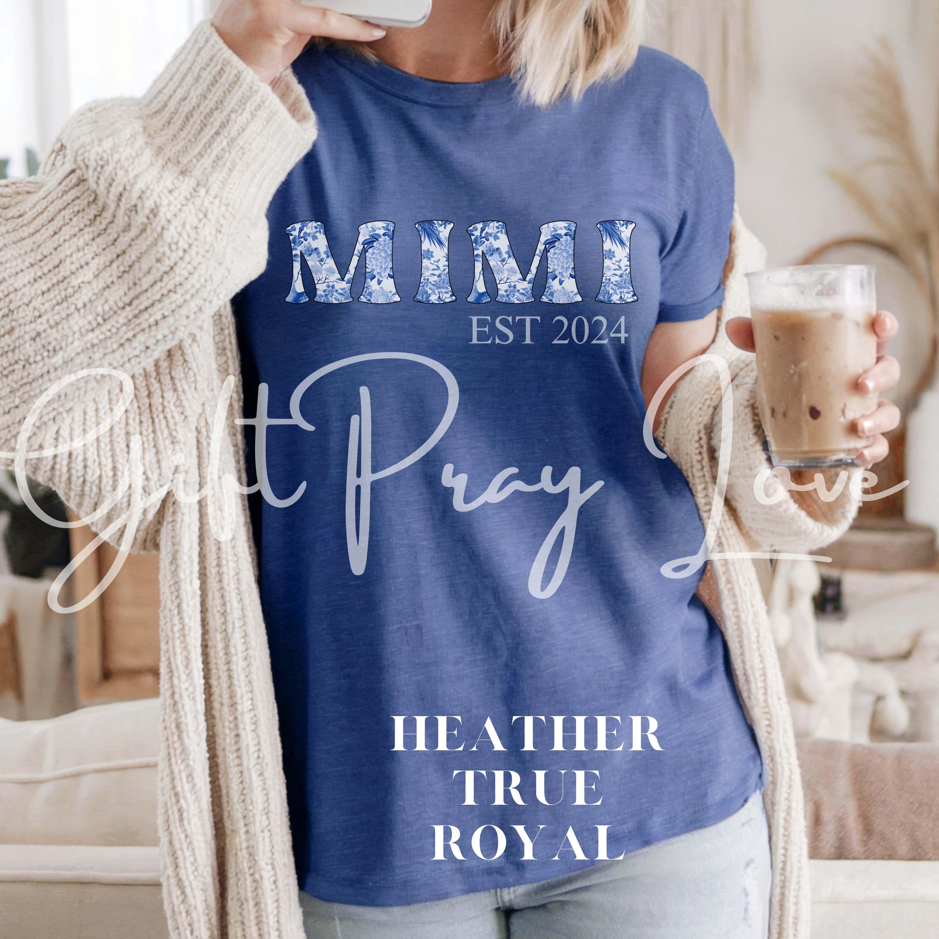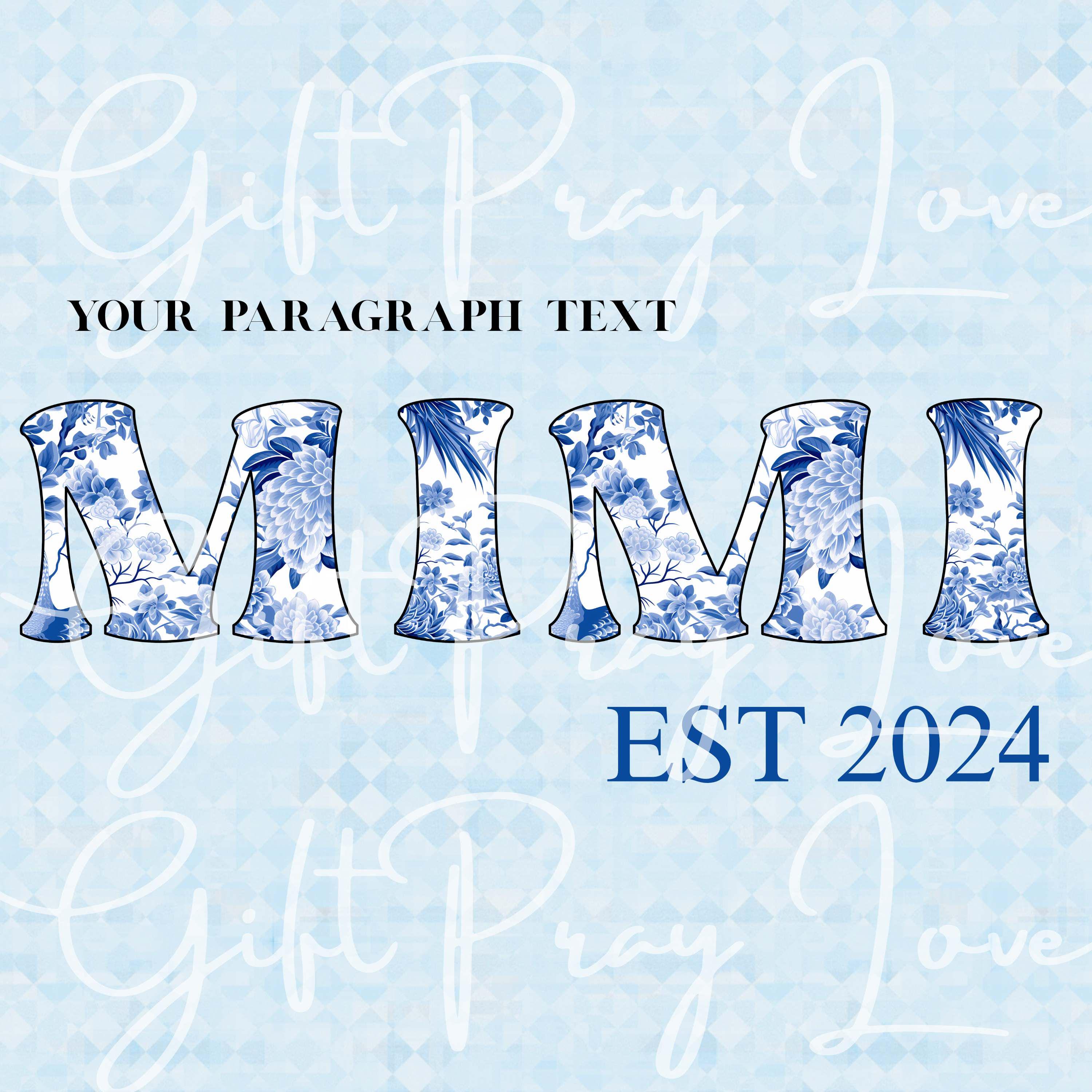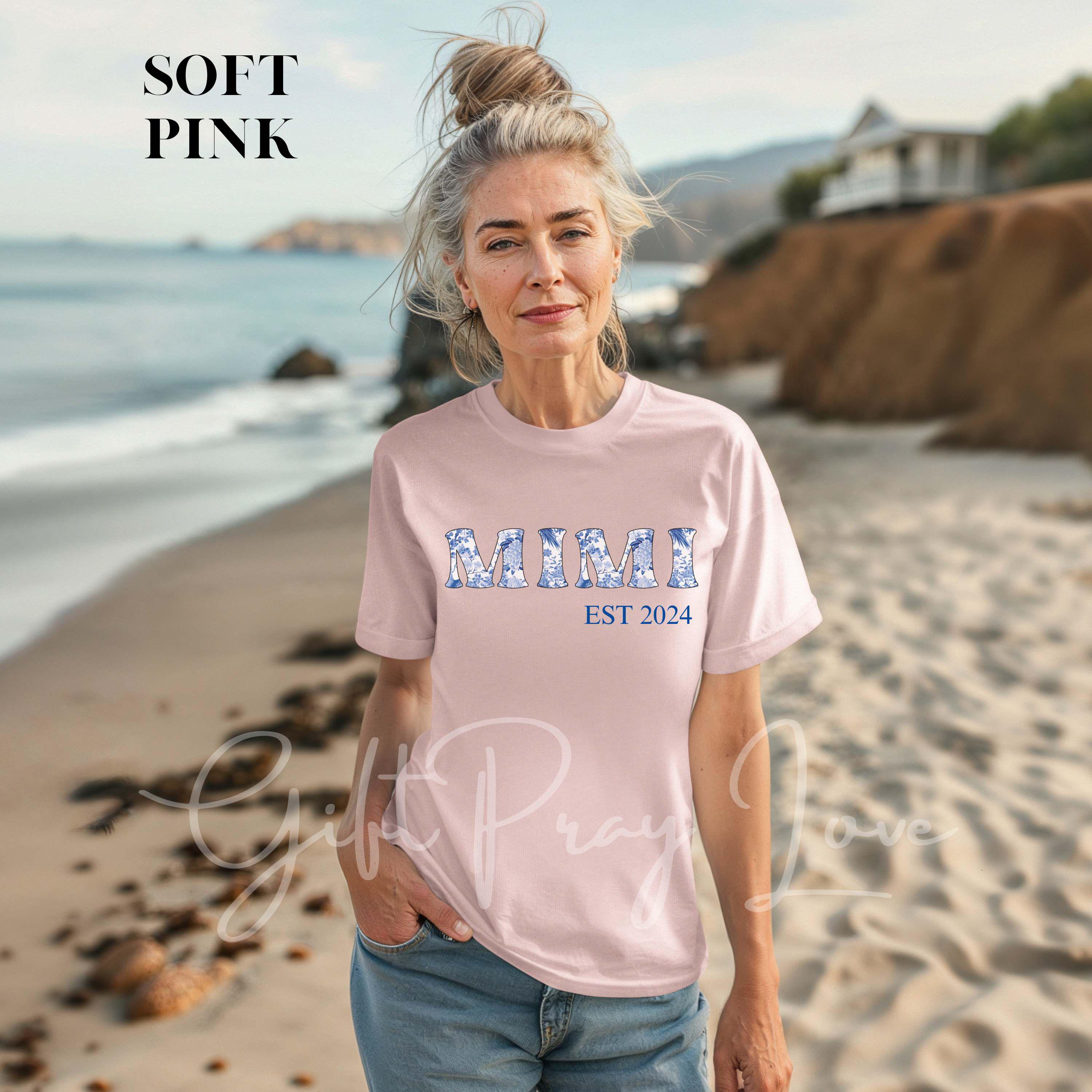Celebrate the moment she became a grandmother with this personalized “Mimi Est. [Year]” t-shirt, featuring a soft and delicate blue and white toile print—perfect for the new Mimi in your life. Made with premium Bella+Canvas fabric, this tee offers a flattering, lightweight fit and a romantic cottagecore-inspired design she’ll treasure. Whether she’s embracing her new title or proudly announcing it to the world, this t-shirt is the perfect way to honor her with comfort, beauty, and personal meaning. Gift the joy of Mimi’s new chapter—with a shirt as lovely as the role she’s stepping into.
