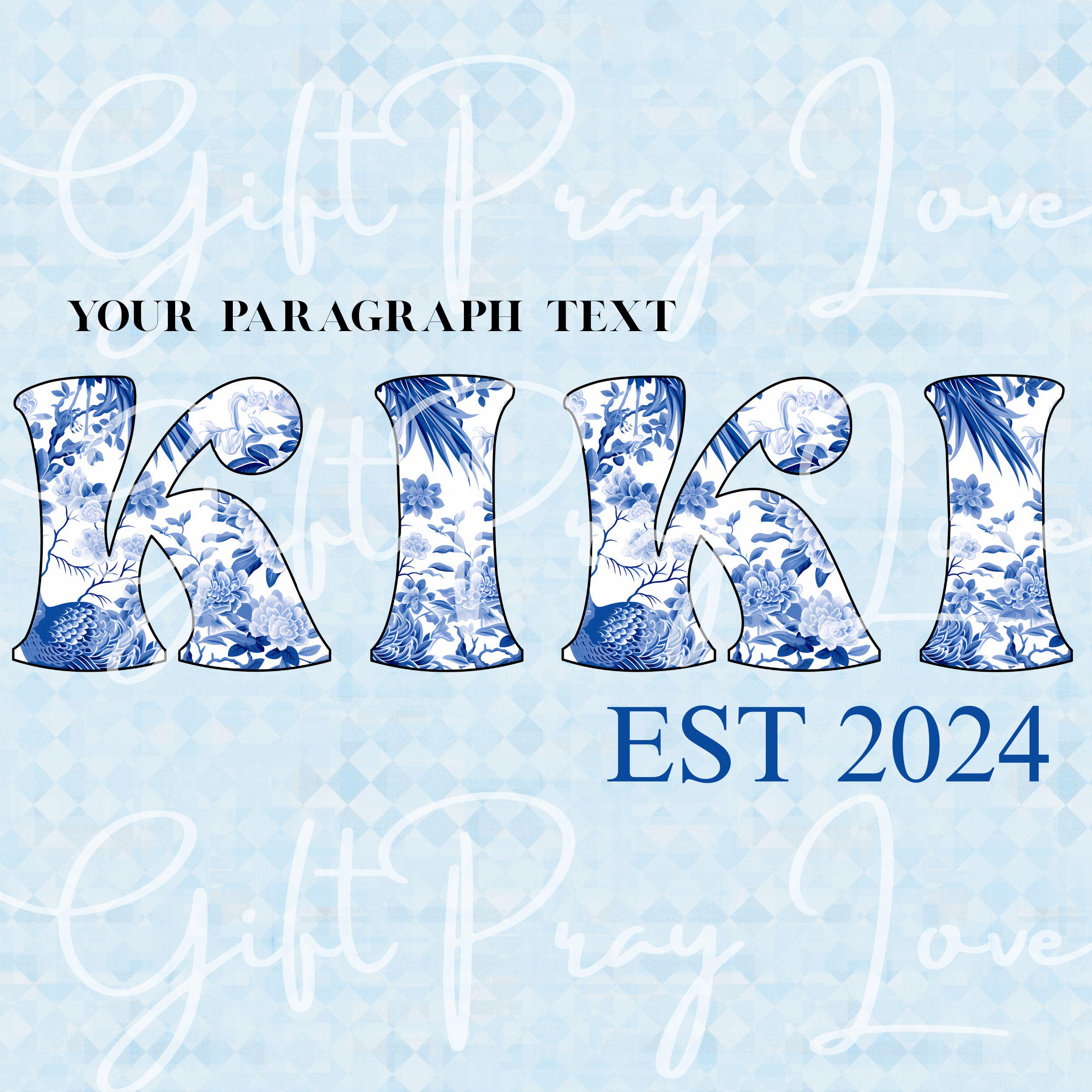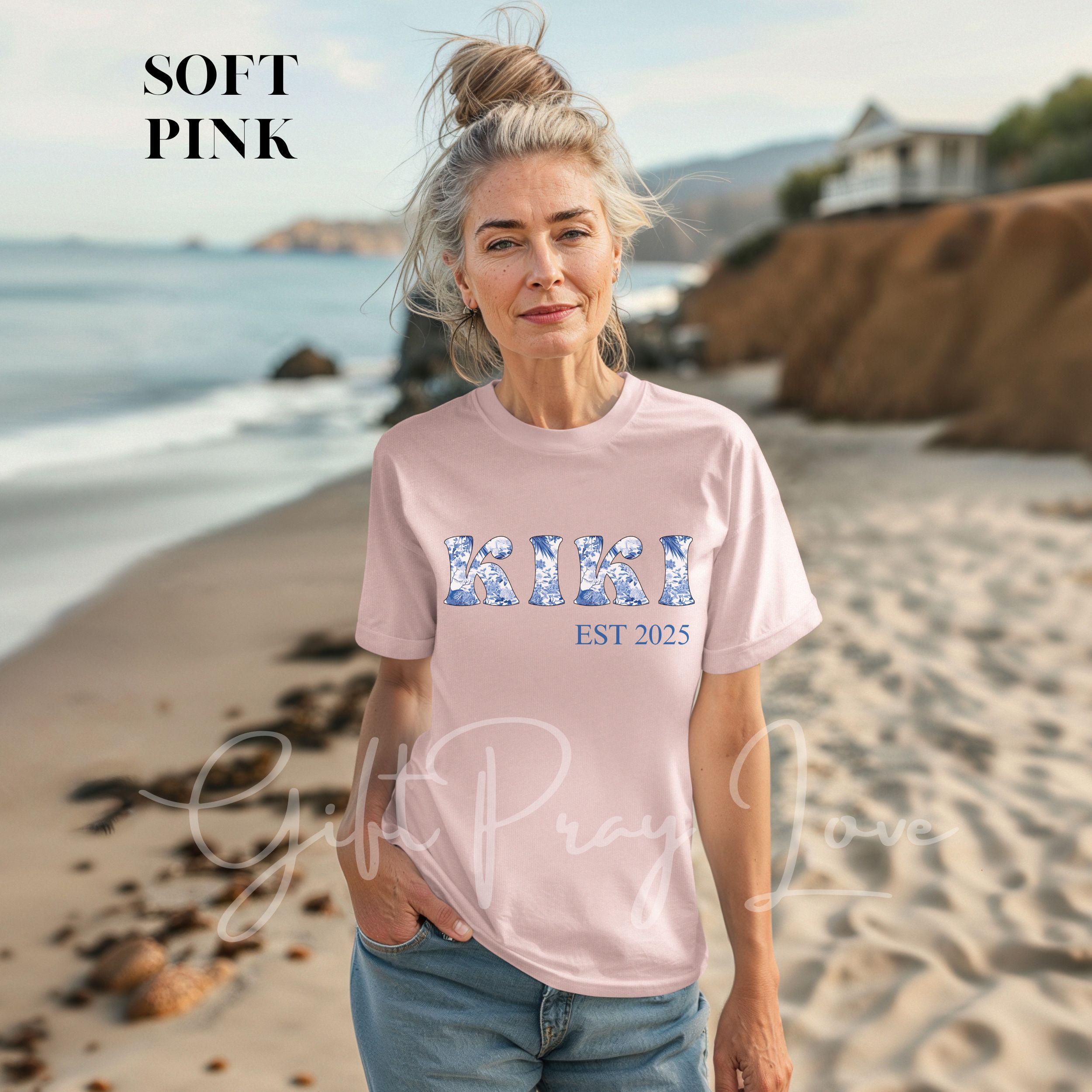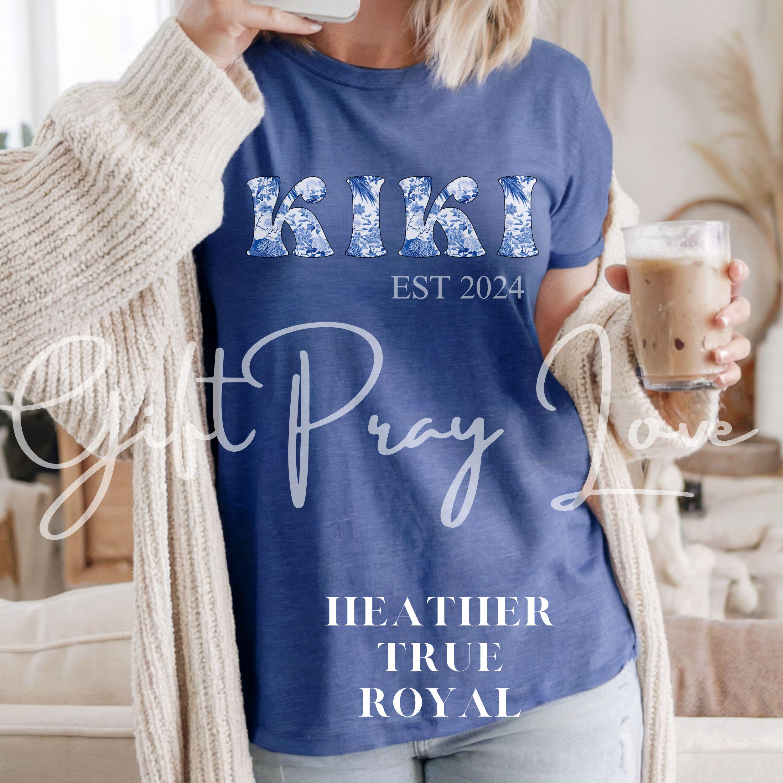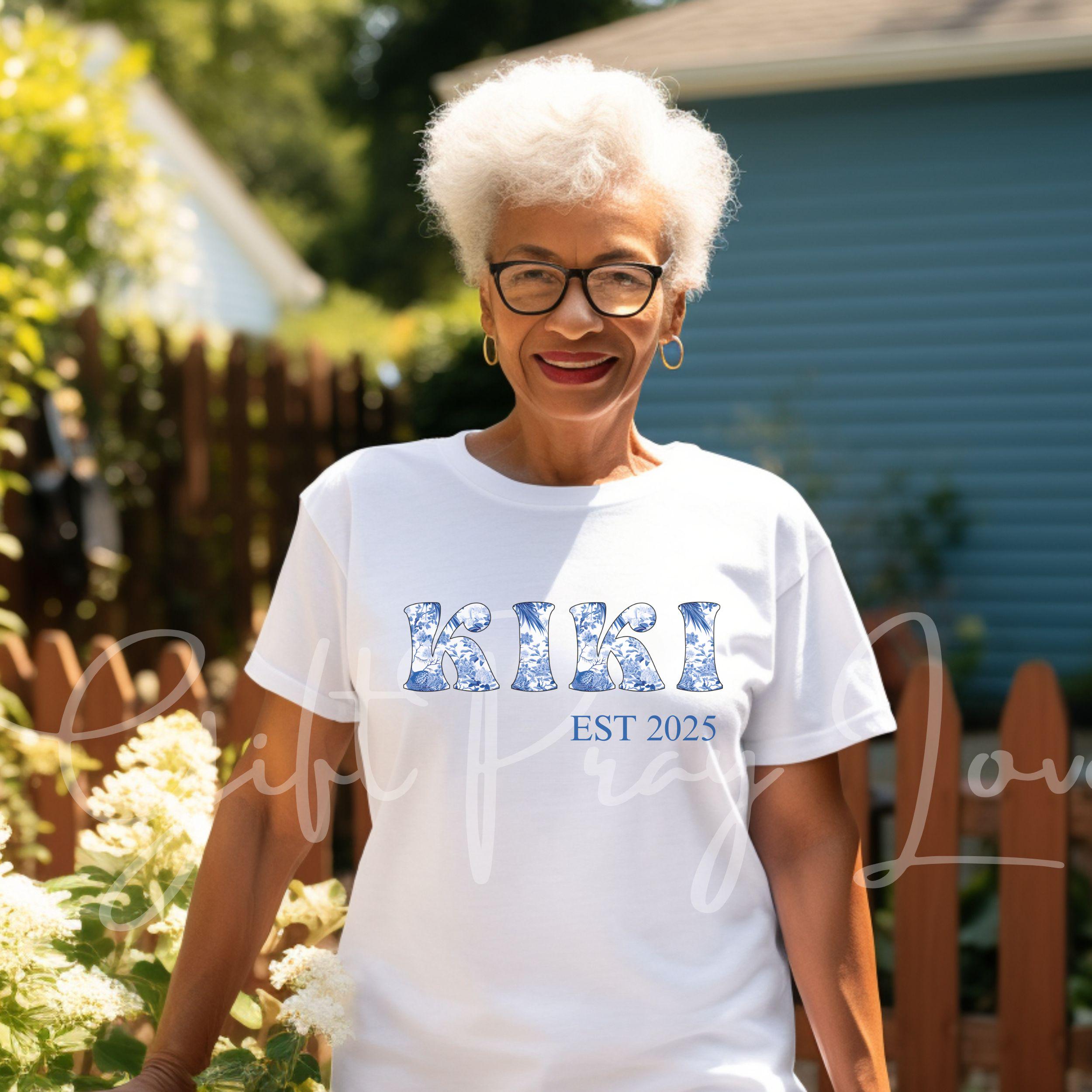 Celebrate the moment she became a grandmother with this personalized “Kiki Est. [Year]” t-shirt, featuring a soft and delicate blue and white toile print—perfect for the new Kiki in your life. Made with premium Bella+Canvas fabric, this tee offers a flattering, lightweight fit and a romantic cottagecore-inspired design she’ll treasure. Whether she’s embracing her new title or proudly announcing it to the world, this t-shirt is the perfect way to honor her with comfort, beauty, and personal meaning. Gift the joy of Kiki’s new chapter—with a shirt as lovely as the role she’s stepping into.