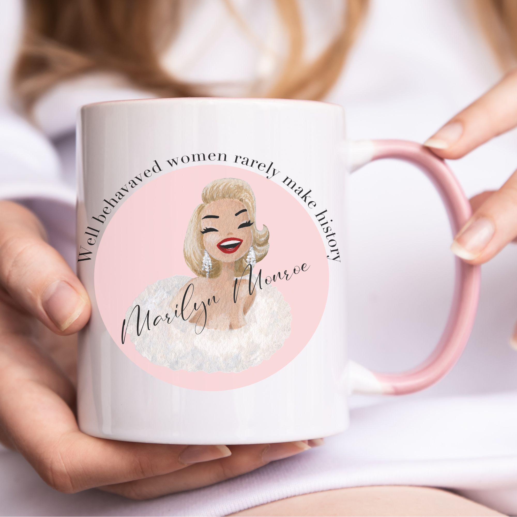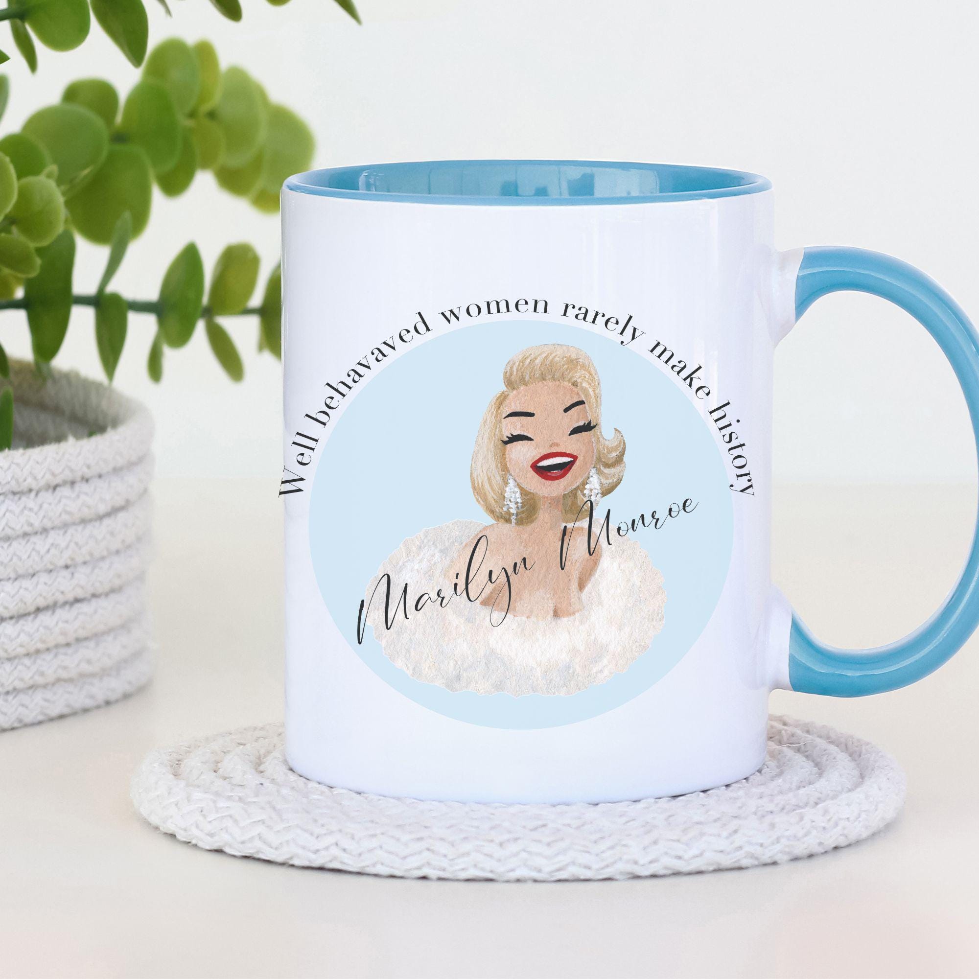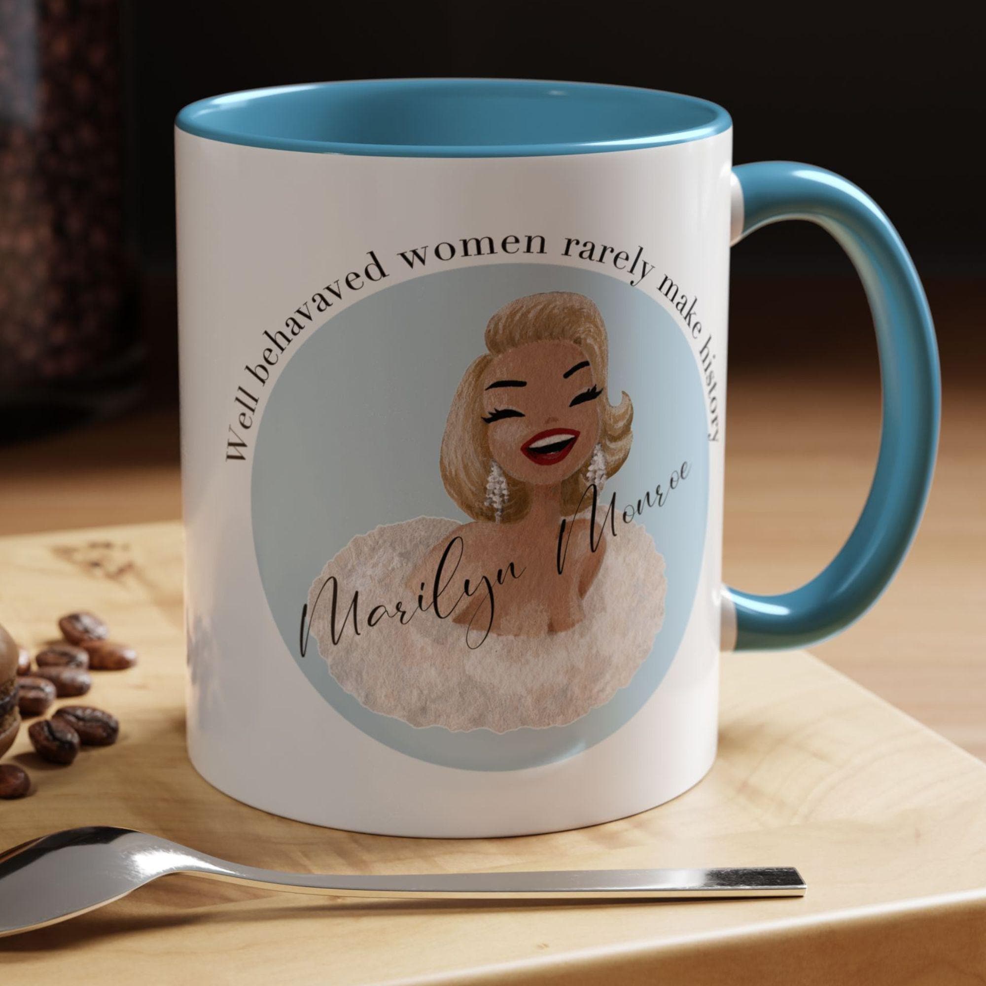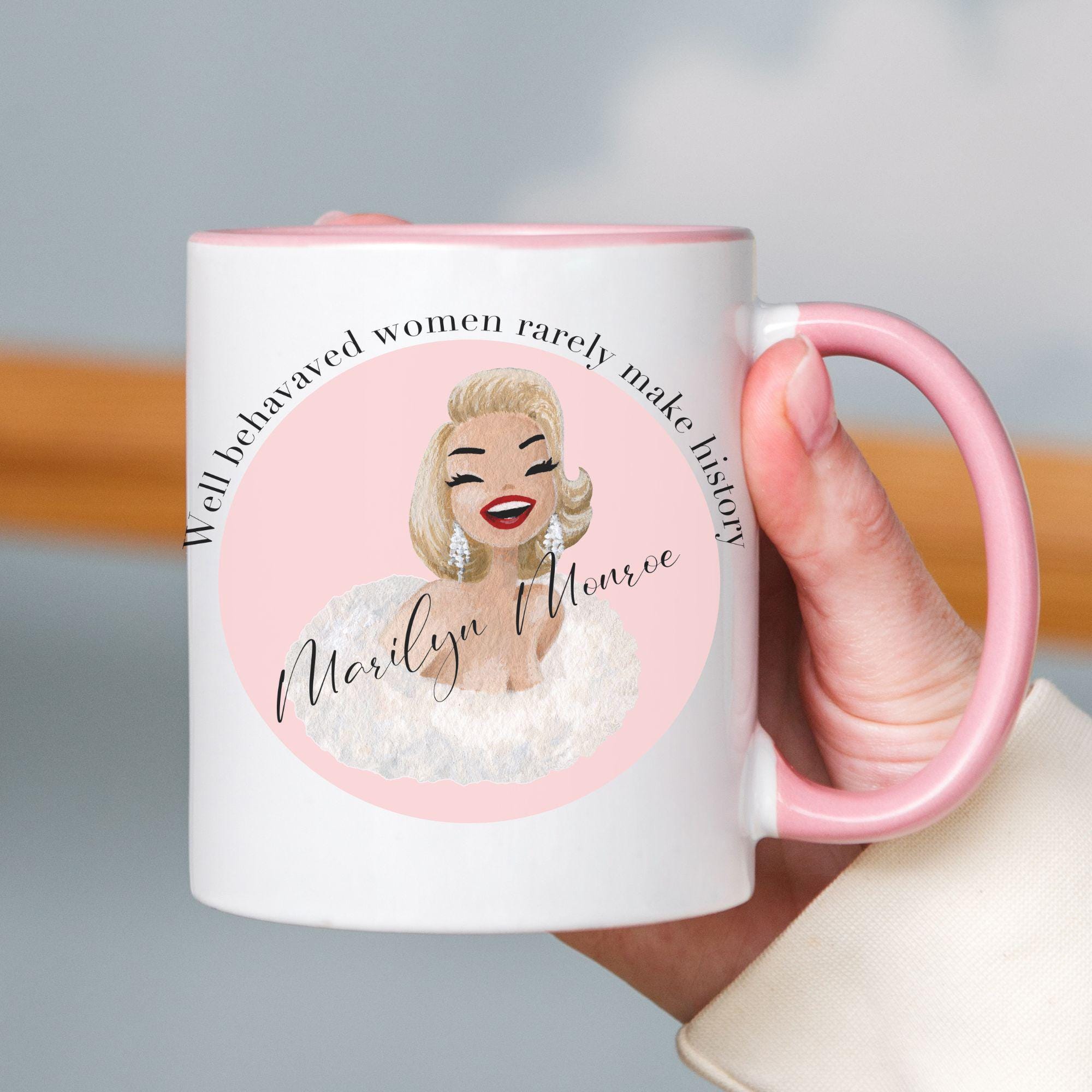 Start your day with sass and inspiration with this charming Marilyn Monroe-inspired vintage coffee mug. Featuring a delightful caricature of Marilyn in a nostalgic retro style and the empowering quote "Well-behaved women rarely make history," this ceramic mug brings attitude and aesthetic to every sip.