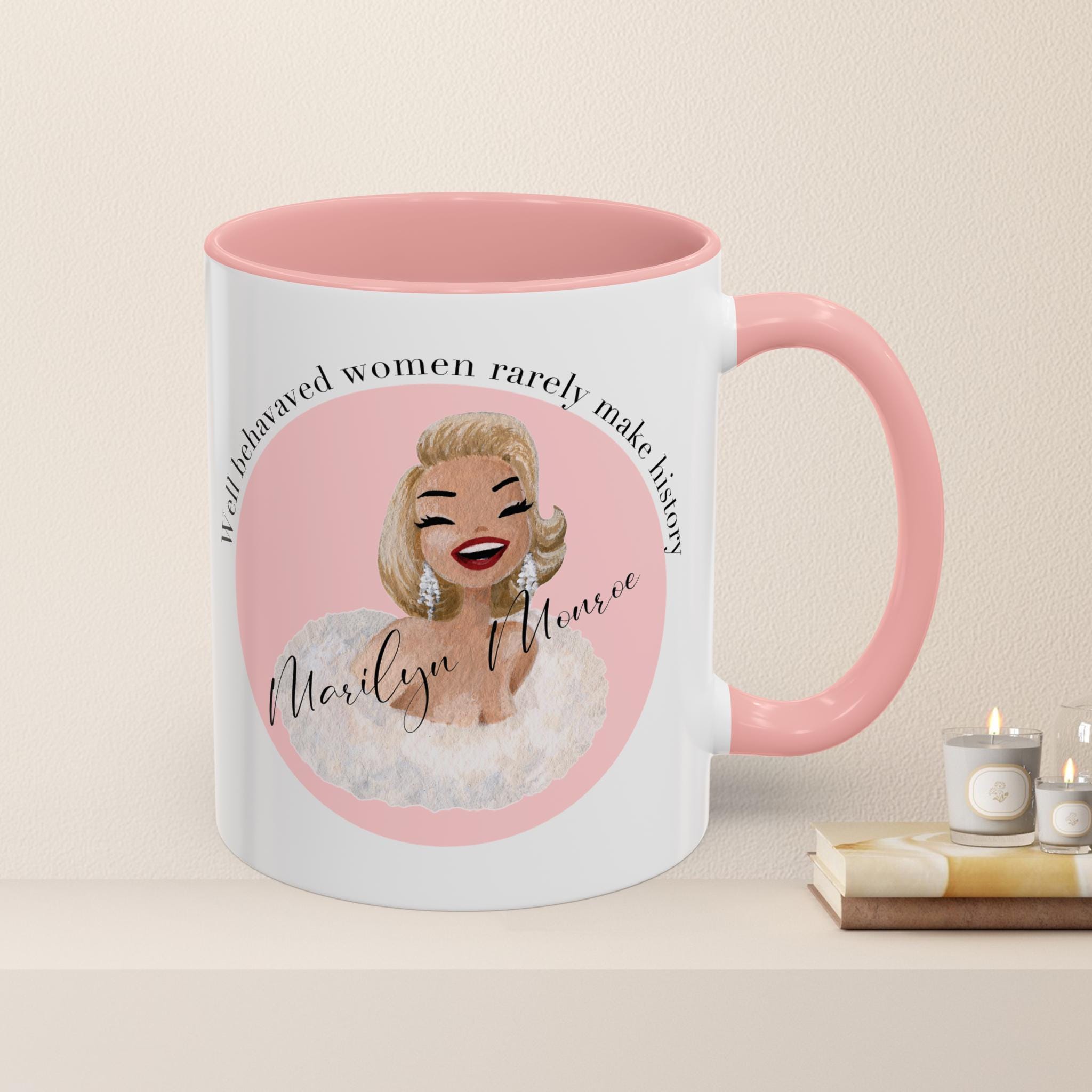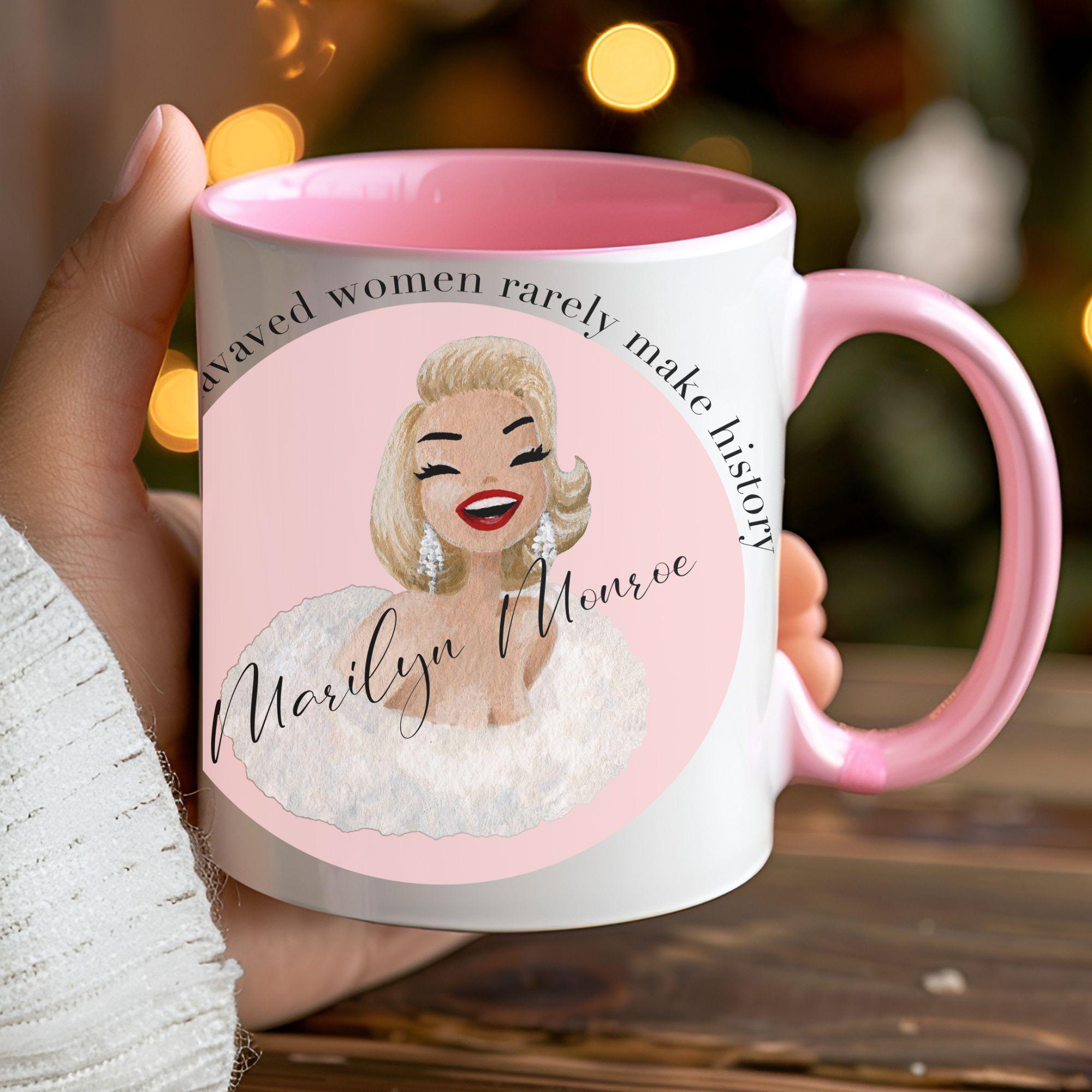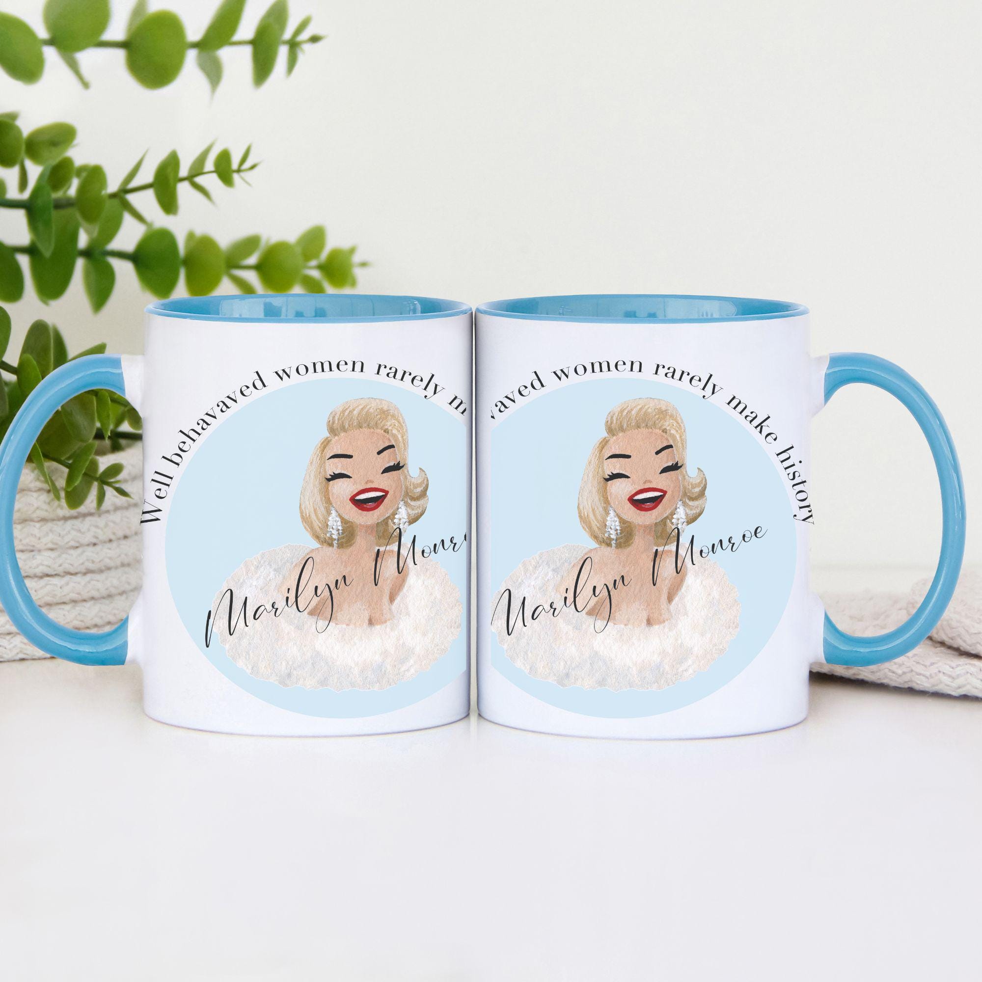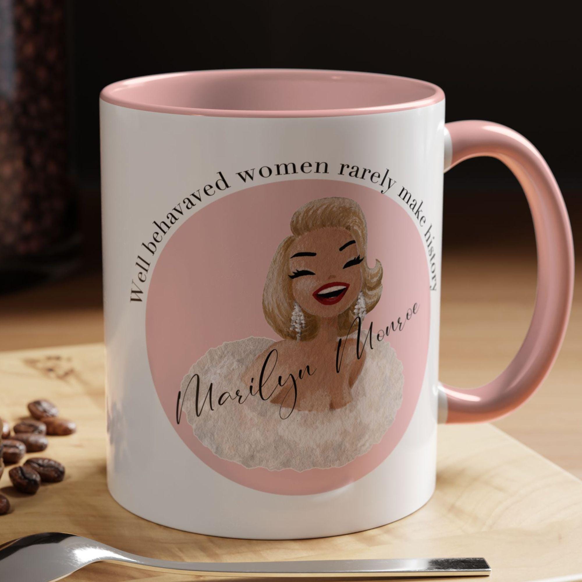 Start your day with sass and inspiration with this charming Marilyn Monroe-inspired vintage coffee mug. Featuring a delightful caricature of Marilyn in a nostalgic retro style and the empowering quote "Well-behaved women rarely make history," this ceramic mug brings attitude and aesthetic to every sip.