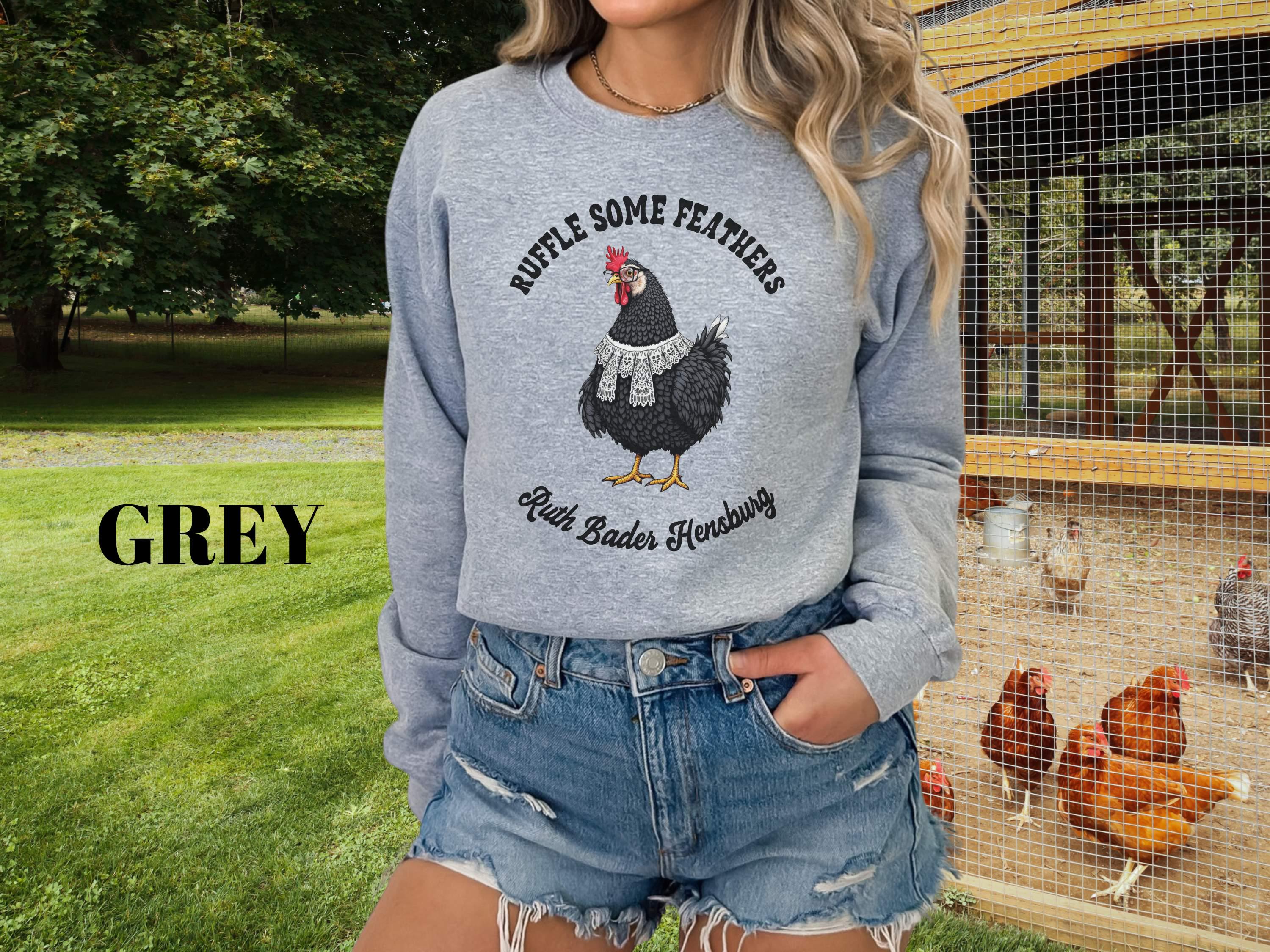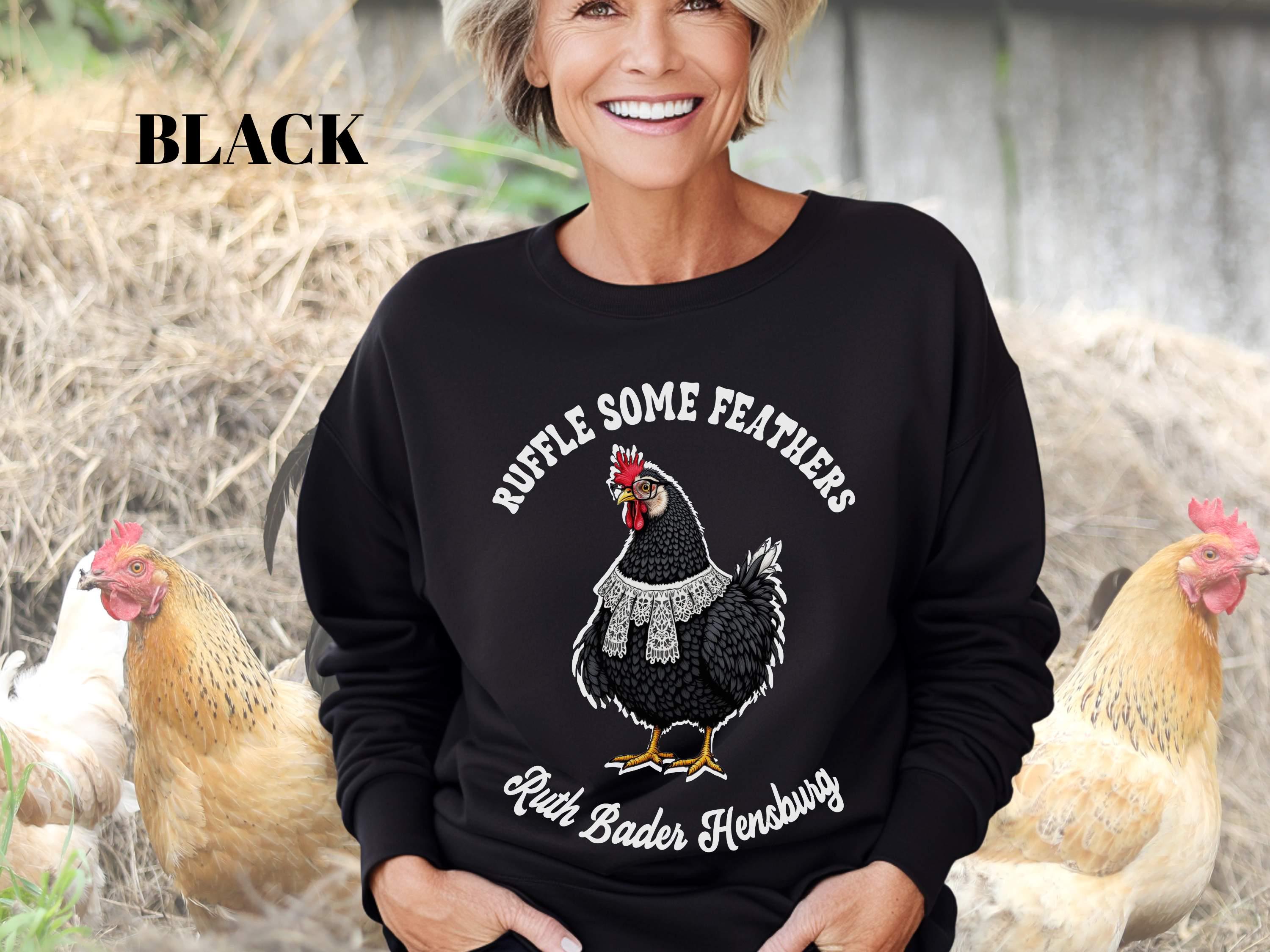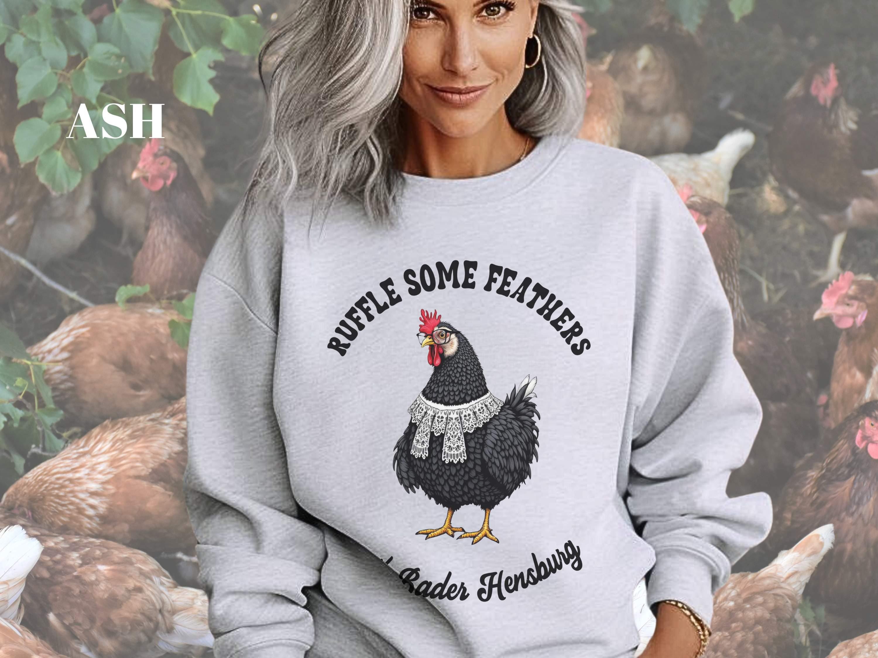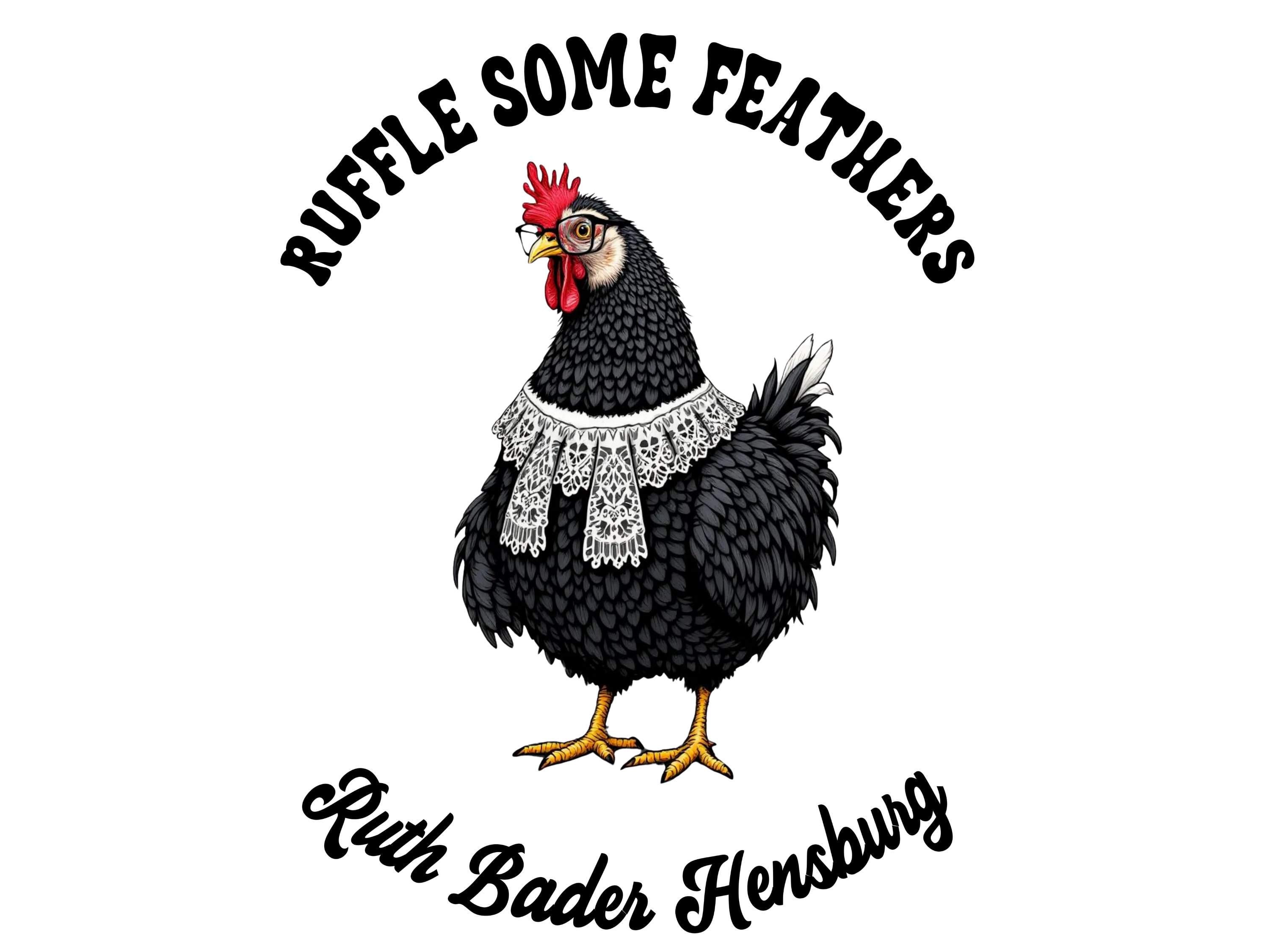 Meet Ruth Bader Hensburg — the sassiest hen in the coop! This witty and whimsical Bella Canvas tee features a bold black-and-white chicken styled after the iconic Ruth Bader Ginsburg, complete with a lace jabot and the defiant phrase: “Ruffle No Feathers.”