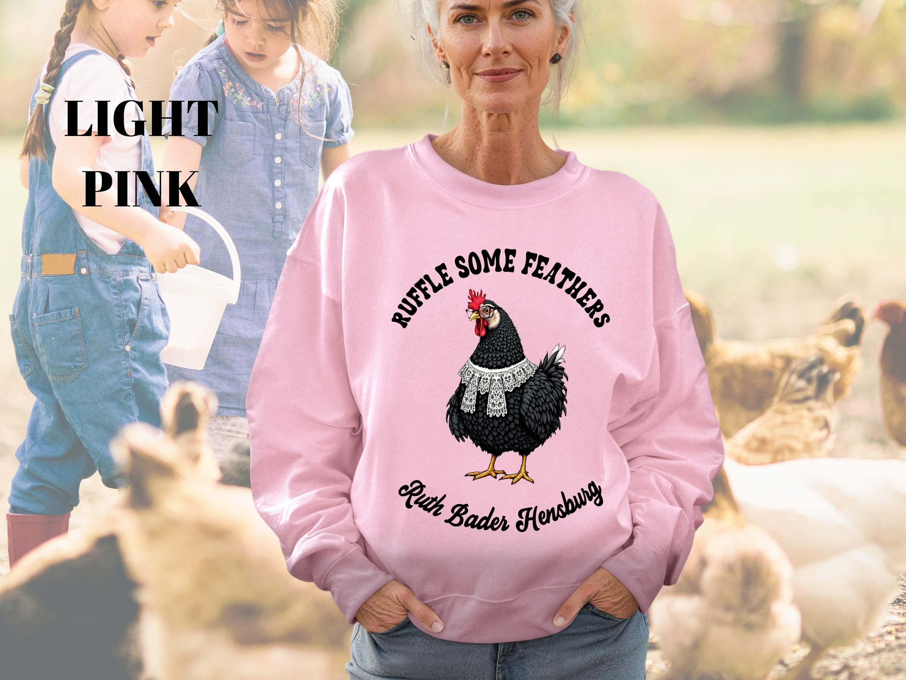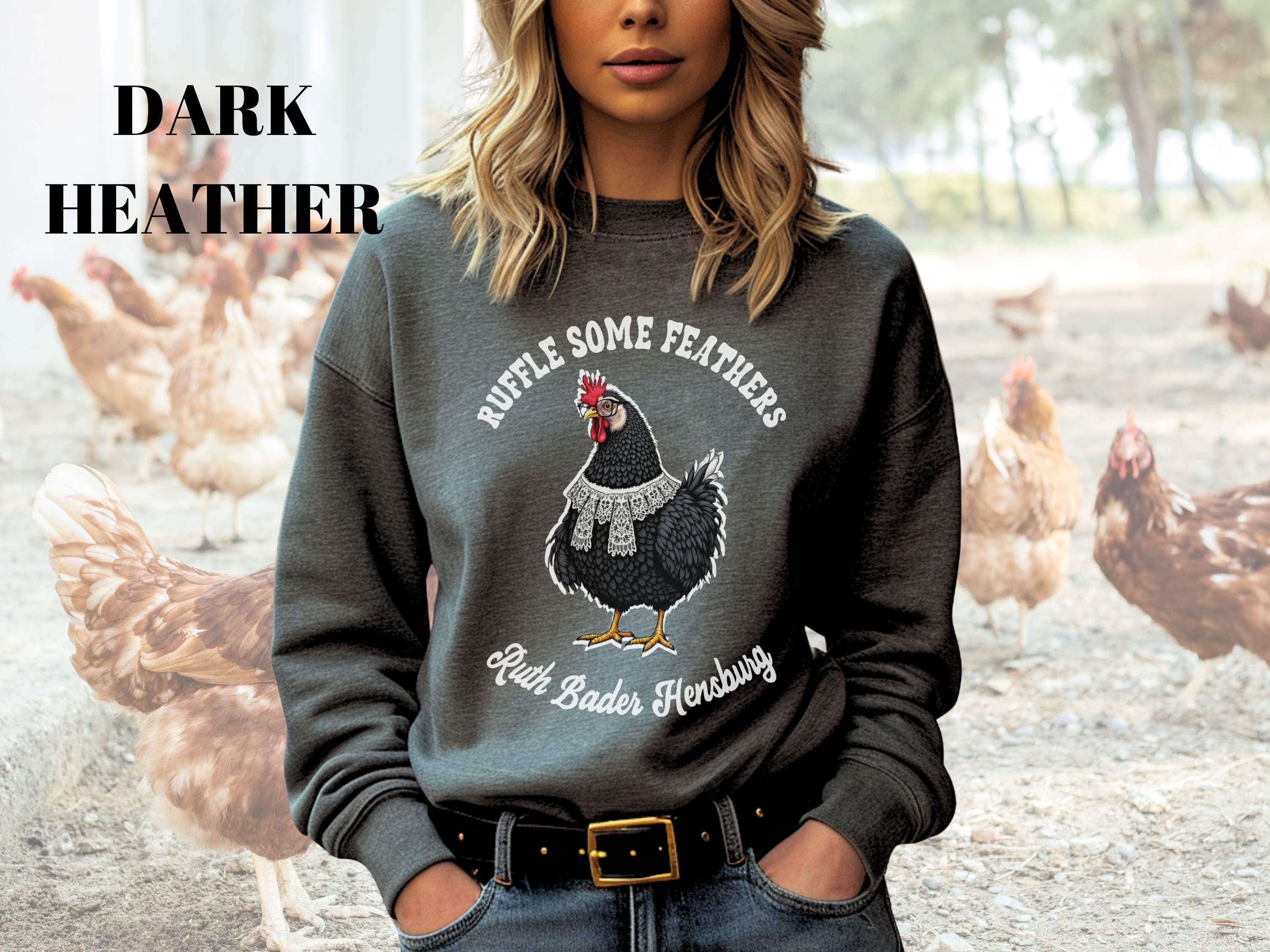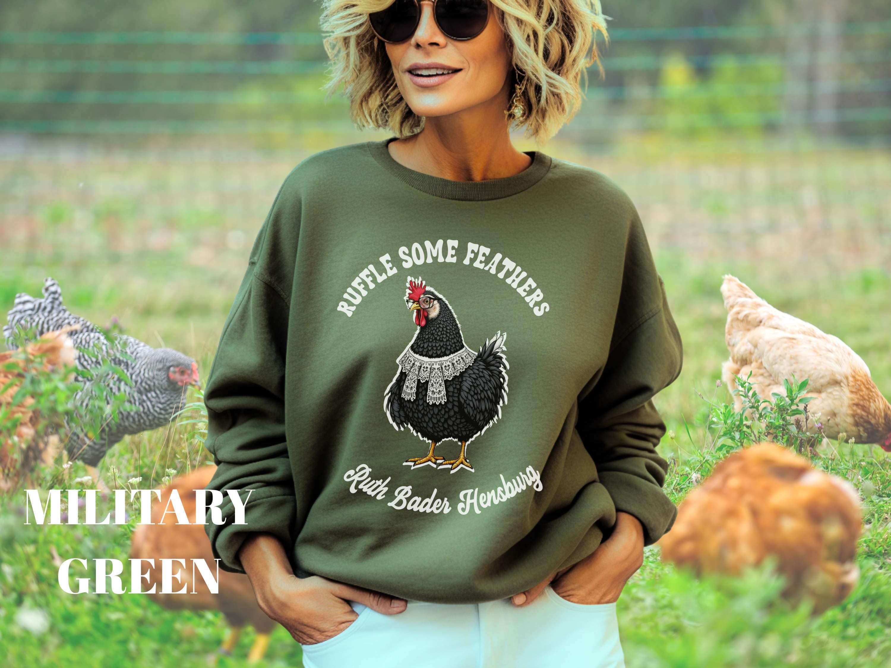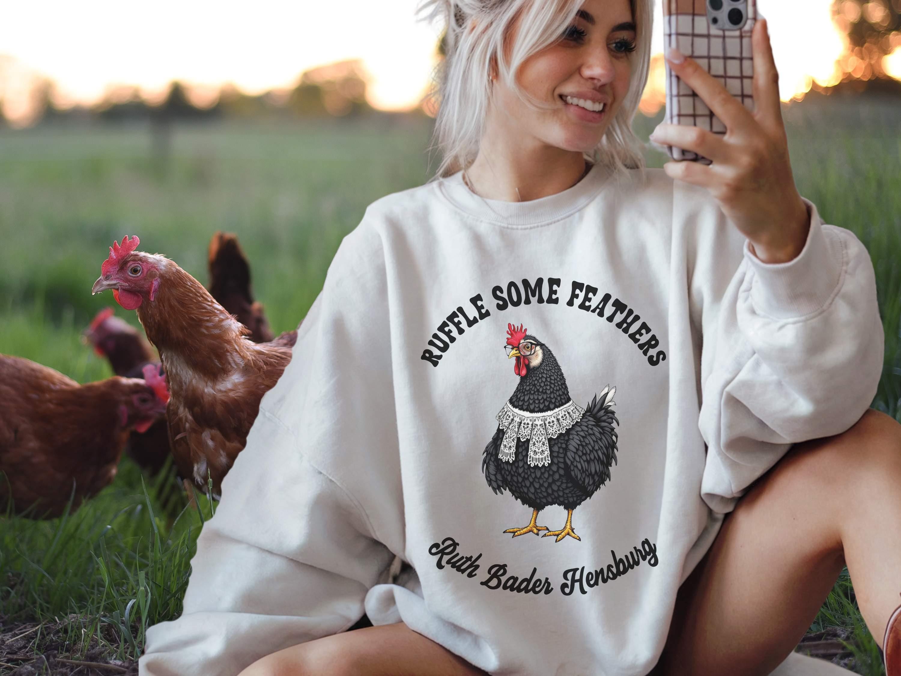 Meet Ruth Bader Hensburg — the sassiest hen in the coop! This witty and whimsical Bella Canvas tee features a bold black-and-white chicken styled after the iconic Ruth Bader Ginsburg, complete with a lace jabot and the defiant phrase: “Ruffle No Feathers.”