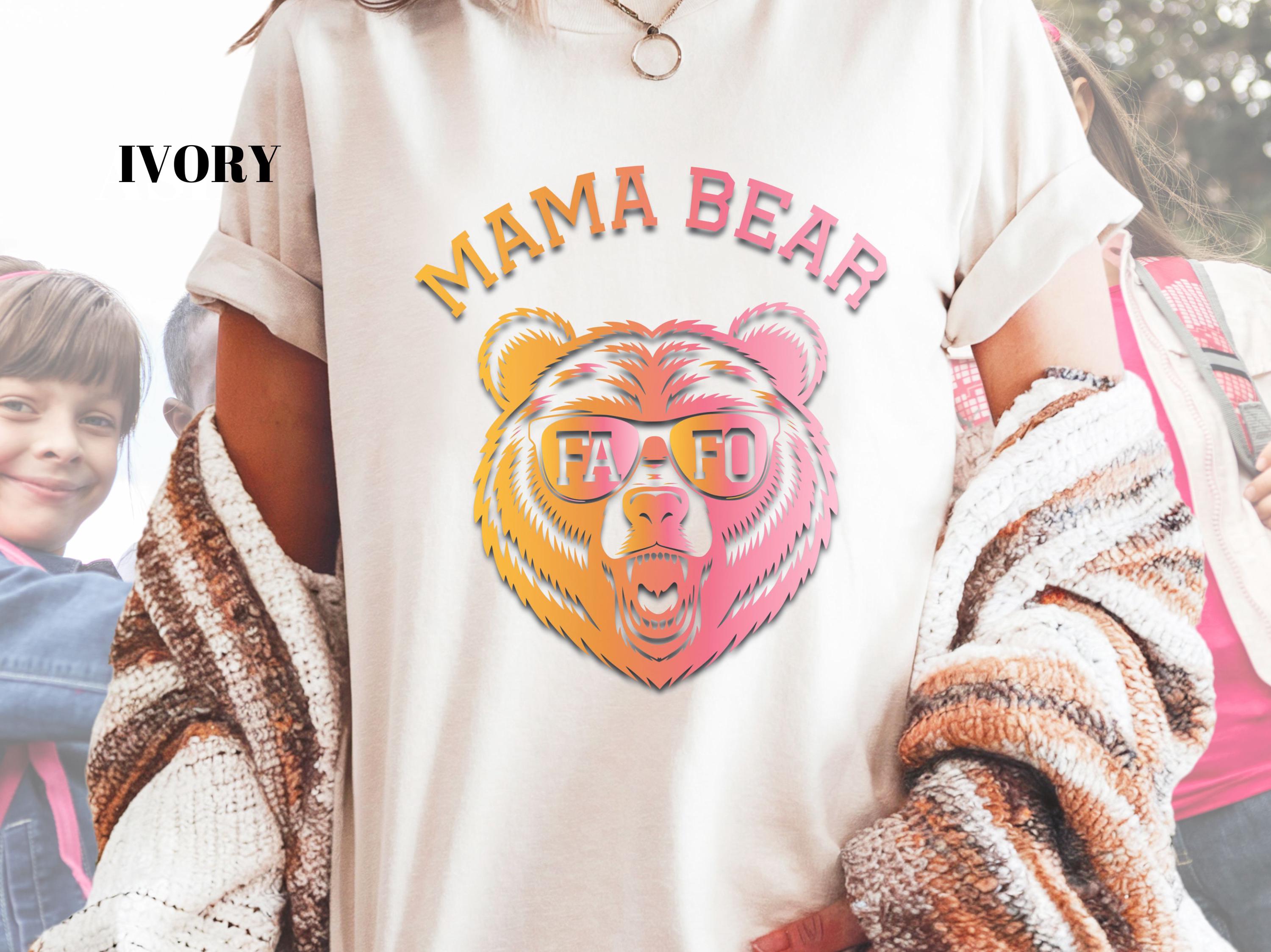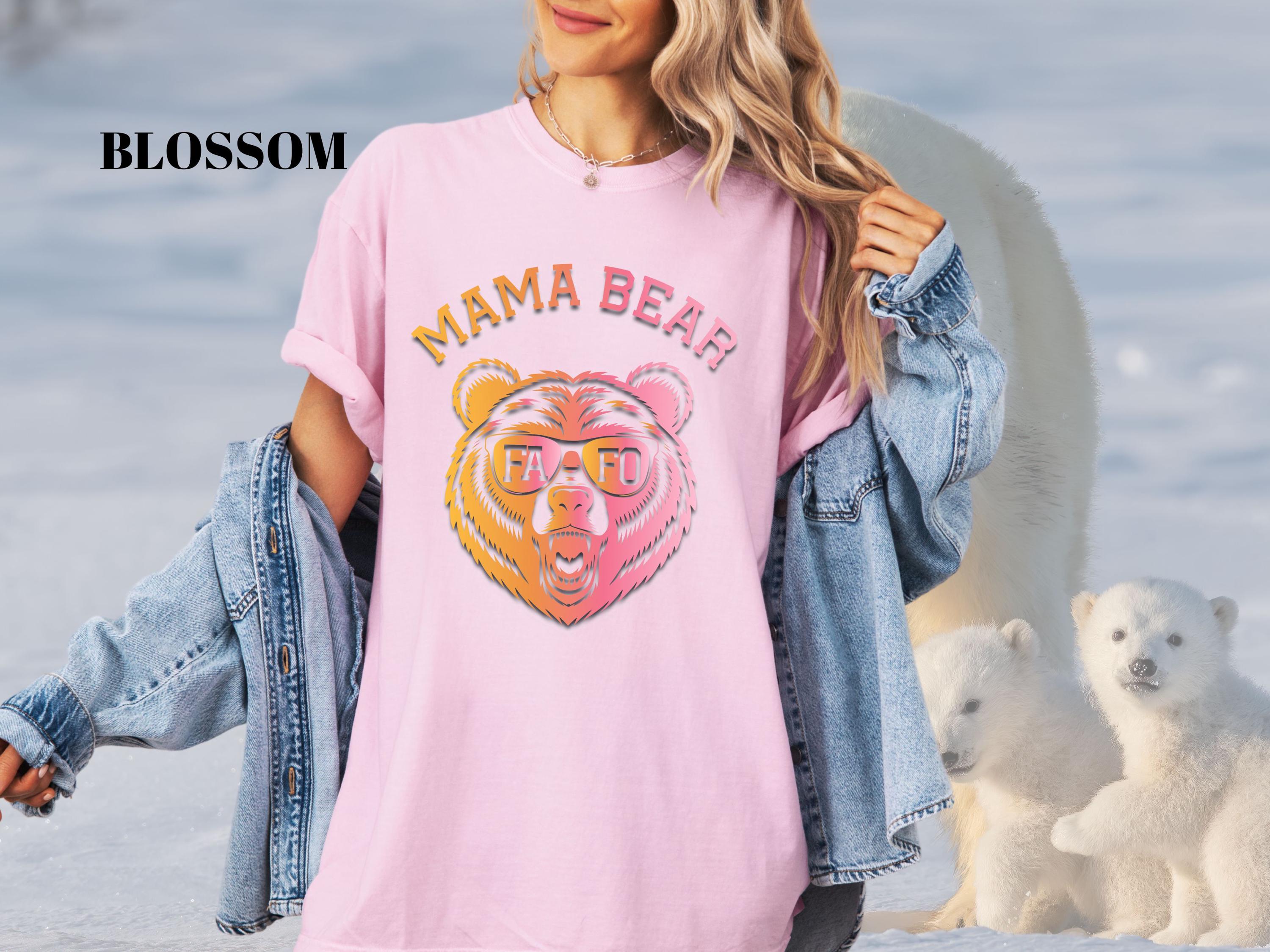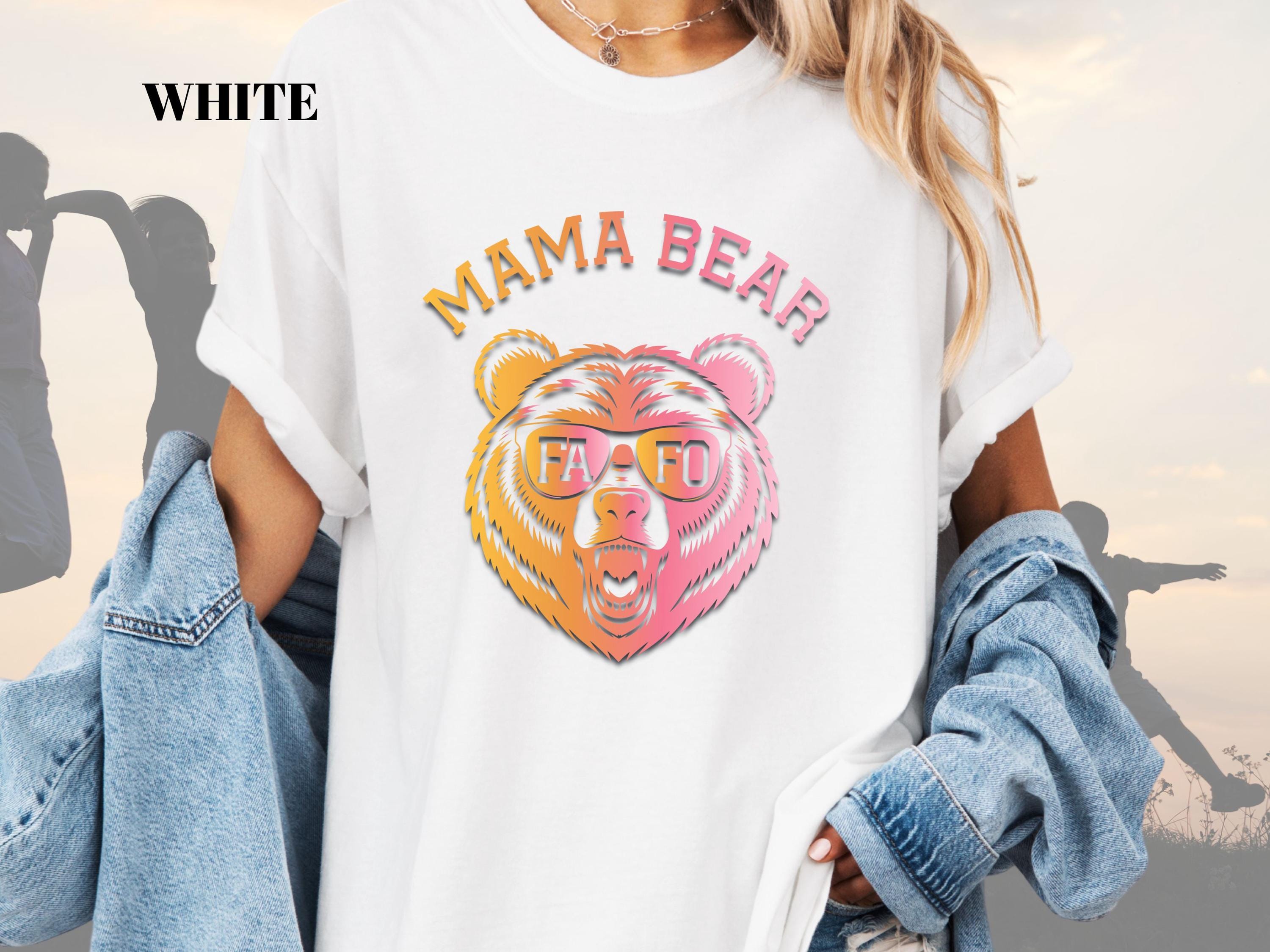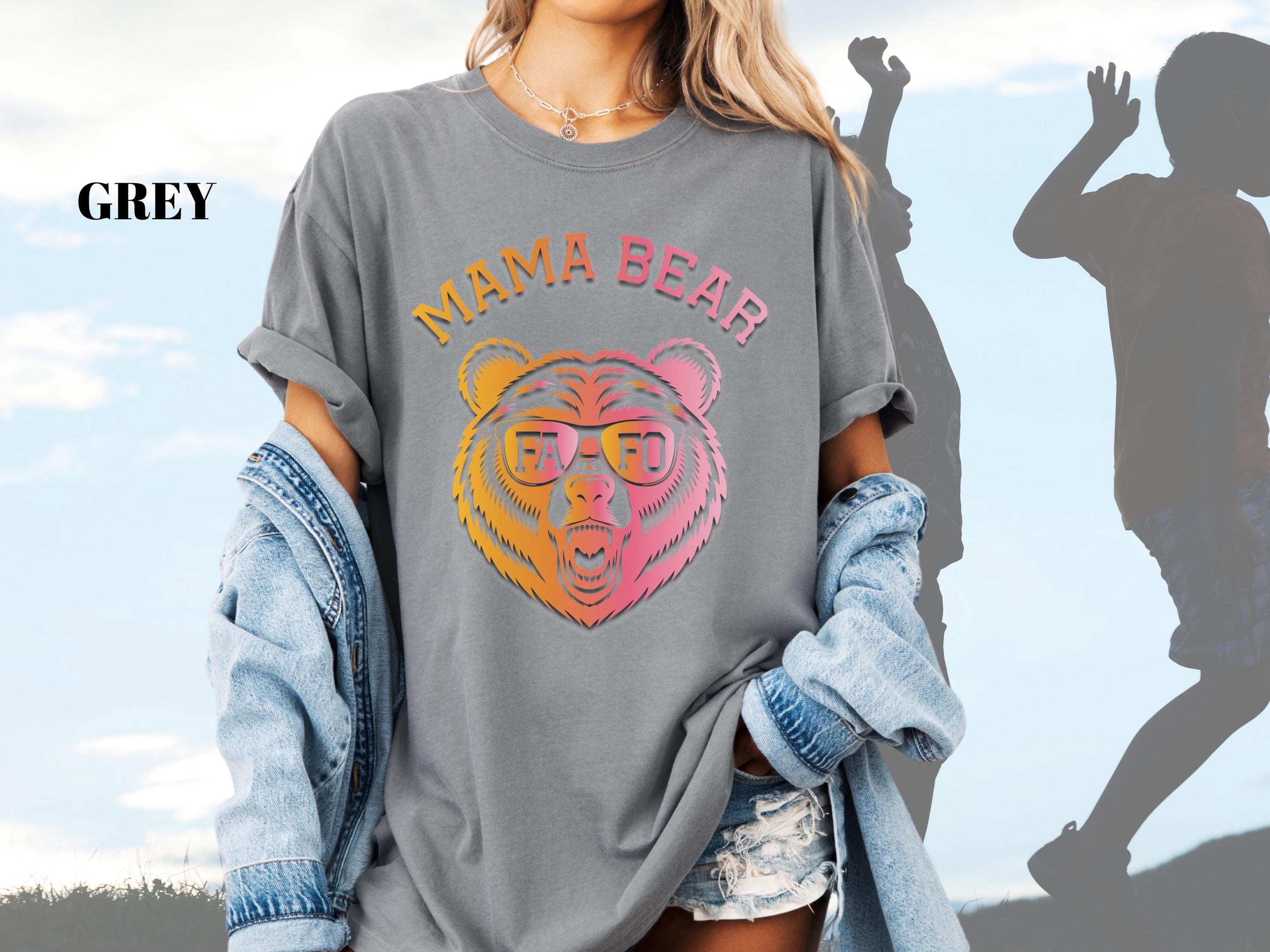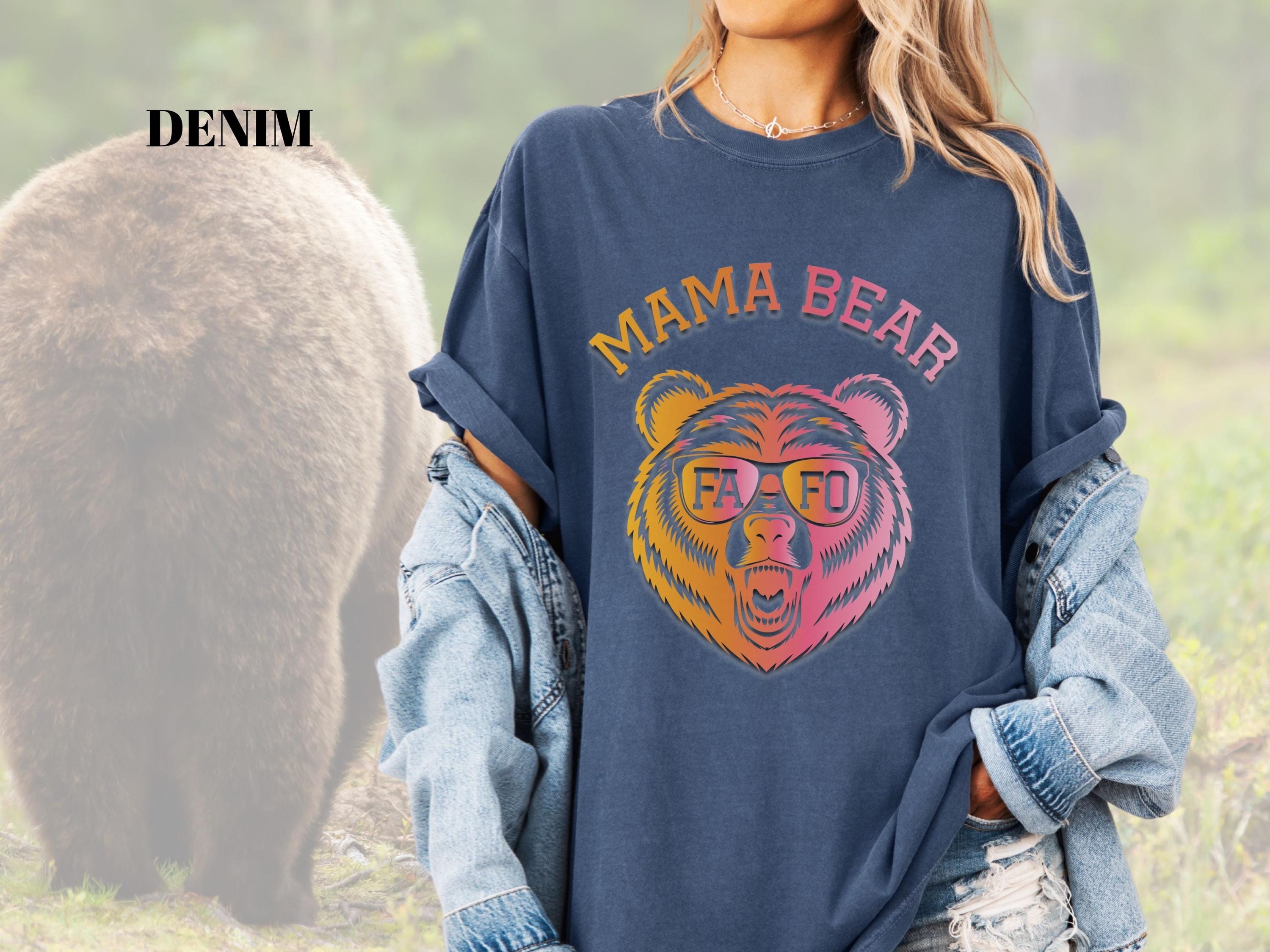 Channel your inner wild with this bold Mama Bear tee, where sweet meets savage. Featuring a striking bear face in graphic style, this shirt pops with mirrored aviators reflecting “FAFO” — for the moms who protect their cubs with zero apologies. Printed on soft, high-quality Comfort Colors tees, this shirt combines style with comfort and attitude. Whether you're at the park, the PTA meeting, or just vibing in your element, this tee makes a fierce statement.
