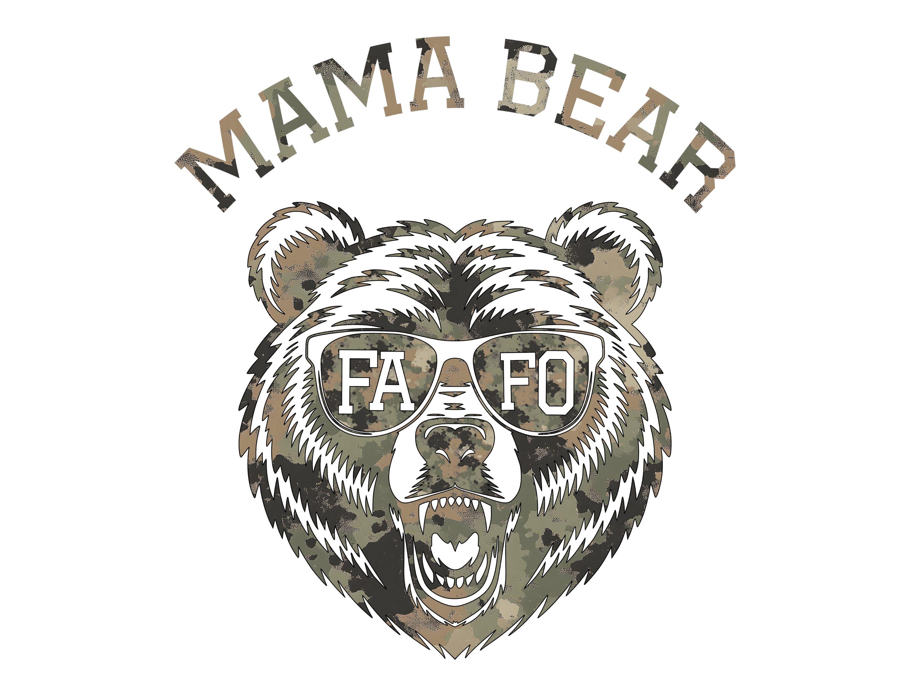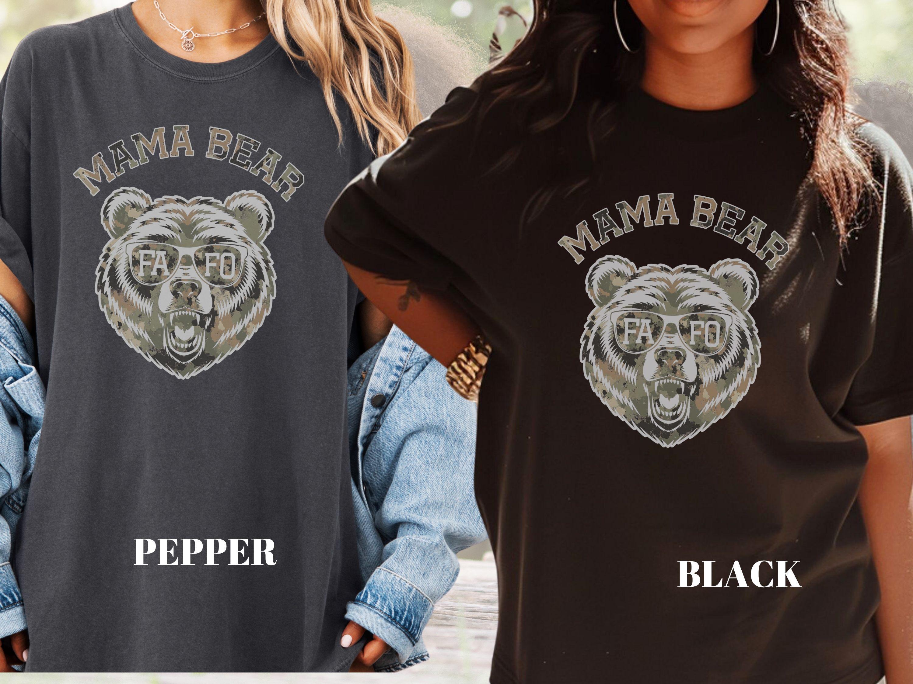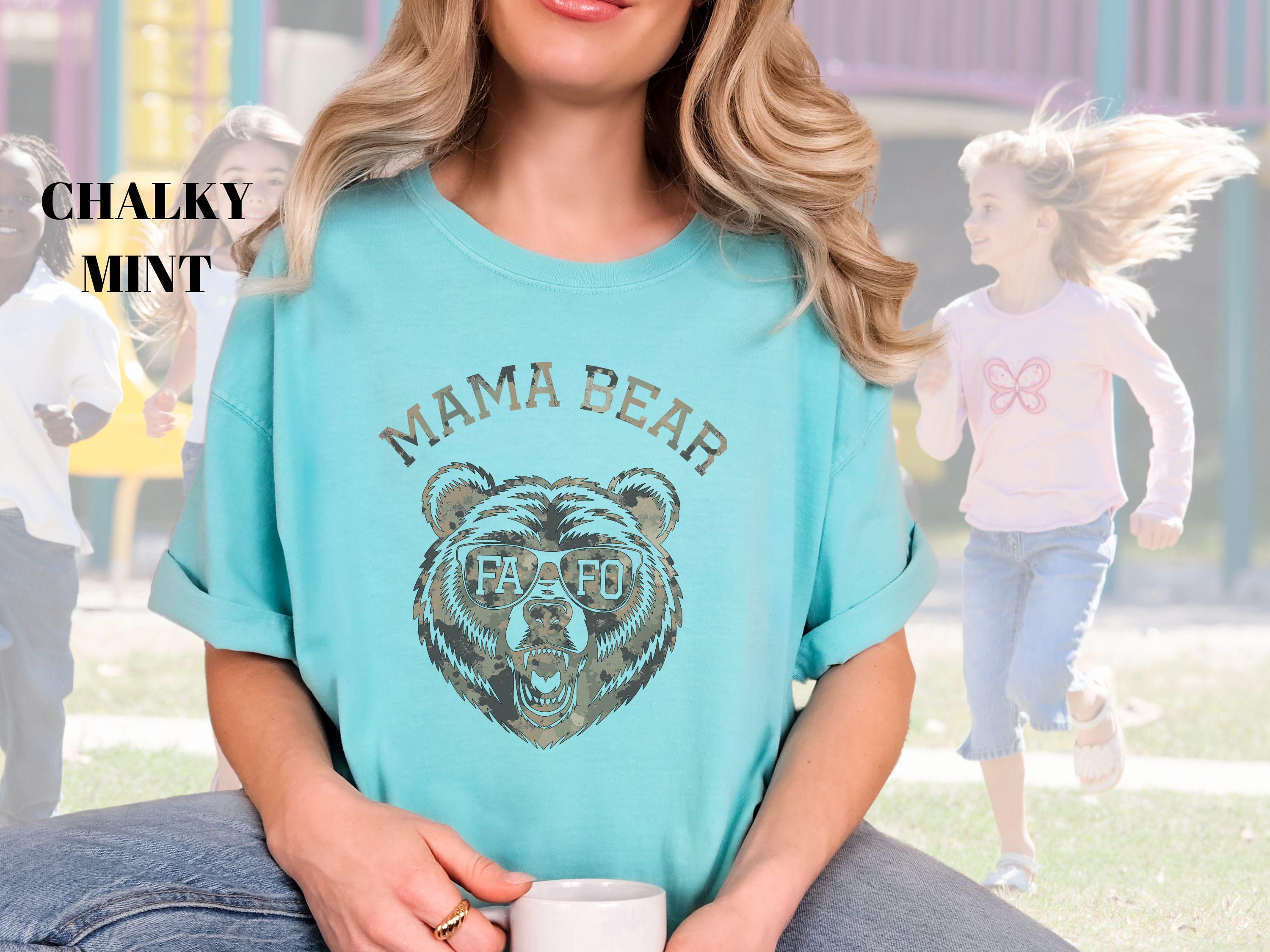 Channel your inner wild with this bold Mama Bear tee, where sweet meets savage. Featuring a striking bear face in graphic style, this shirt pops with mirrored aviators reflecting “FAFO” — for the moms who protect their cubs with zero apologies. Printed on soft, high-quality Comfort Colors tees, this shirt combines style with comfort and attitude. Whether you're at the park, the PTA meeting, or just vibing in your element, this tee makes a fierce statement.