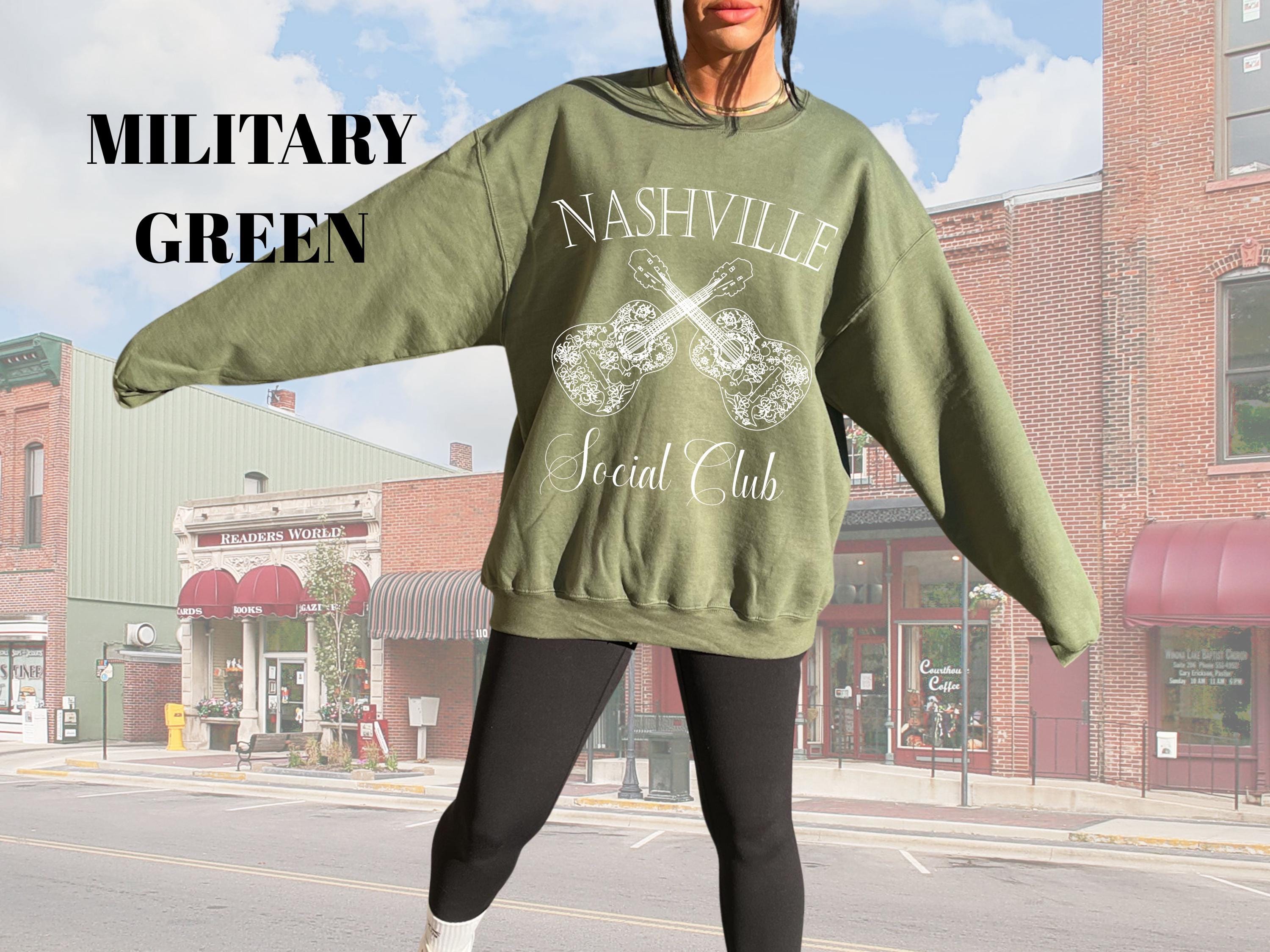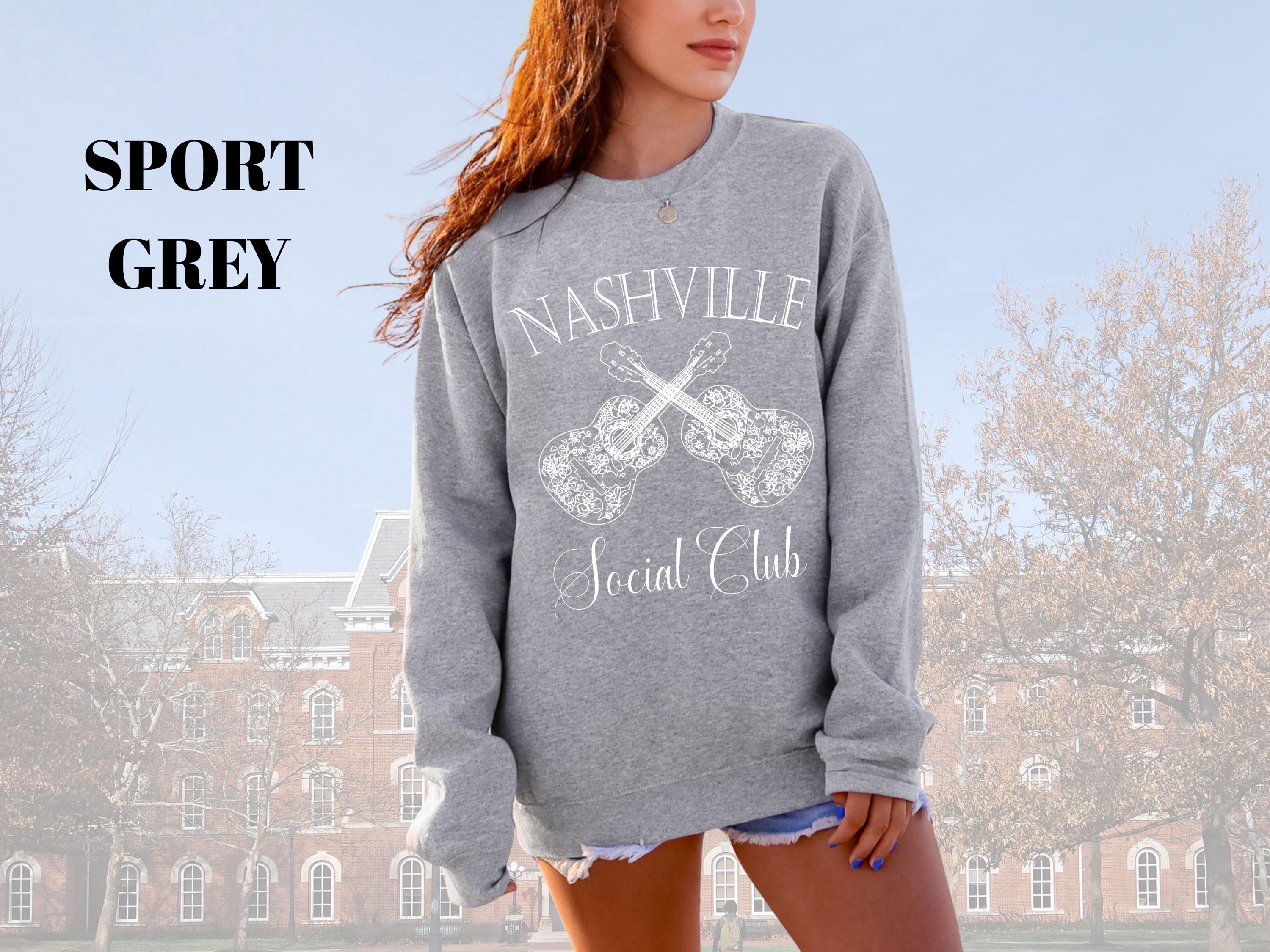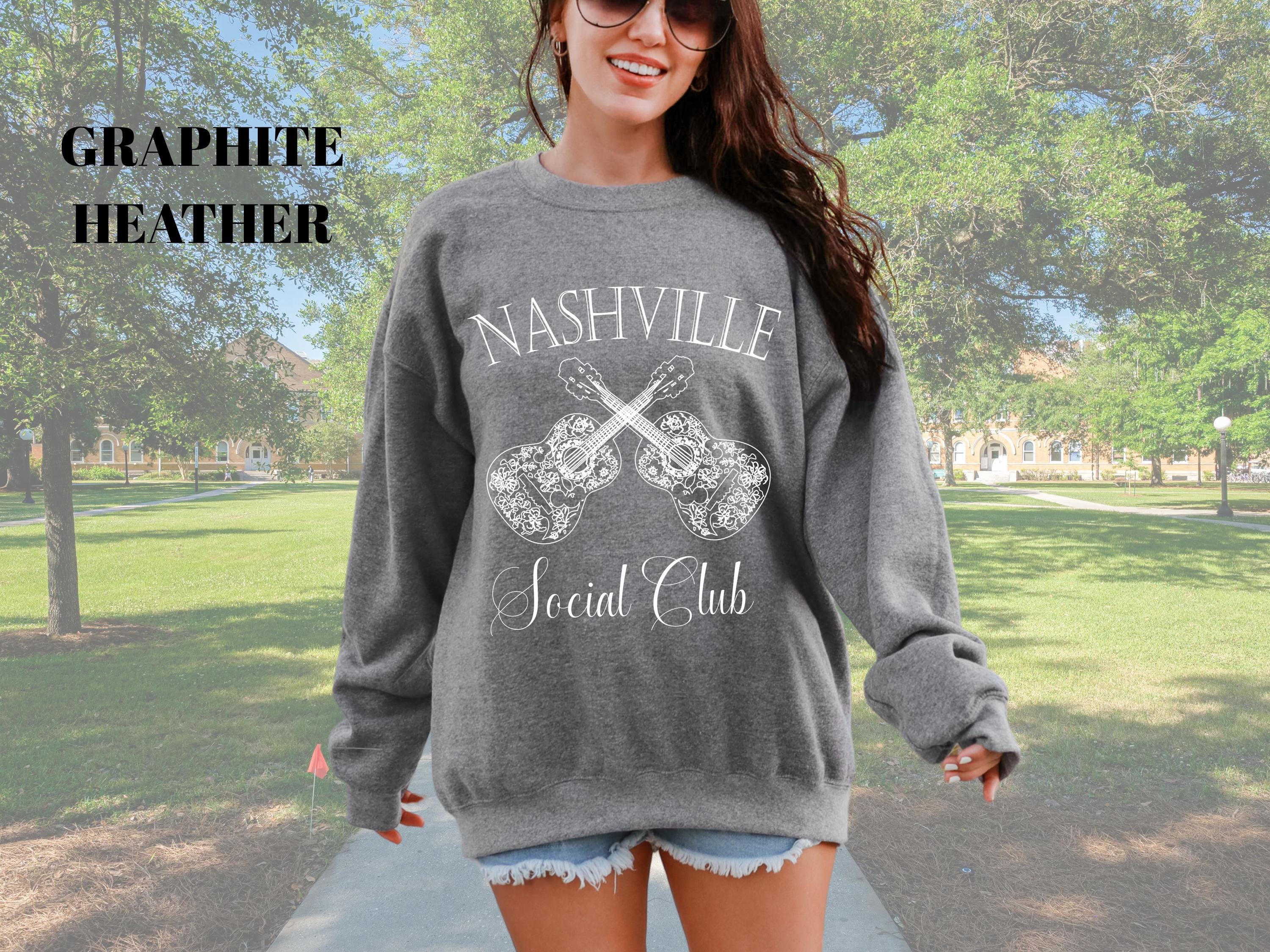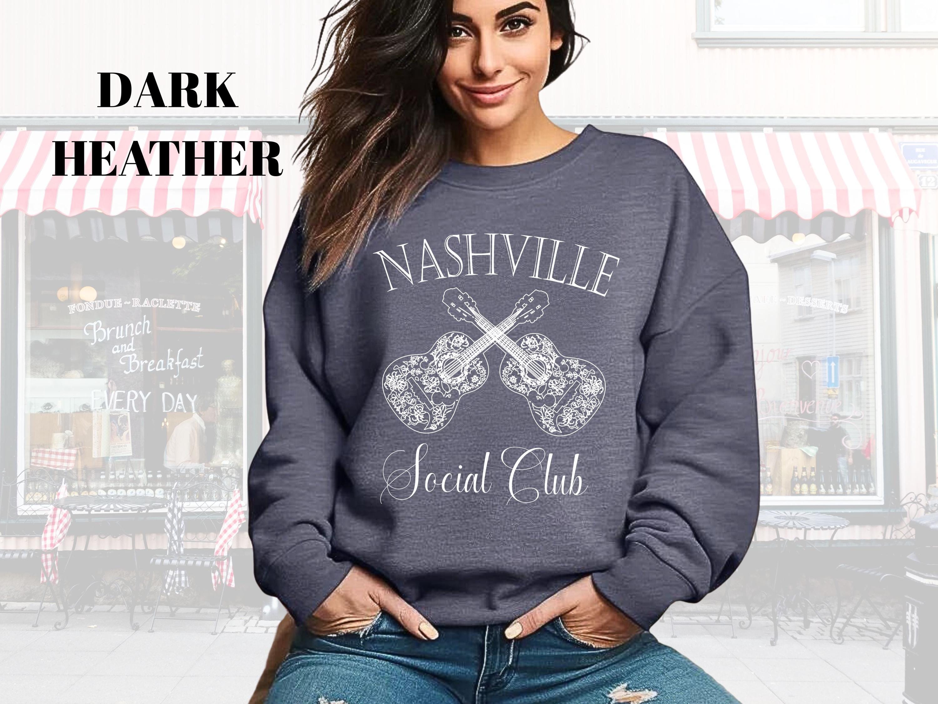 Celebrate Music City style with our Nashville Social Club Sweatshirt, featuring minimalist line art of crossed guitars and bold social club lettering. Inspired by Nashville’s legendary music scene, this cozy crewneck blends retro collegiate style with a laid-back, unisex fit—perfect for concerts, weekends downtown, or casual nights out.