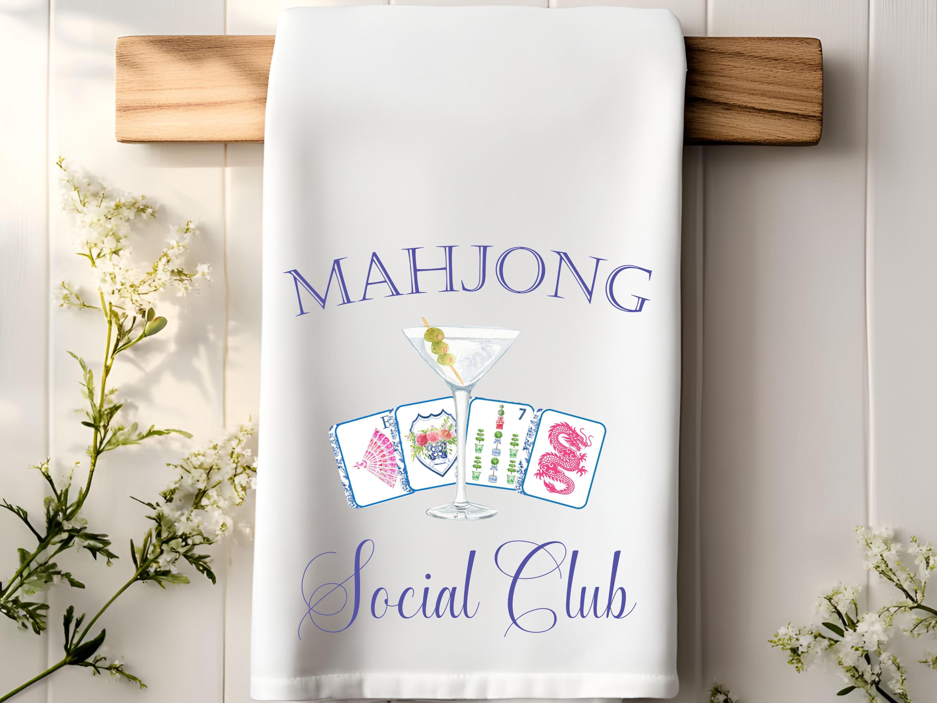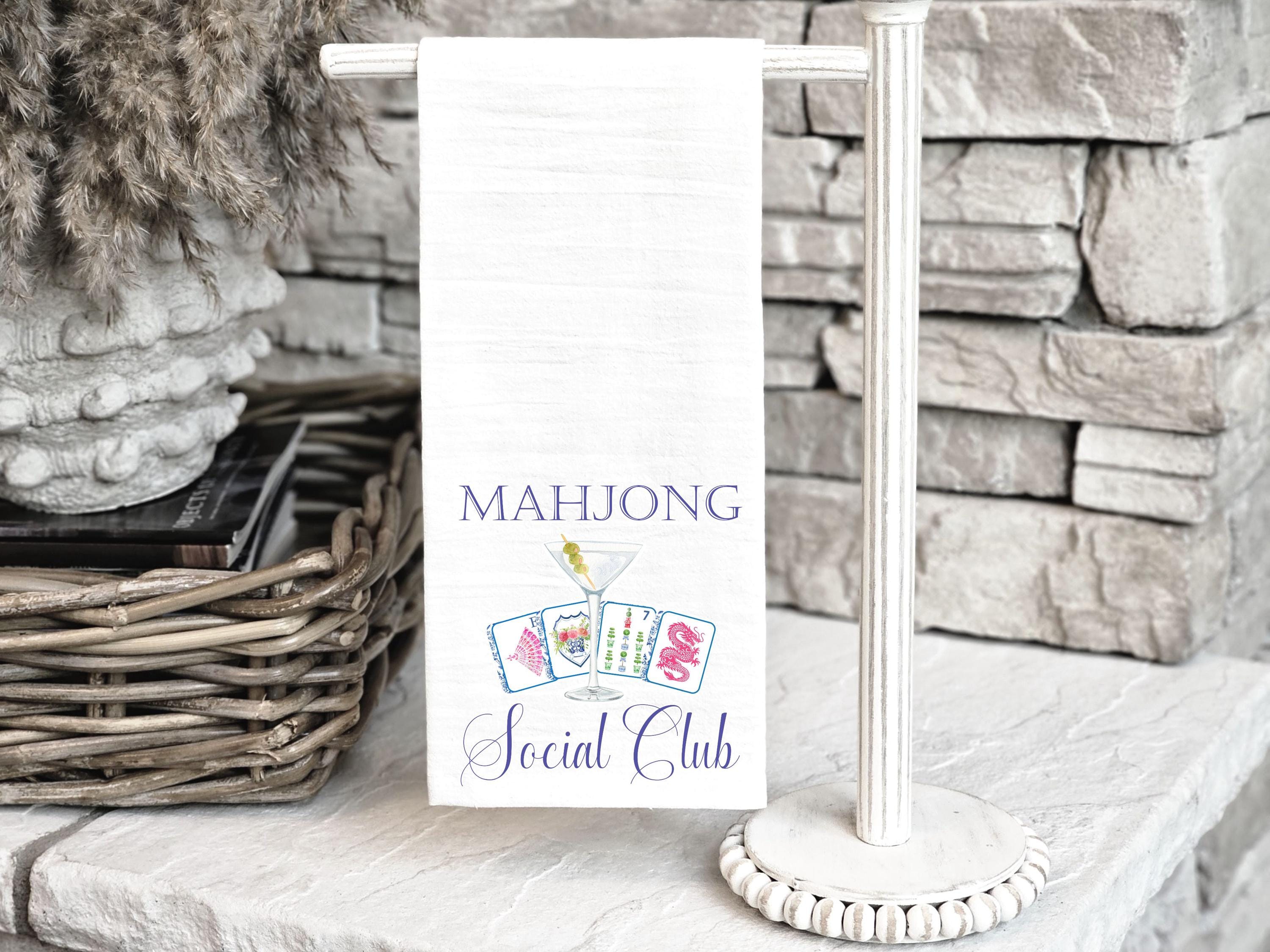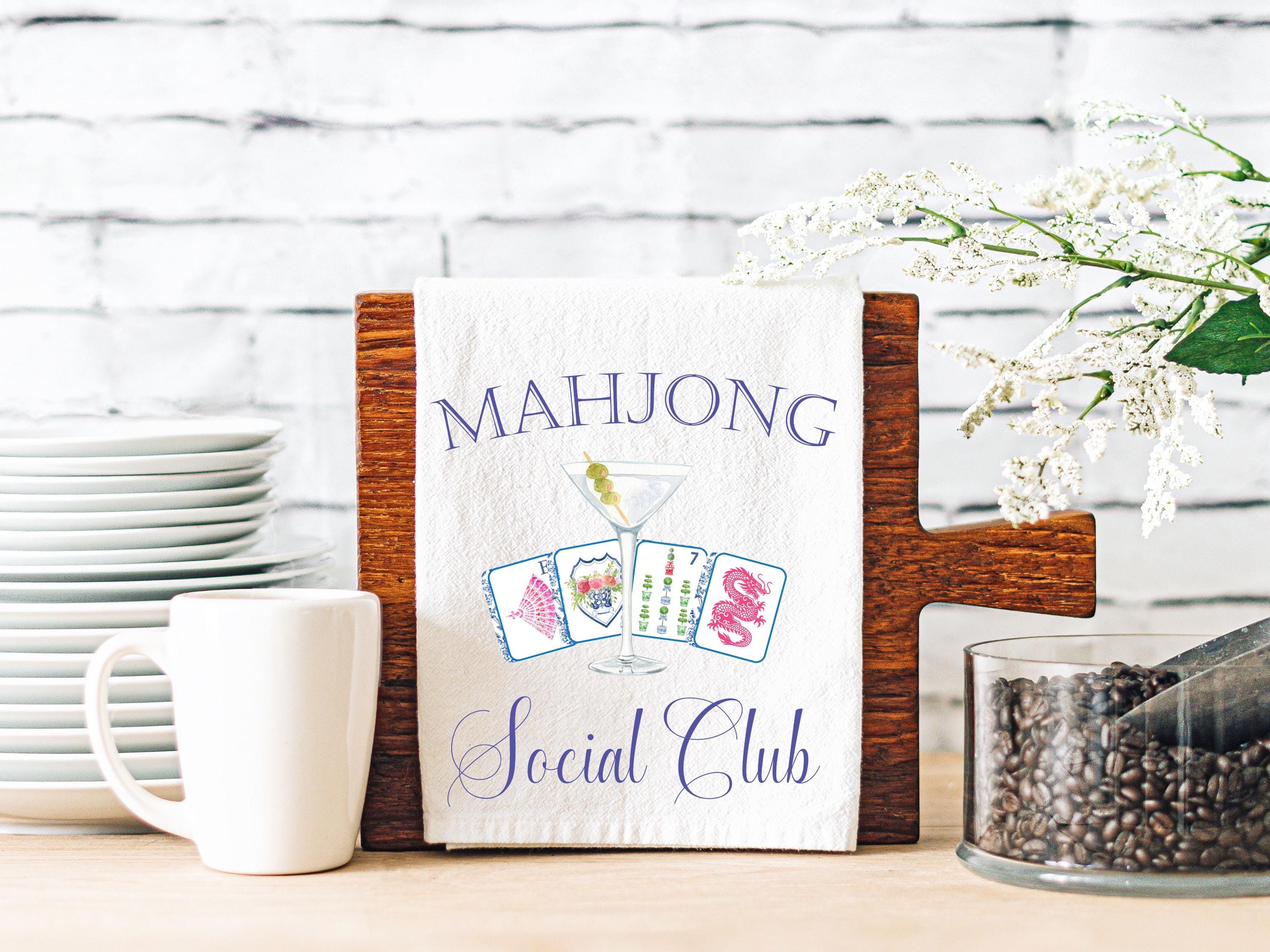 Bring game night flair to your kitchen with our Mahjong Social Club tea towel, featuring a playful martini glass illustration and a chic preppy coquette design. The phrase “Just a Mahjong Social Club World” celebrates the camaraderie and fun of tile night while adding a stylish touch to your décor.