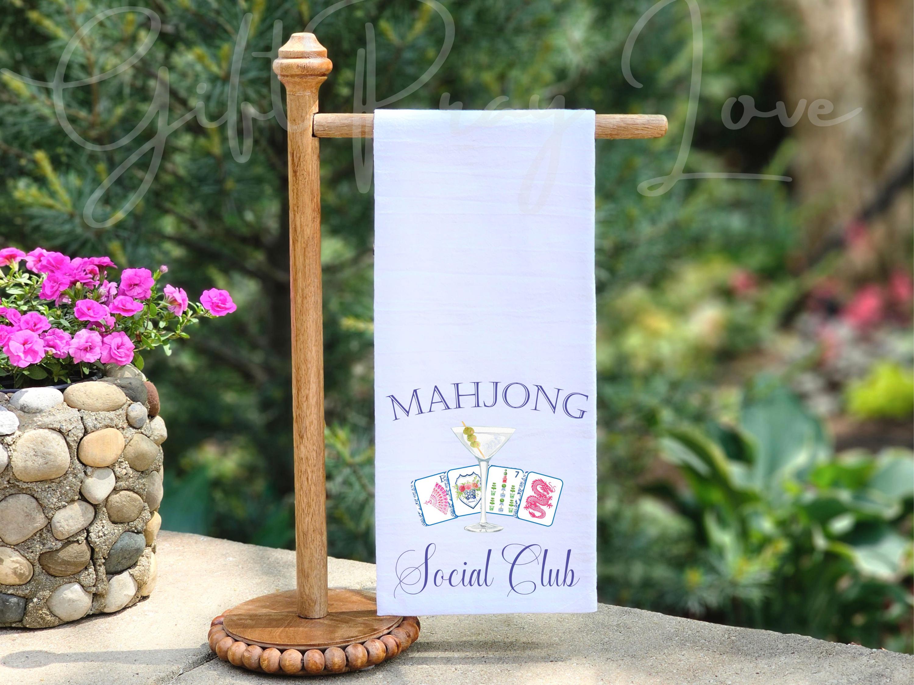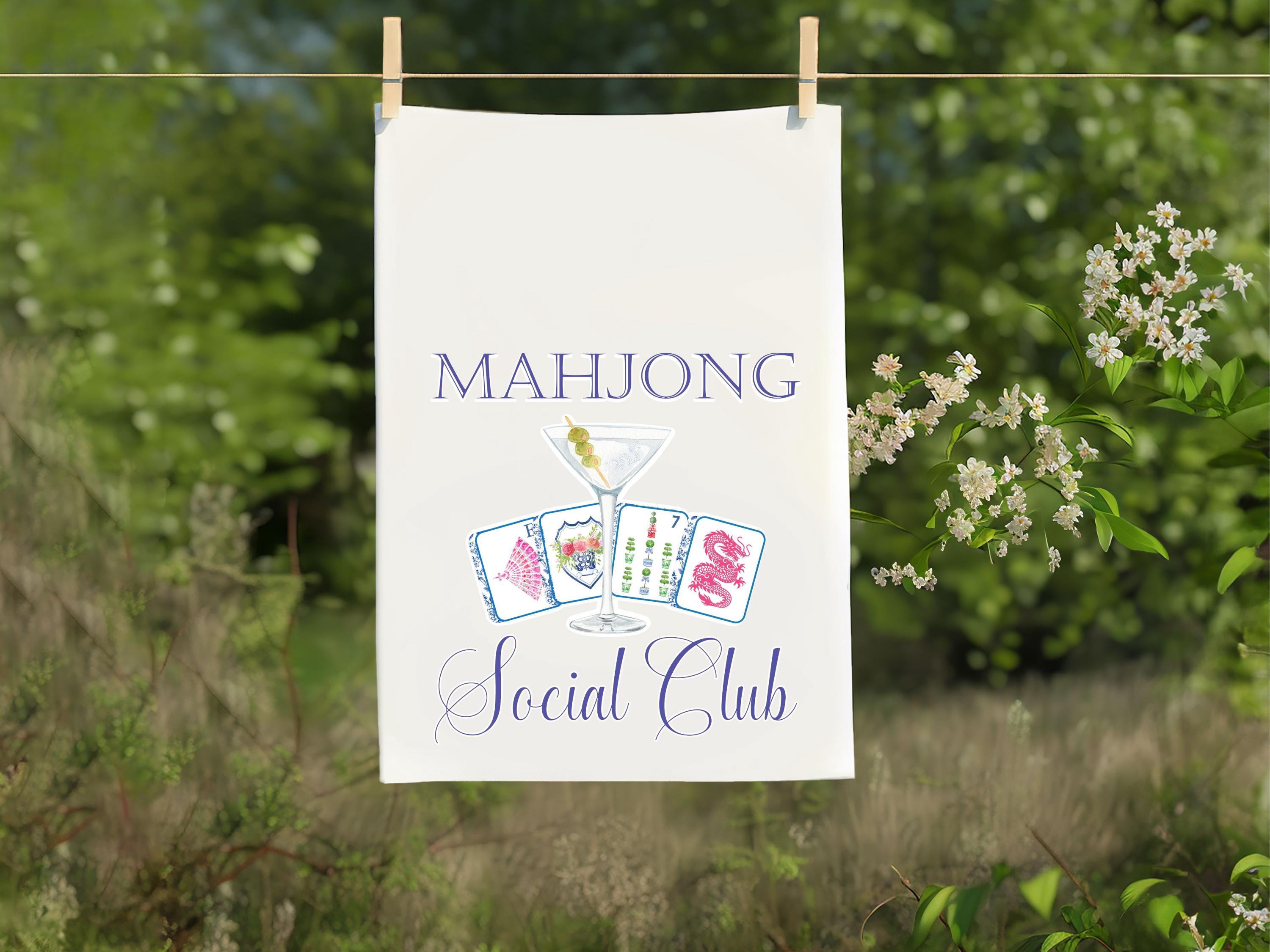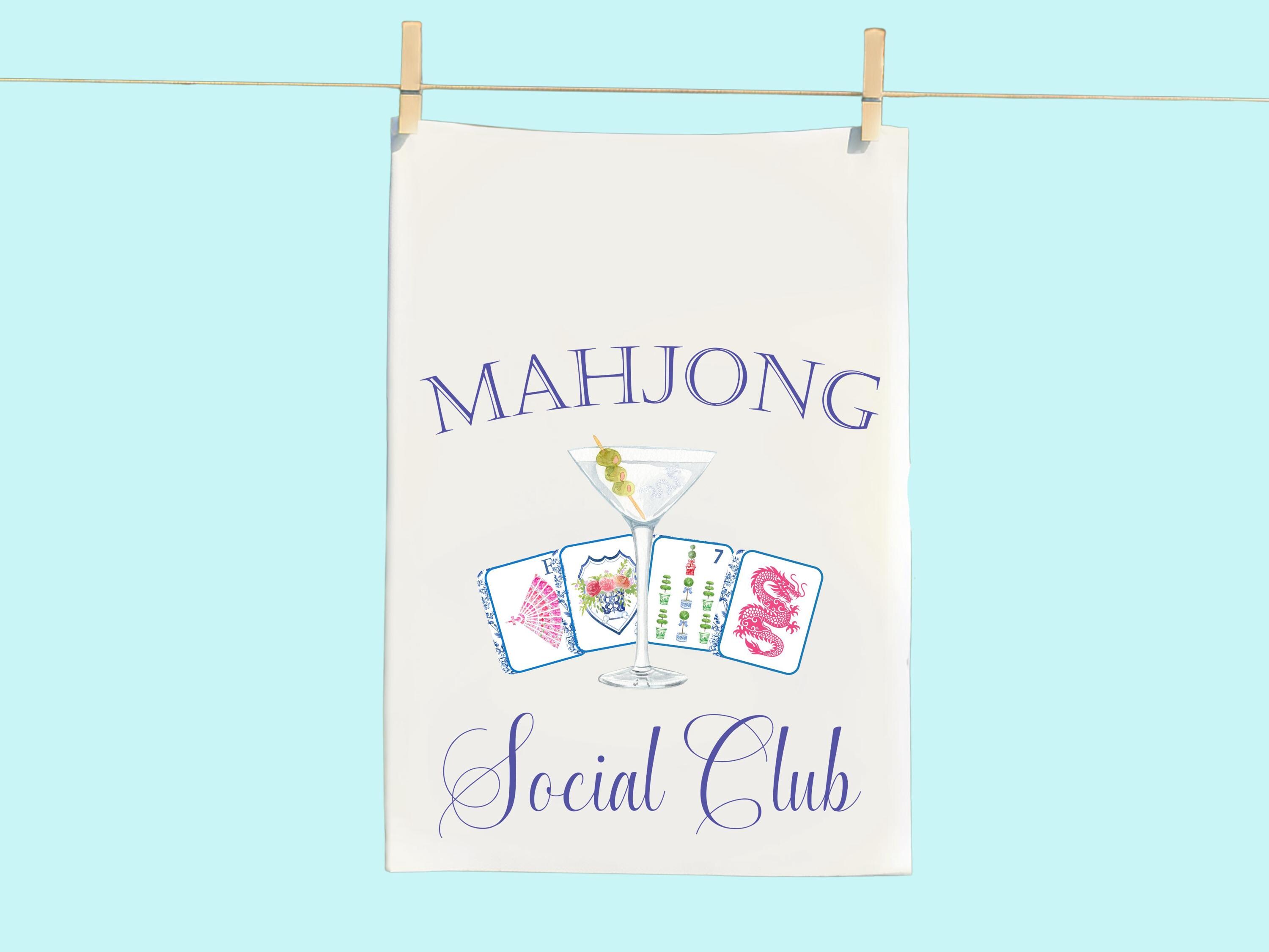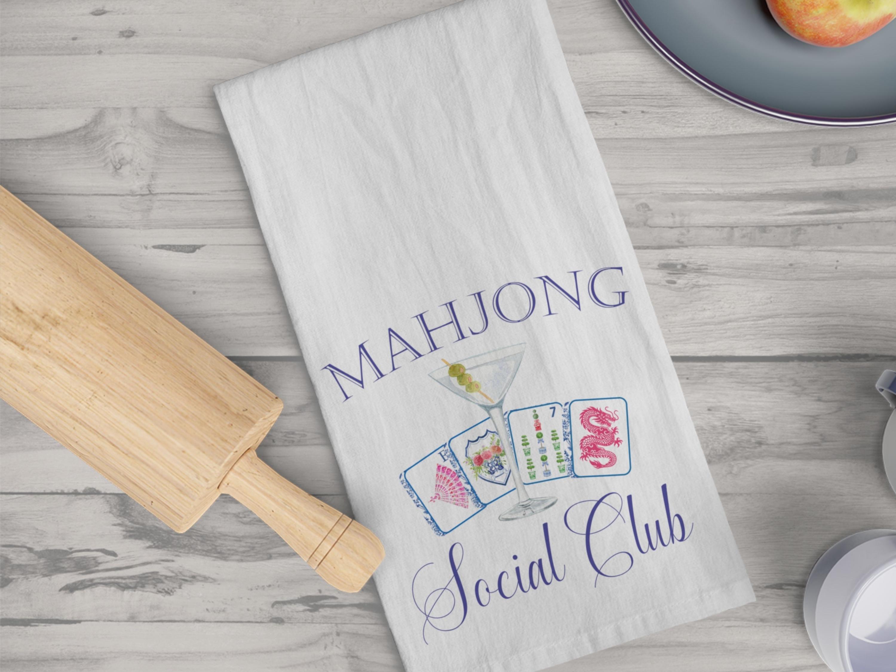 Bring game night flair to your kitchen with our Mahjong Social Club tea towel, featuring a playful martini glass illustration and a chic preppy coquette design. The phrase “Just a Mahjong Social Club World” celebrates the camaraderie and fun of tile night while adding a stylish touch to your décor.