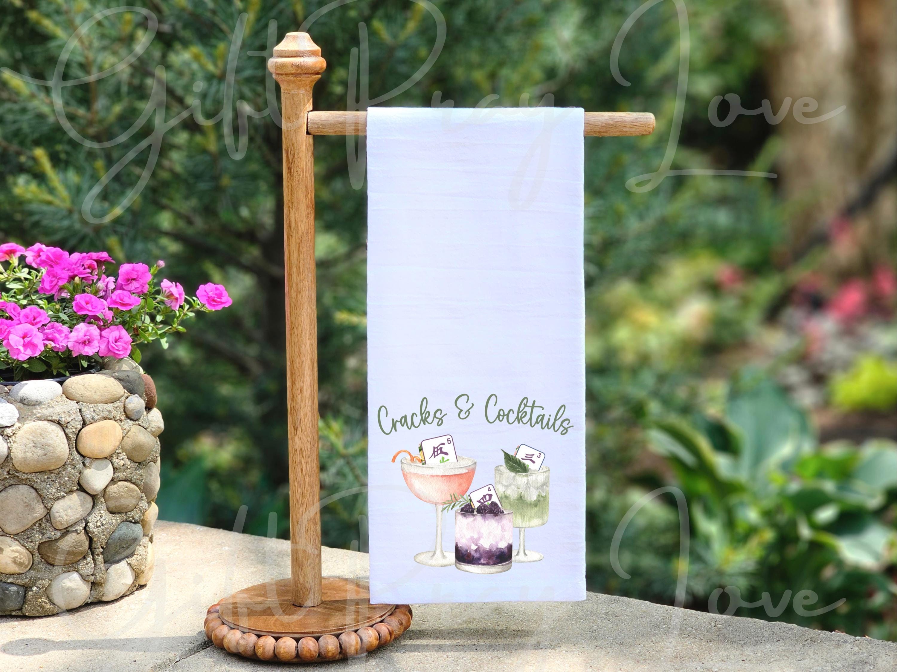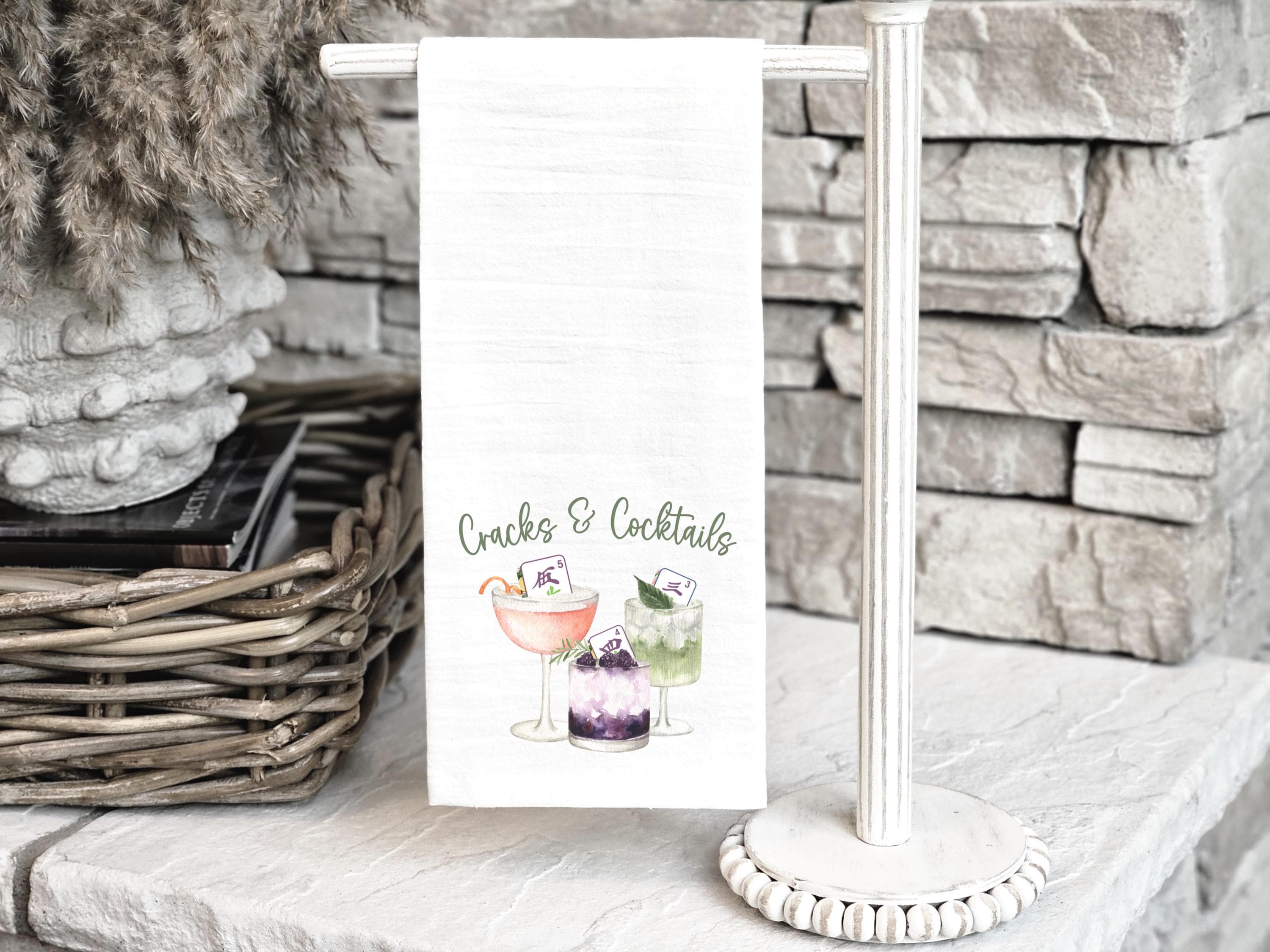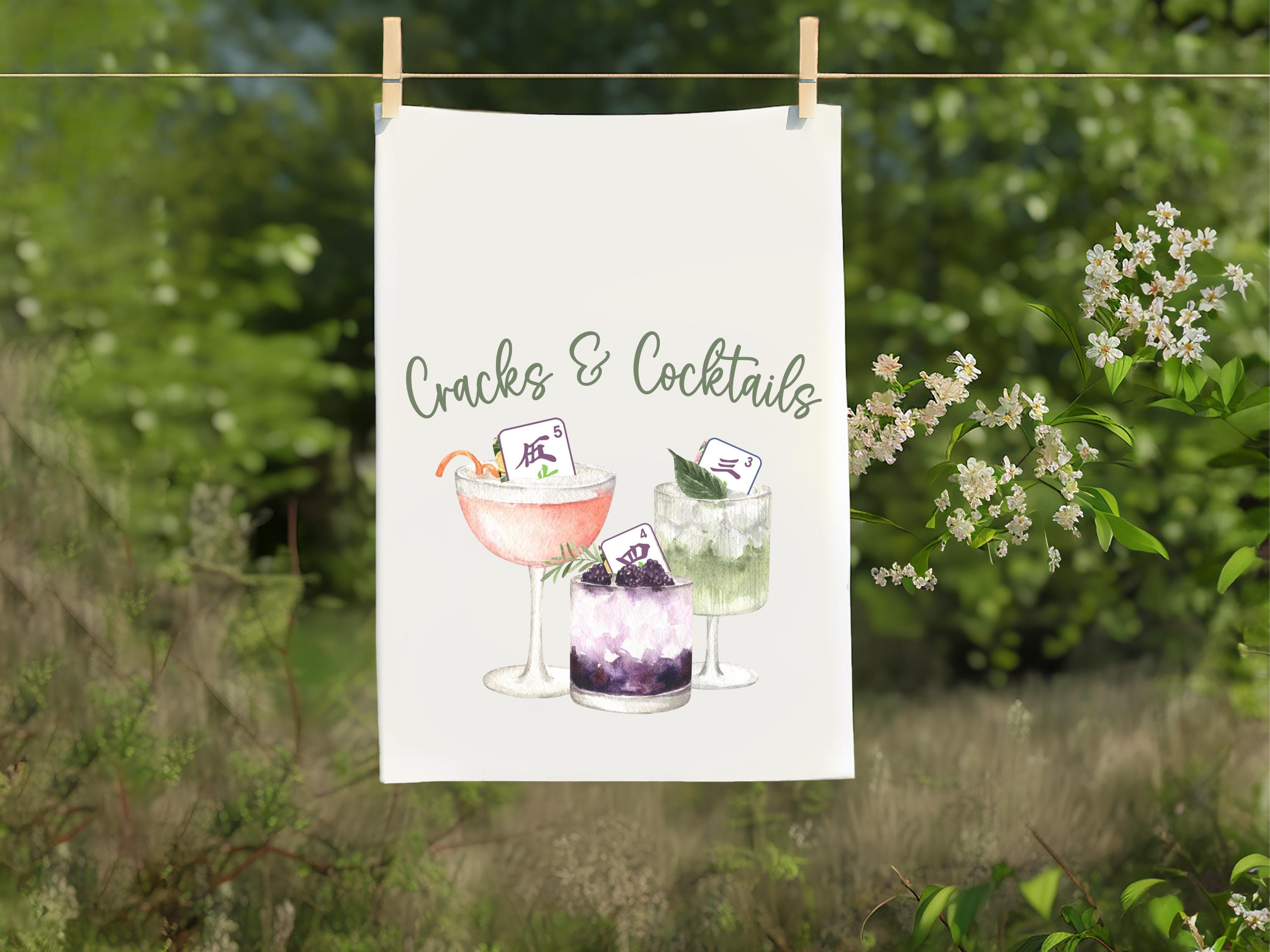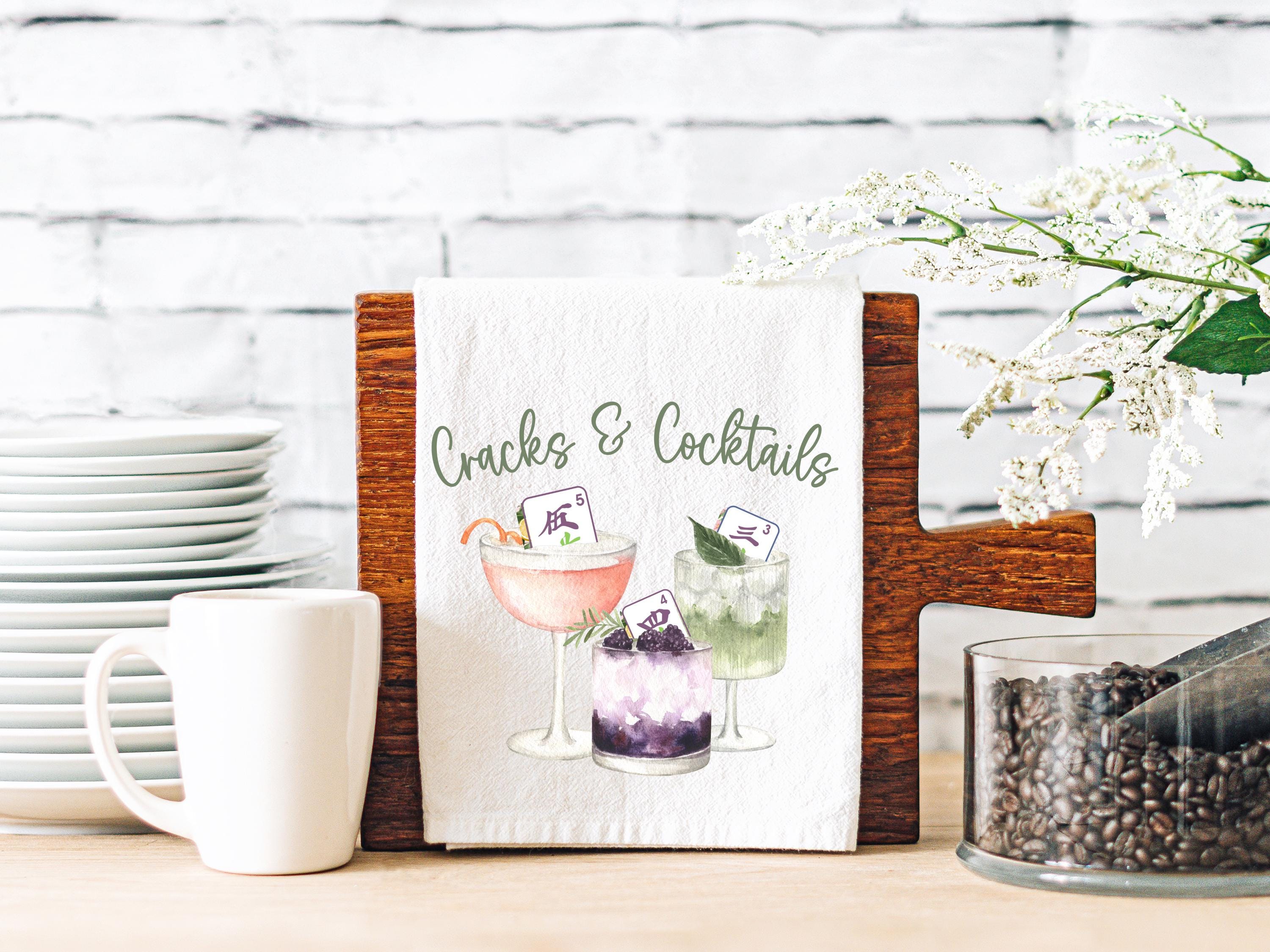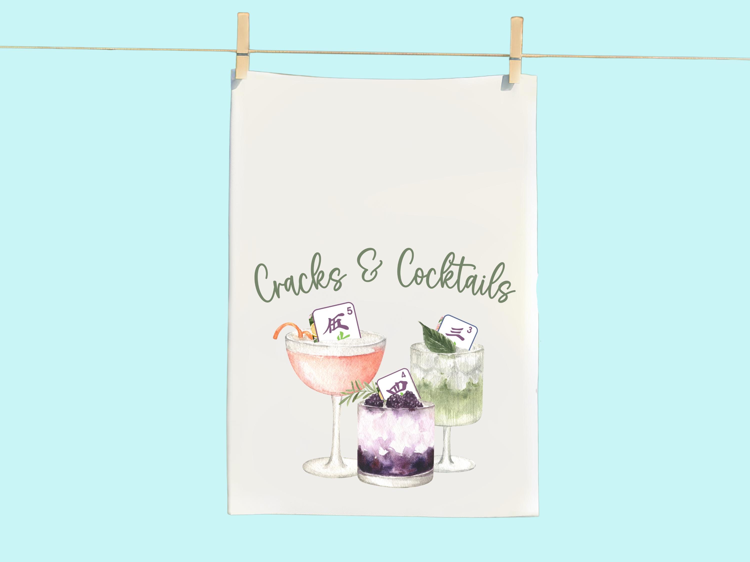 Bring a splash of fun to your kitchen or bar cart with our Cracks and Cocktails tea towel, designed for Mahjong lovers who enjoy pairing a good hand with a great drink. Featuring a charming watercolor cocktail illustration alongside a preppy coquette Mahjong tile design, this oversized towel is perfect for game night, hosting, or gifting.