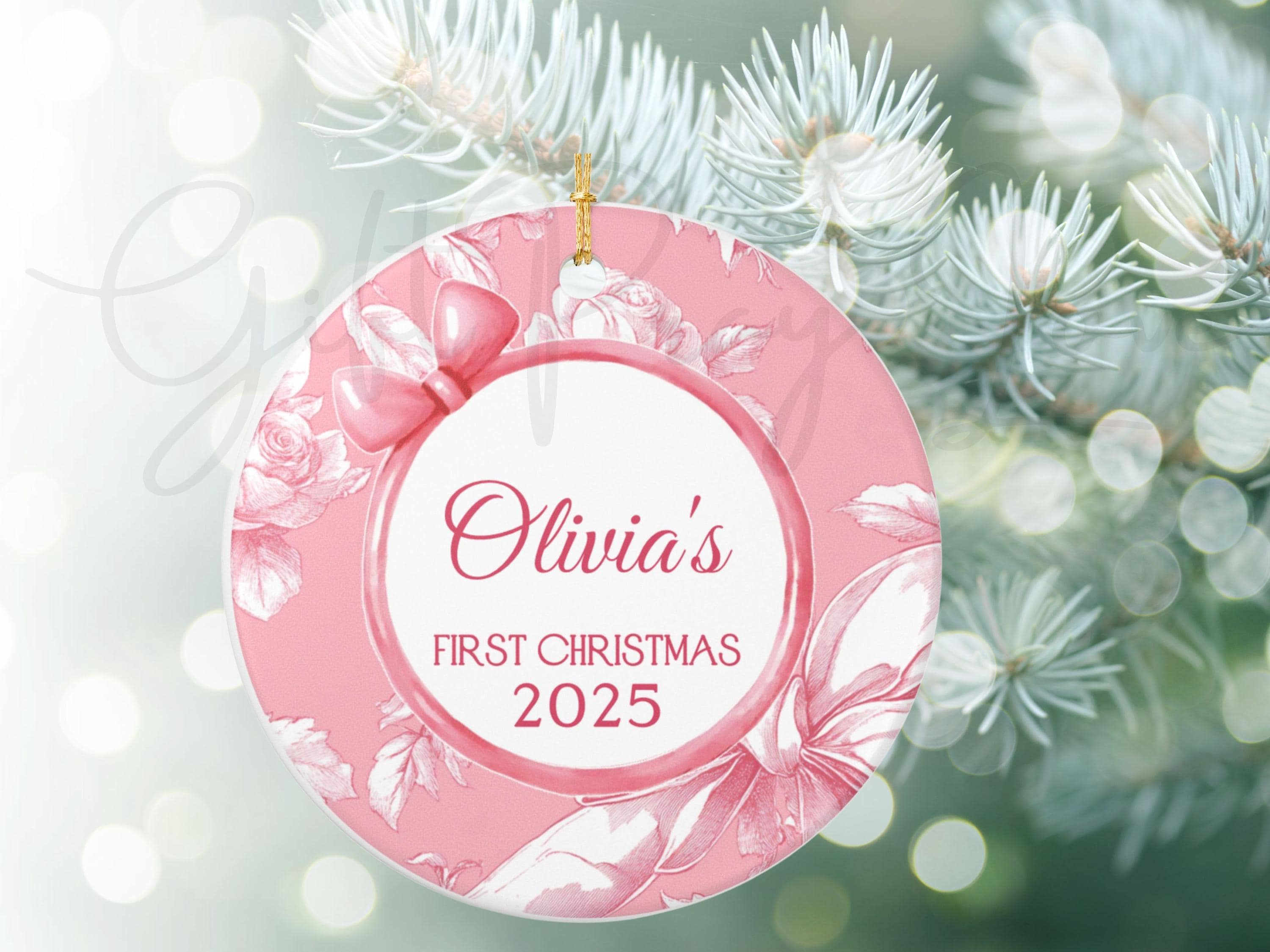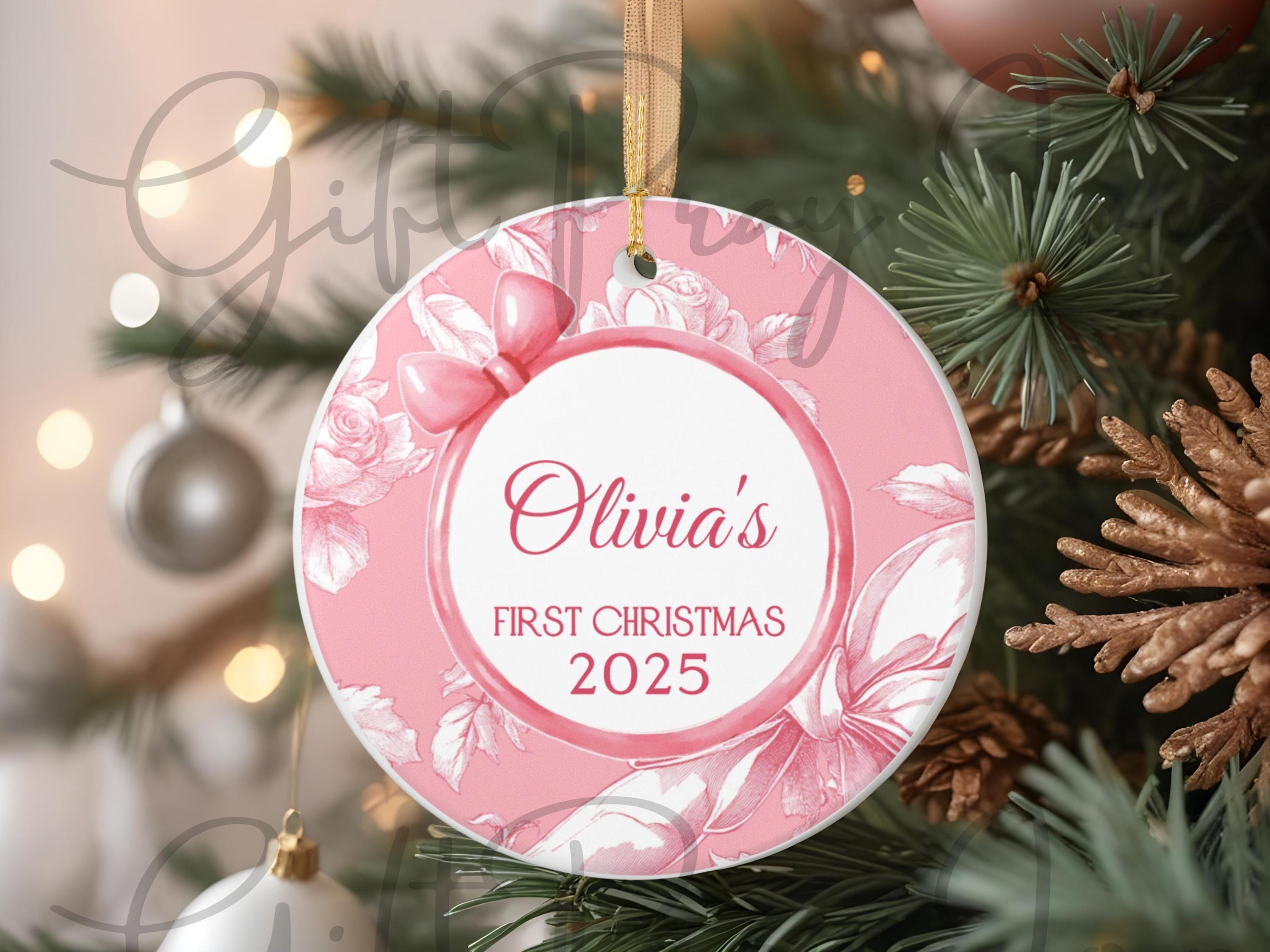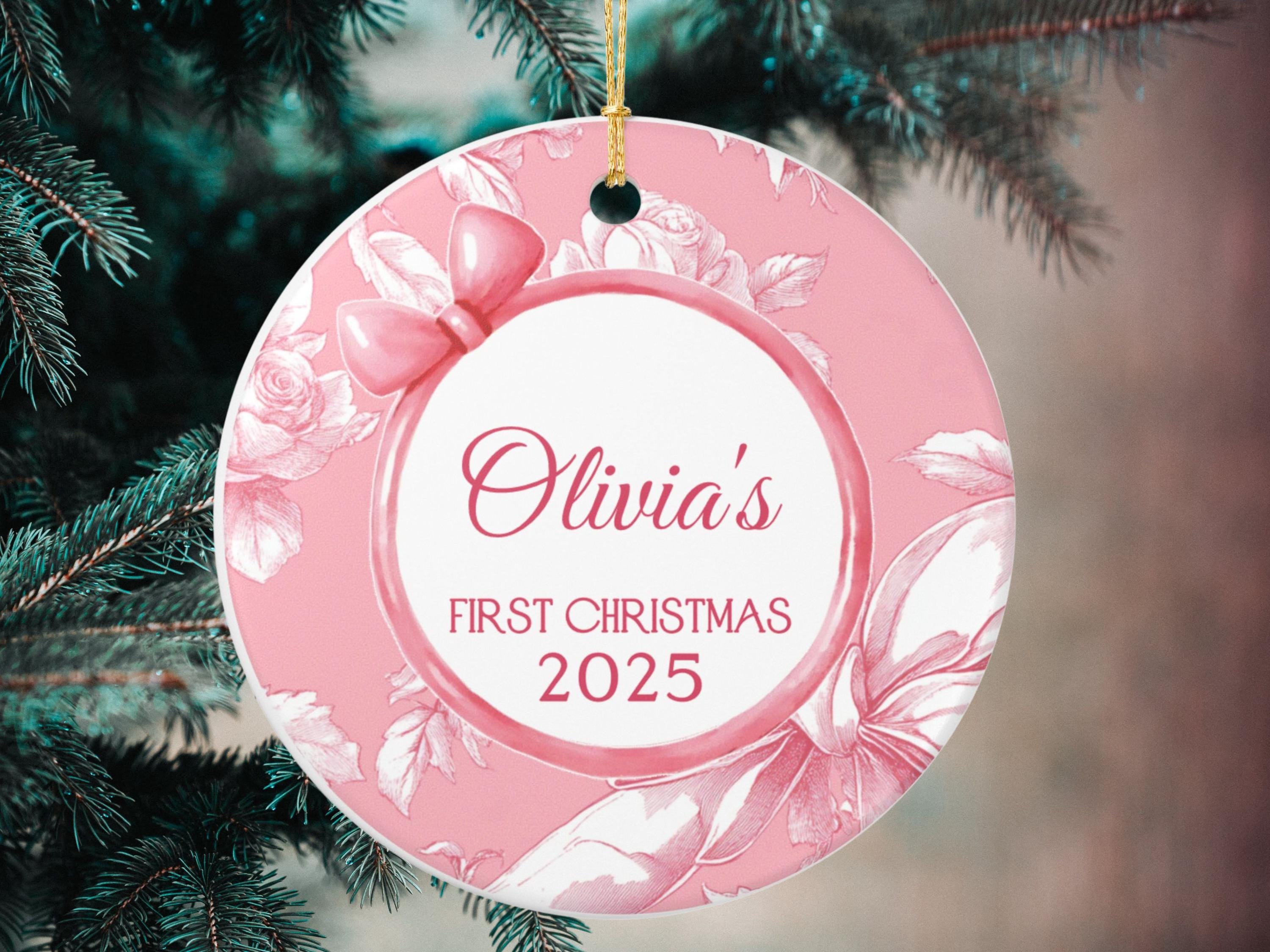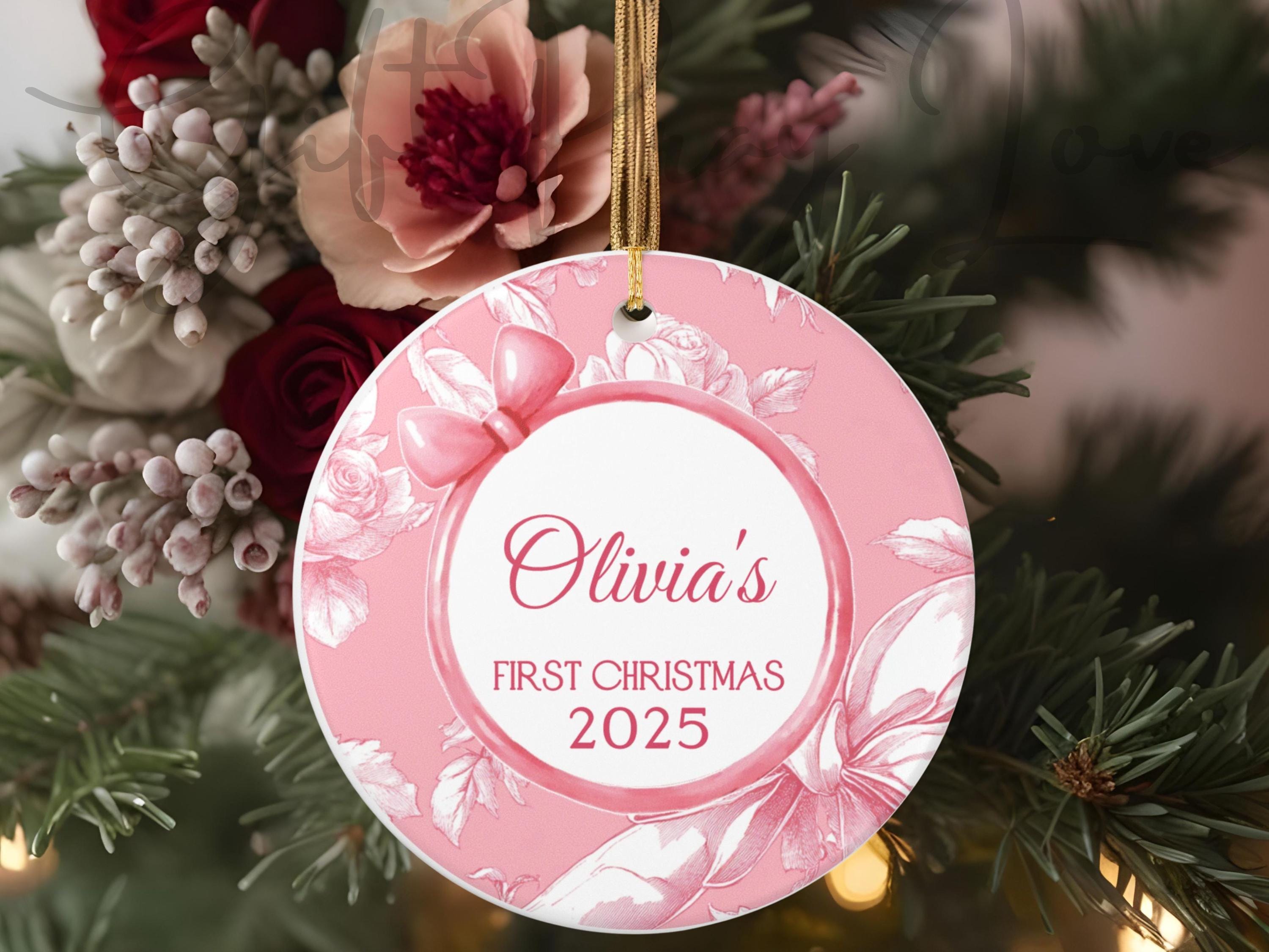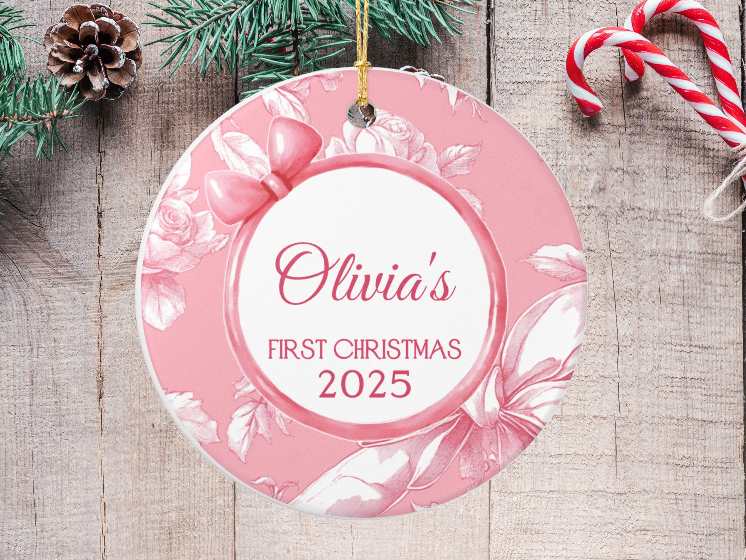 This delicate ceramic ornament features a soft pink bow with sweet coquette details and elegant typography personalized with your baby’s name and the year. Designed as a timeless keepsake, it’s the perfect way to remember those precious first holiday moments.