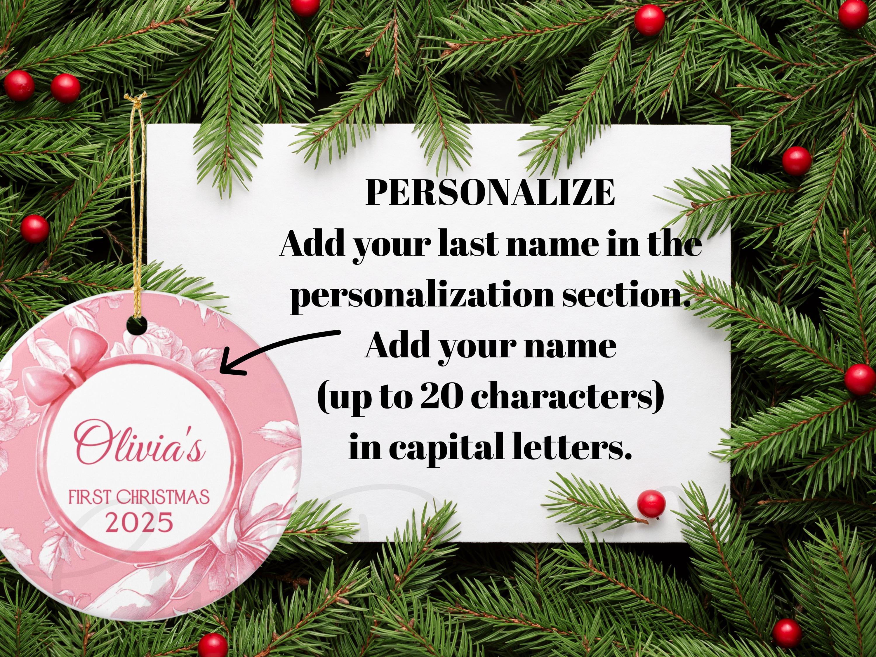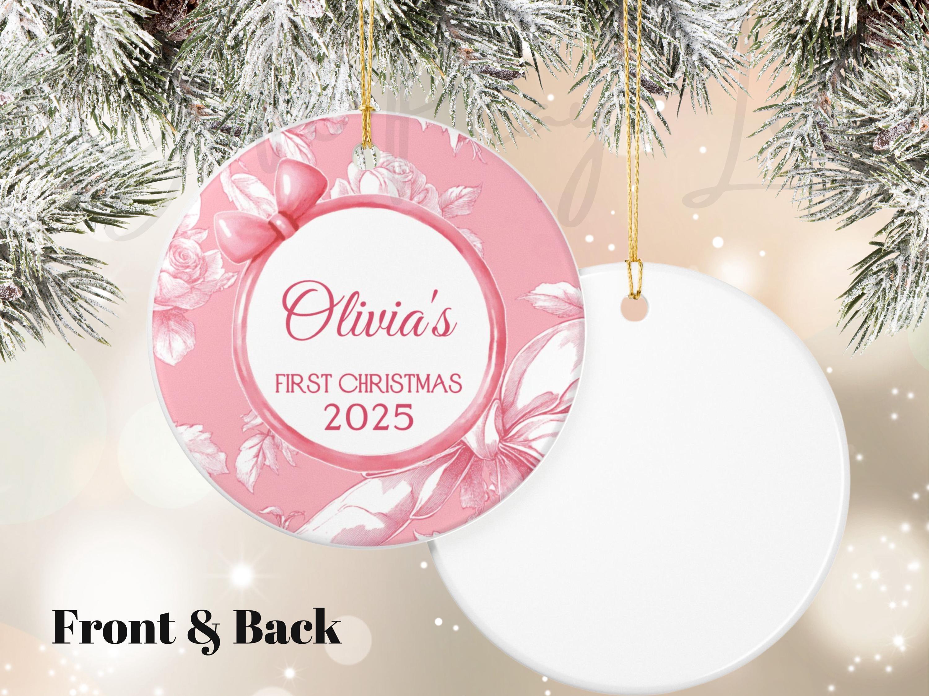 Celebrate the magic of your baby girl’s very first Christmas with this custom First Christmas ornament in a charming pink coquette design.