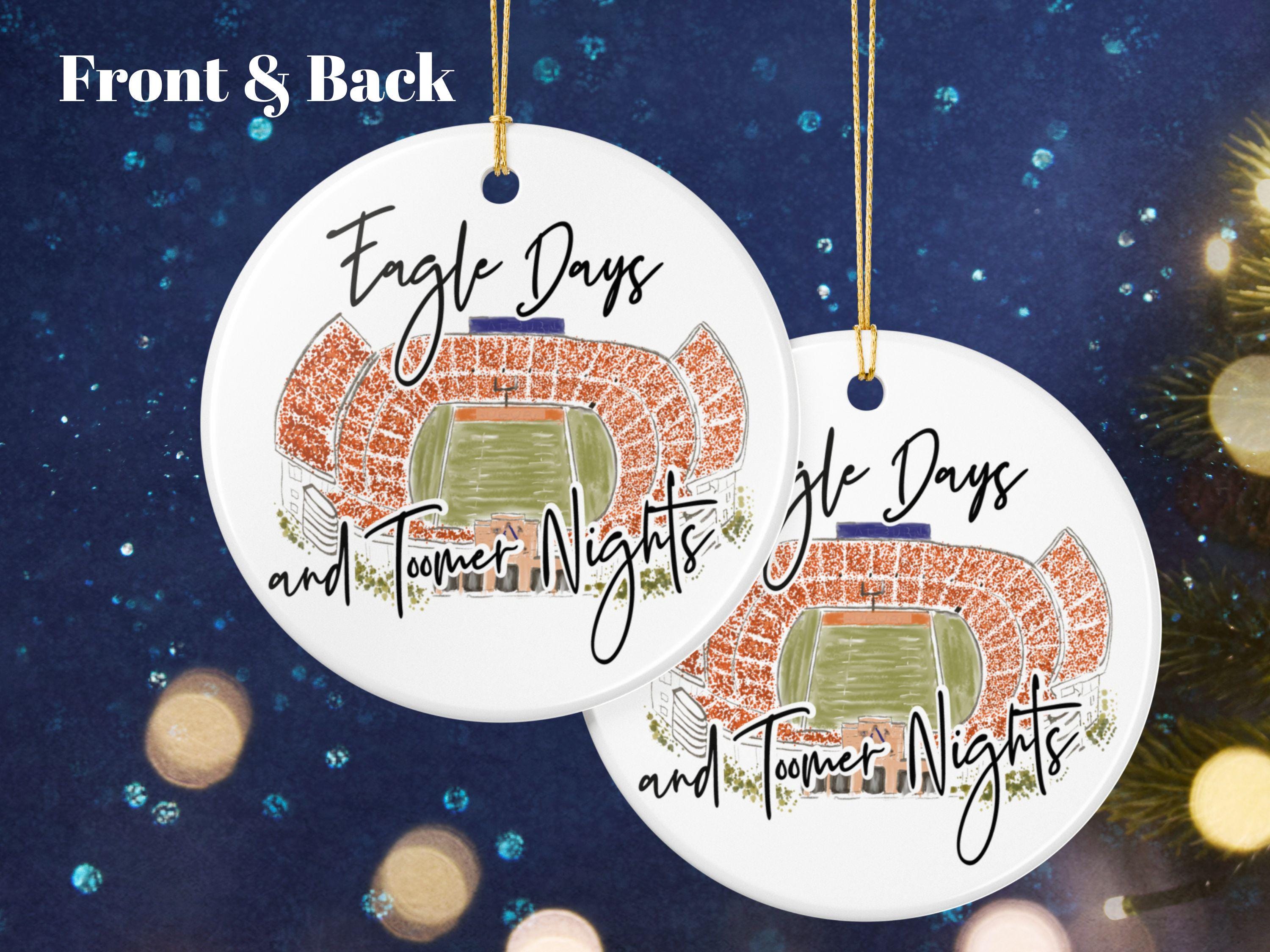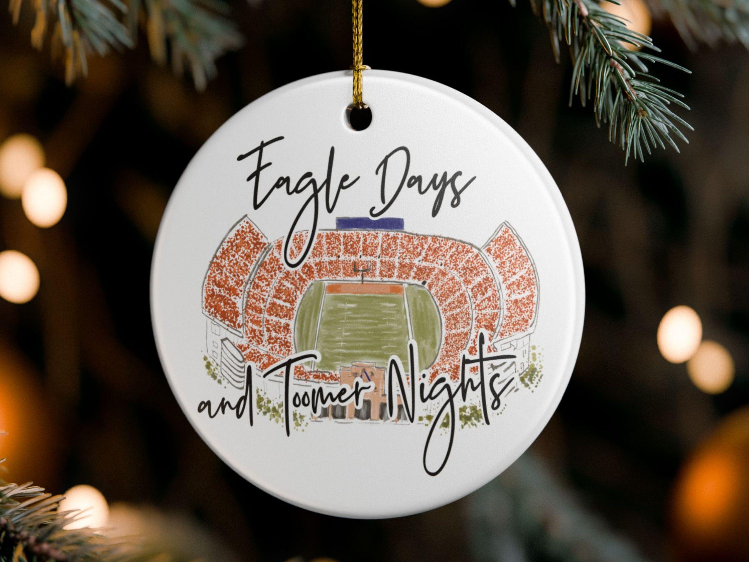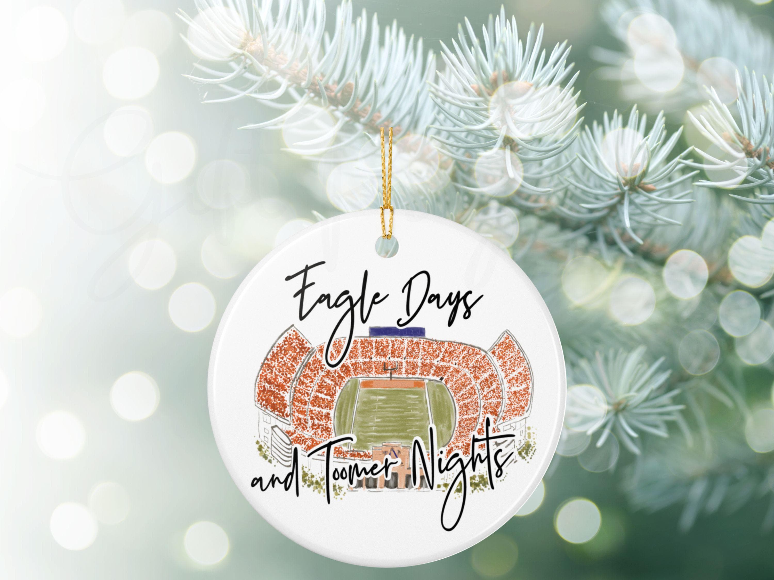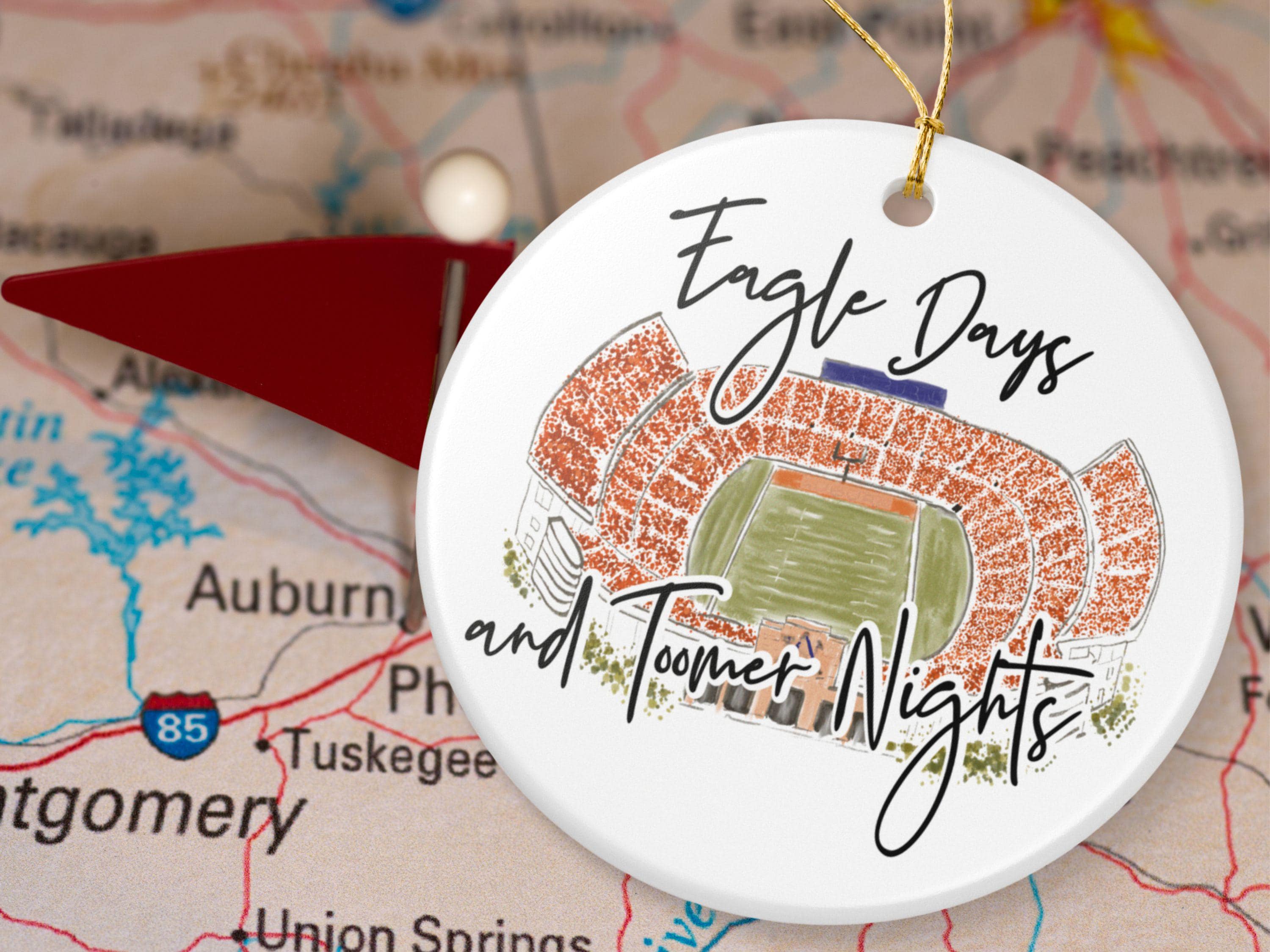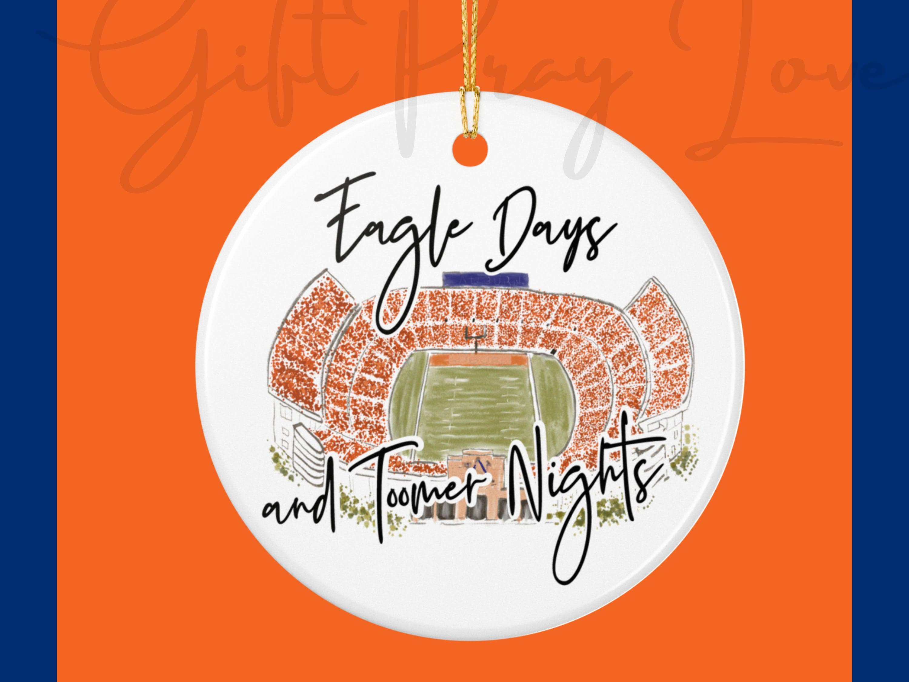 Celebrate the charm of Saturdays on the Plains with this beautifully illustrated “Eagle Days and Toomer Nights” ornament. Featuring an original watercolor-style rendering of a packed stadium in classic orange hues, this keepsake captures the magic of Auburn’s traditions — from sunny tailgates to those unforgettable nights at Toomer’s Corner.