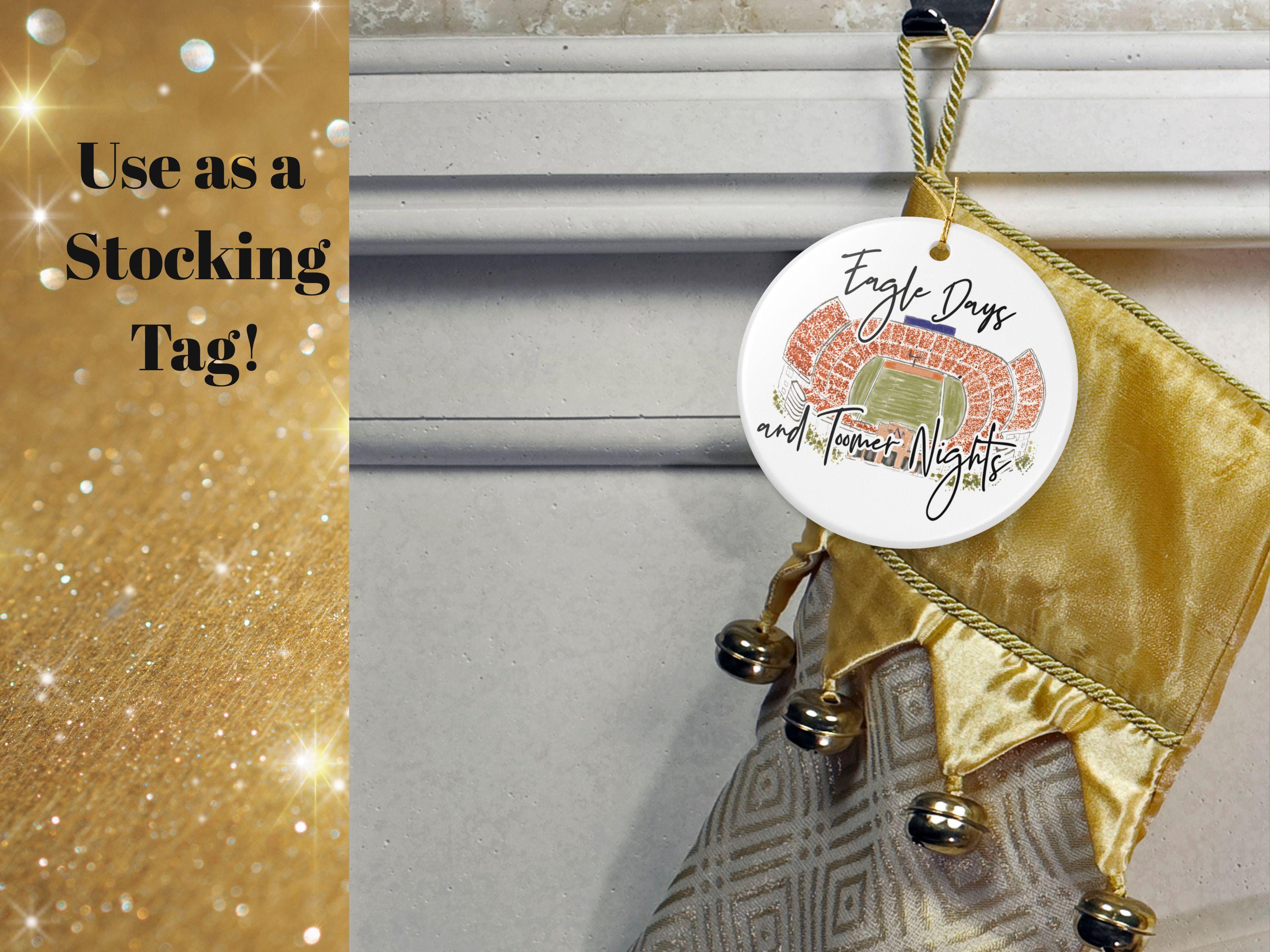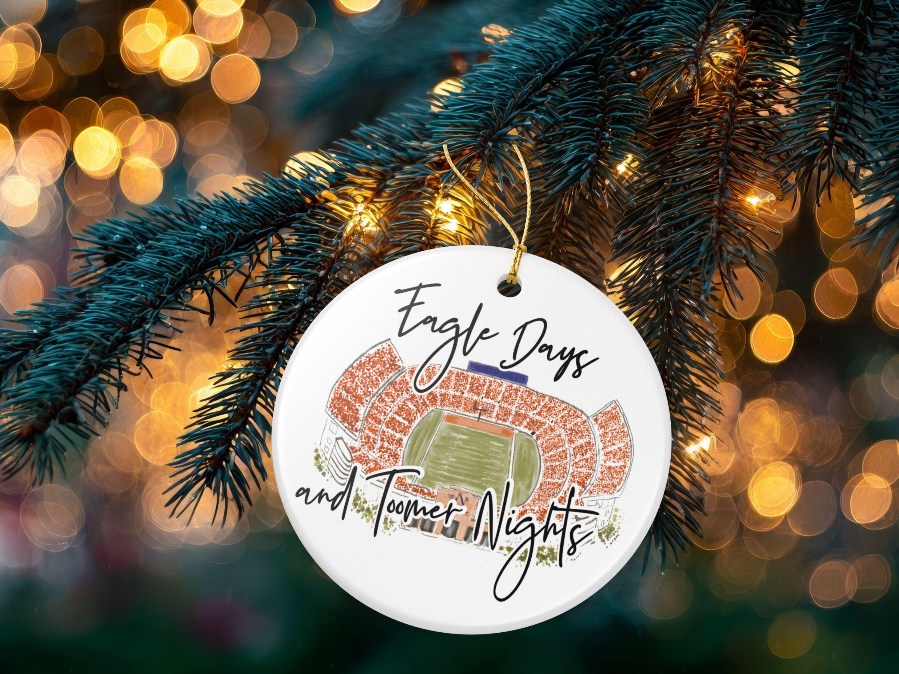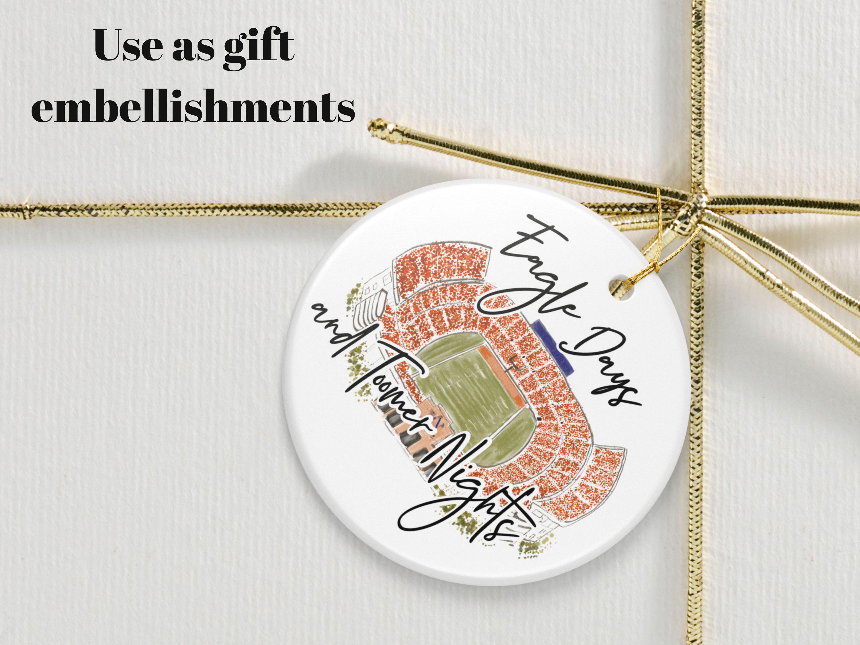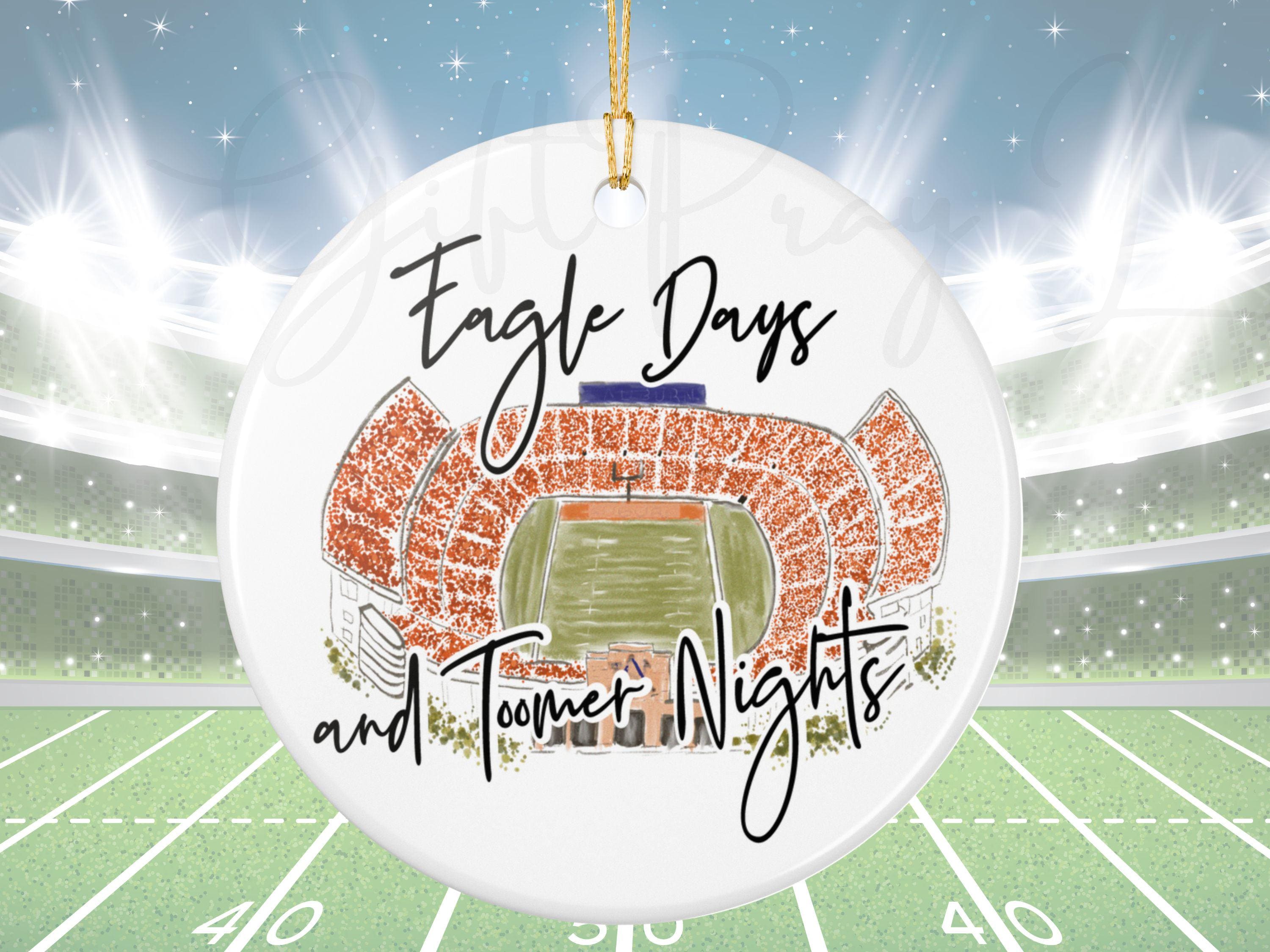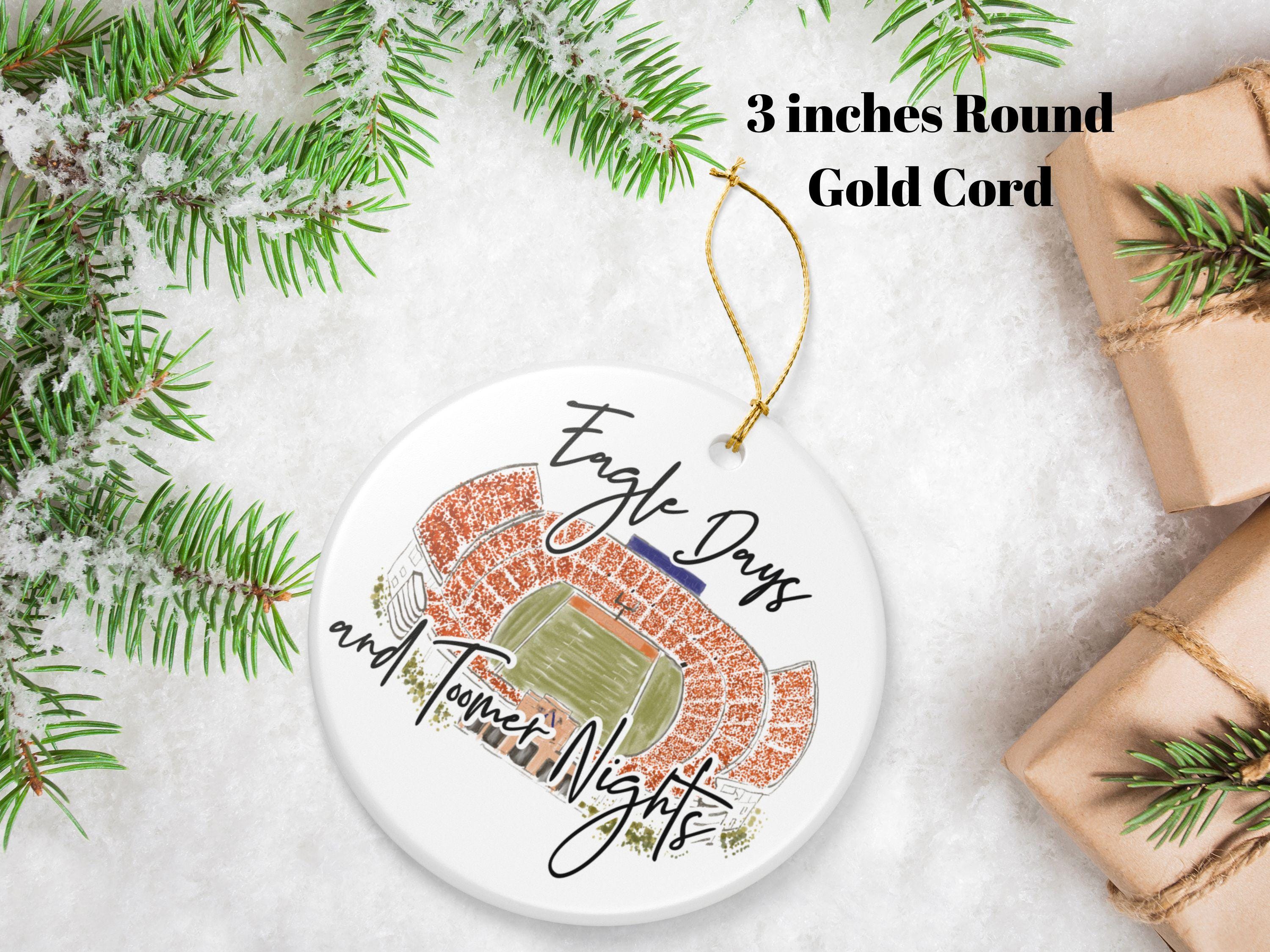 Celebrate the charm of Saturdays on the Plains with this beautifully illustrated “Eagle Days and Toomer Nights” ornament. Featuring an original watercolor-style rendering of a packed stadium in classic orange hues, this keepsake captures the magic of Auburn’s traditions — from sunny tailgates to those unforgettable nights at Toomer’s Corner.