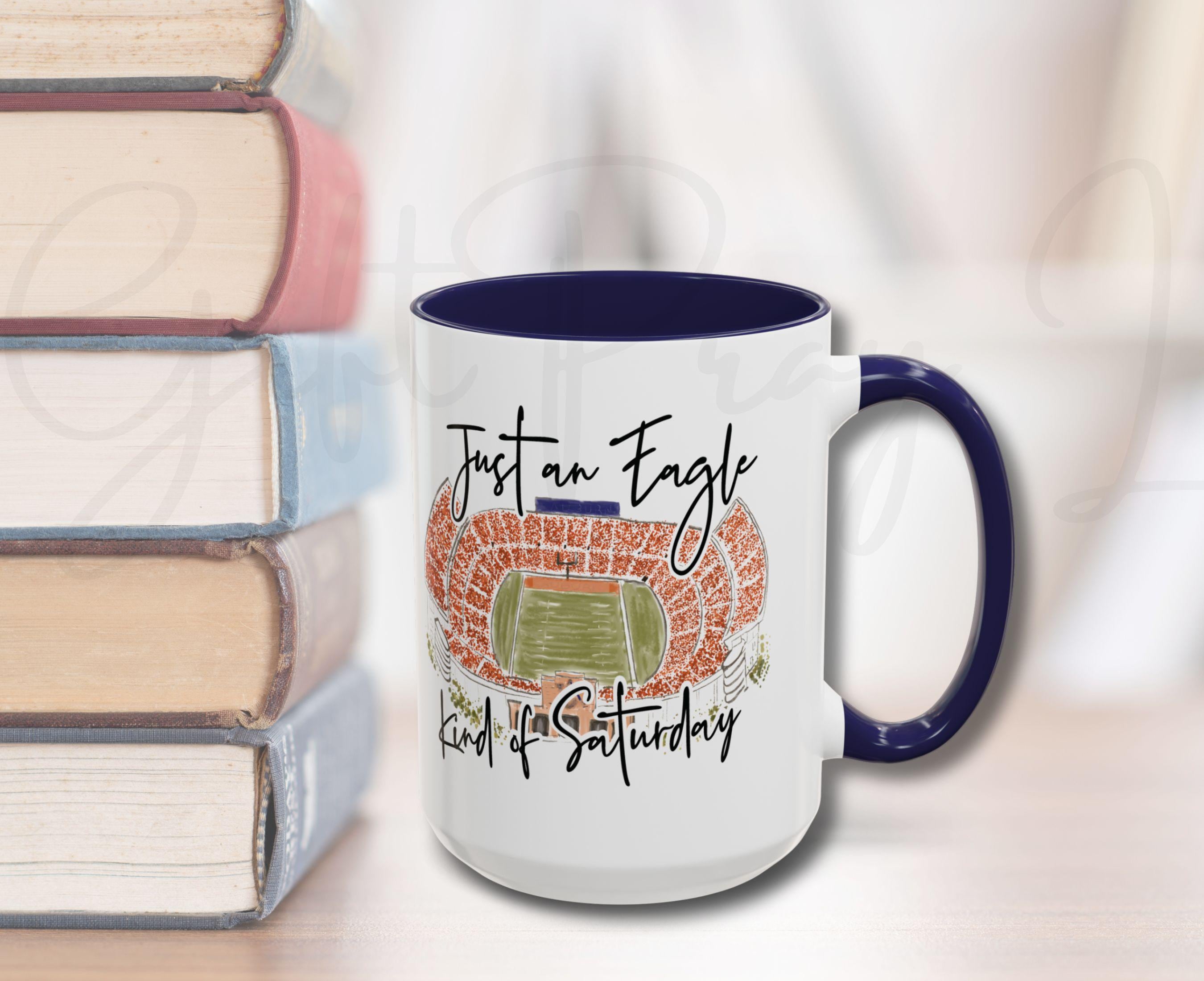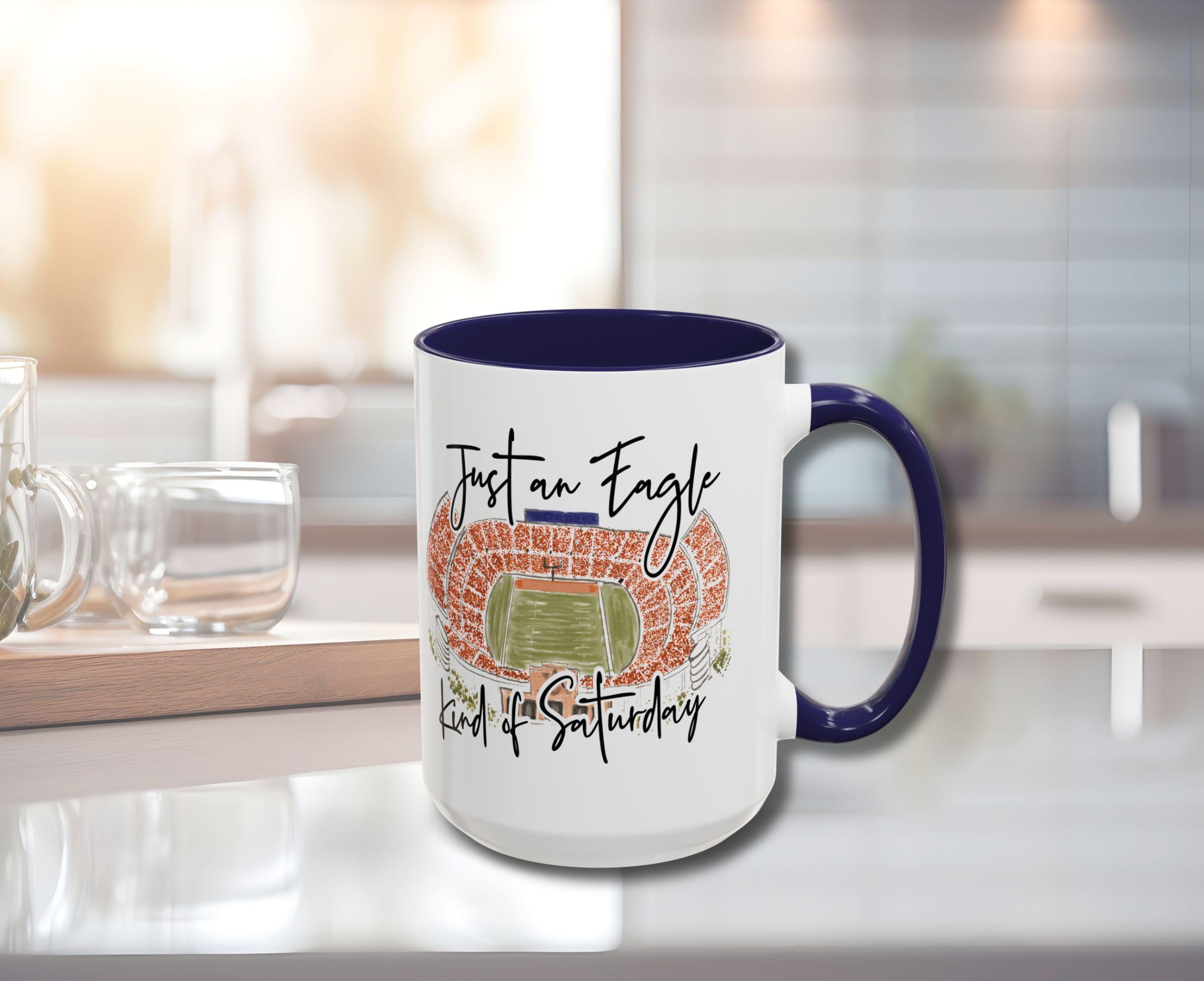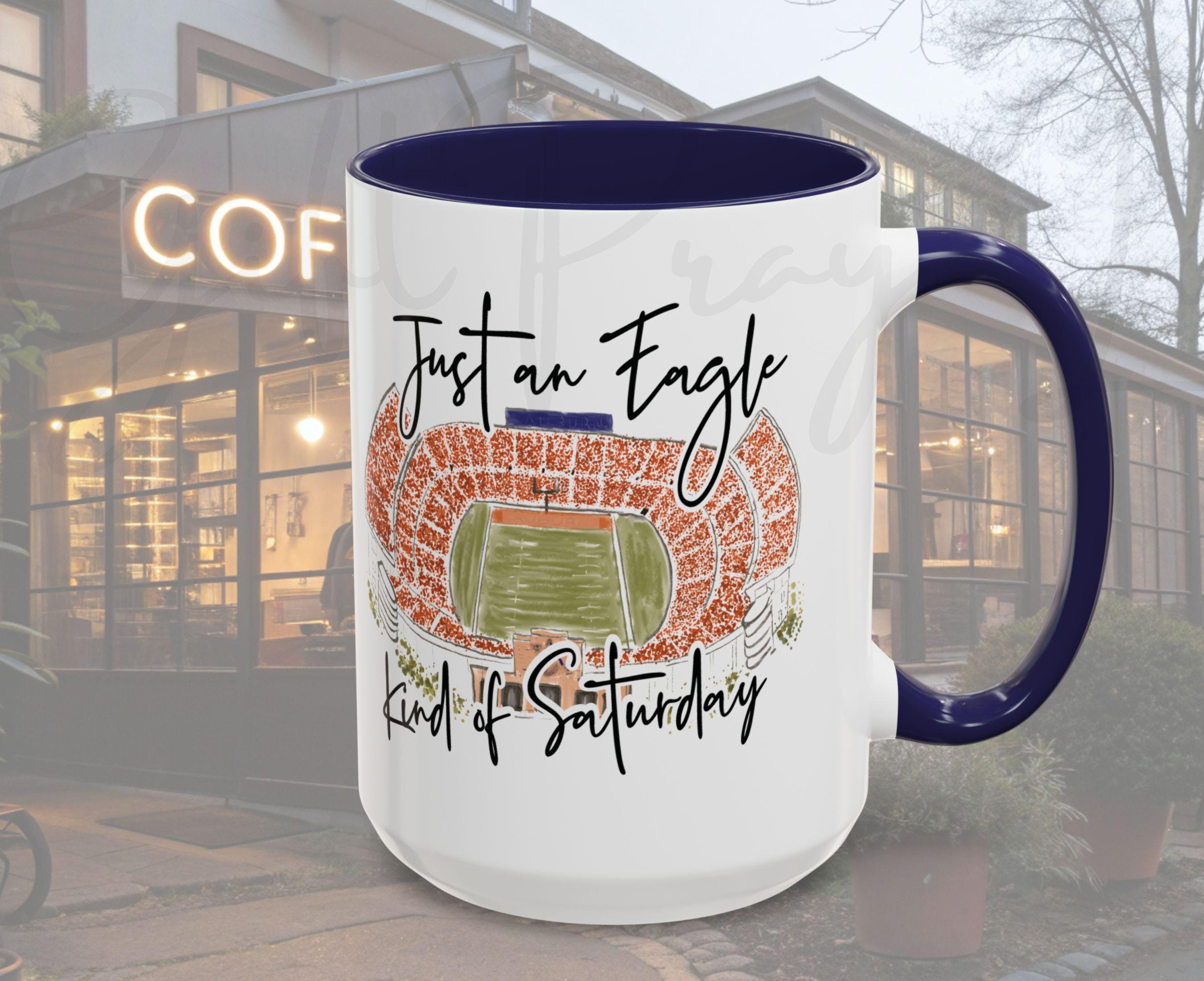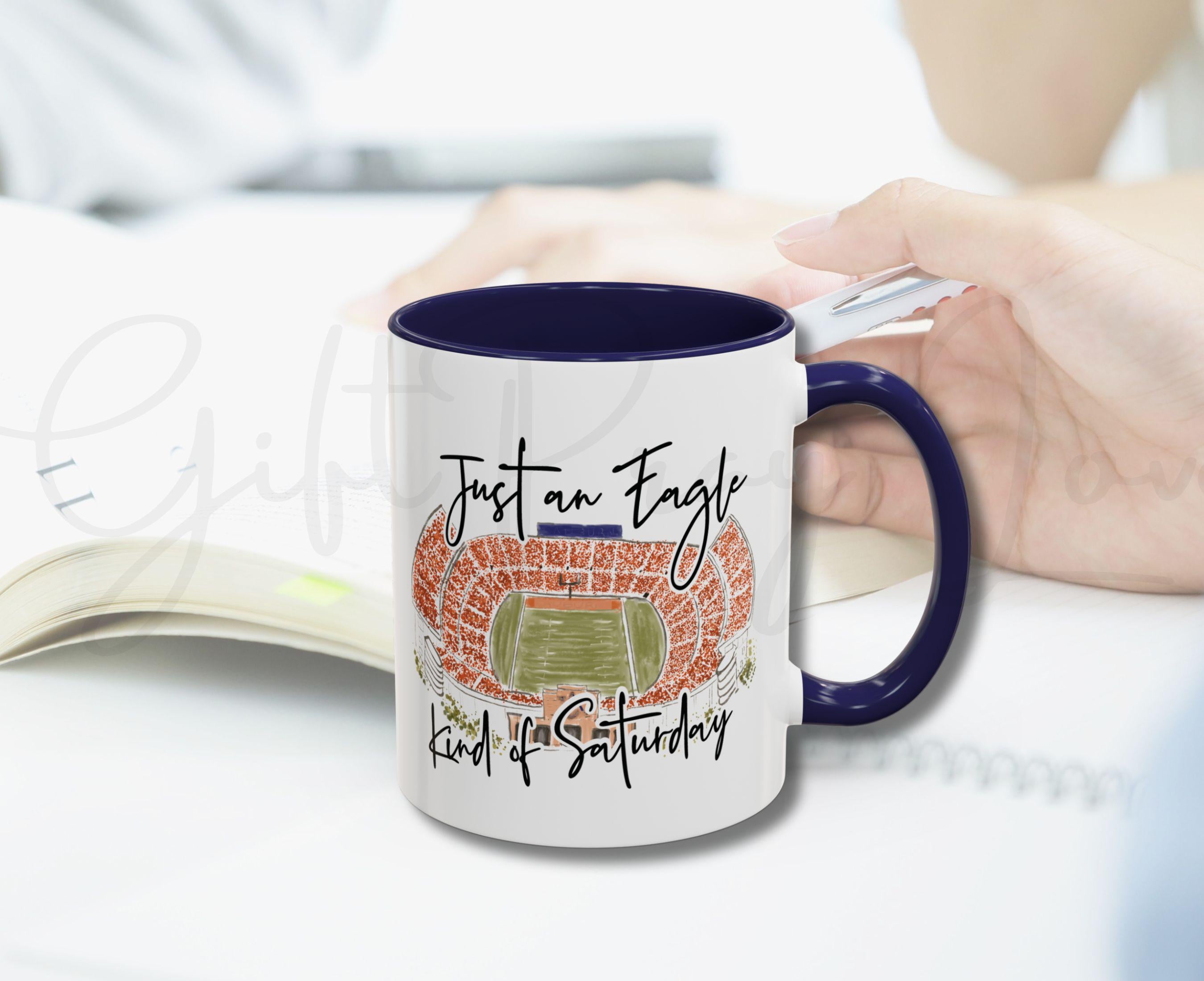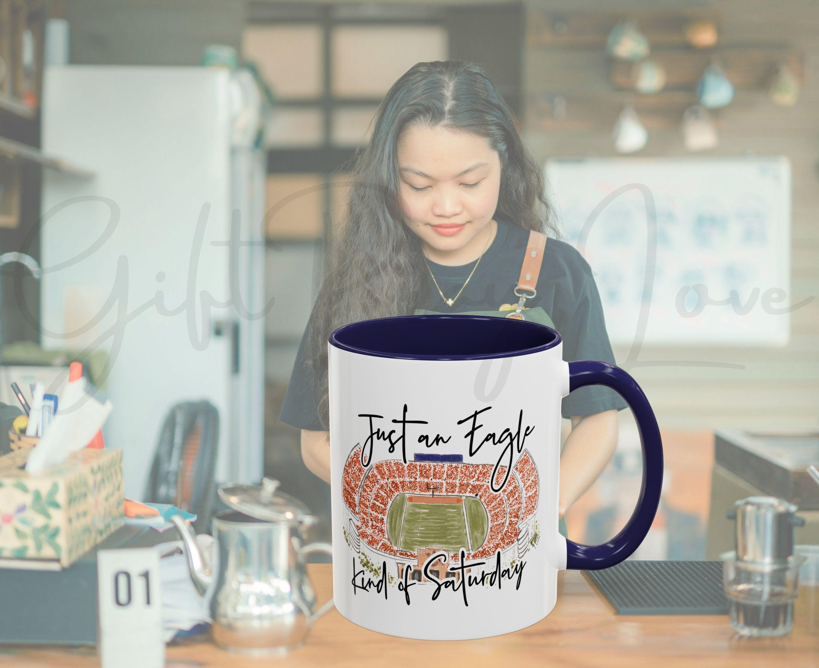 This vibrant ceramic mug brings game-day energy to every morning coffee or afternoon tea. The glossy white exterior paired with a colored interior and handle makes the illustrated stadium artwork pop — a casual, hand-painted look with the playful phrase “Just an Eagle kind of Saturday.” It feels like a slow walk into the stands: sun-warmed concrete, the distant roar of the crowd, and the ritual of a warm cup in your hands. Lightweight but sturdy, it fits easily into daily routines for fans who celebrate Saturdays with friends, tailgates, or quiet at-home rituals. The bold color contrast adds a bit of personality to your mug rack and keeps the vibe lively through repeat use and washes.