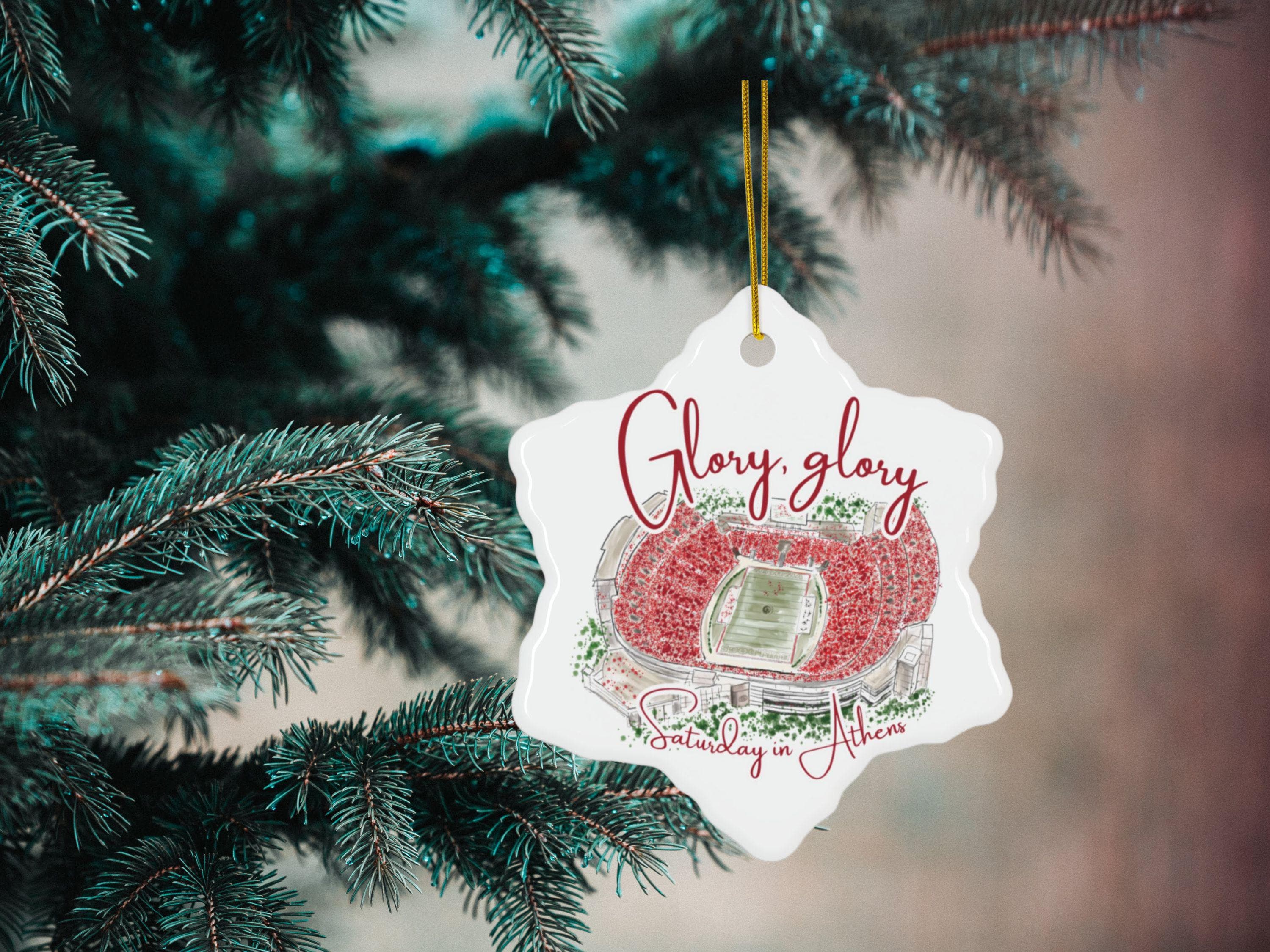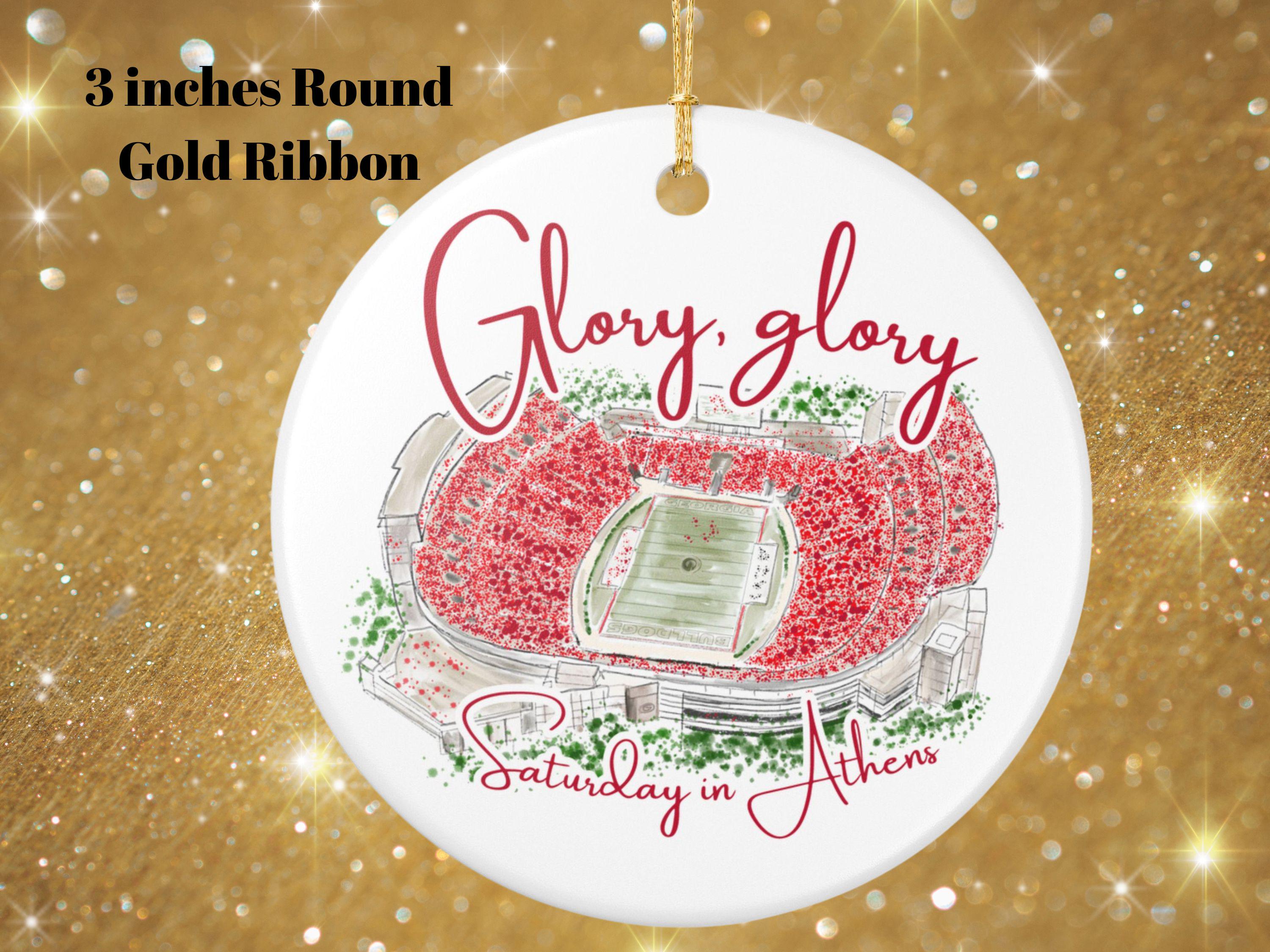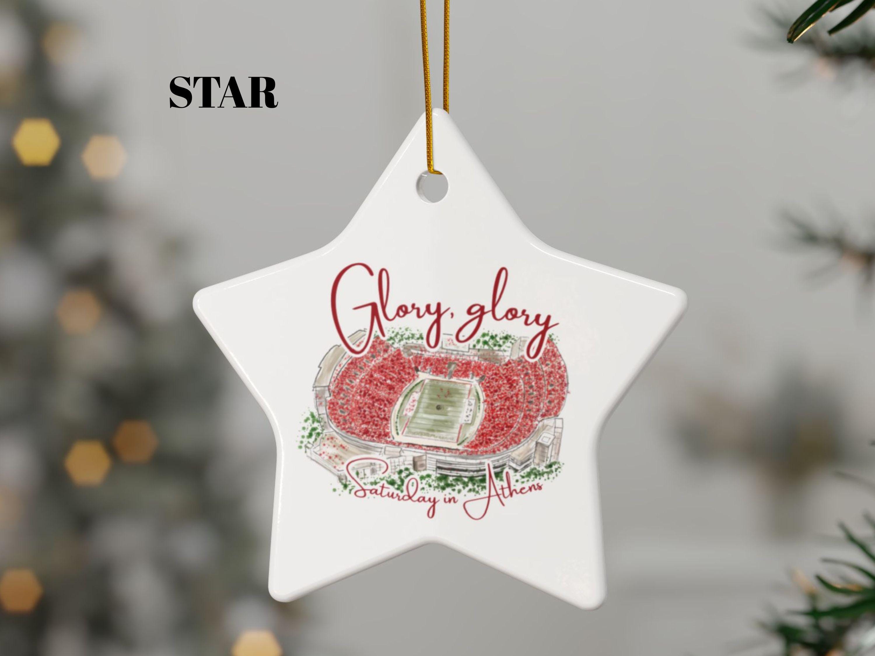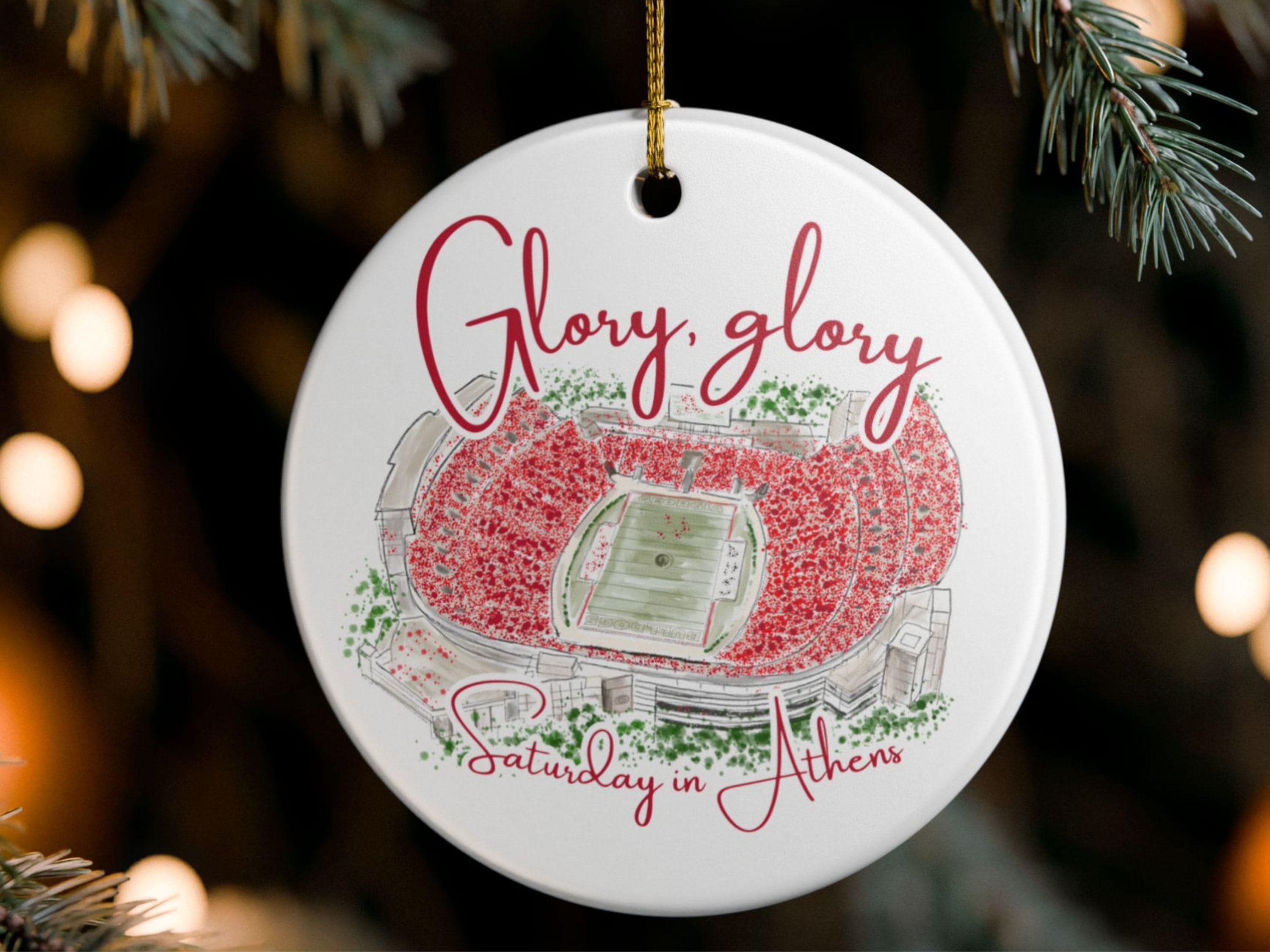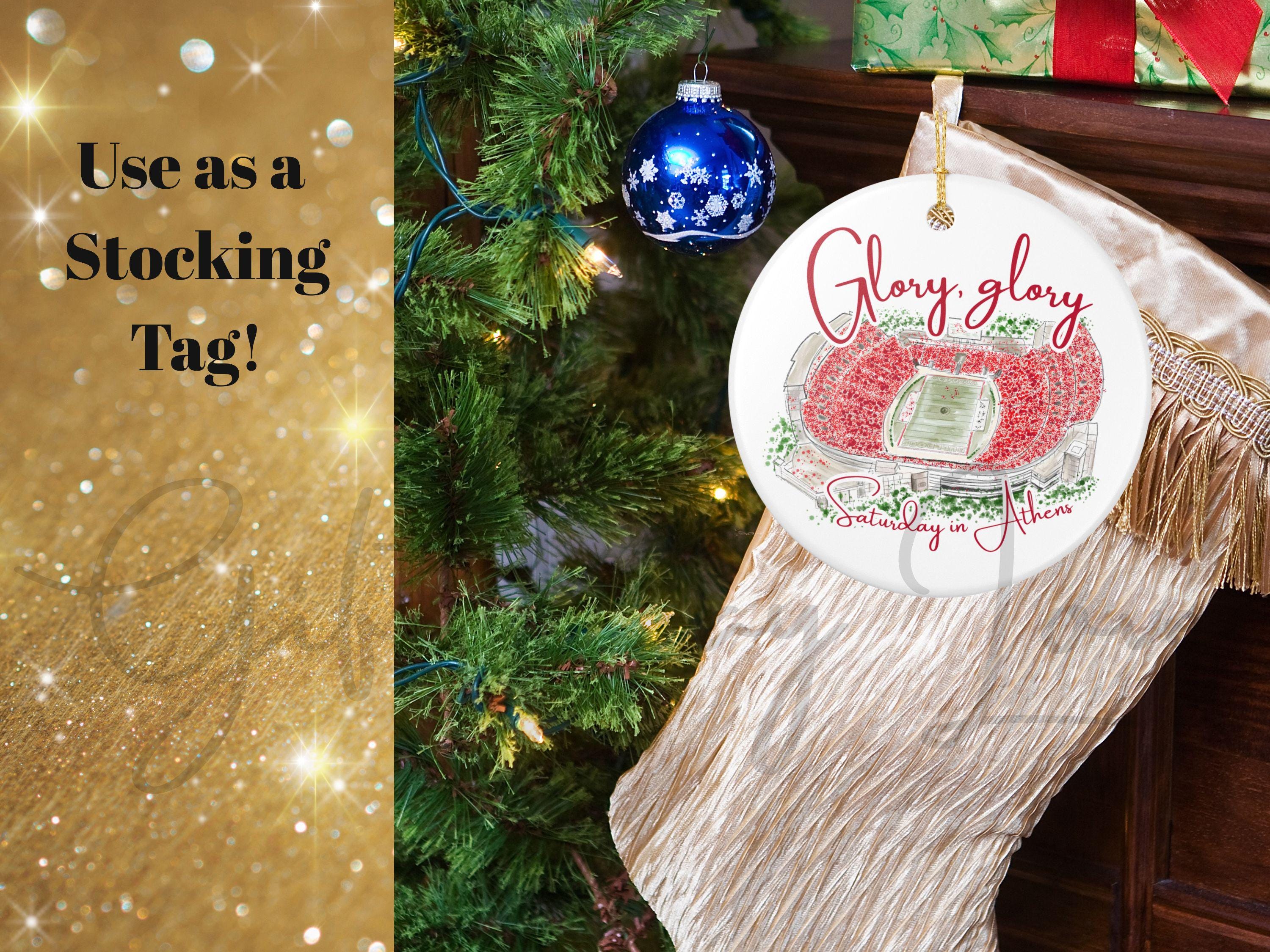 Add Bulldog pride to your Christmas tree with this hand-drawn Sanford Stadium “Glory, Glory” Ceramic Ornament! Featuring a detailed sketch of the legendary Georgia Bulldogs stadium, this ornament brings the heart of Athens, GA straight to your holiday decor.
