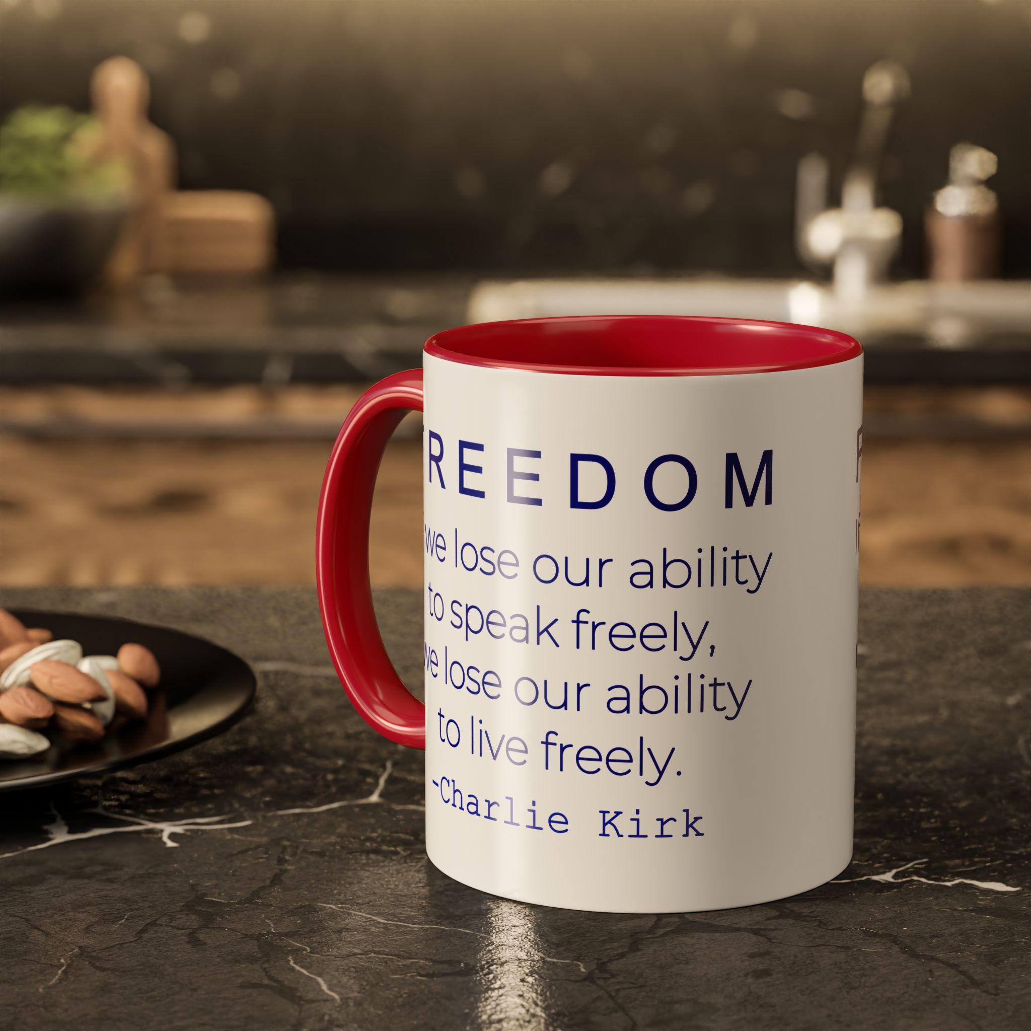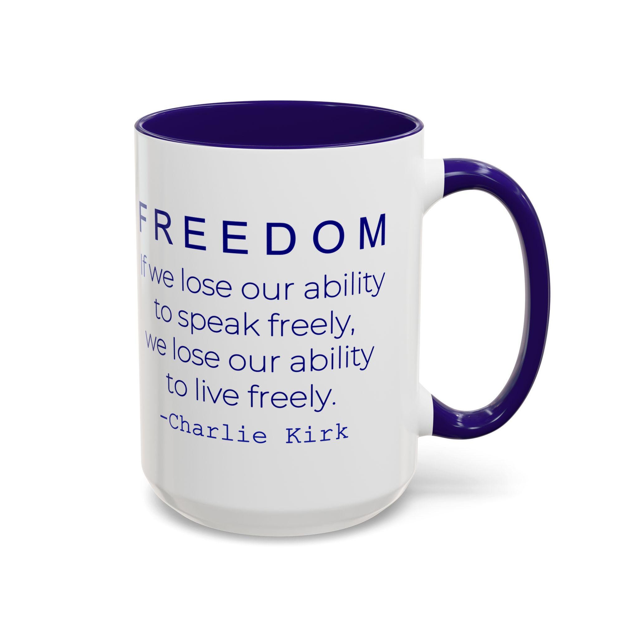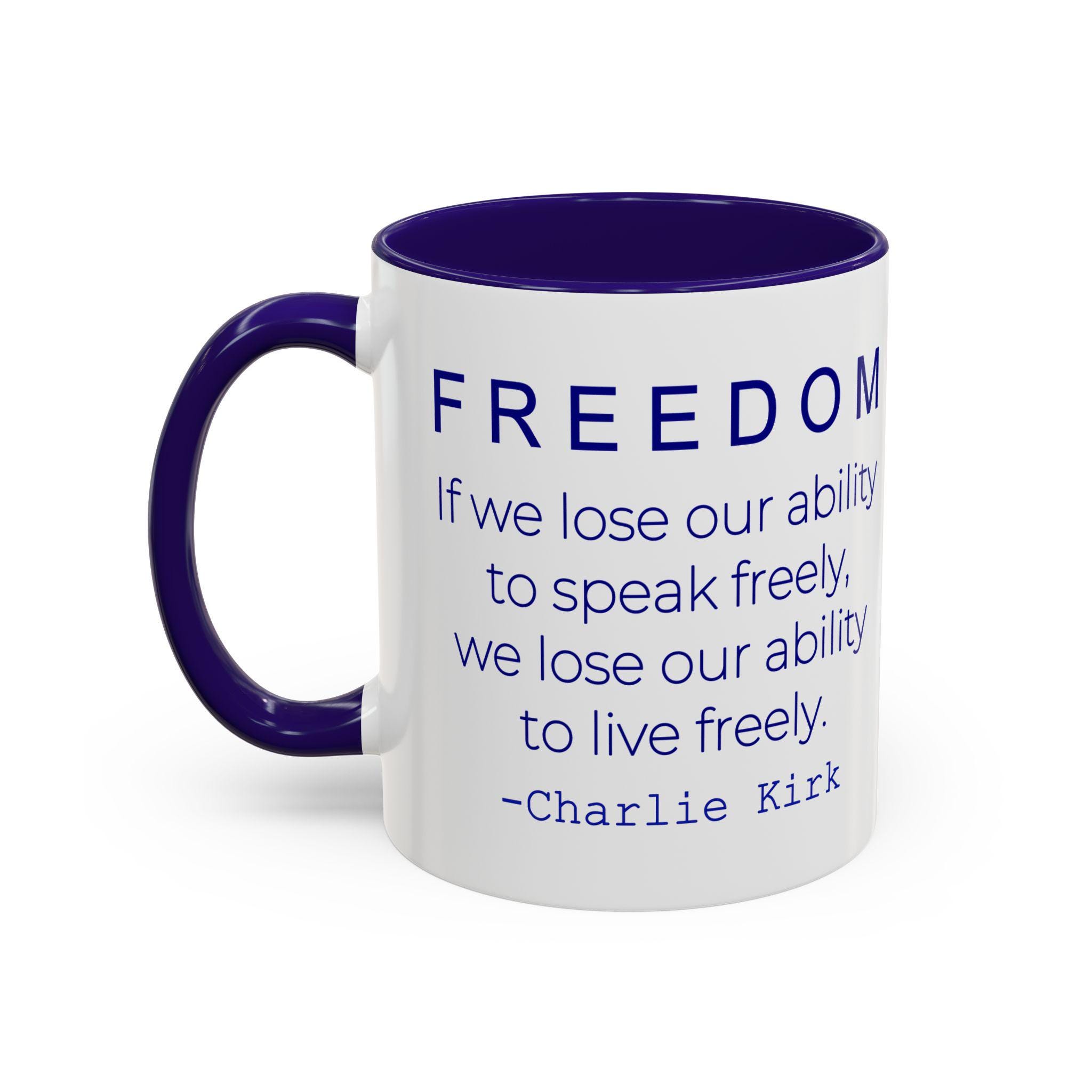 Honor the value of free speech with this bold ceramic mug featuring the inspiring Charlie Kirk quote: “If we lose our ability to speak freely, we lose our ability to live freely.” Clean, modern typography makes this design stand out, creating a meaningful piece for anyone passionate about liberty, open dialogue, and American ideals.