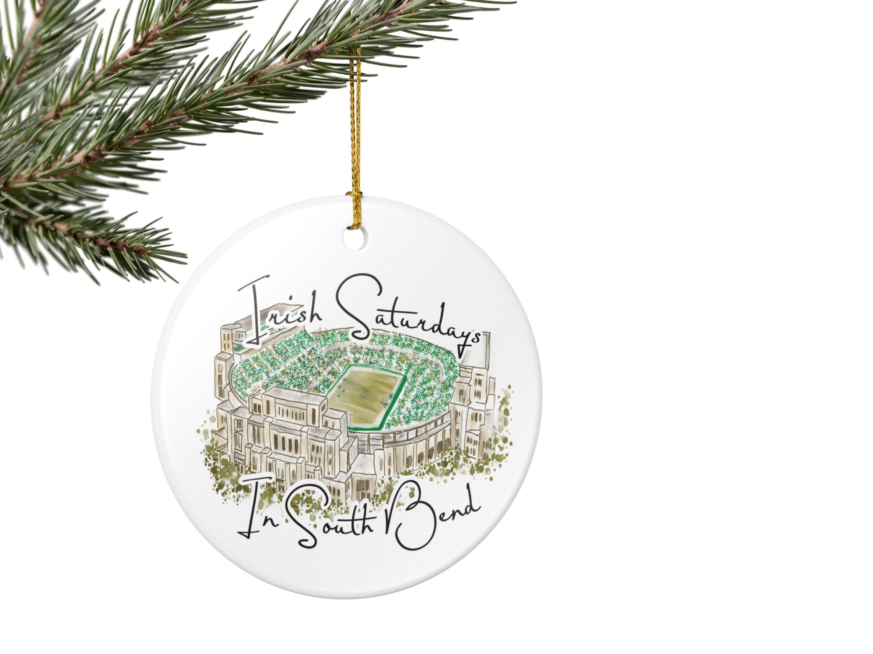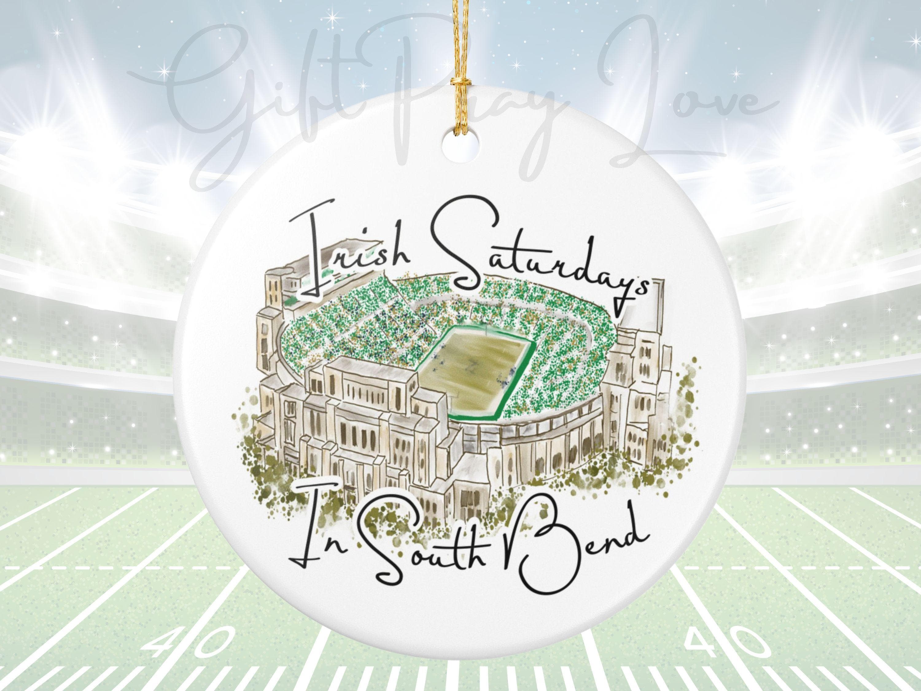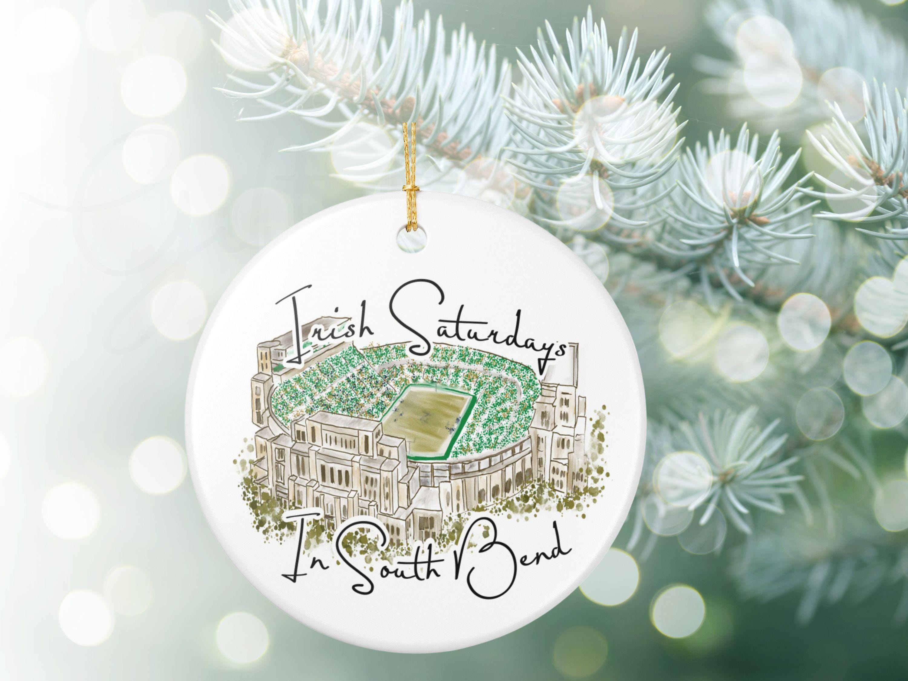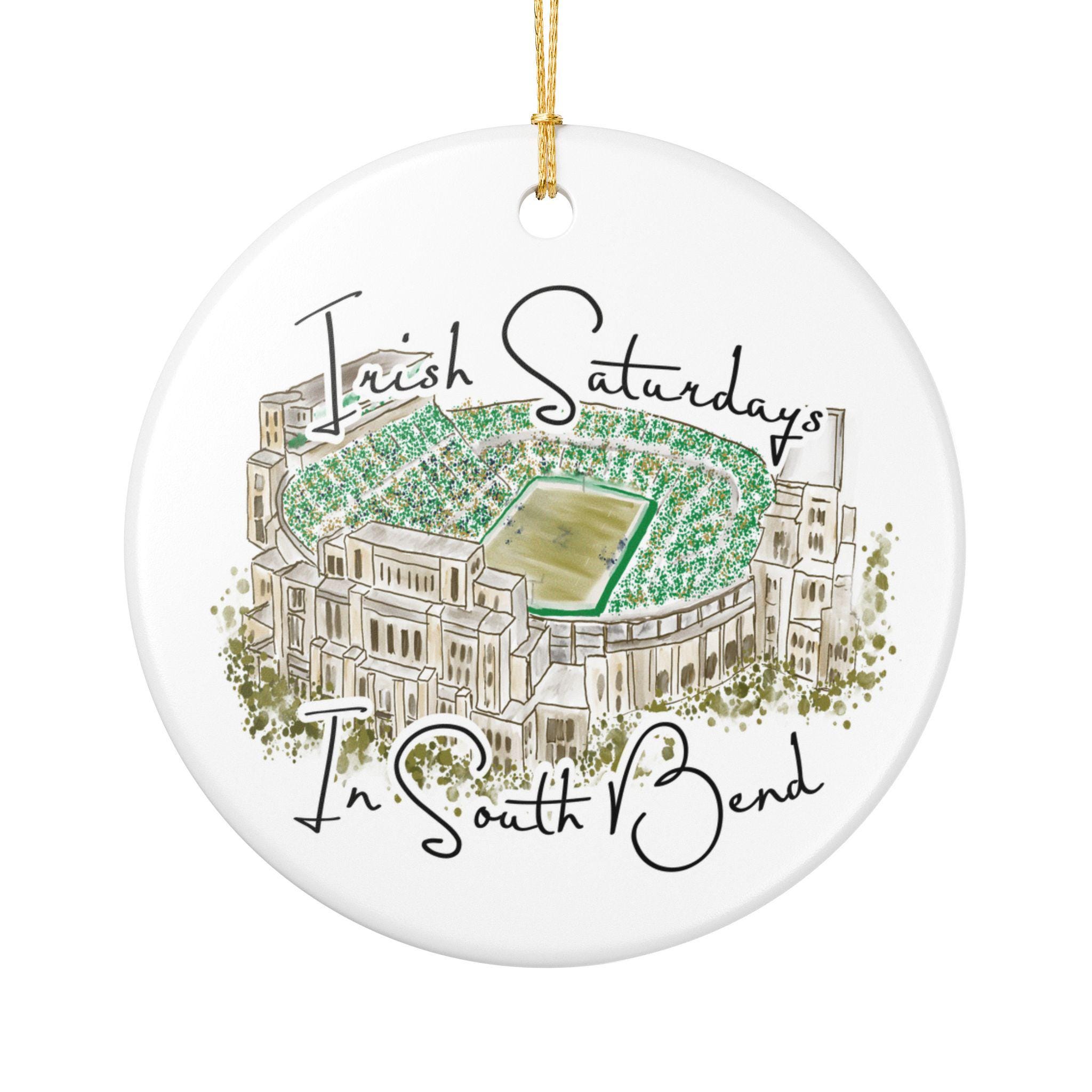 Hand-painted charm meets hometown pride. Celebrate the spirit of Notre Dame gamedays with this matte ceramic ornament featuring a hand-drawn watercolor illustration of the South Bend stadium filled with vibrant Irish green. The phrase “Irish Saturdays in South Bend” adds a warm, spirited touch that resonates with ND fans, alumni, and anyone who cherishes fall Saturdays at The Bend.