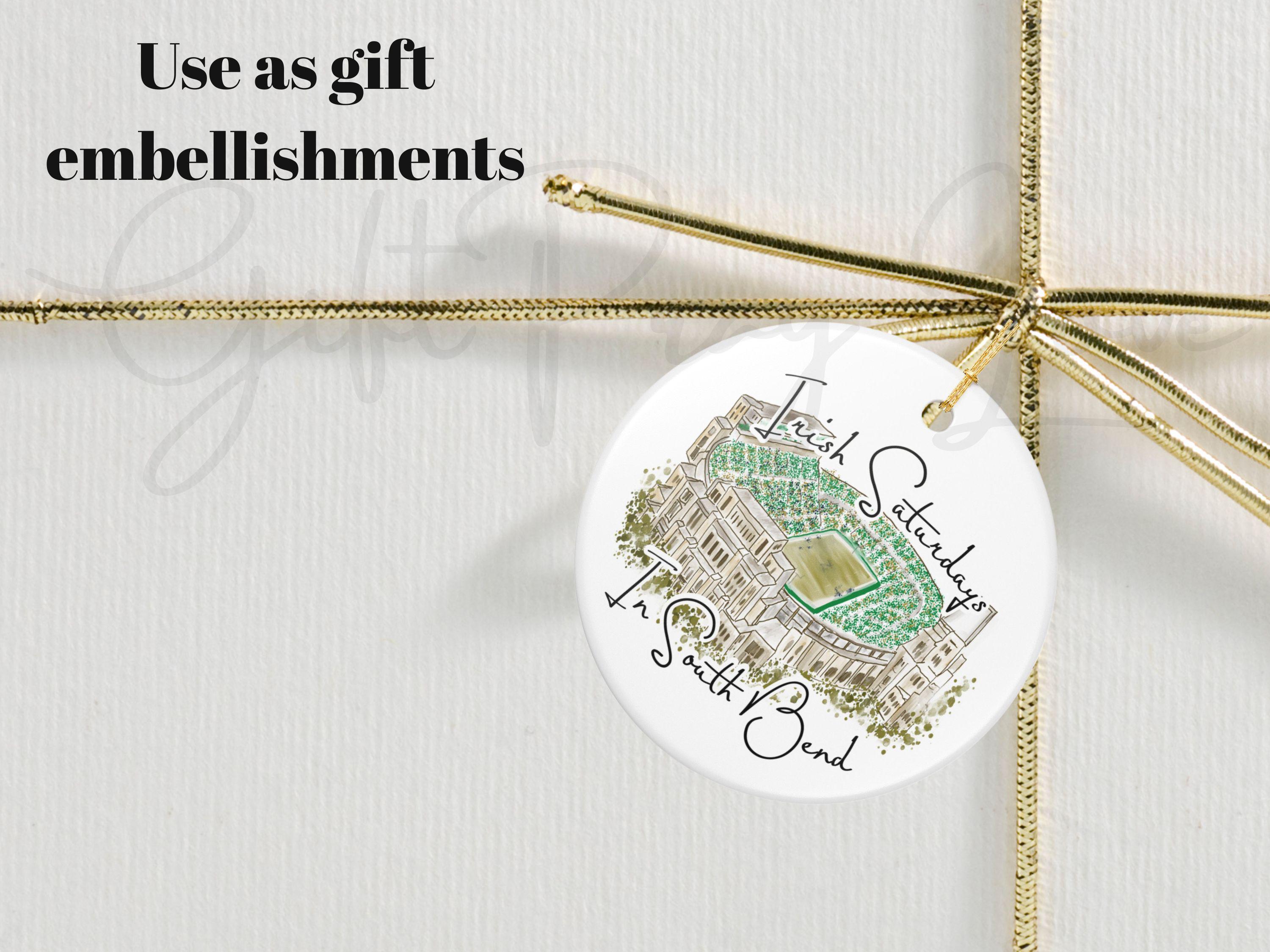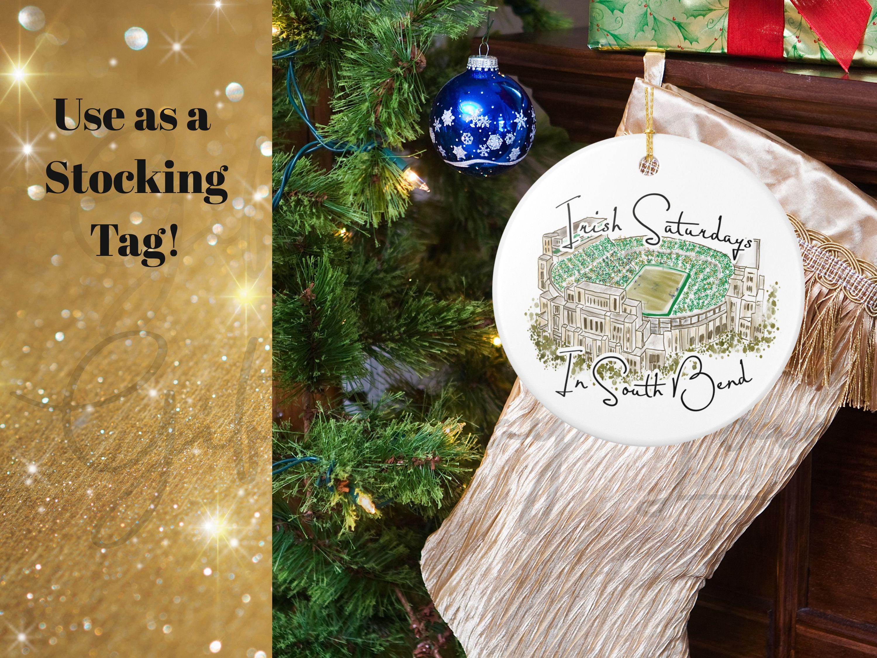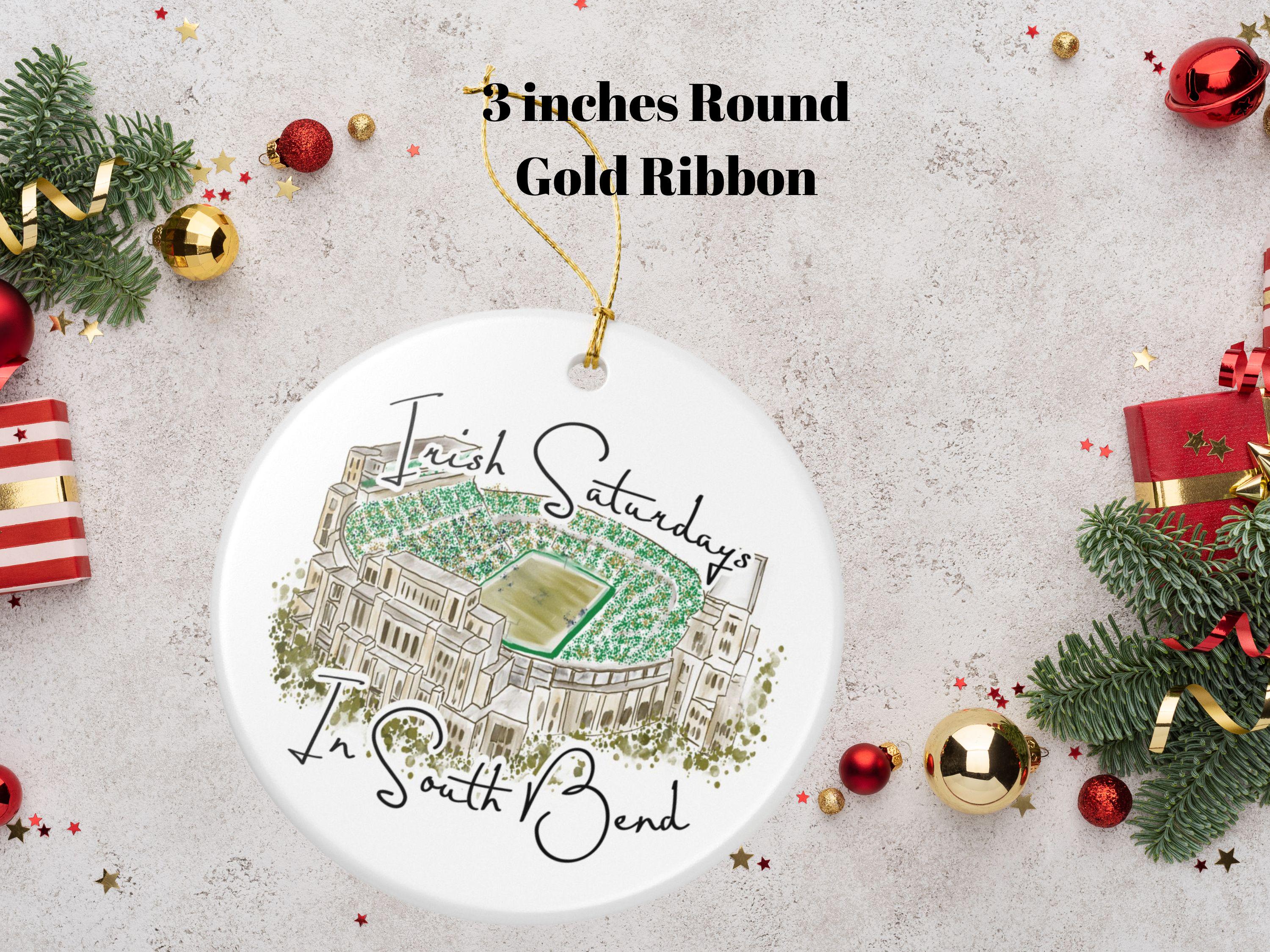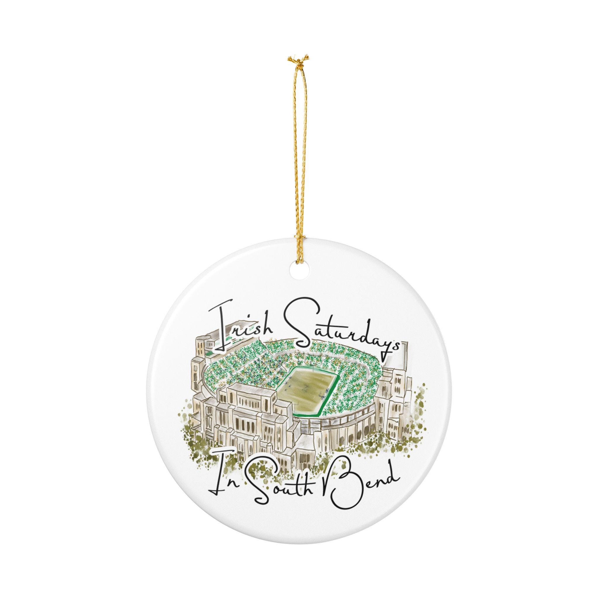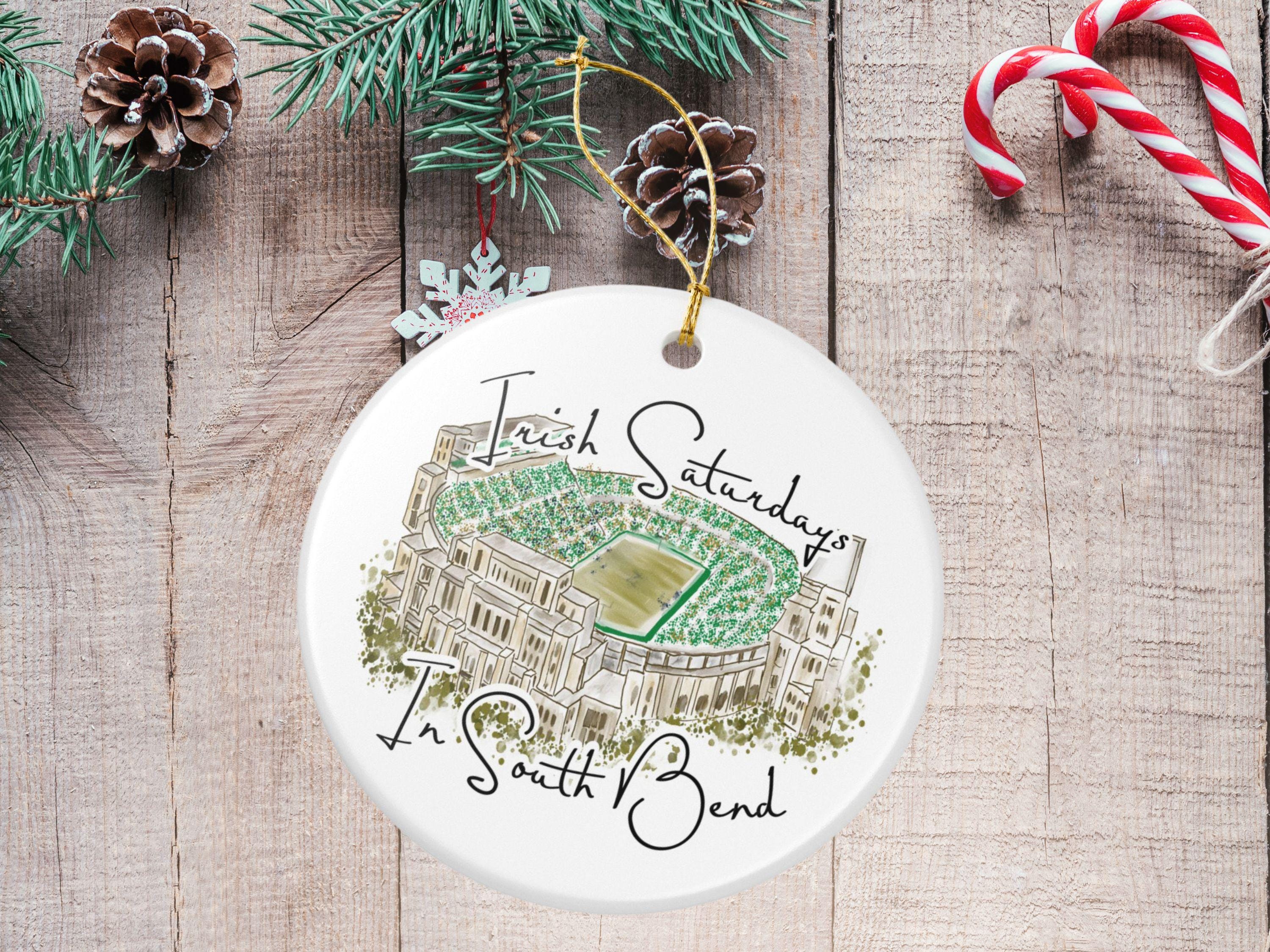 Hand-painted charm meets hometown pride. Celebrate the spirit of Notre Dame gamedays with this matte ceramic ornament featuring a hand-drawn watercolor illustration of the South Bend stadium filled with vibrant Irish green. The phrase “Irish Saturdays in South Bend” adds a warm, spirited touch that resonates with ND fans, alumni, and anyone who cherishes fall Saturdays at The Bend.