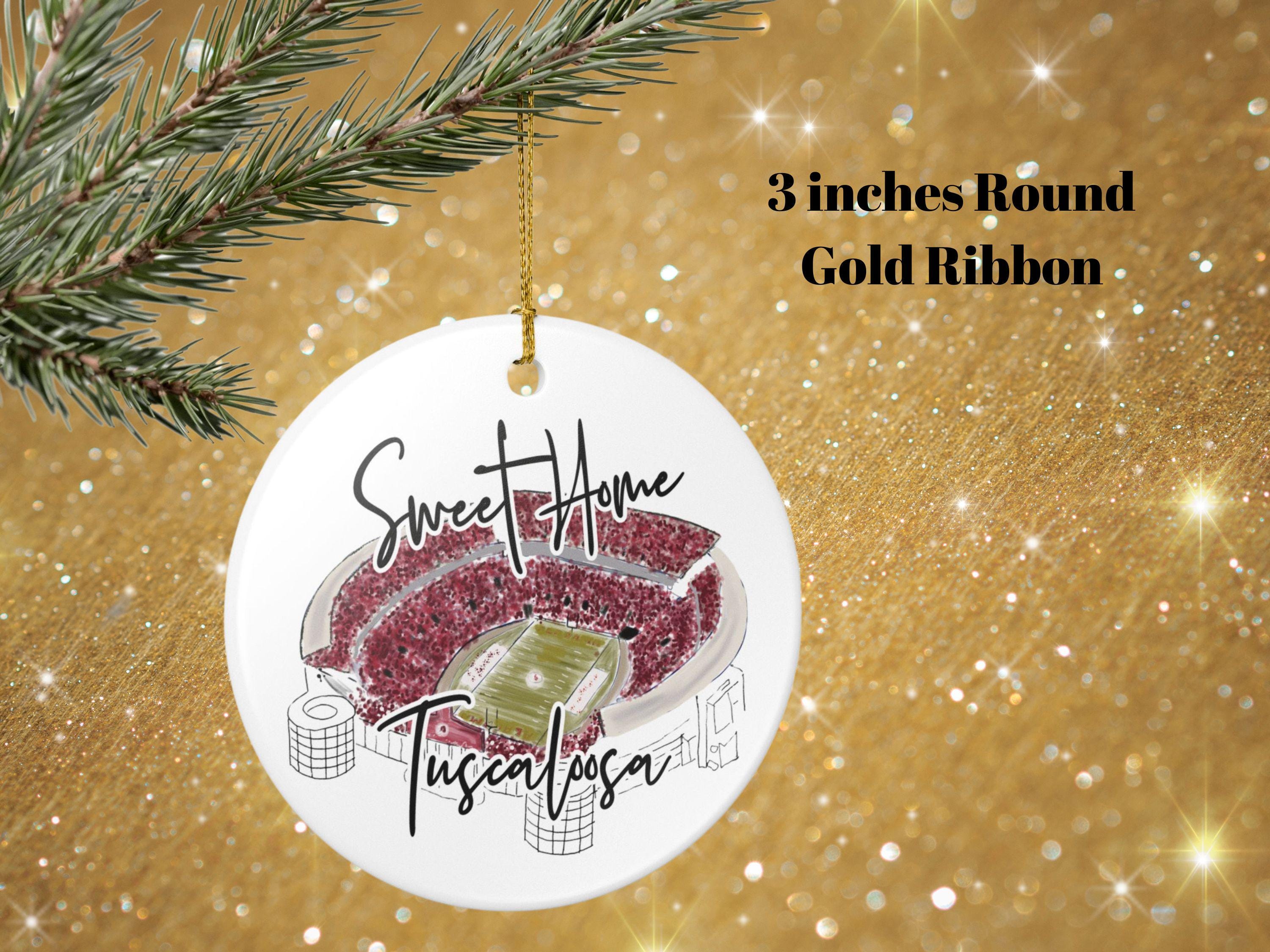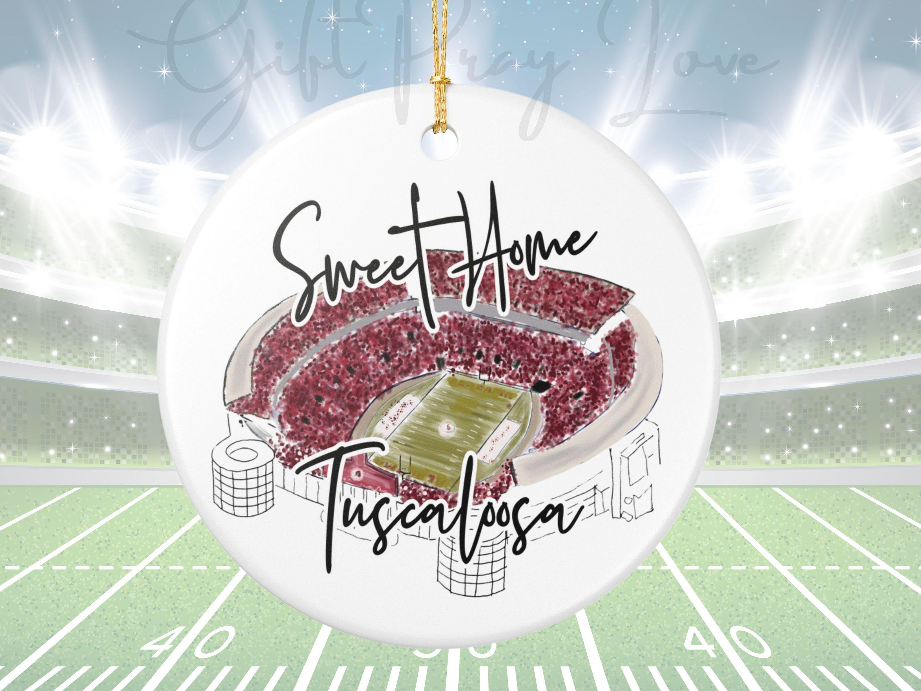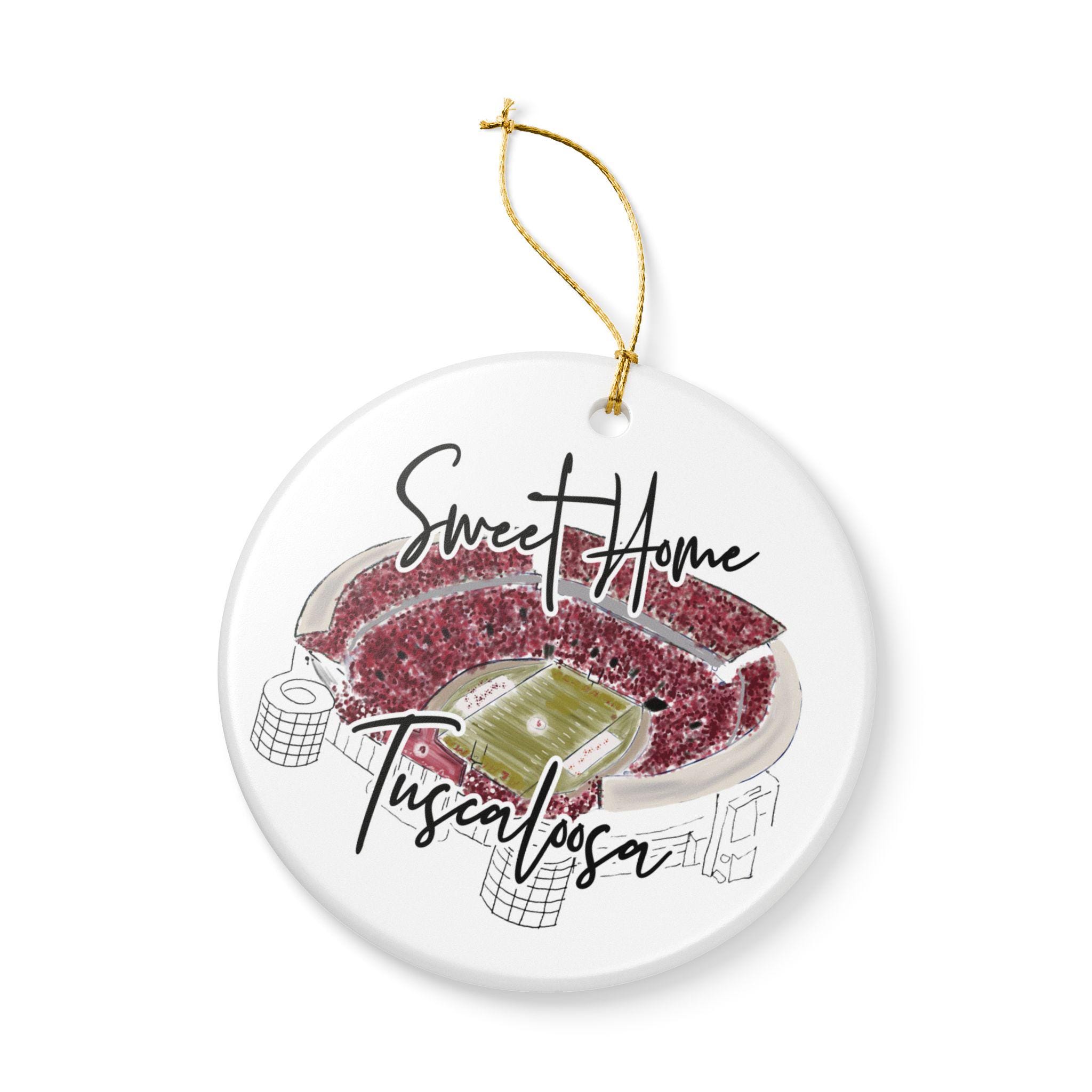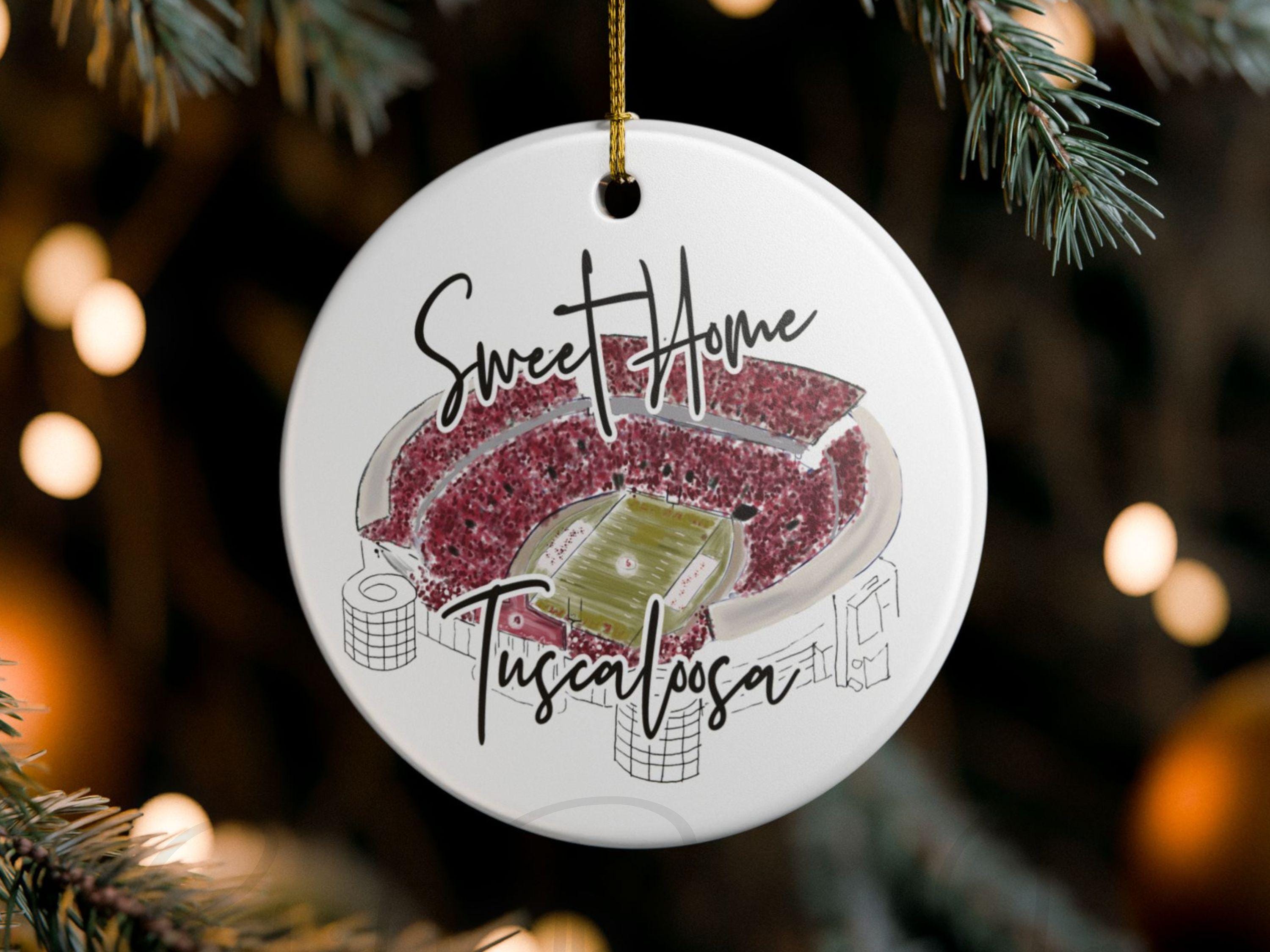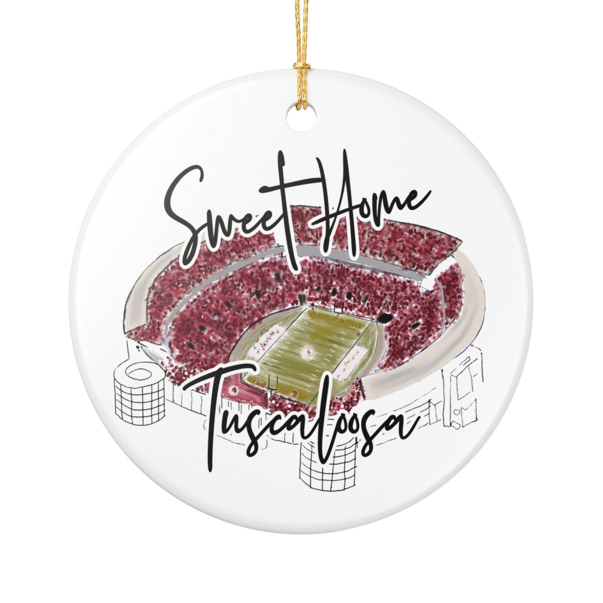 Celebrate the spirit of Tuscaloosa with this matte ceramic ornament featuring a hand-drawn watercolor illustration of the iconic crimson-filled stadium. The phrase “Sweet Home Tuscaloosa” adds a heartfelt touch that resonates deeply with fans, alumni, students, and anyone who cherishes Saturdays in T-Town.