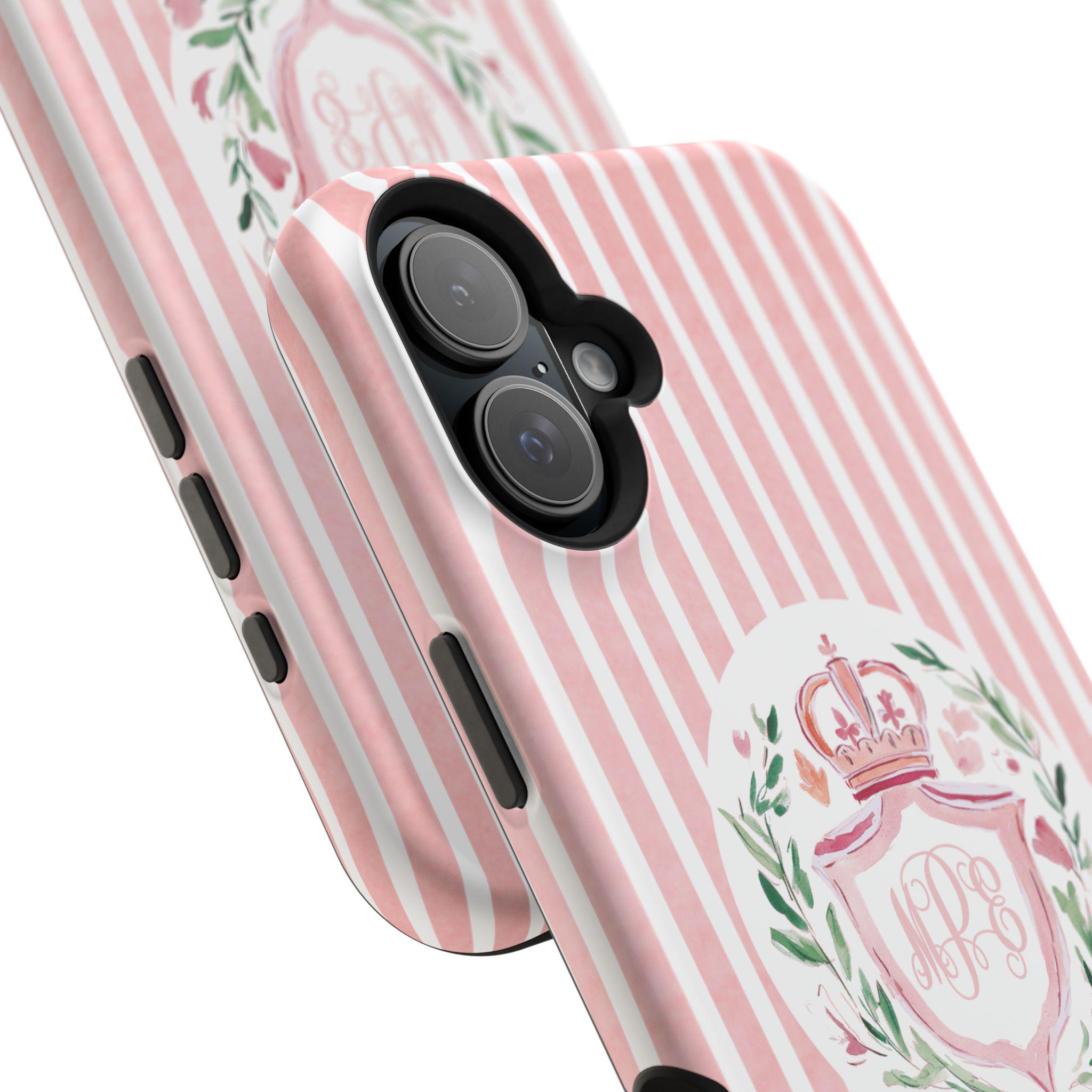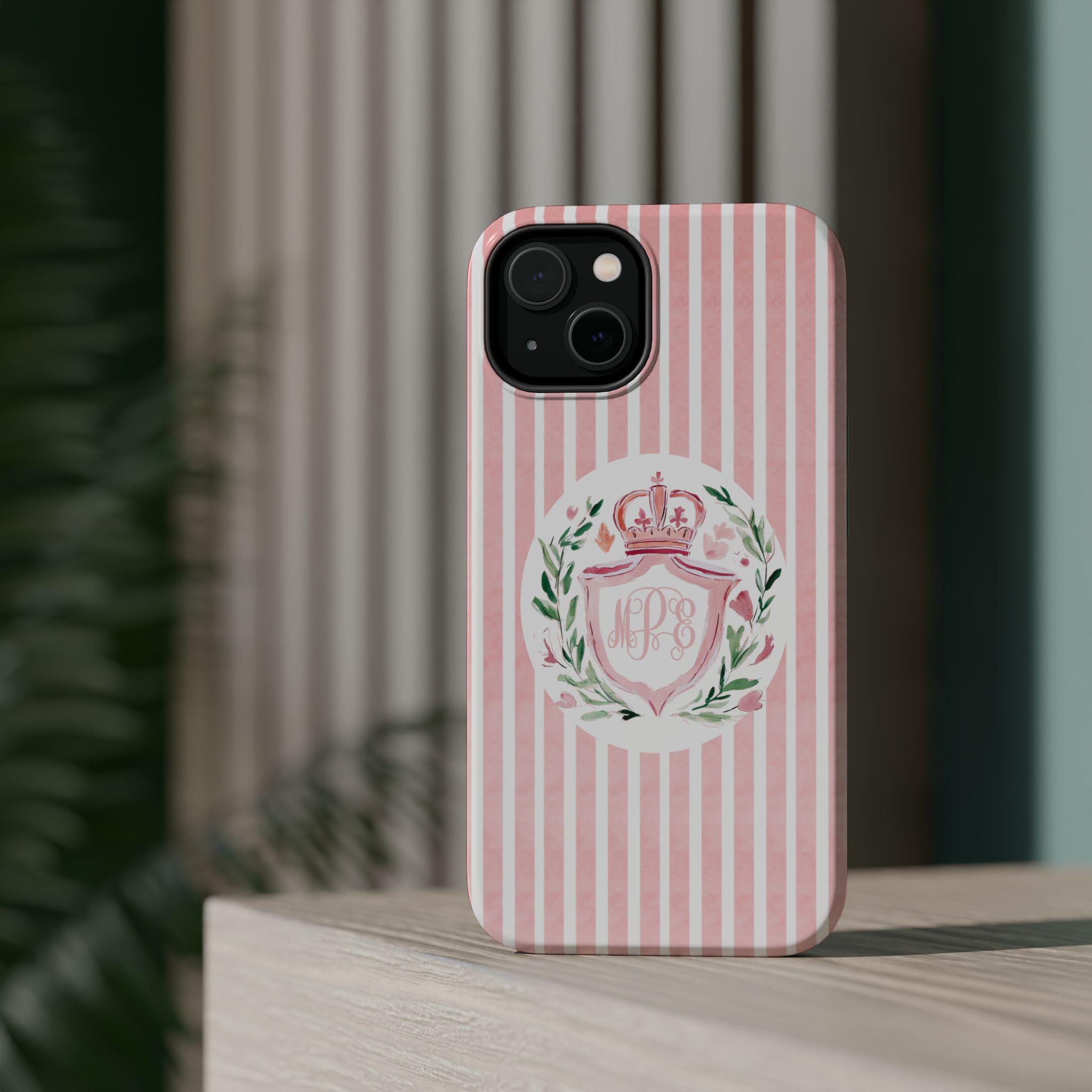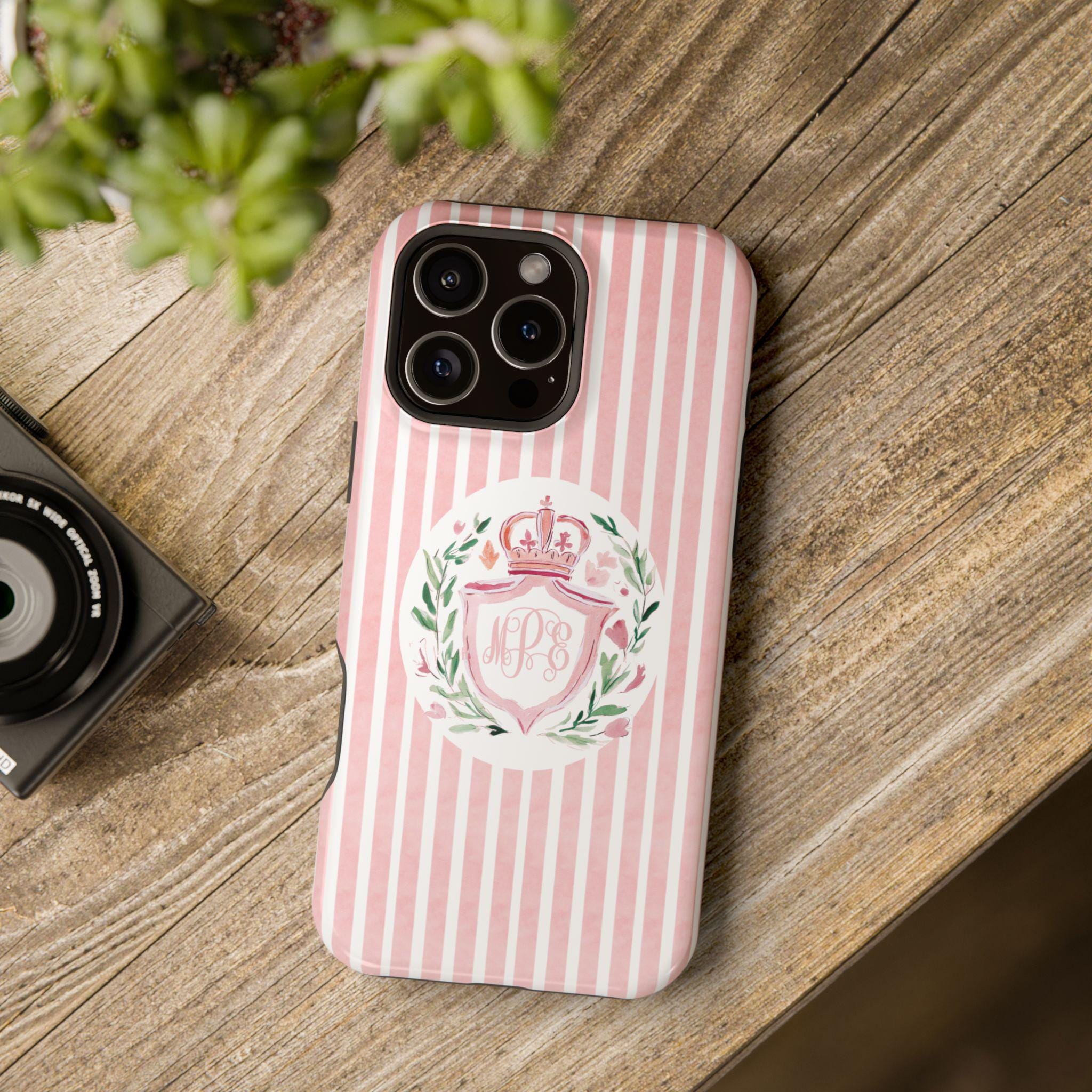Give your phone a timeless, feminine upgrade with this custom monogram Magnetic phone case featuring a pink vertical-stripe backdrop and a hand-painted watercolor crest crowned with florals. Soft, classic, and beautifully detailed, this design blends heirloom charm with everyday practicality.