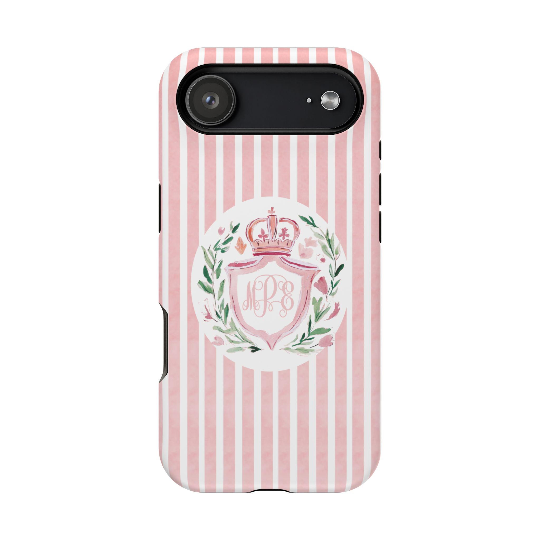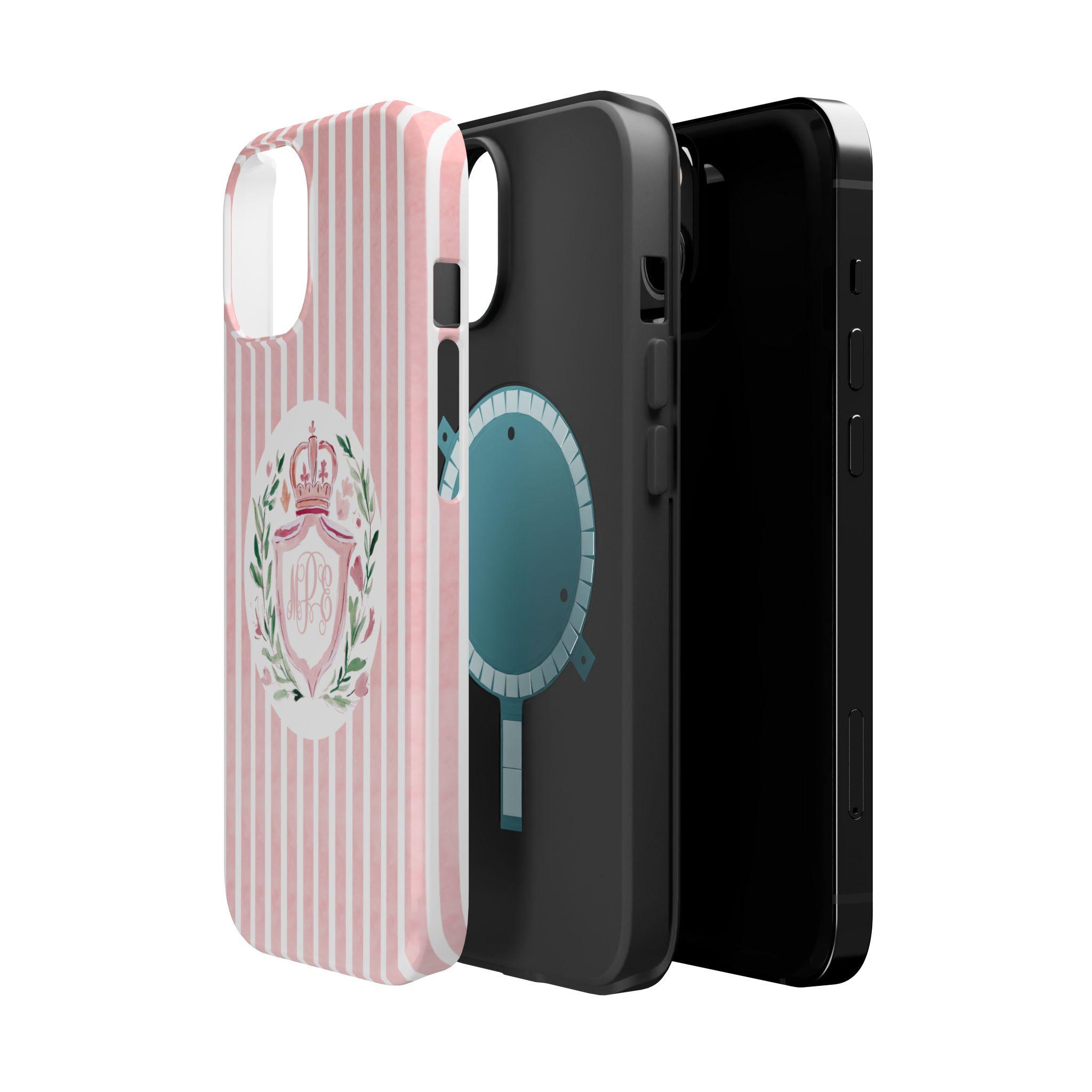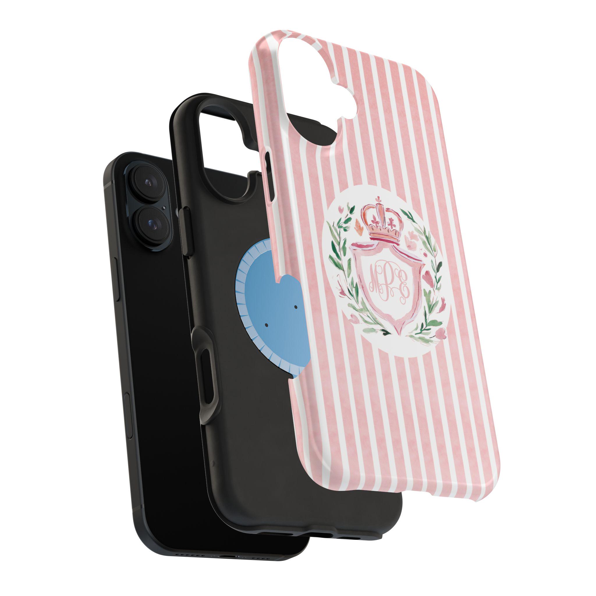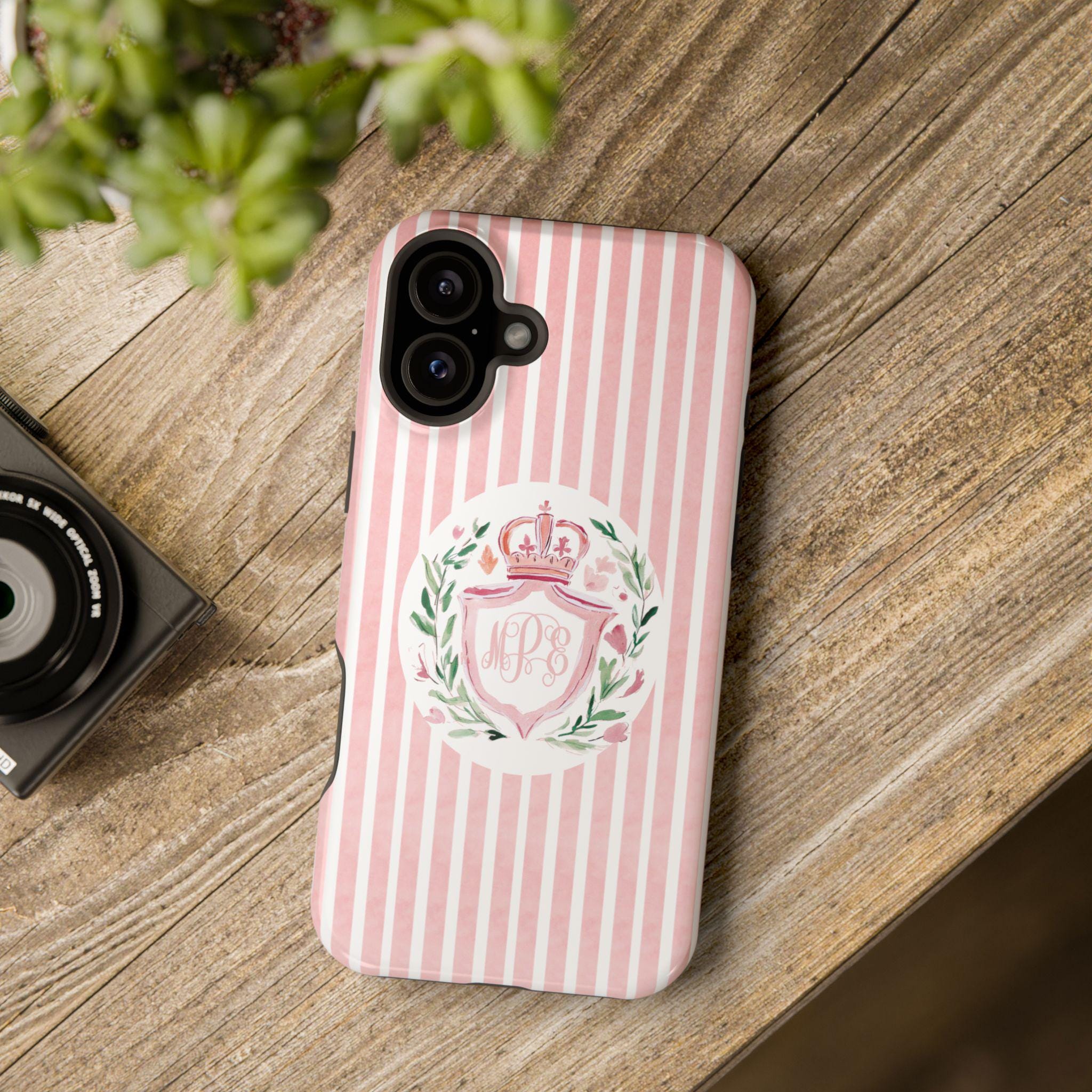 Give your phone a timeless, feminine upgrade with this custom monogram Magnetic phone case featuring a pink vertical-stripe backdrop and a hand-painted watercolor crest crowned with florals. Soft, classic, and beautifully detailed, this design blends heirloom charm with everyday practicality.