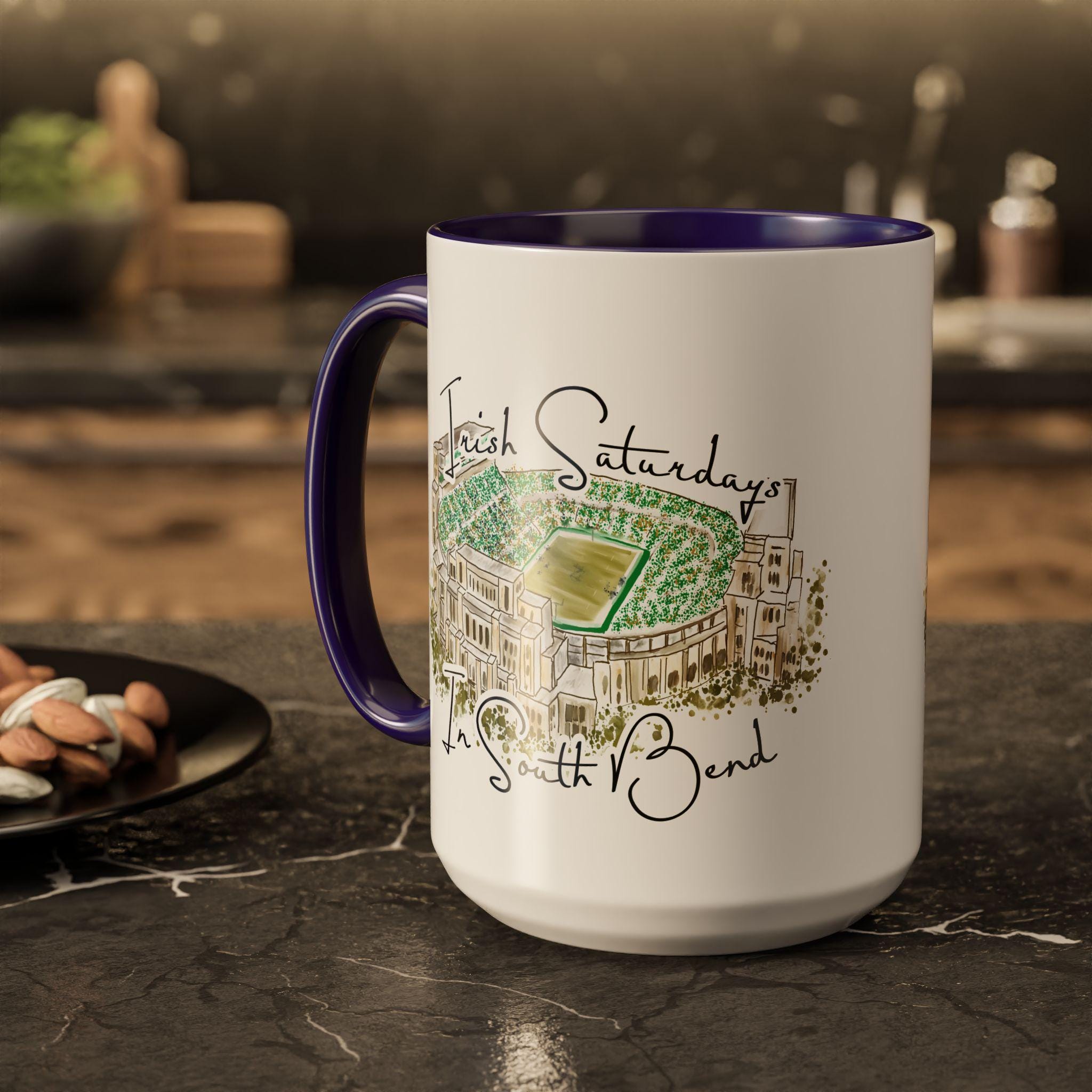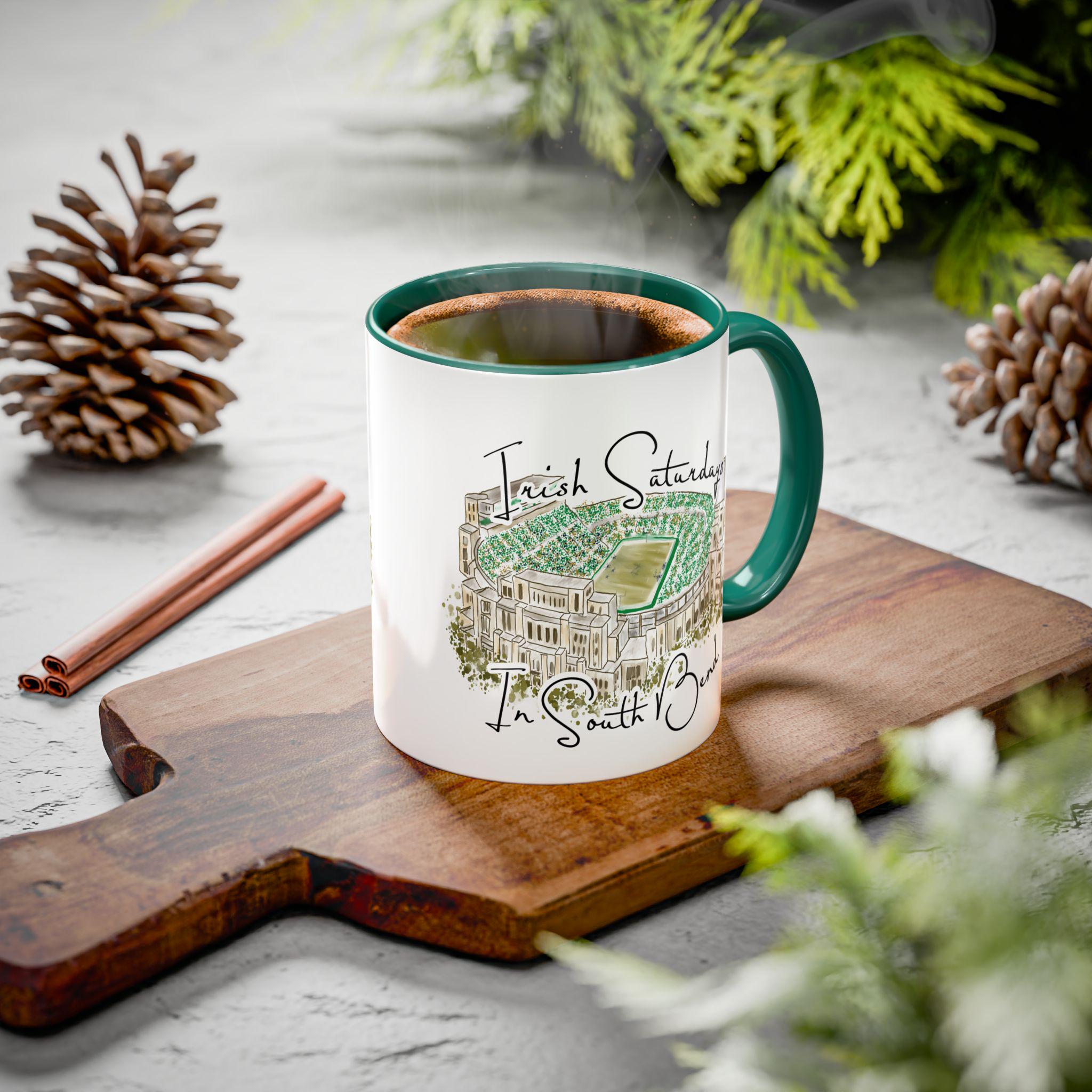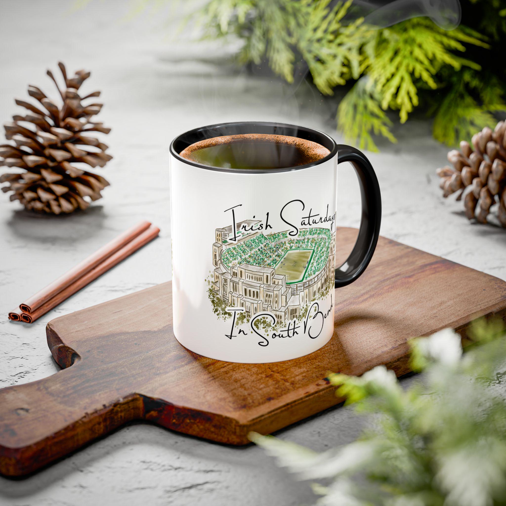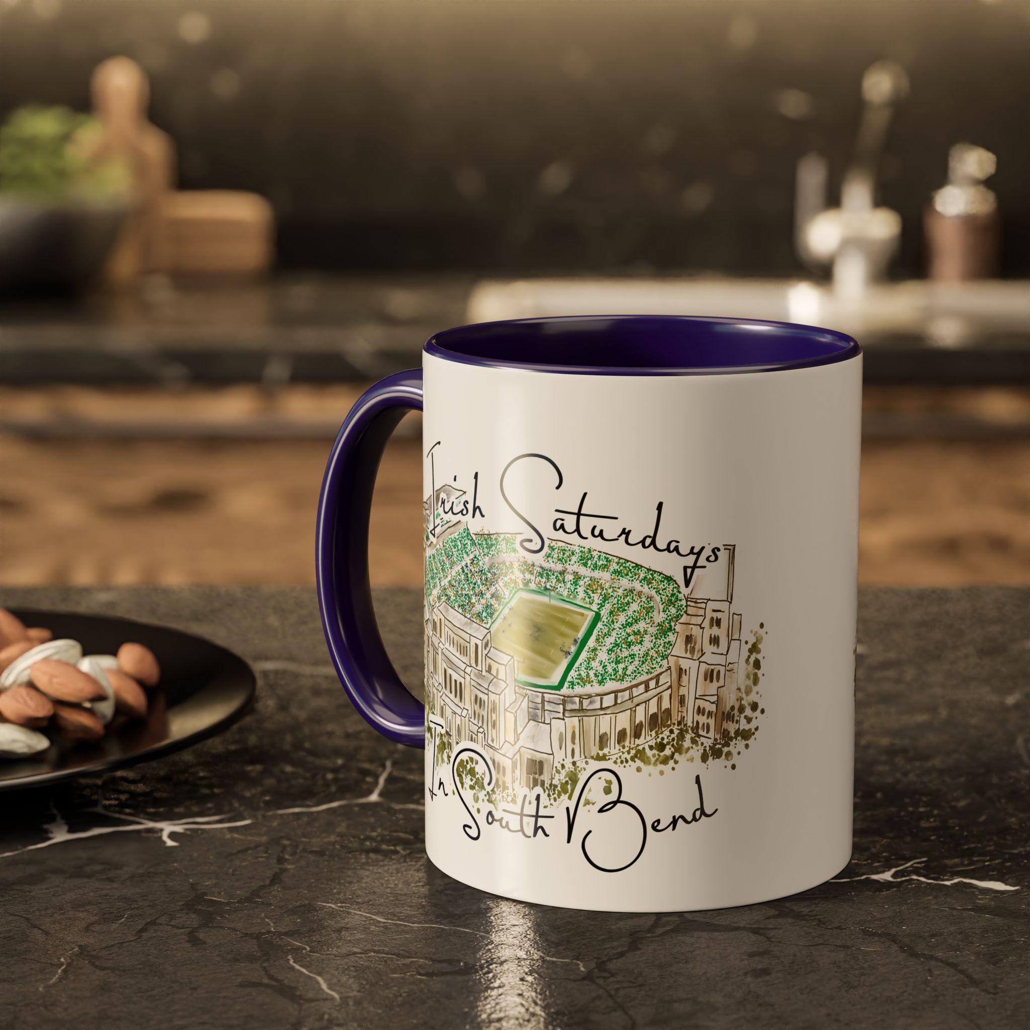 Celebrate the magic of fall weekends in South Bend with this beautifully illustrated mug featuring a hand-drawn rendering of the iconic stadium and the phrase “Irish Saturdays in South Bend.” Perfect for alumni, fans, students, or anyone who loves the tradition and excitement of game day, this mug blends artistry with school-town nostalgia.
