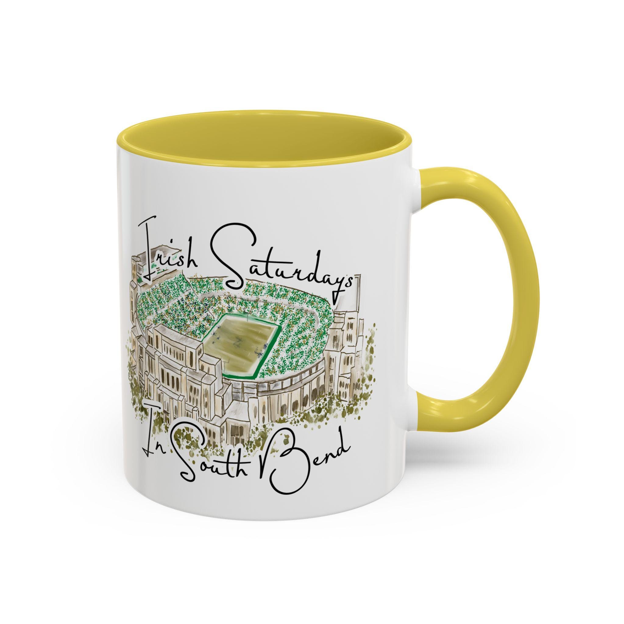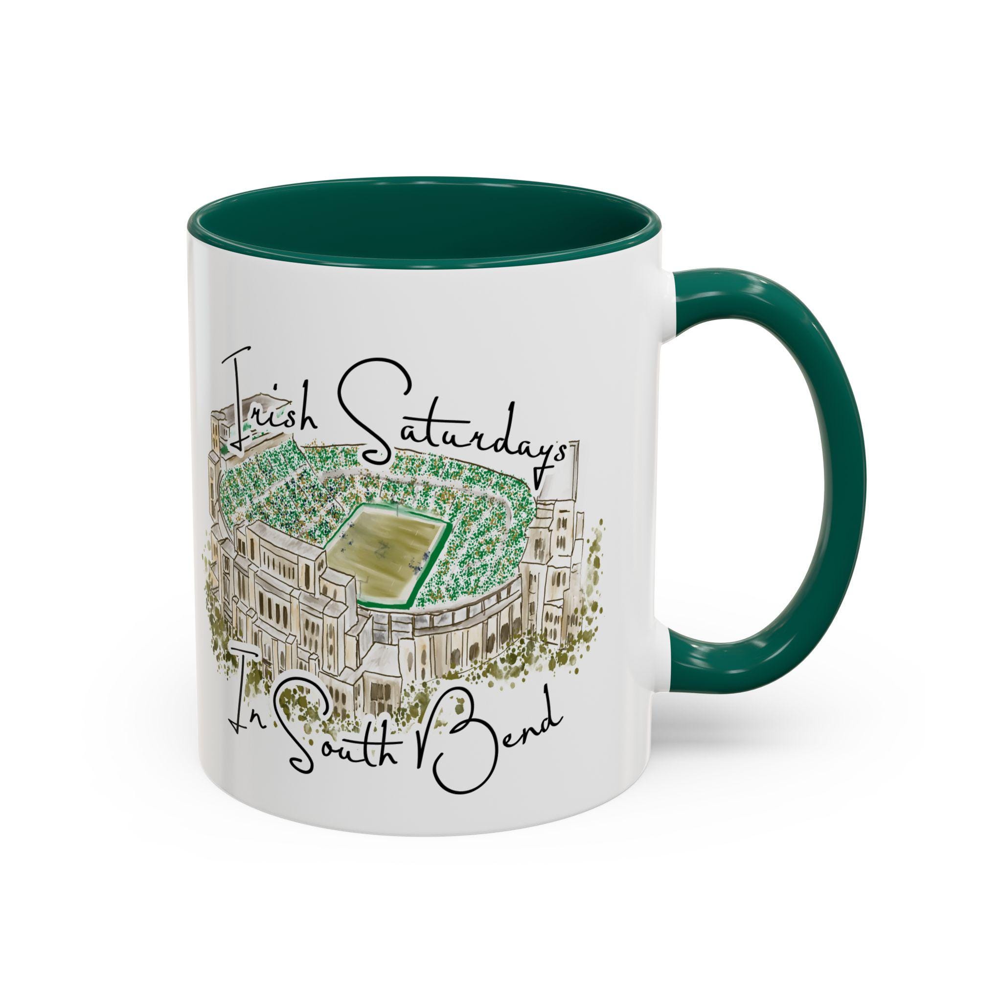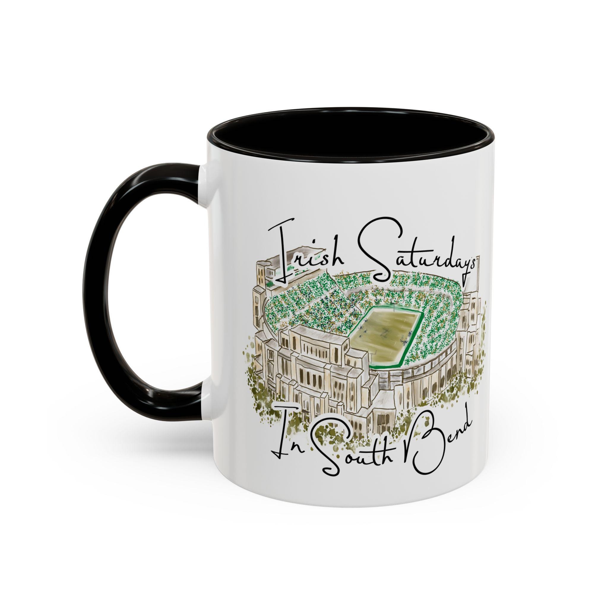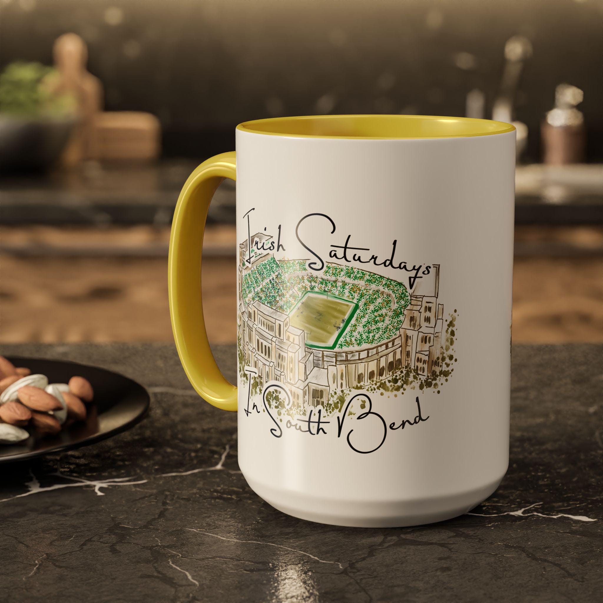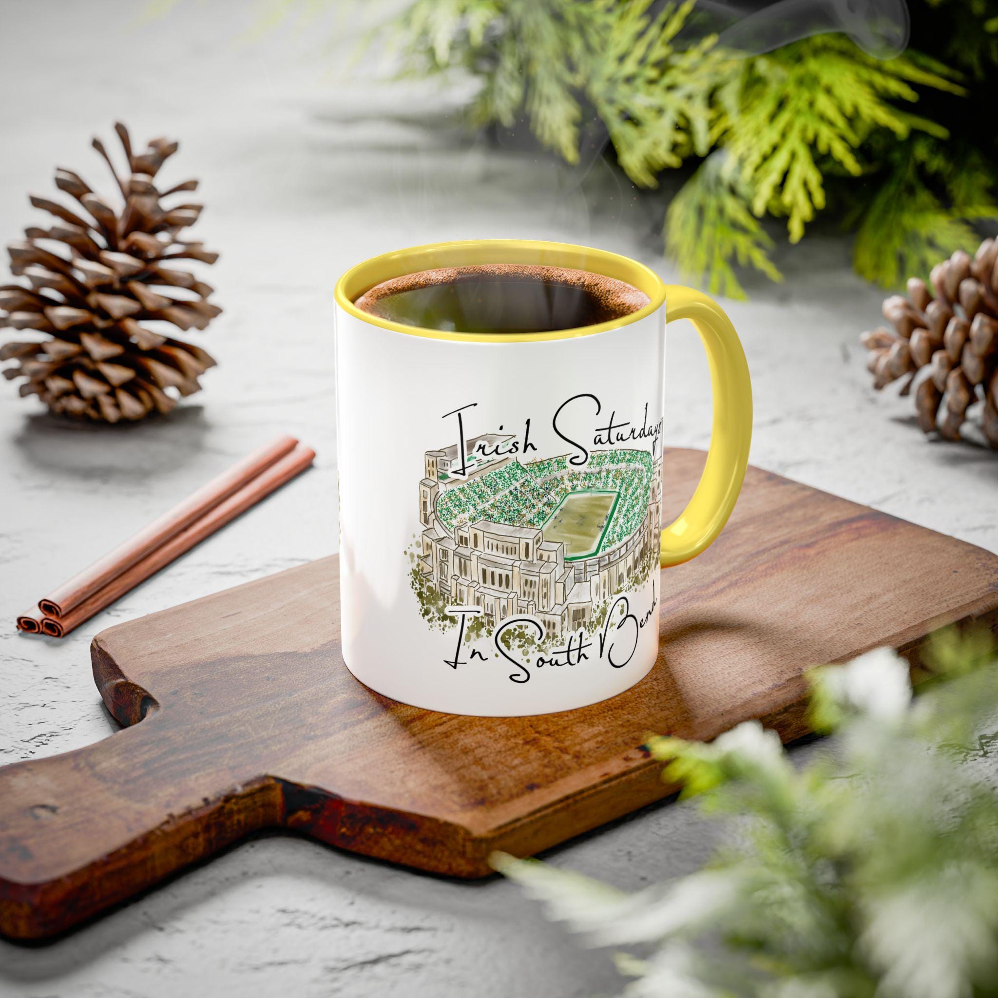 Celebrate the magic of fall weekends in South Bend with this beautifully illustrated mug featuring a hand-drawn rendering of the iconic stadium and the phrase “Irish Saturdays in South Bend.” Perfect for alumni, fans, students, or anyone who loves the tradition and excitement of game day, this mug blends artistry with school-town nostalgia.