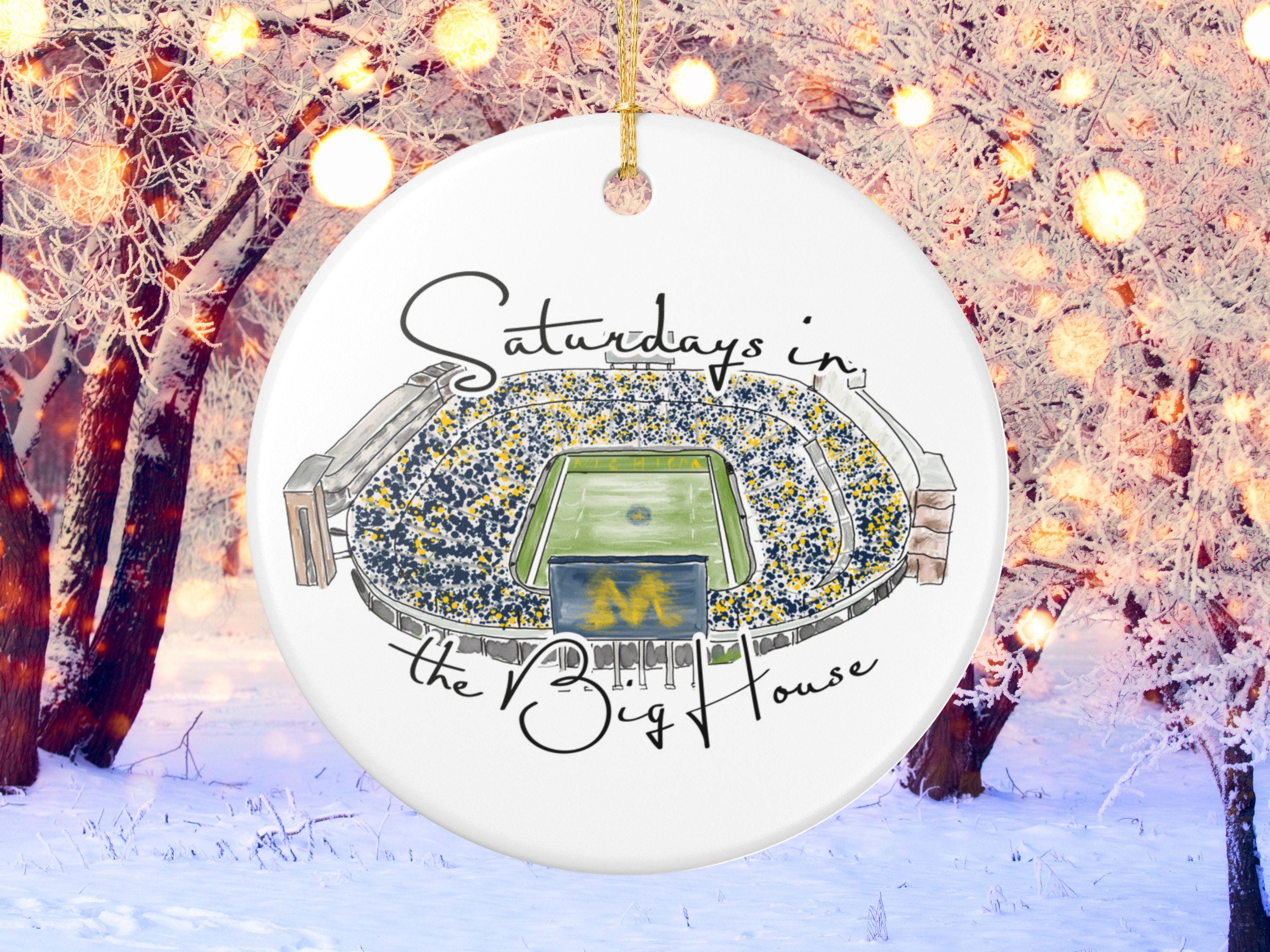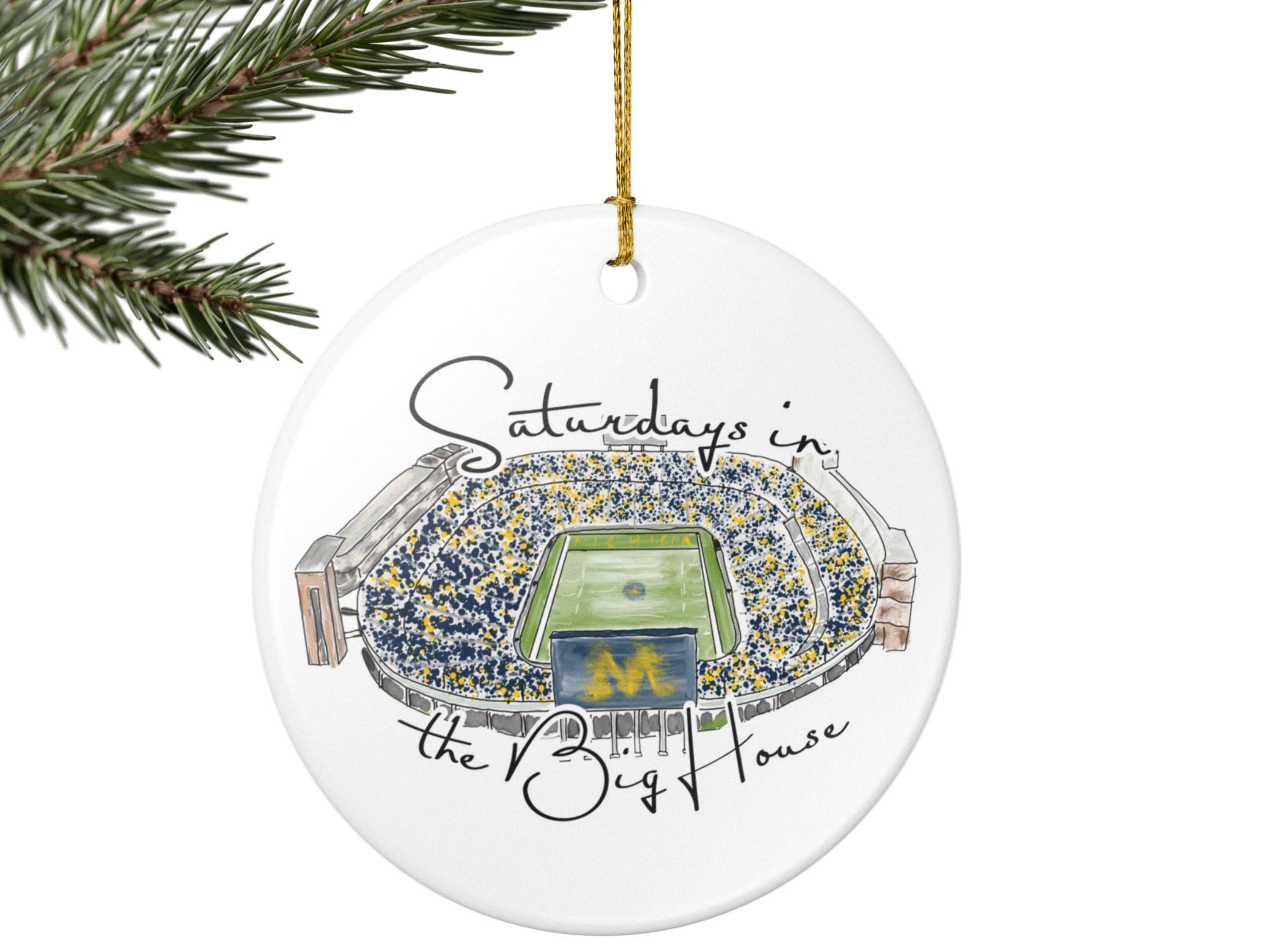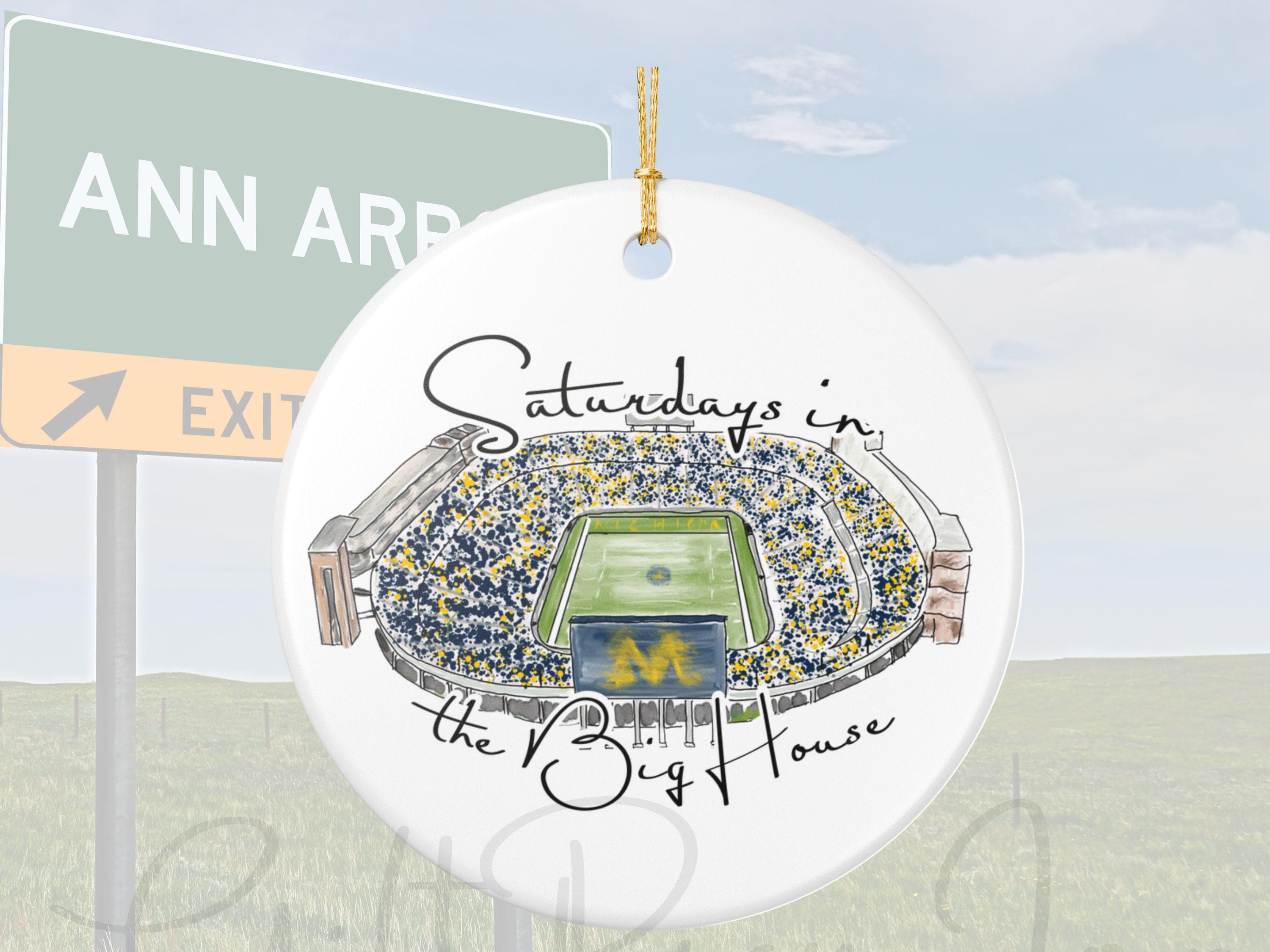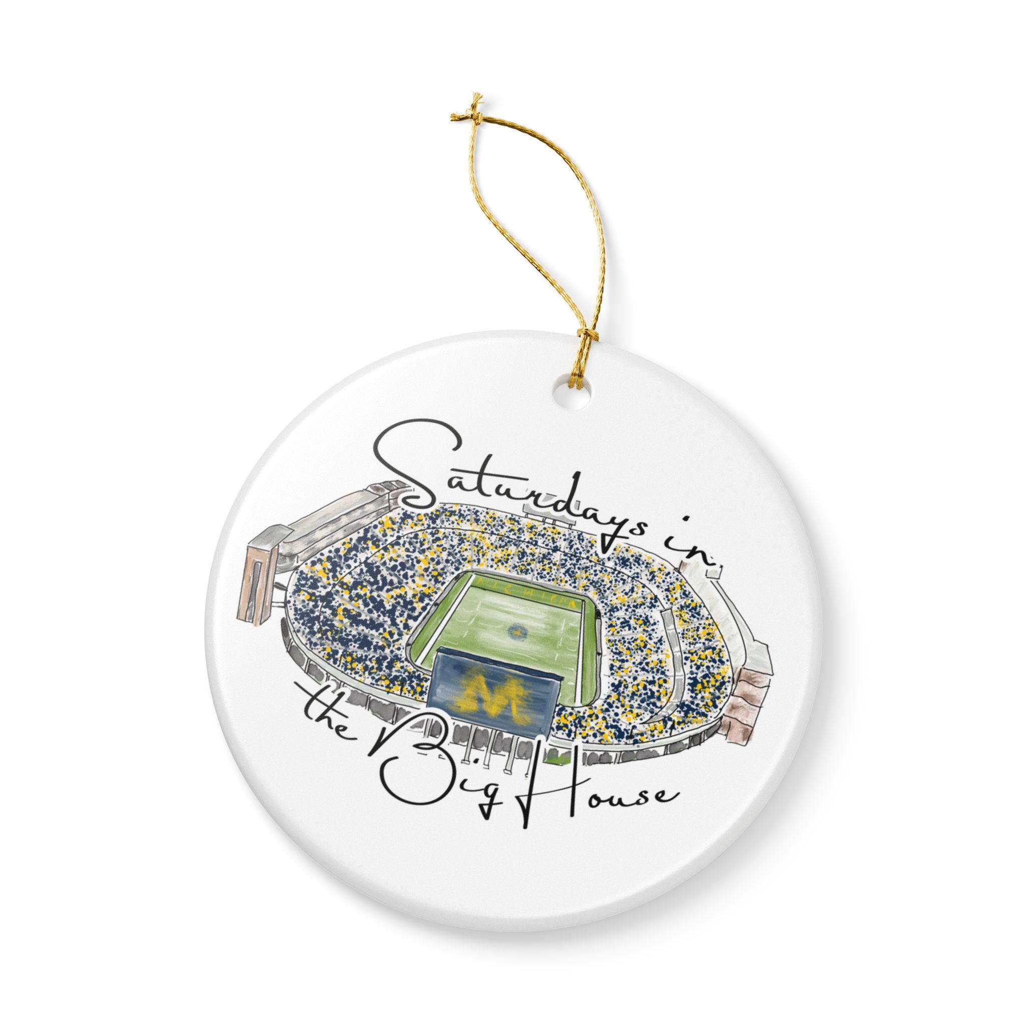 Celebrate the magic of game day in Ann Arbor with this matte ceramic ornament featuring a handcrafted watercolor illustration of Michigan Stadium and the phrase “Saturdays in the Big House.” Designed for fans who cherish the tradition and excitement of fall Saturdays, this ornament makes a meaningful keepsake for any Michigan supporter.