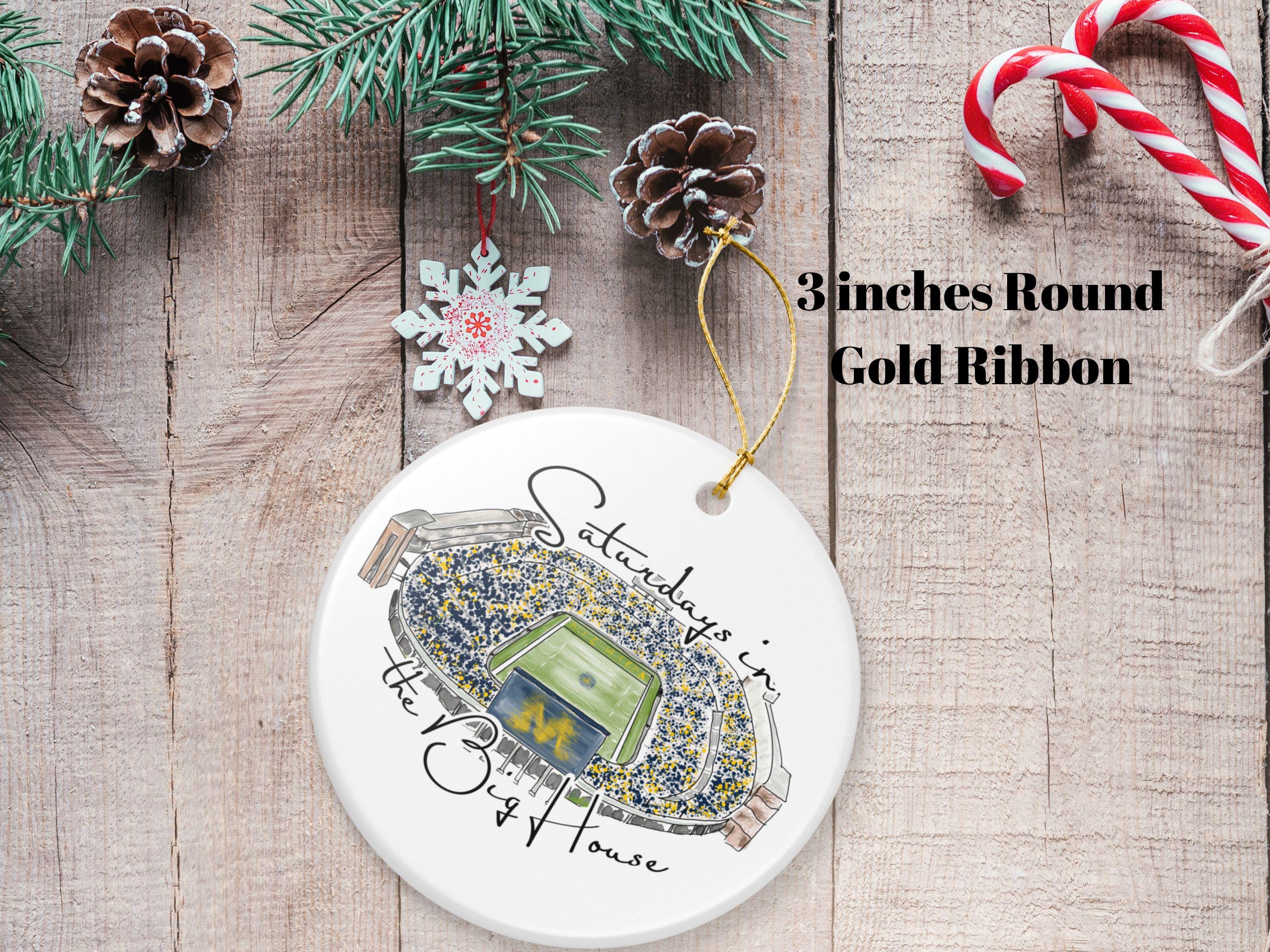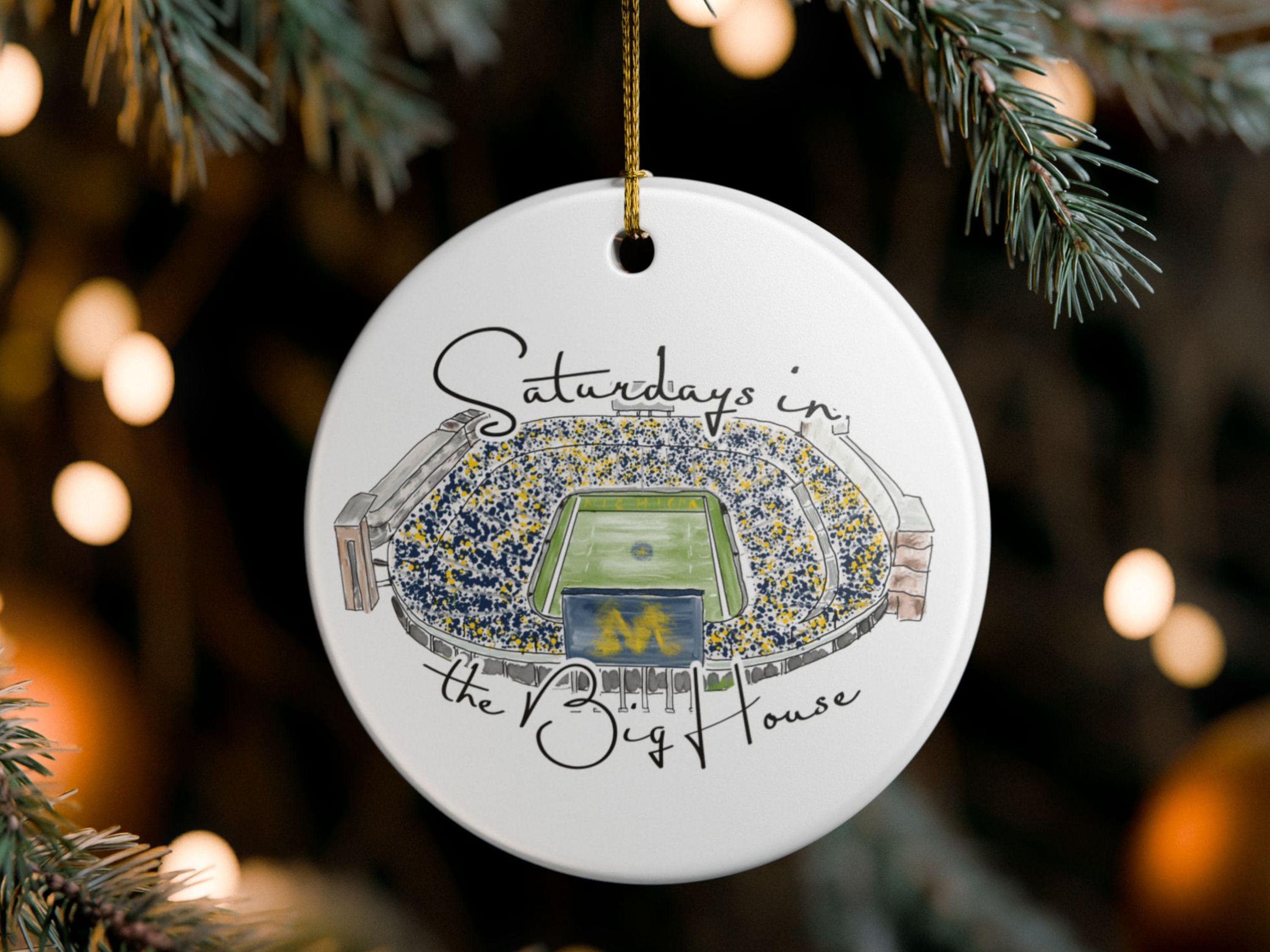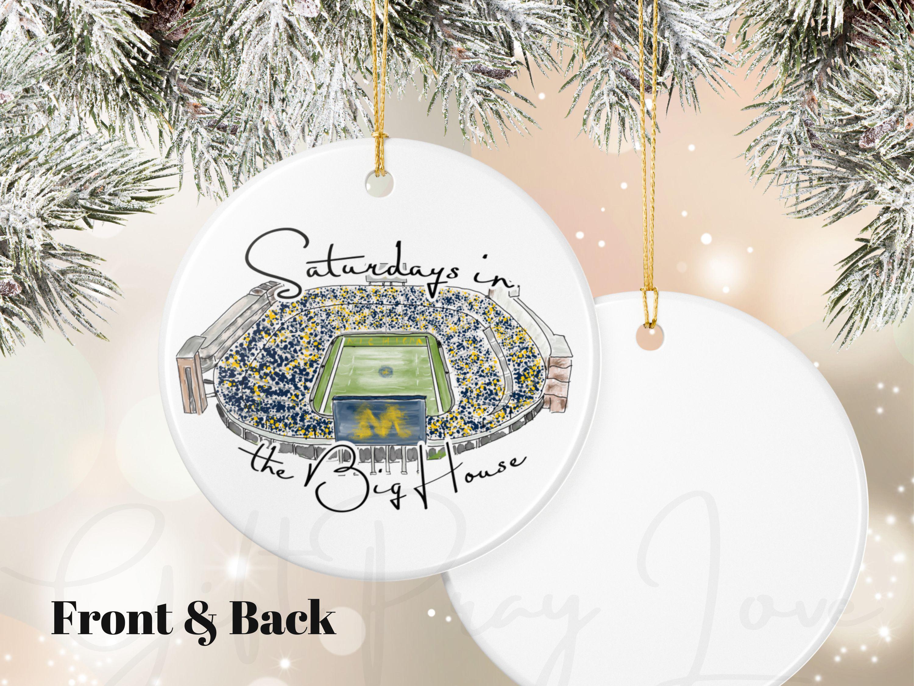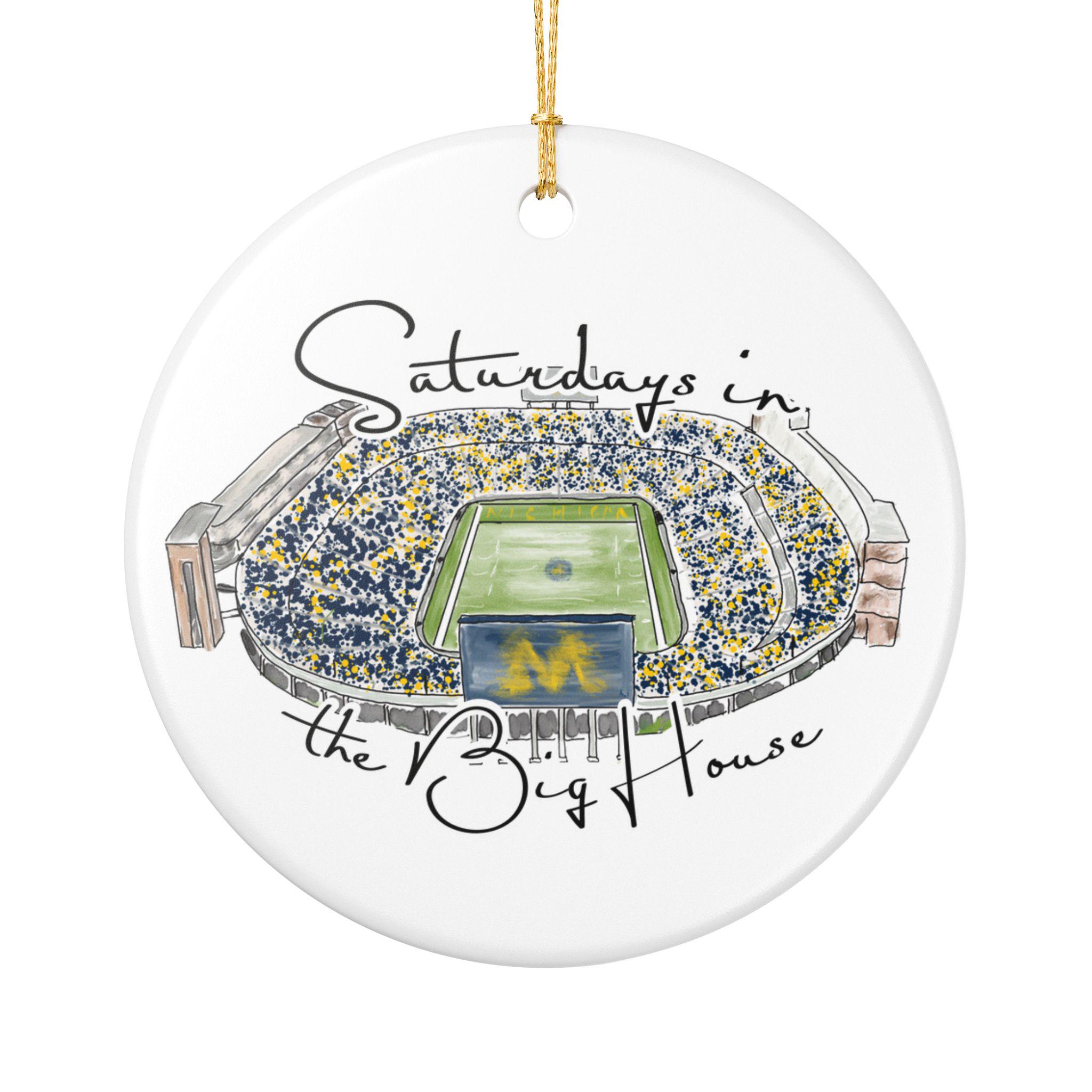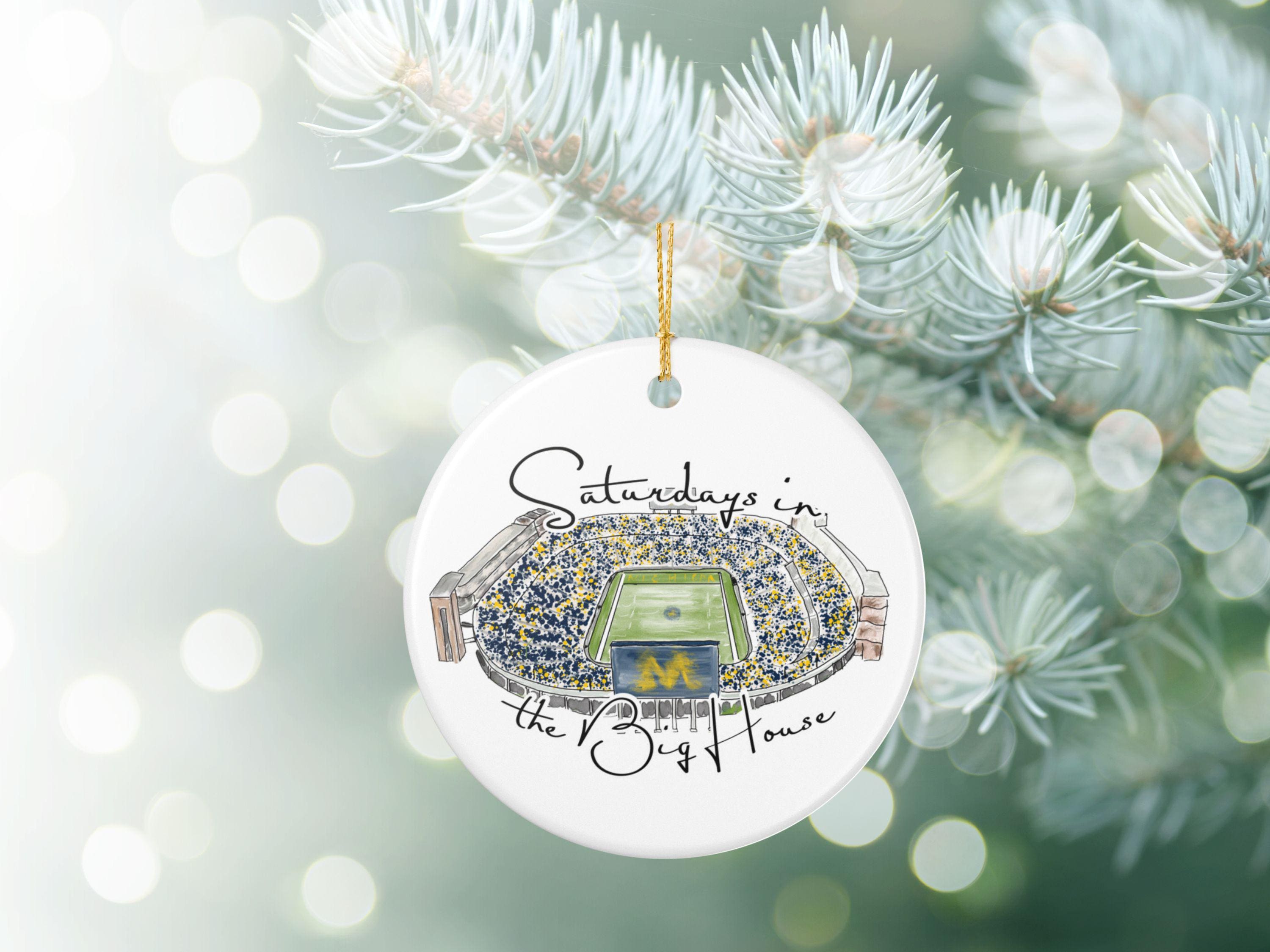 Celebrate the magic of game day in Ann Arbor with this matte ceramic ornament featuring a handcrafted watercolor illustration of Michigan Stadium and the phrase “Saturdays in the Big House.” Designed for fans who cherish the tradition and excitement of fall Saturdays, this ornament makes a meaningful keepsake for any Michigan supporter.