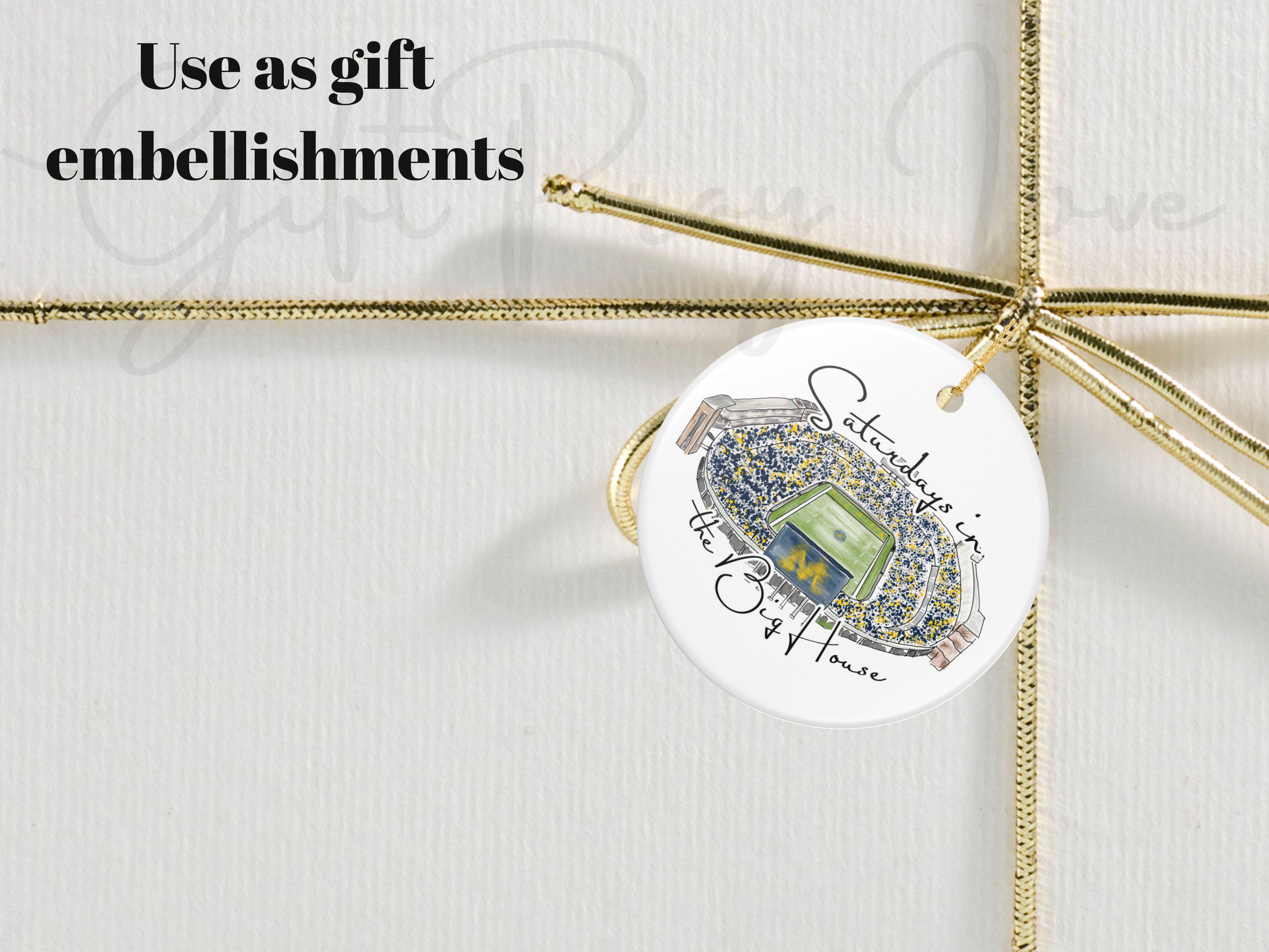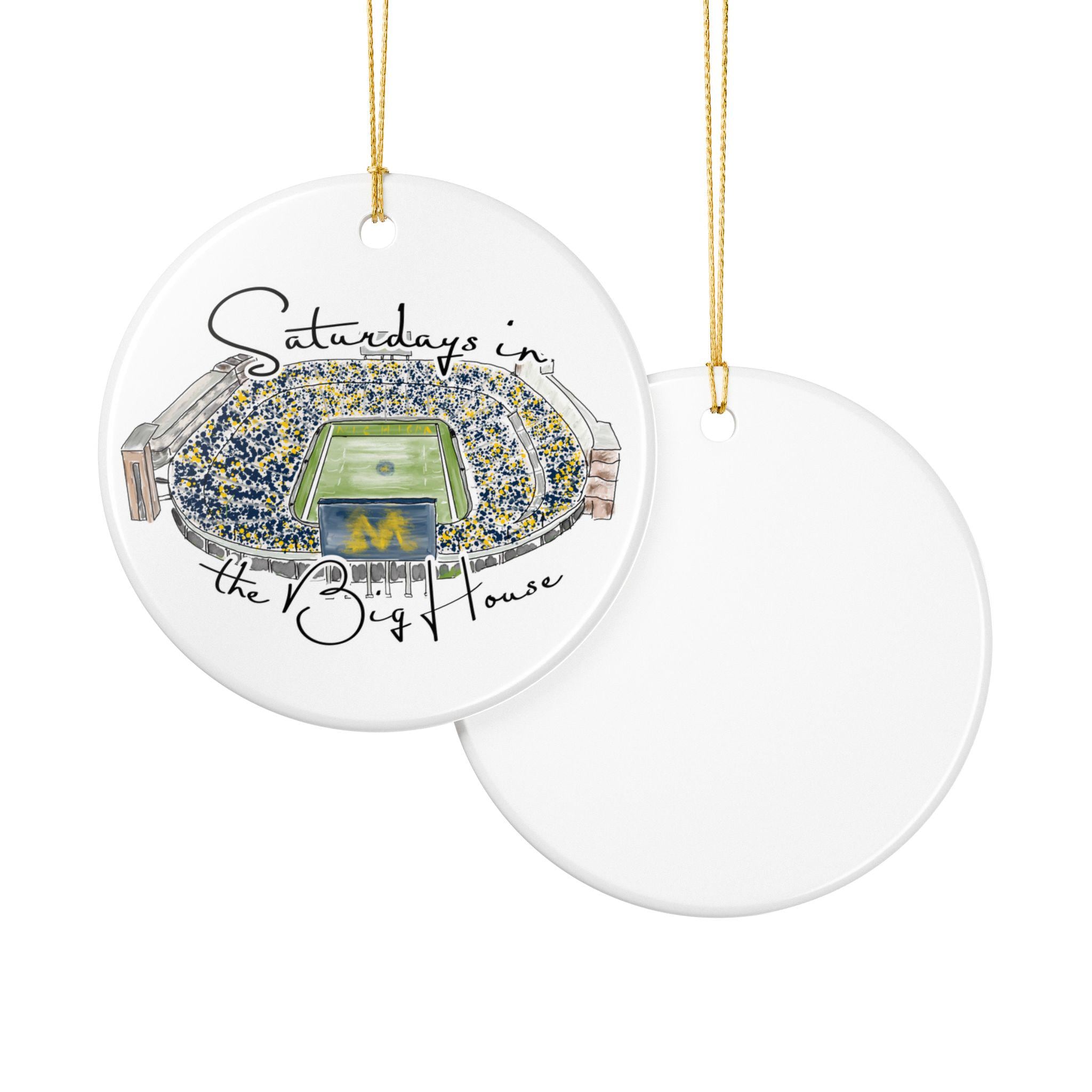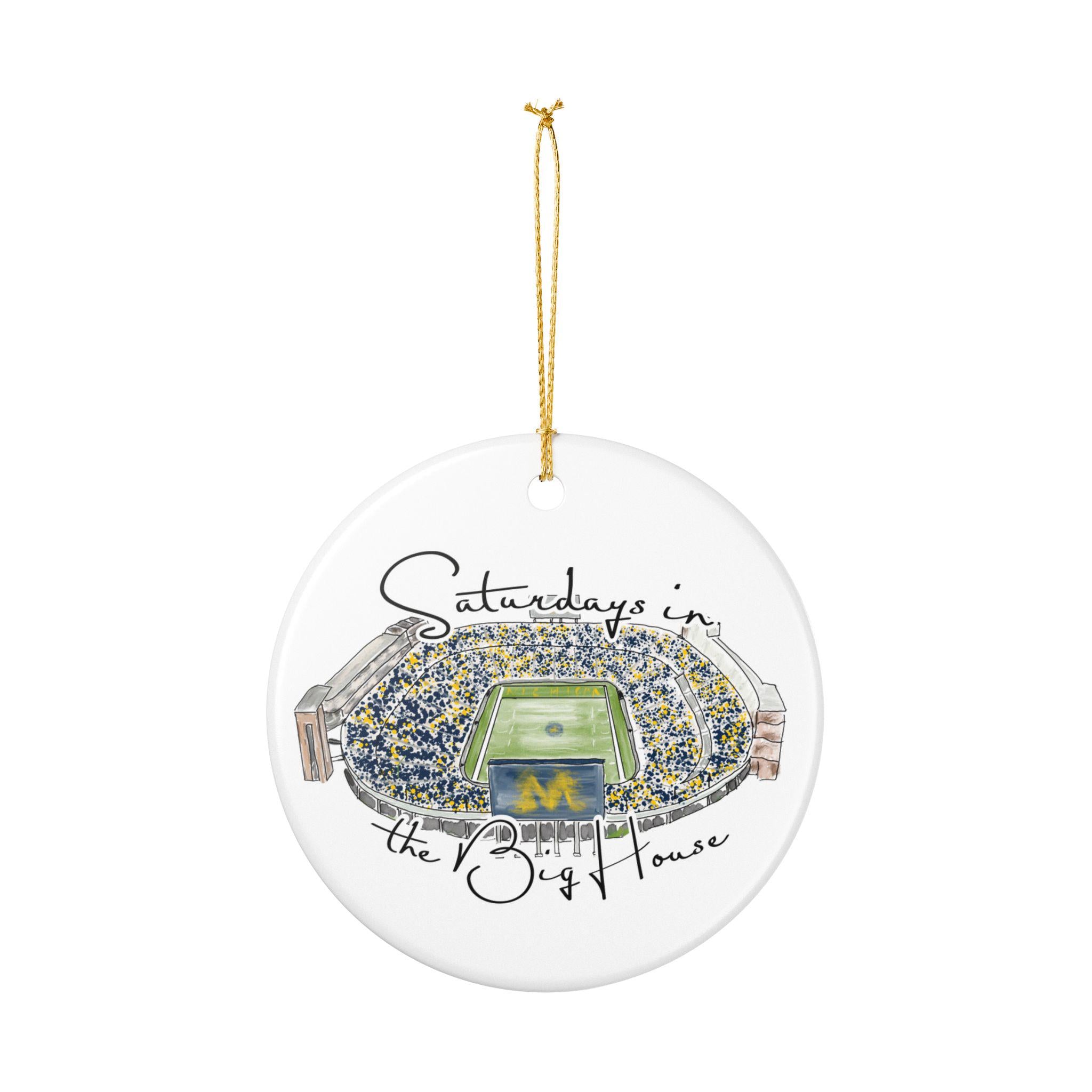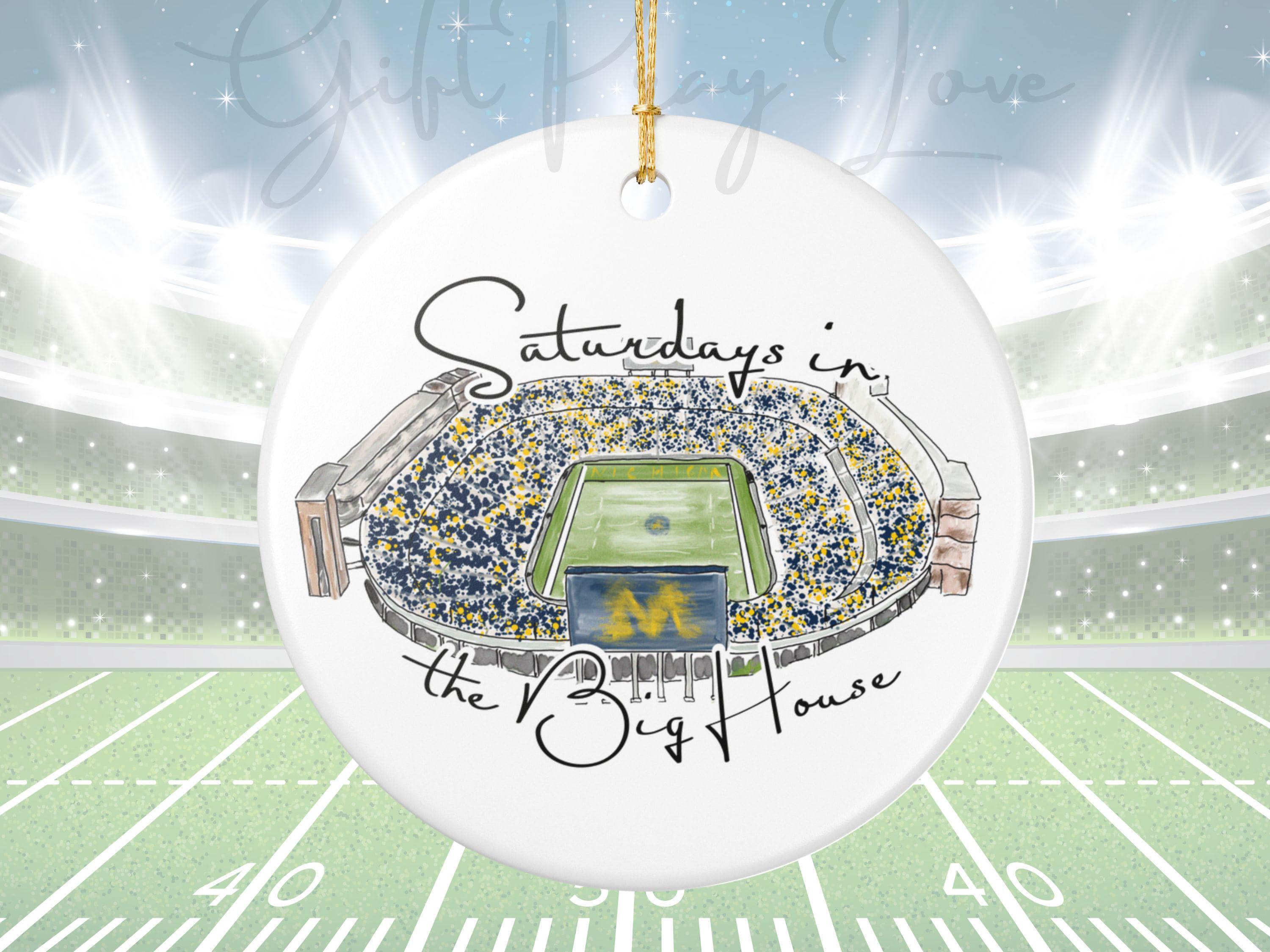 Celebrate the magic of game day in Ann Arbor with this matte ceramic ornament featuring a handcrafted watercolor illustration of Michigan Stadium and the phrase “Saturdays in the Big House.” Designed for fans who cherish the tradition and excitement of fall Saturdays, this ornament makes a meaningful keepsake for any Michigan supporter.