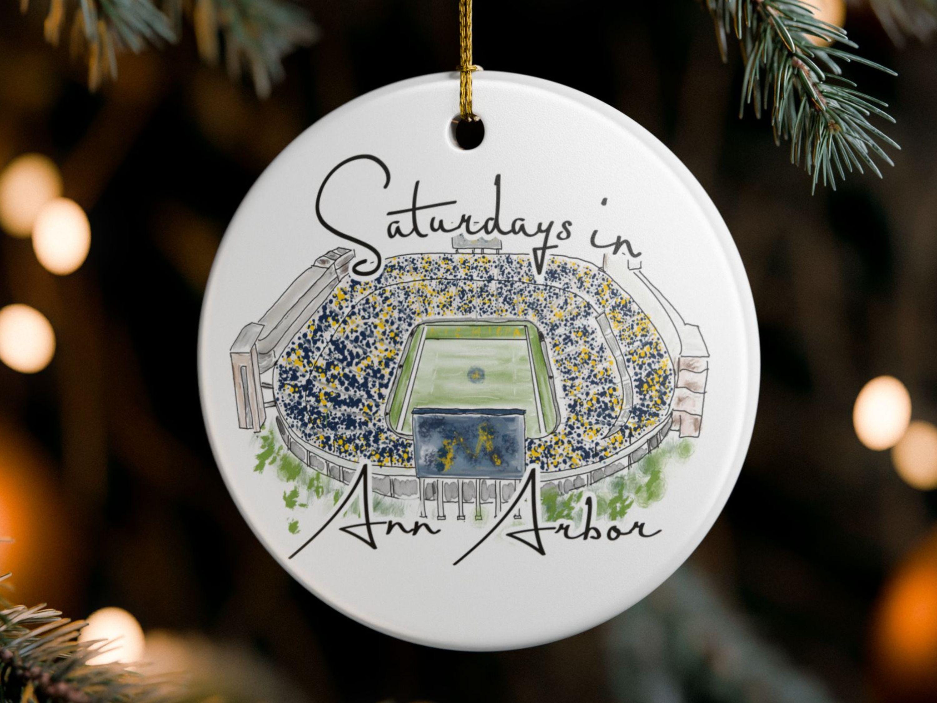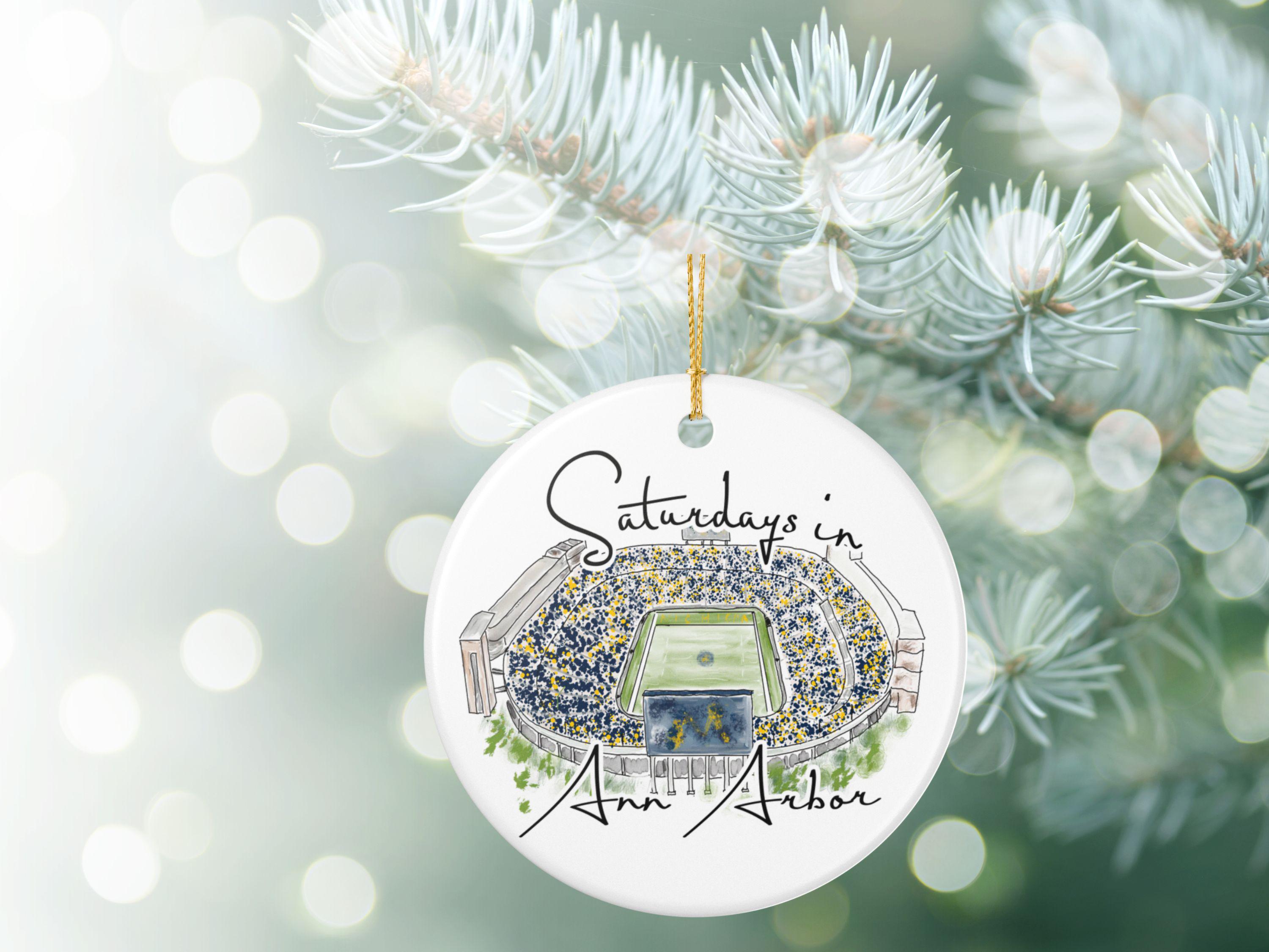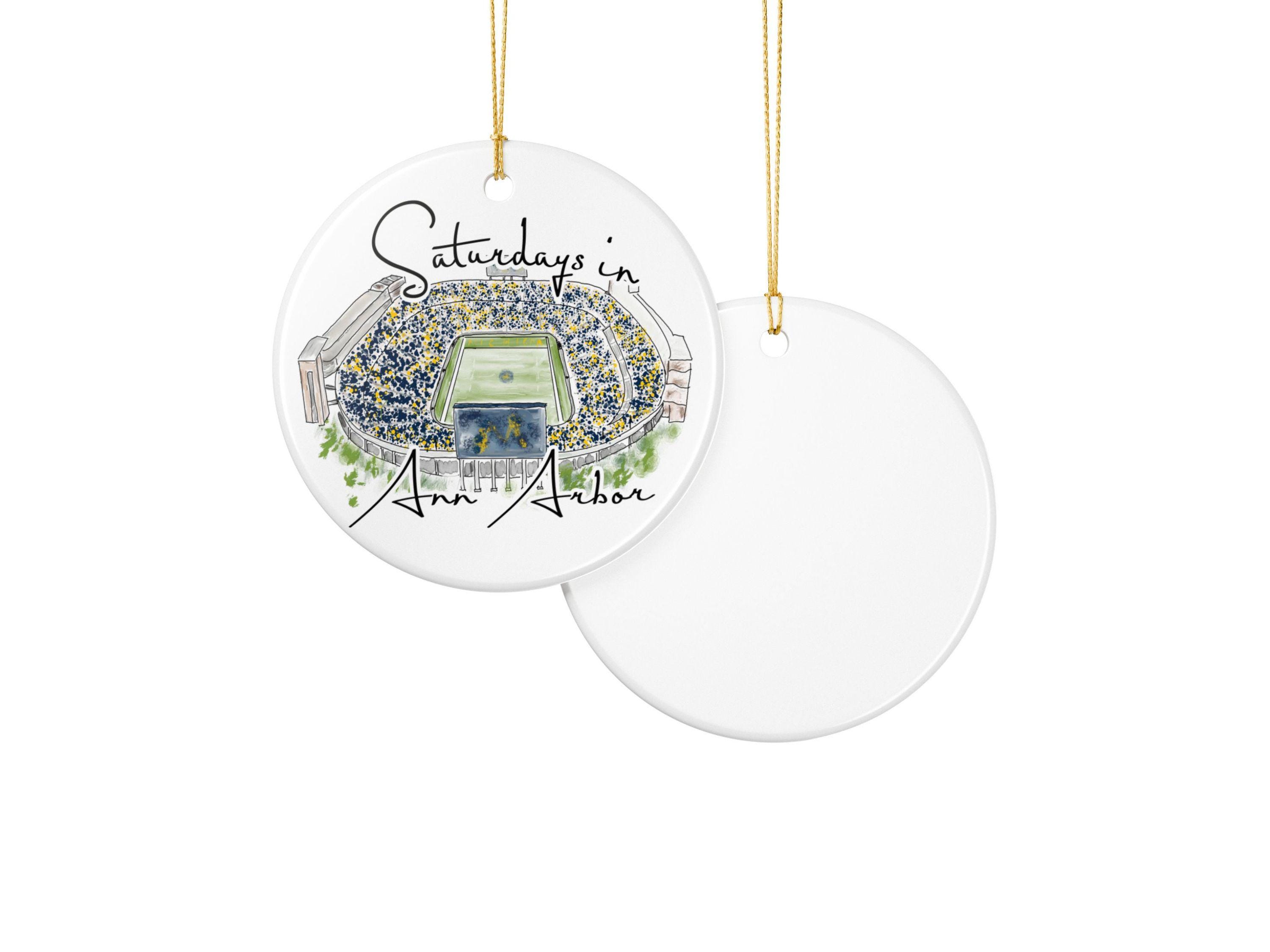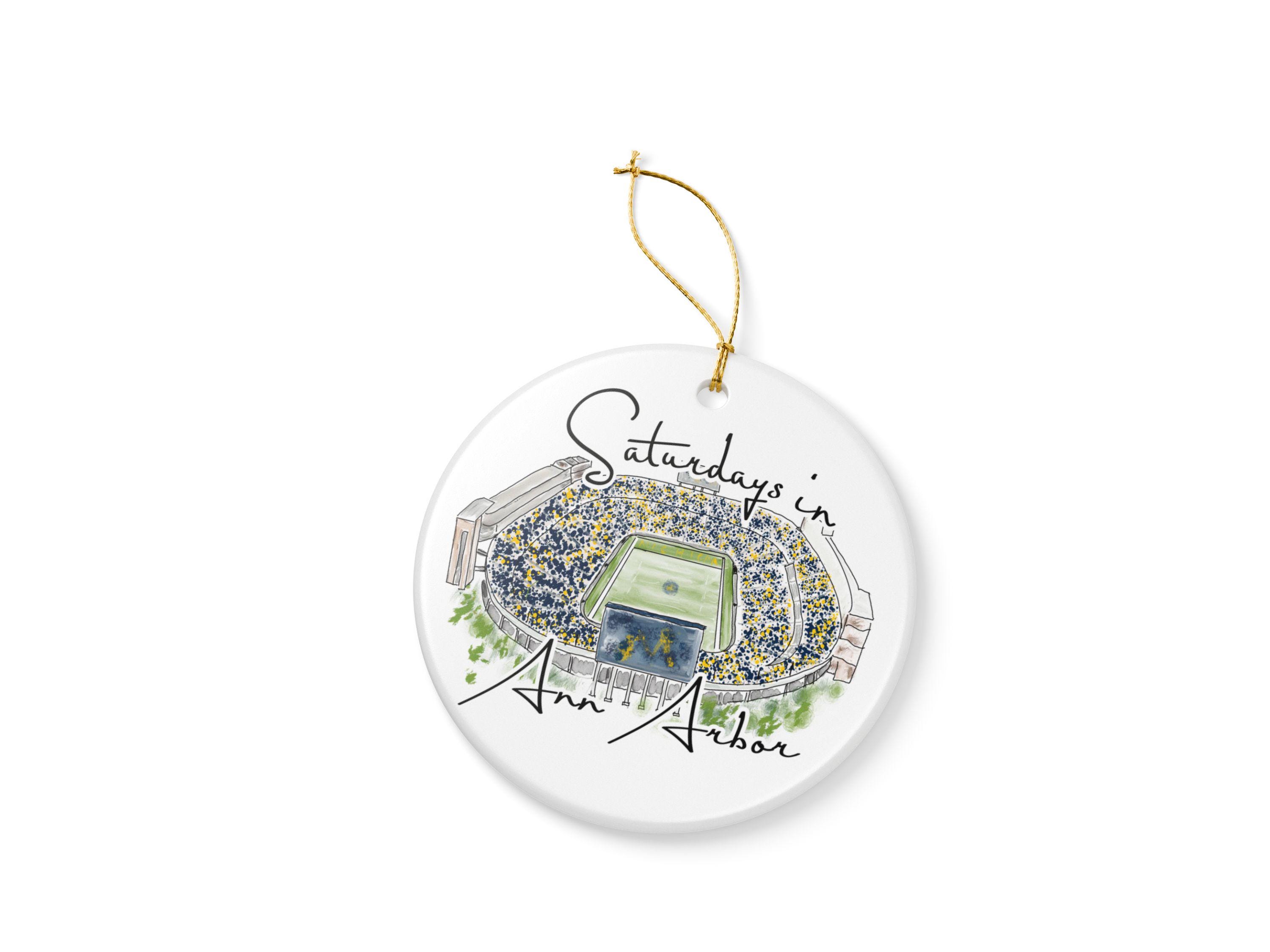 Celebrate the magic of game day in Ann Arbor with this matte ceramic ornament featuring a handcrafted watercolor illustration of Michigan Stadium and the phrase “Saturdays in Ann Arbor.” Designed for fans who cherish the tradition and excitement of fall Saturdays, this ornament makes a meaningful keepsake for any Michigan supporter.