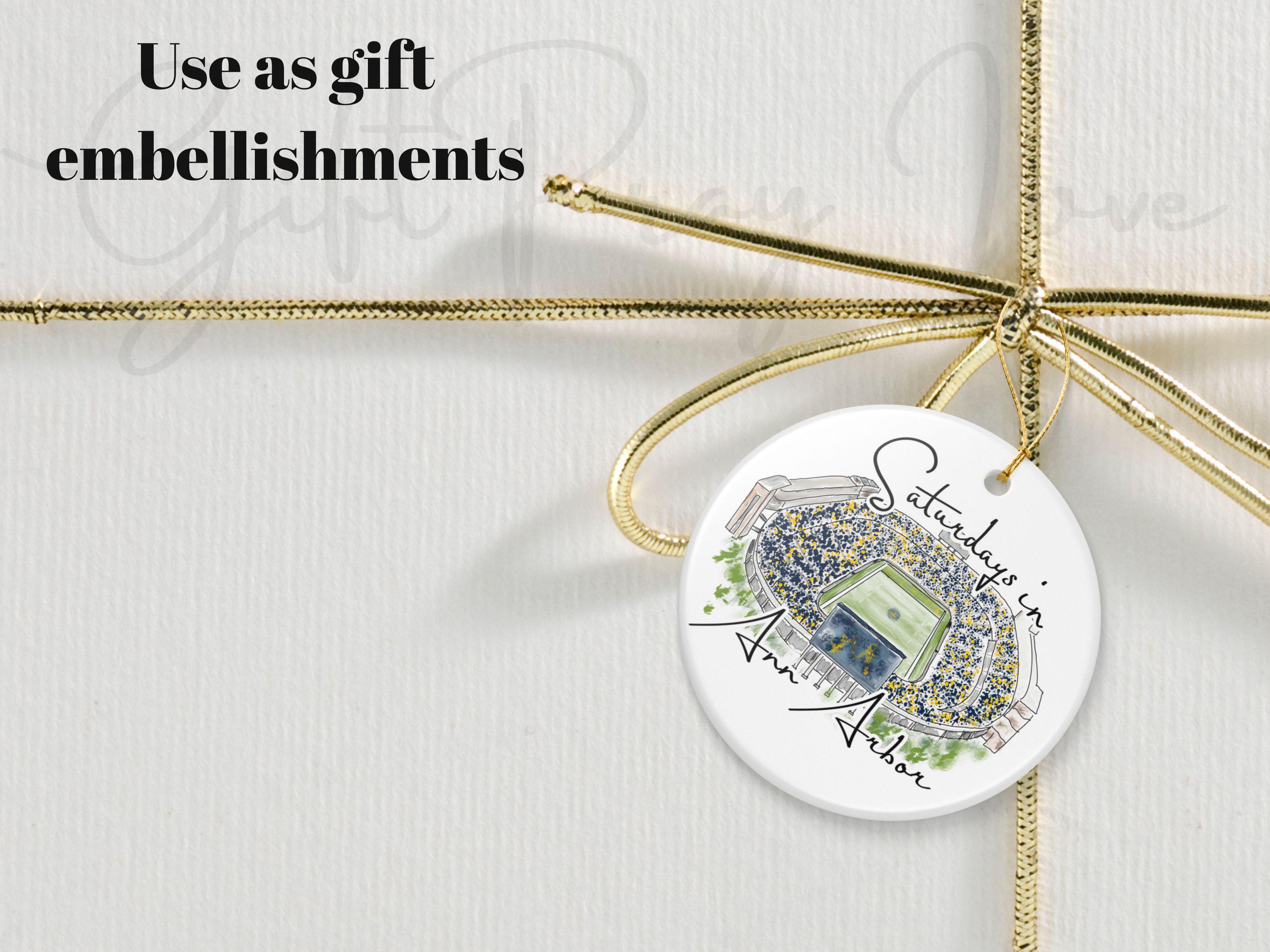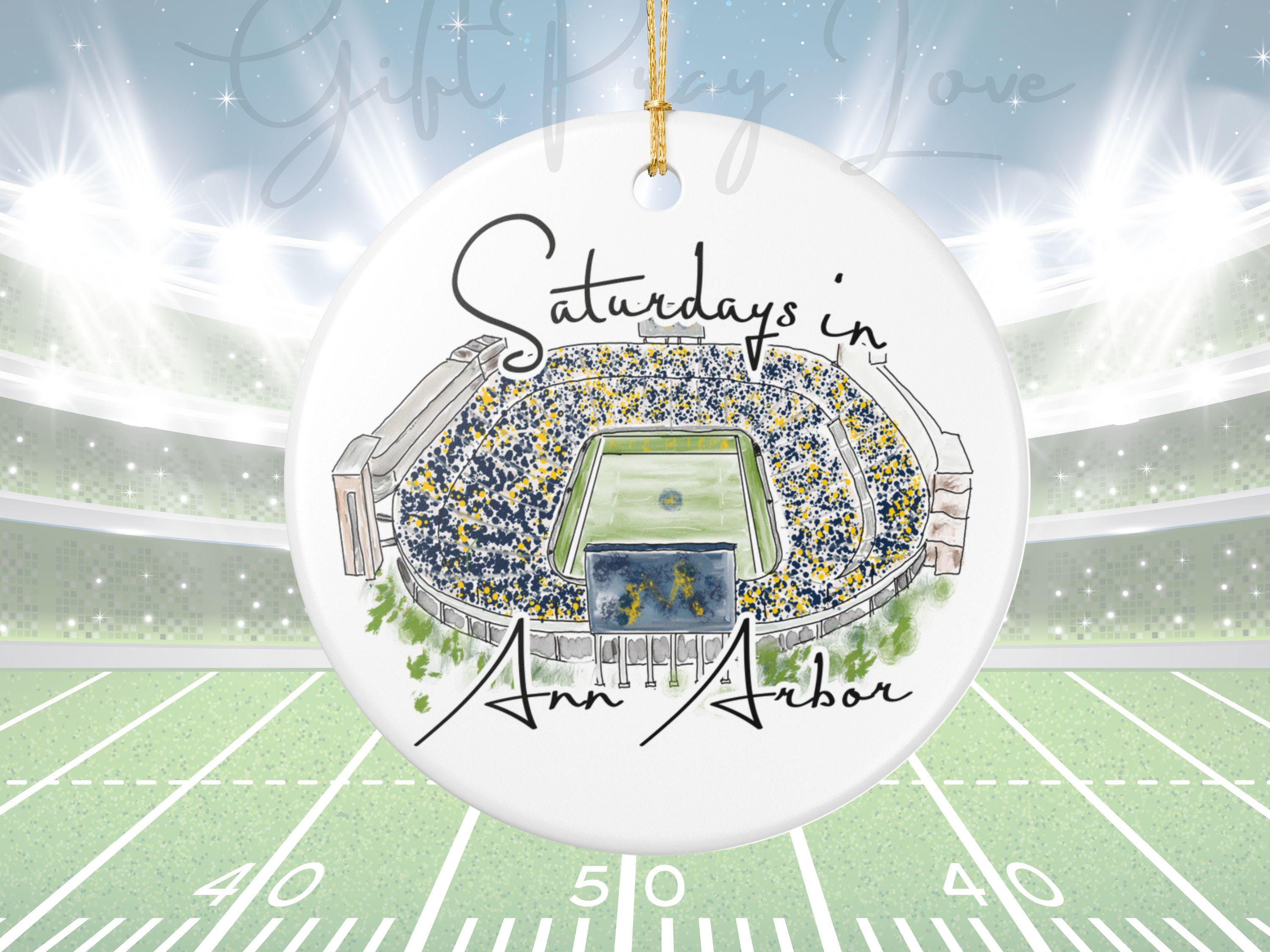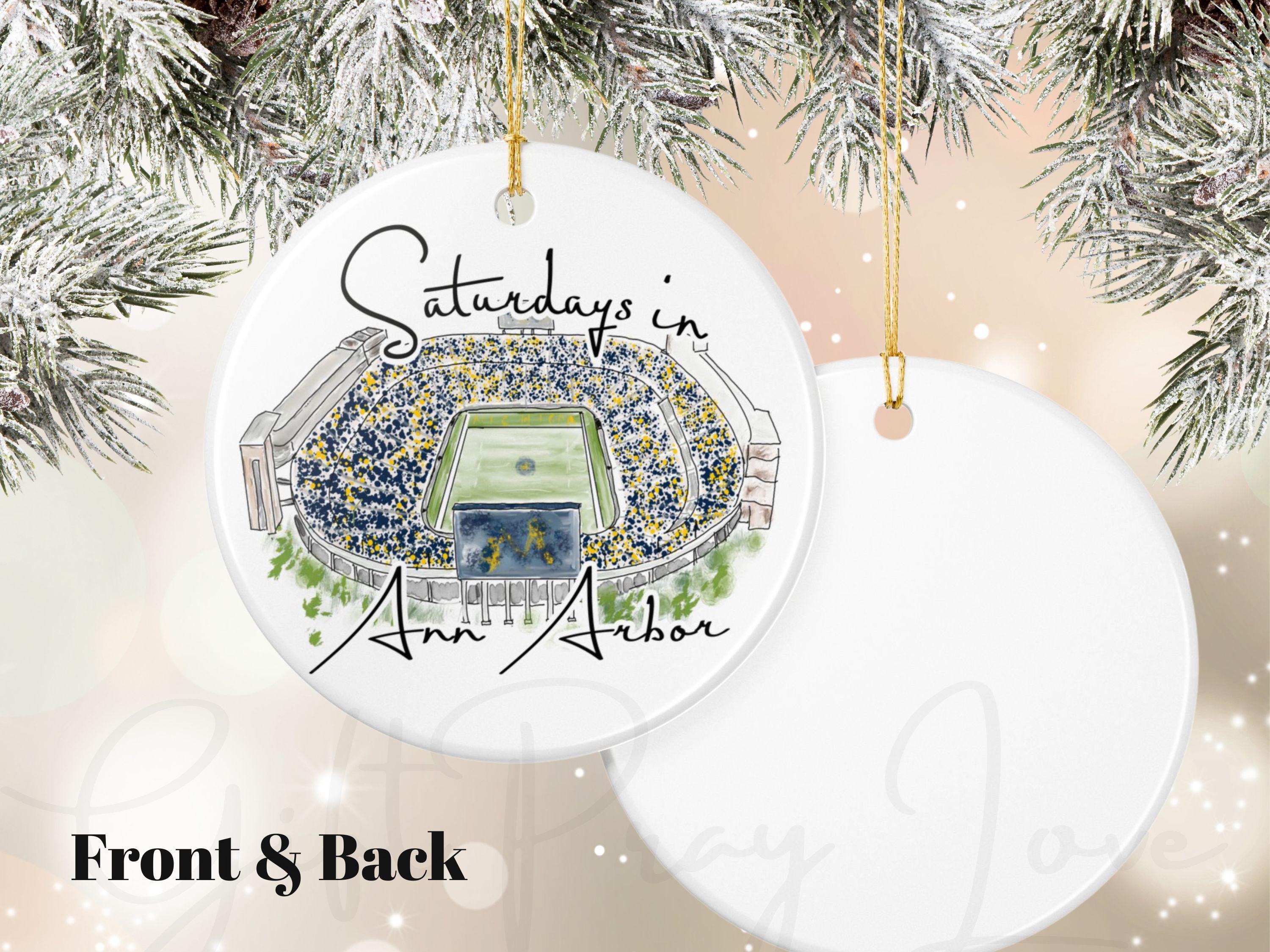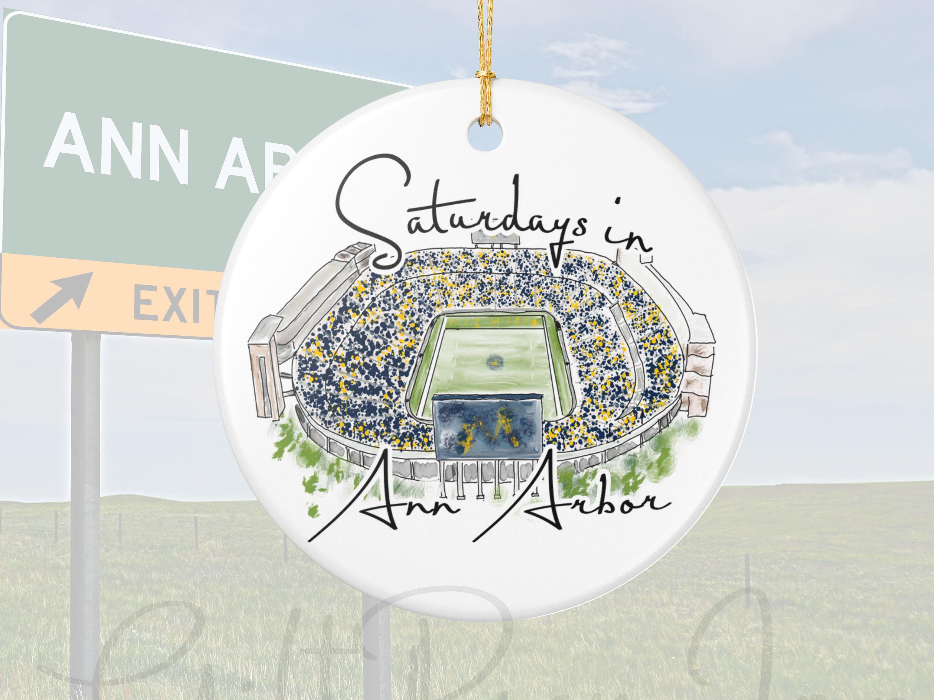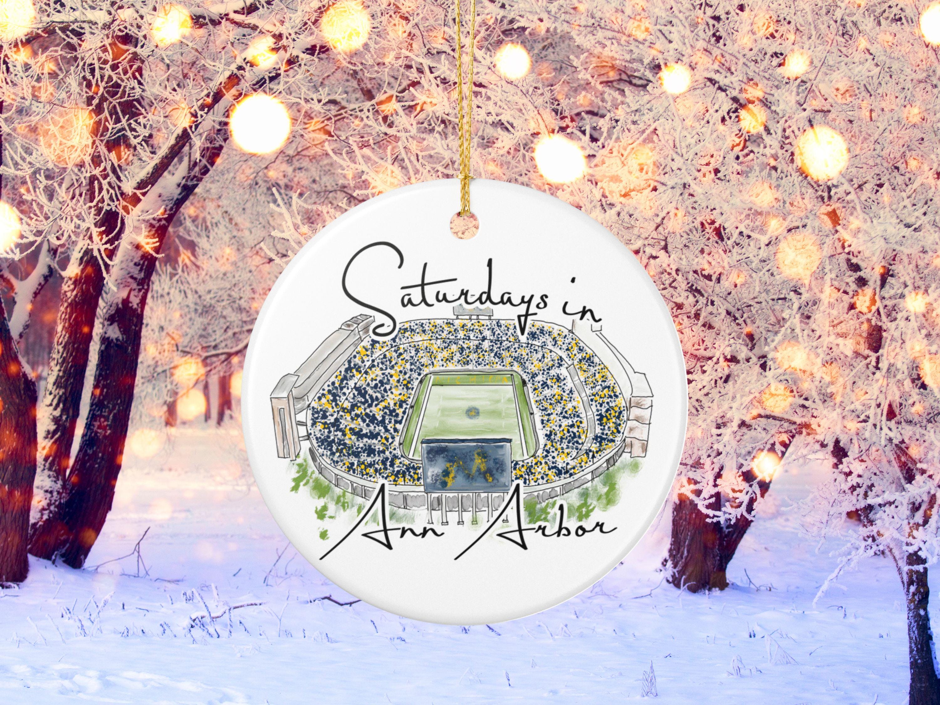Celebrate the magic of game day in Ann Arbor with this matte ceramic ornament featuring a handcrafted watercolor illustration of Michigan Stadium and the phrase “Saturdays in Ann Arbor.” Designed for fans who cherish the tradition and excitement of fall Saturdays, this ornament makes a meaningful keepsake for any Michigan supporter.