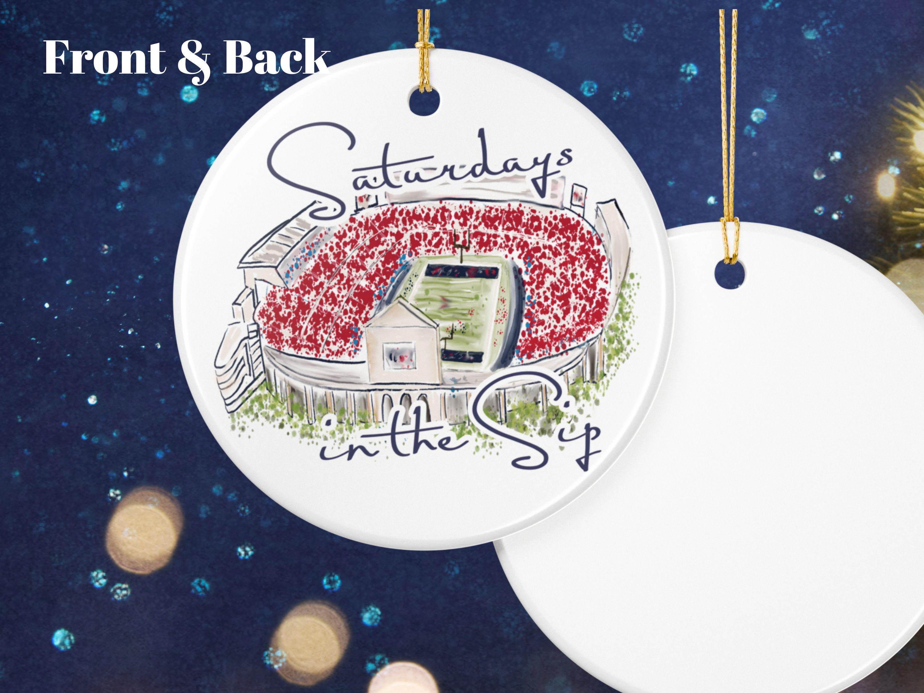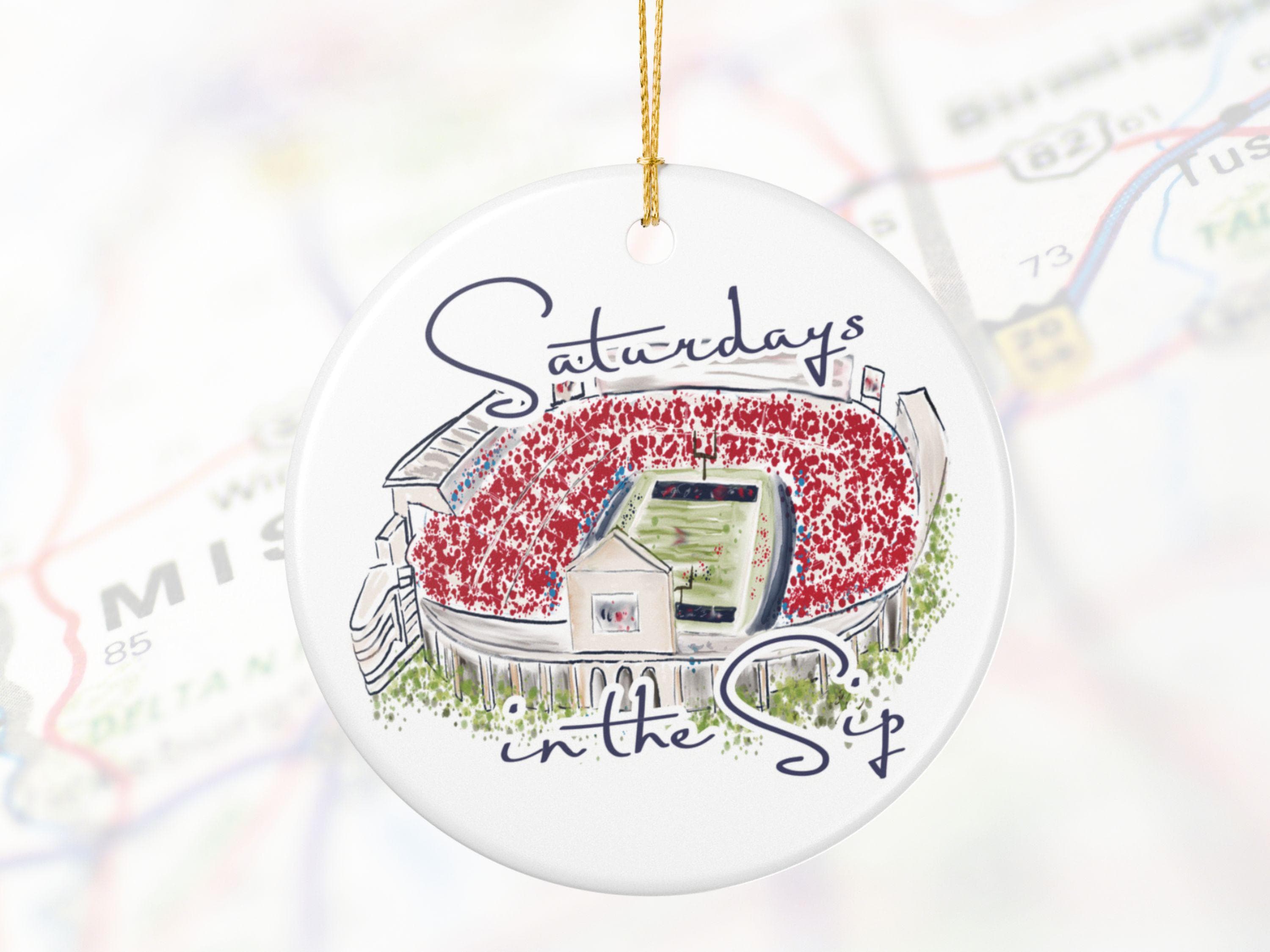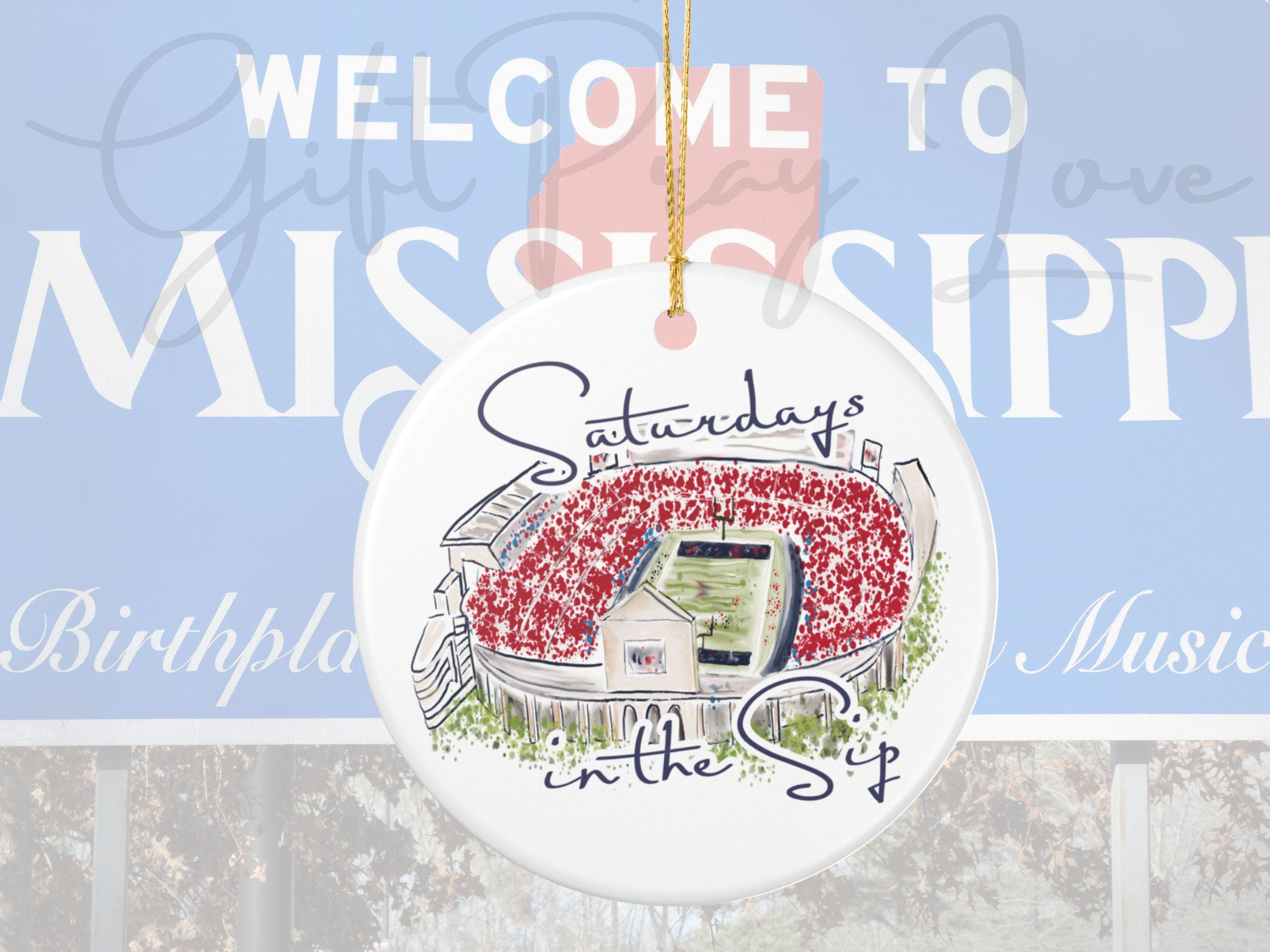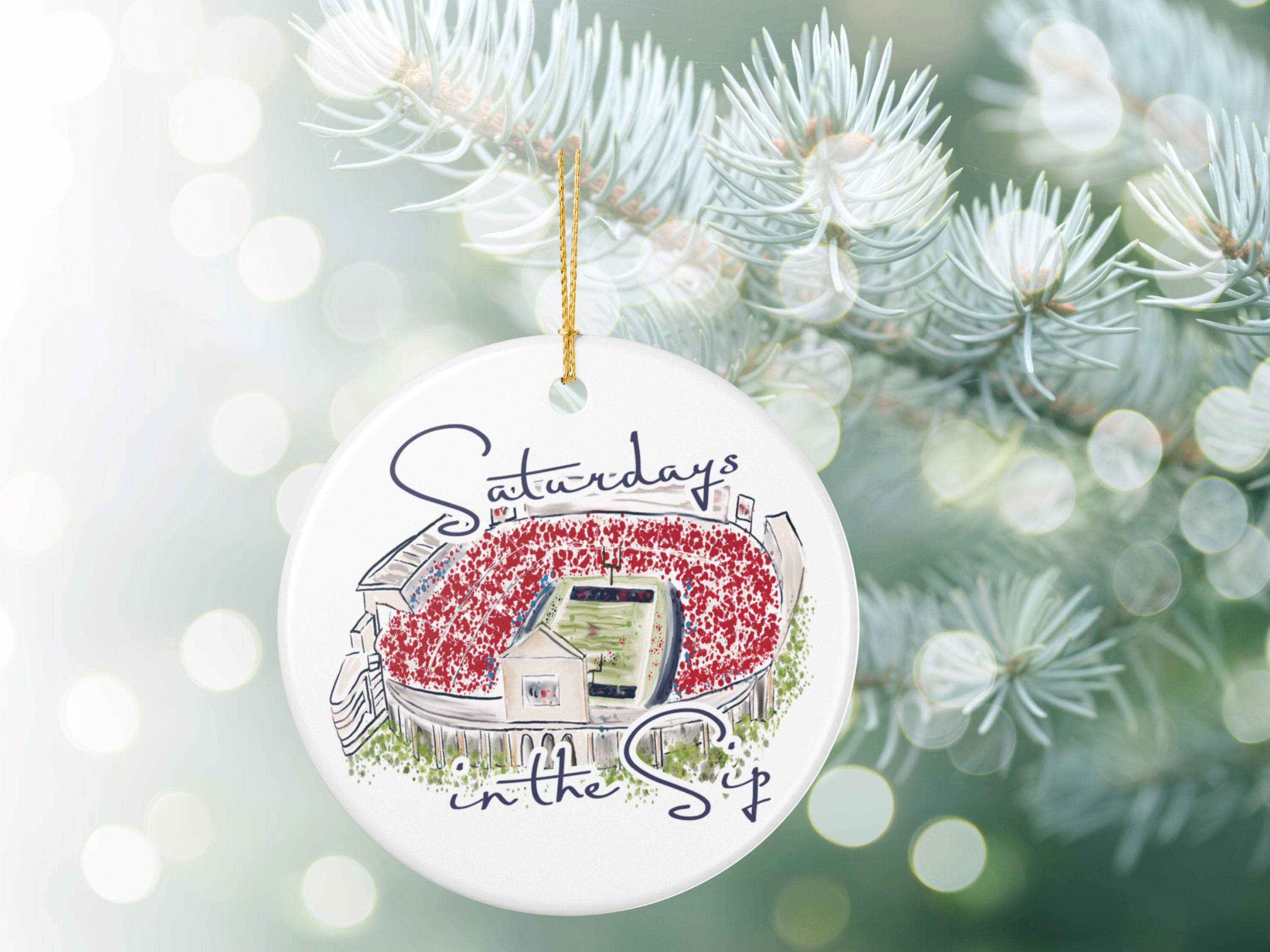 Celebrate the spirit of Mississippi gamedays with this beautifully illustrated “Saturdays in the Sip” ceramic ornament. Featuring a hand-drawn watercolor-style rendering of Vaught-Hemingway Stadium filled with a sea of red, this keepsake brings SEC football pride straight to your holiday décor.