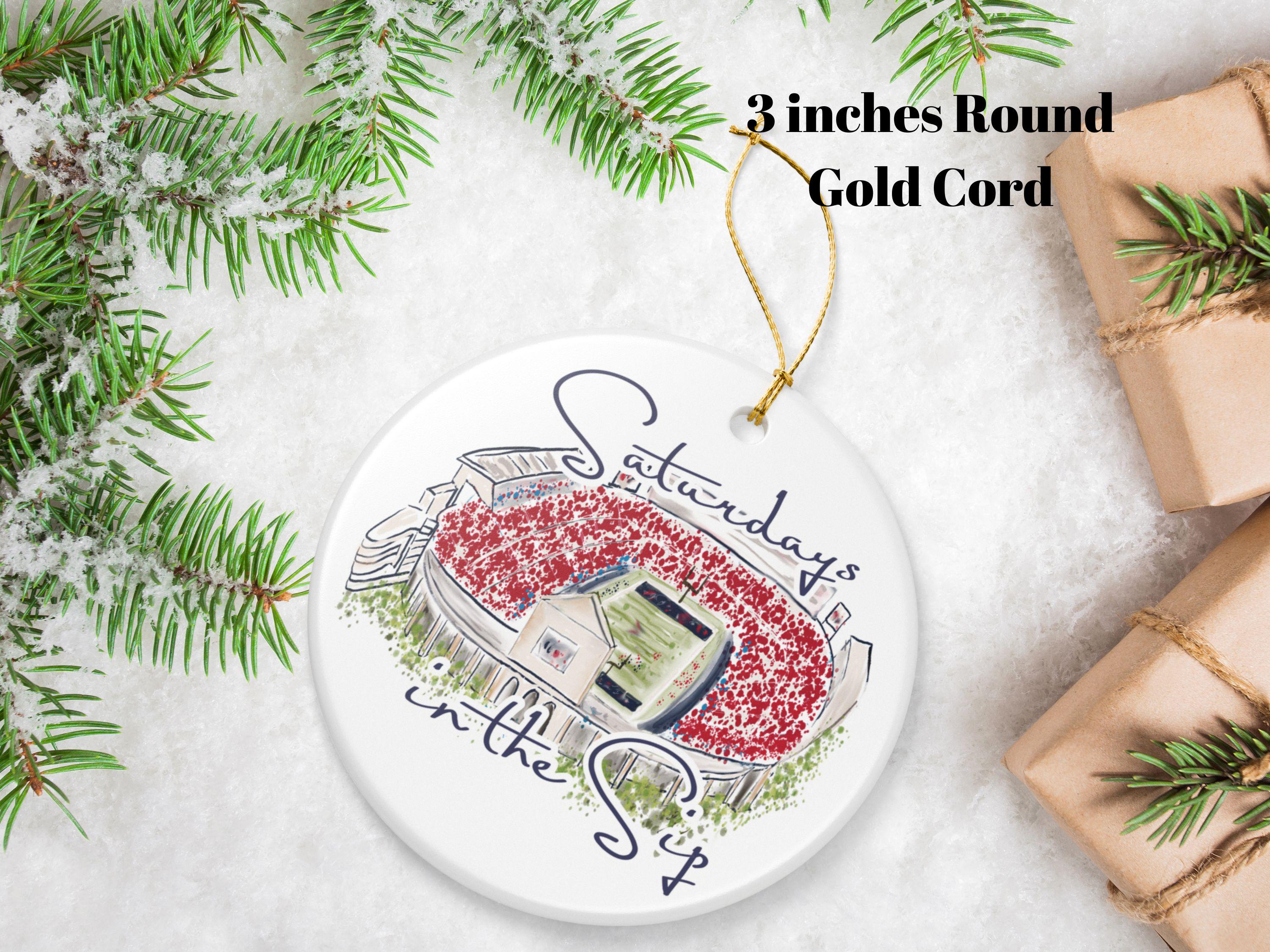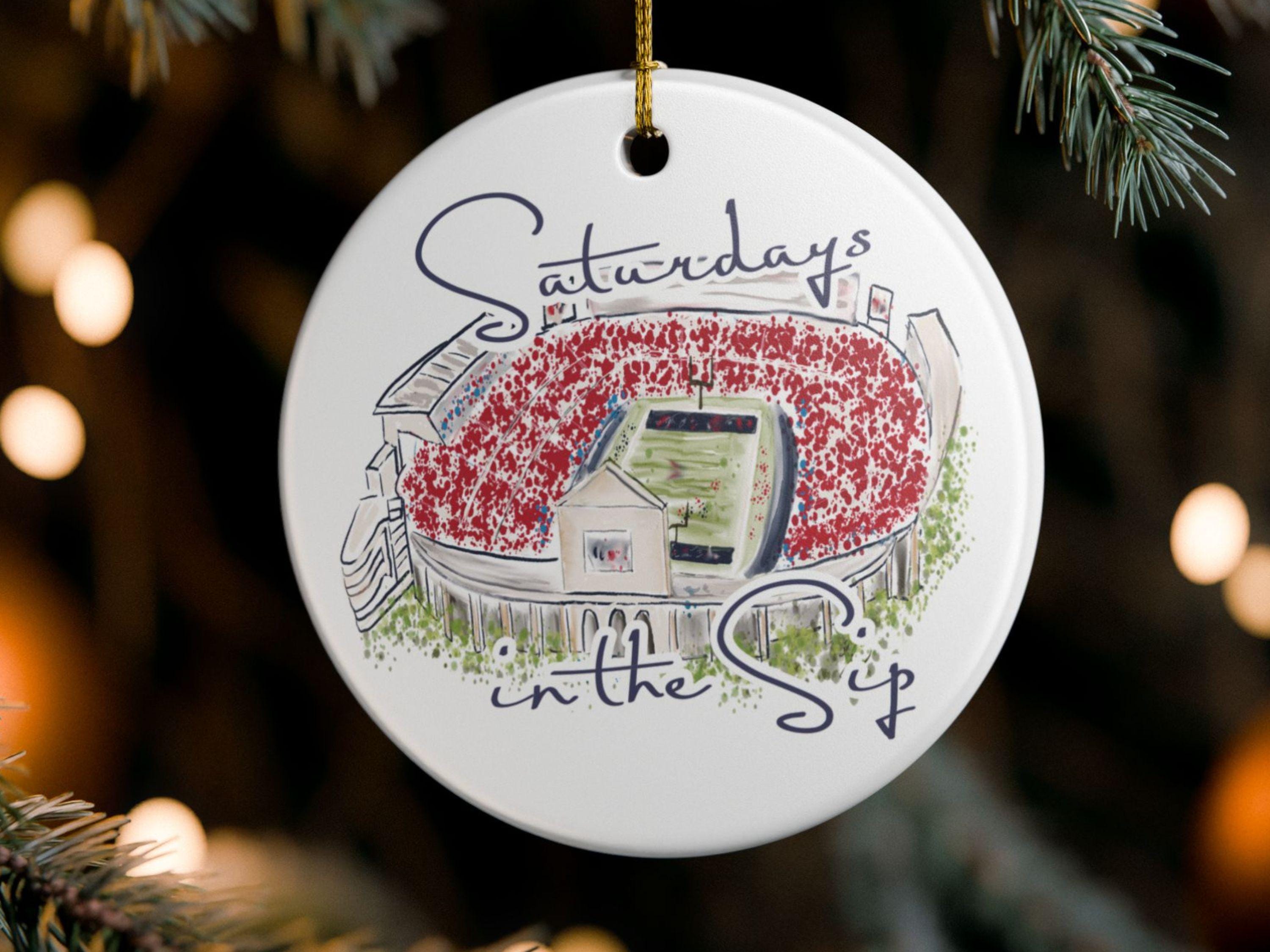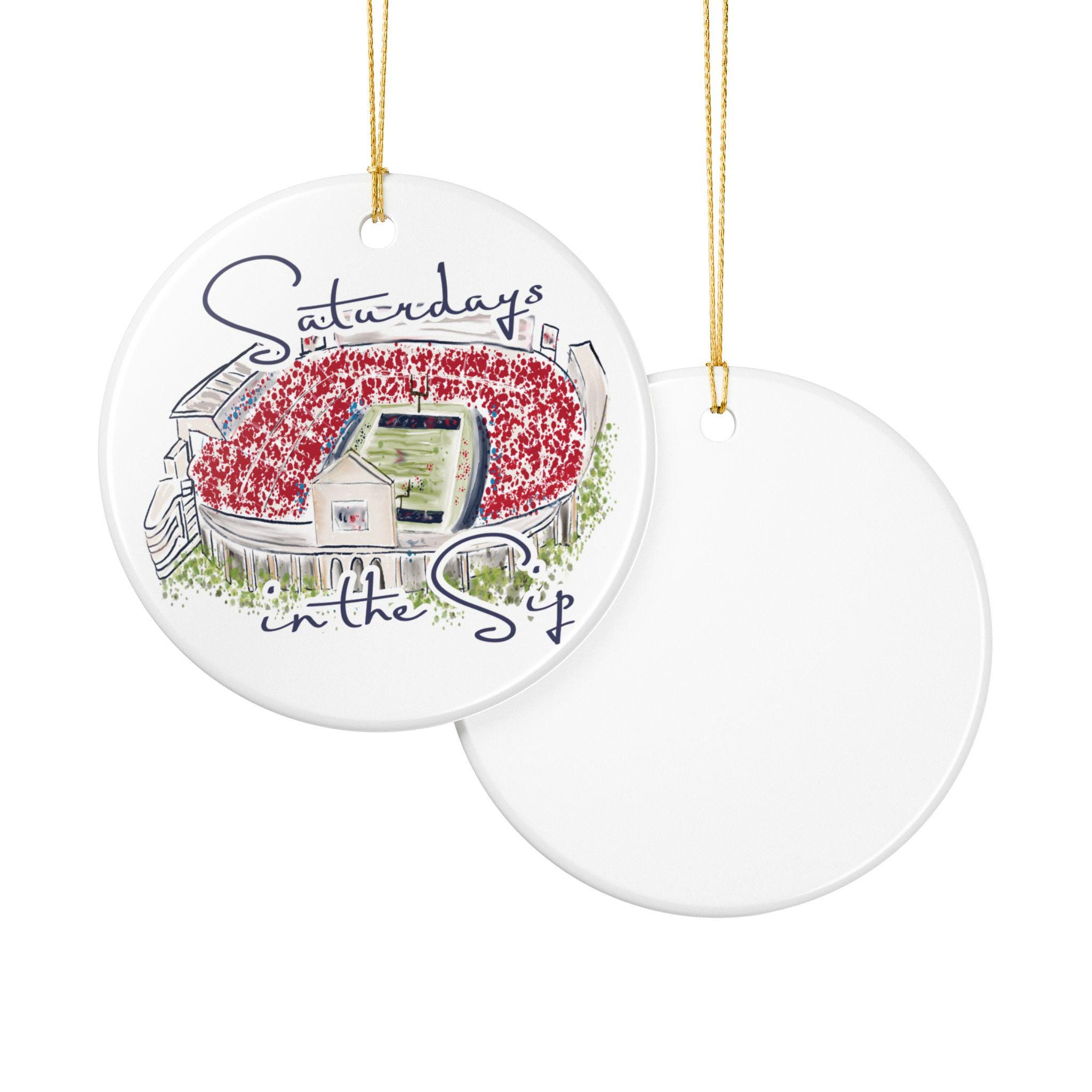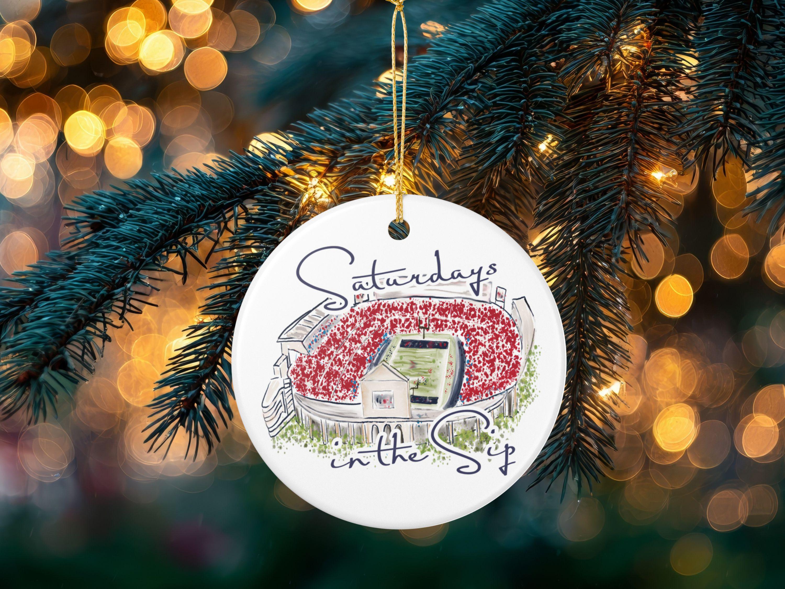 Celebrate the spirit of Mississippi gamedays with this beautifully illustrated “Saturdays in the Sip” ceramic ornament. Featuring a hand-drawn watercolor-style rendering of Vaught-Hemingway Stadium filled with a sea of red, this keepsake brings SEC football pride straight to your holiday décor.