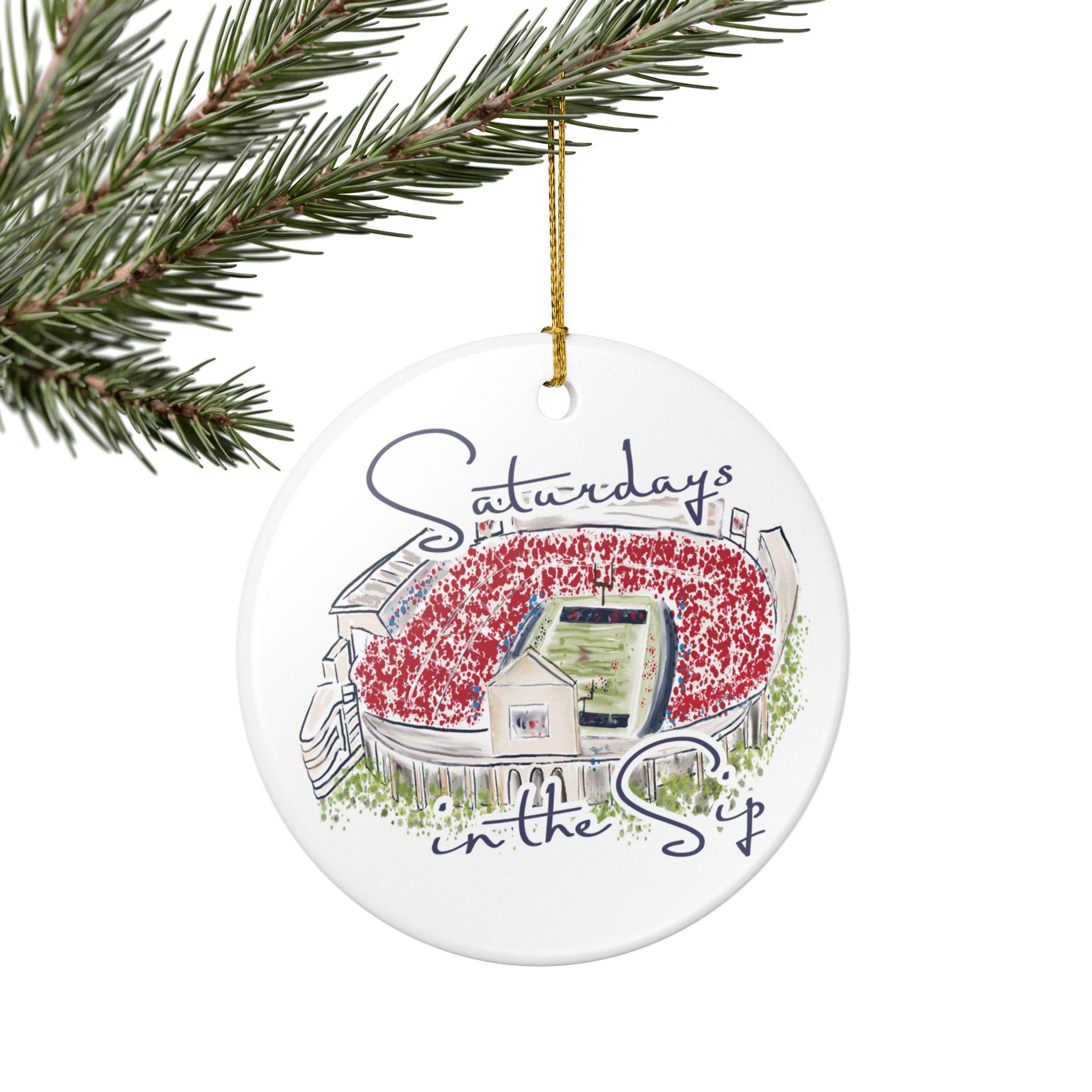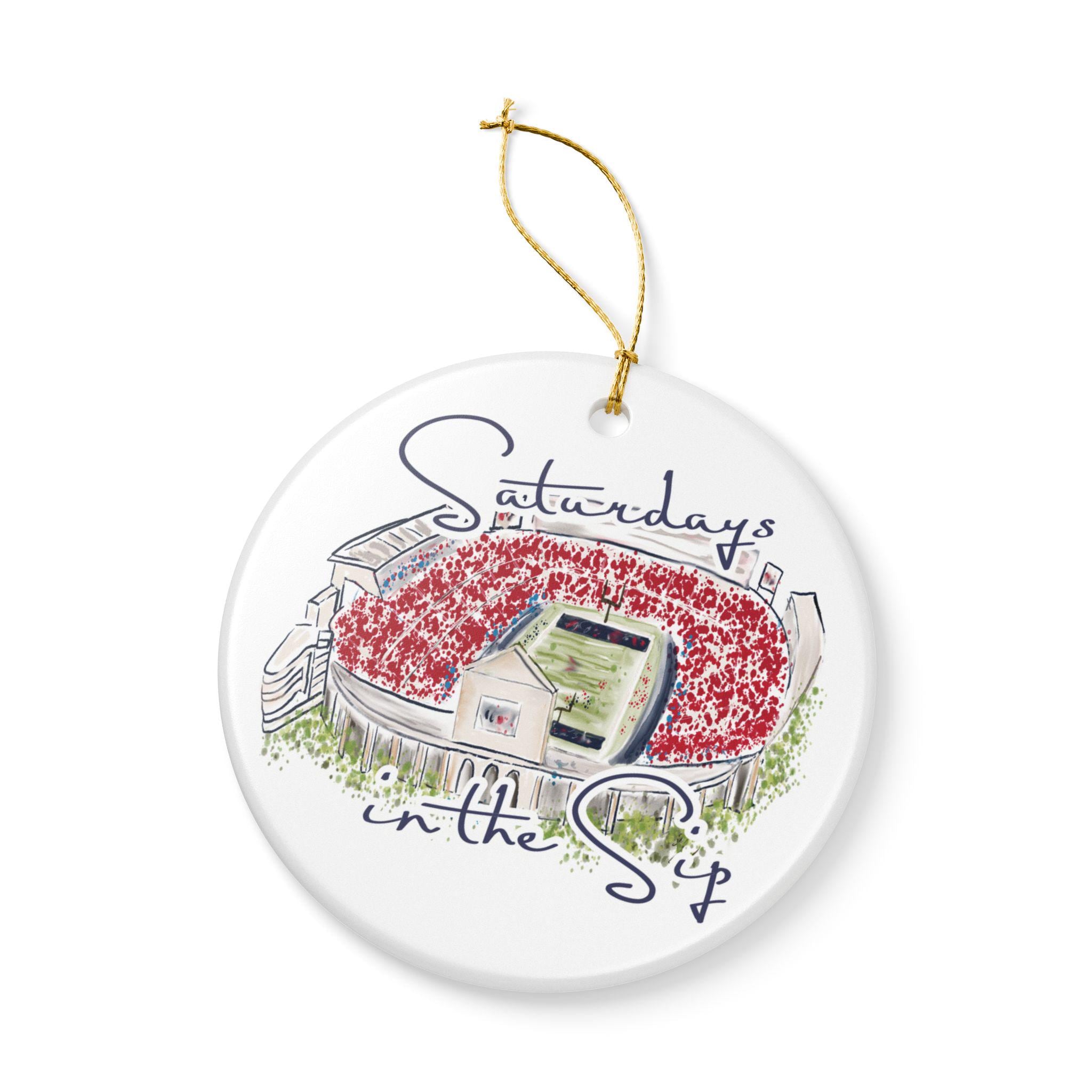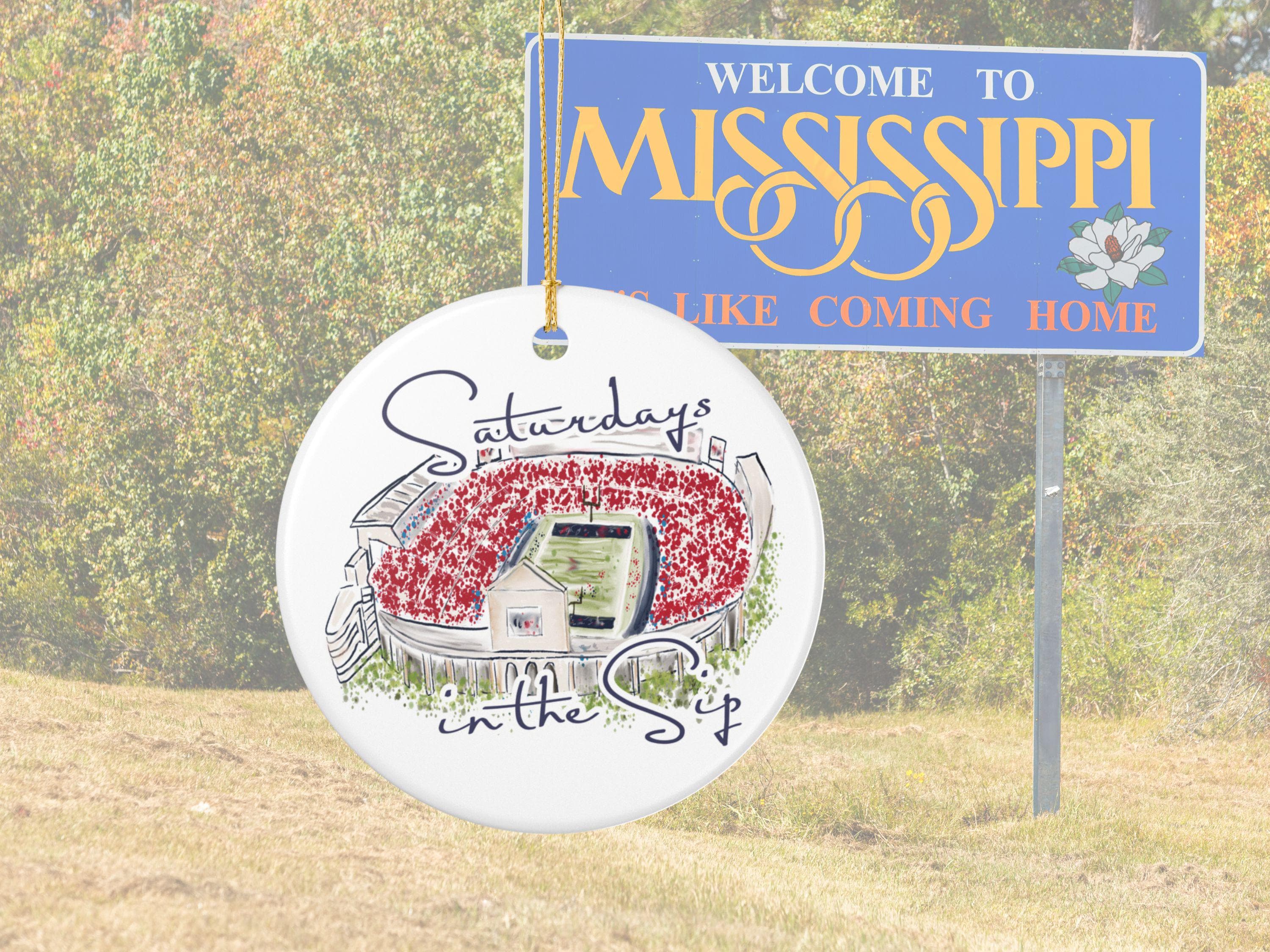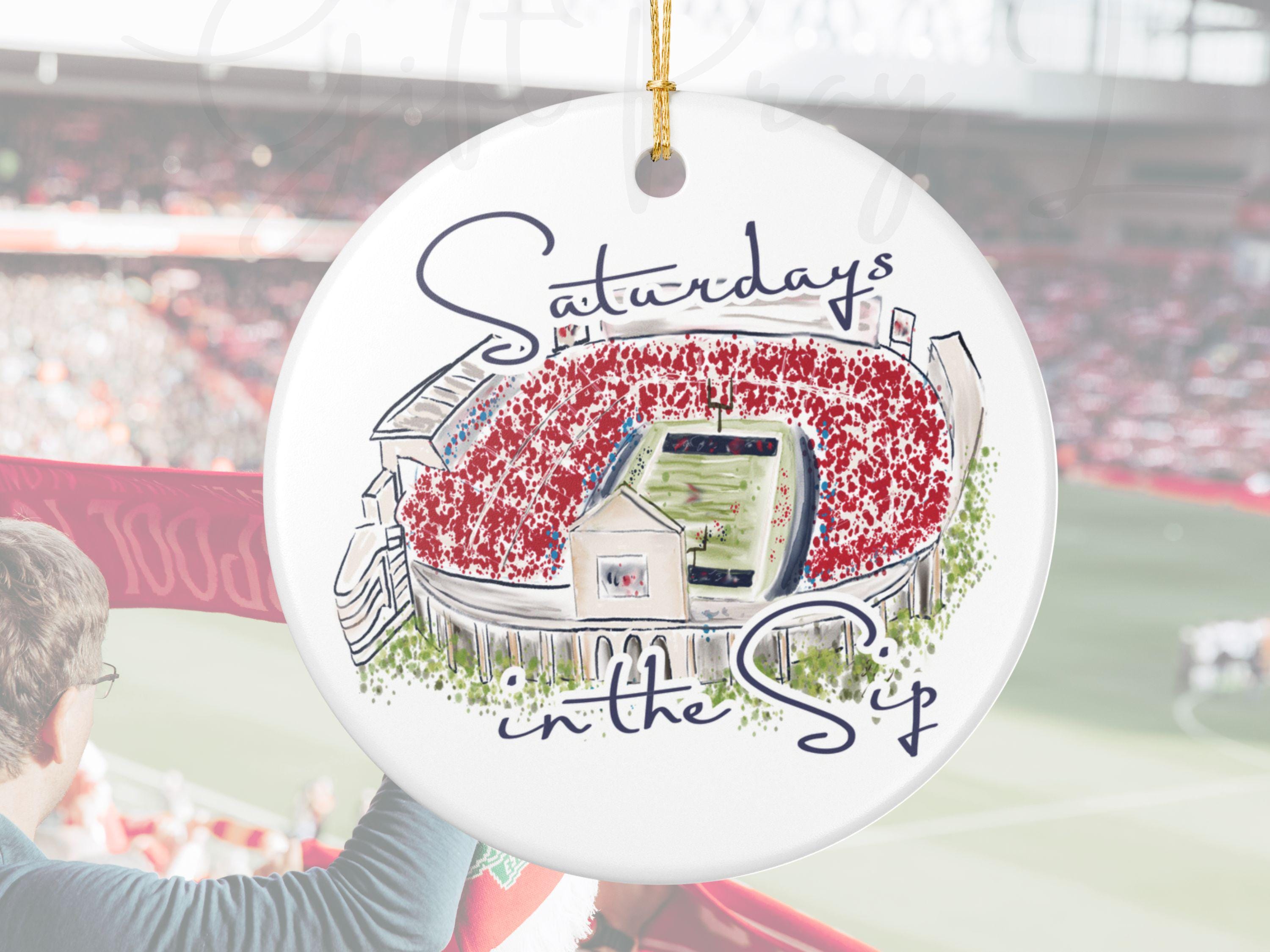 Celebrate the spirit of Mississippi gamedays with this beautifully illustrated “Saturdays in the Sip” ceramic ornament. Featuring a hand-drawn watercolor-style rendering of Vaught-Hemingway Stadium filled with a sea of red, this keepsake brings SEC football pride straight to your holiday décor.