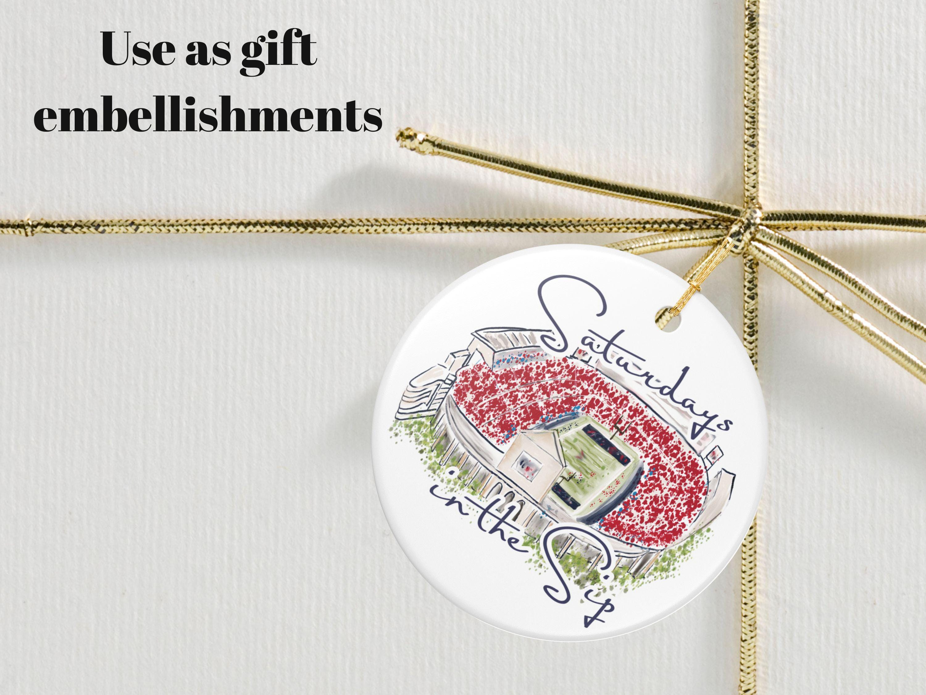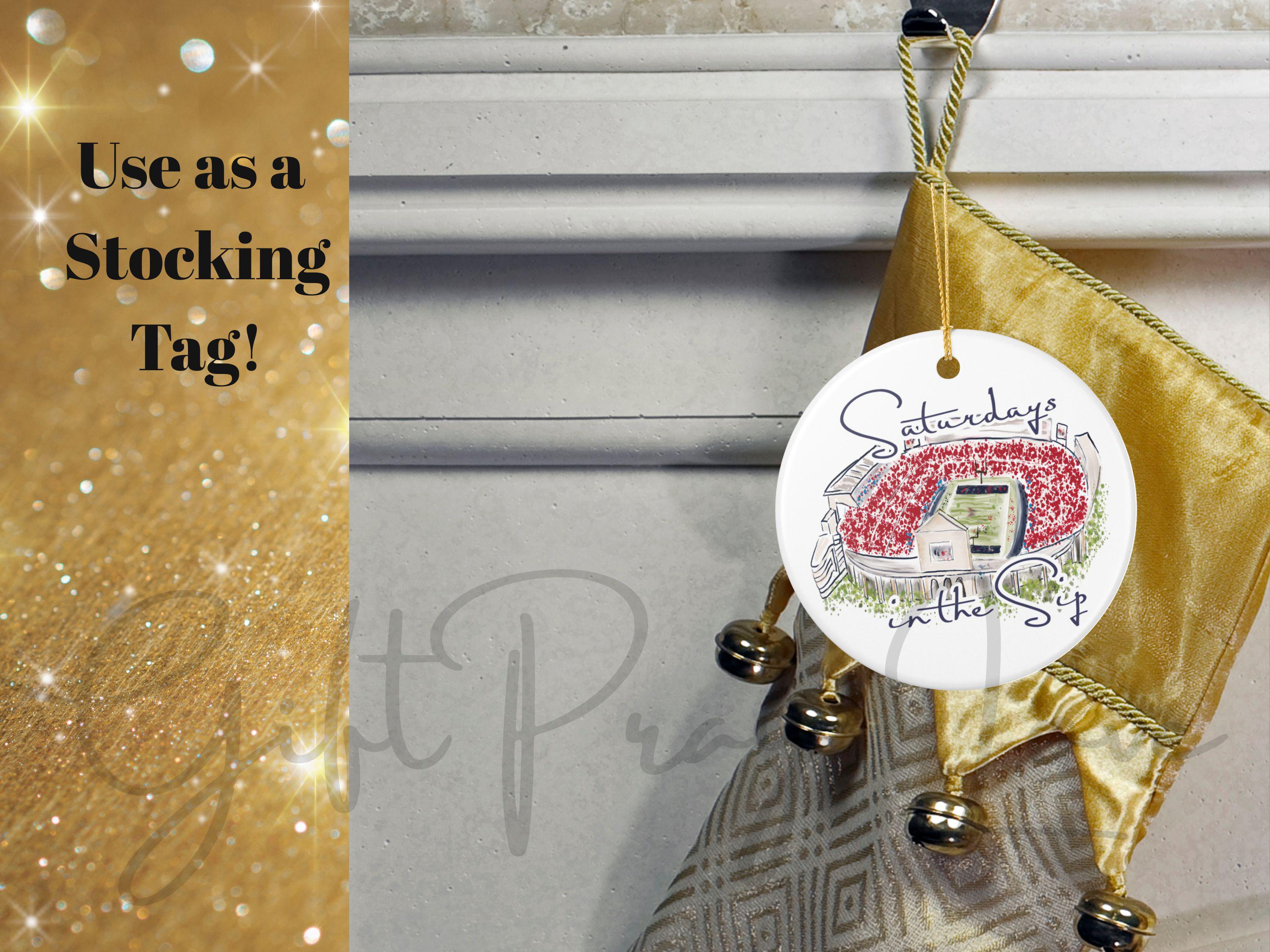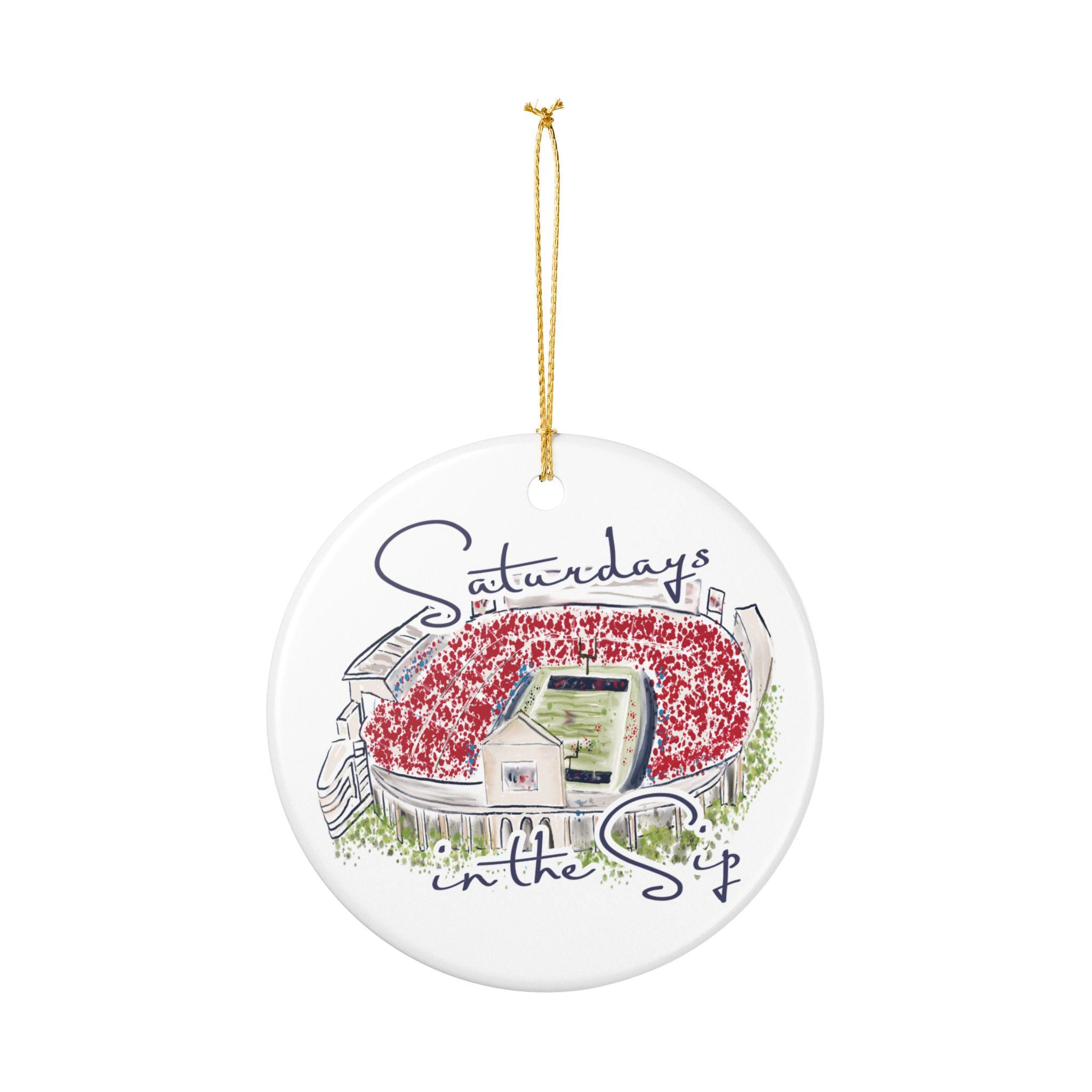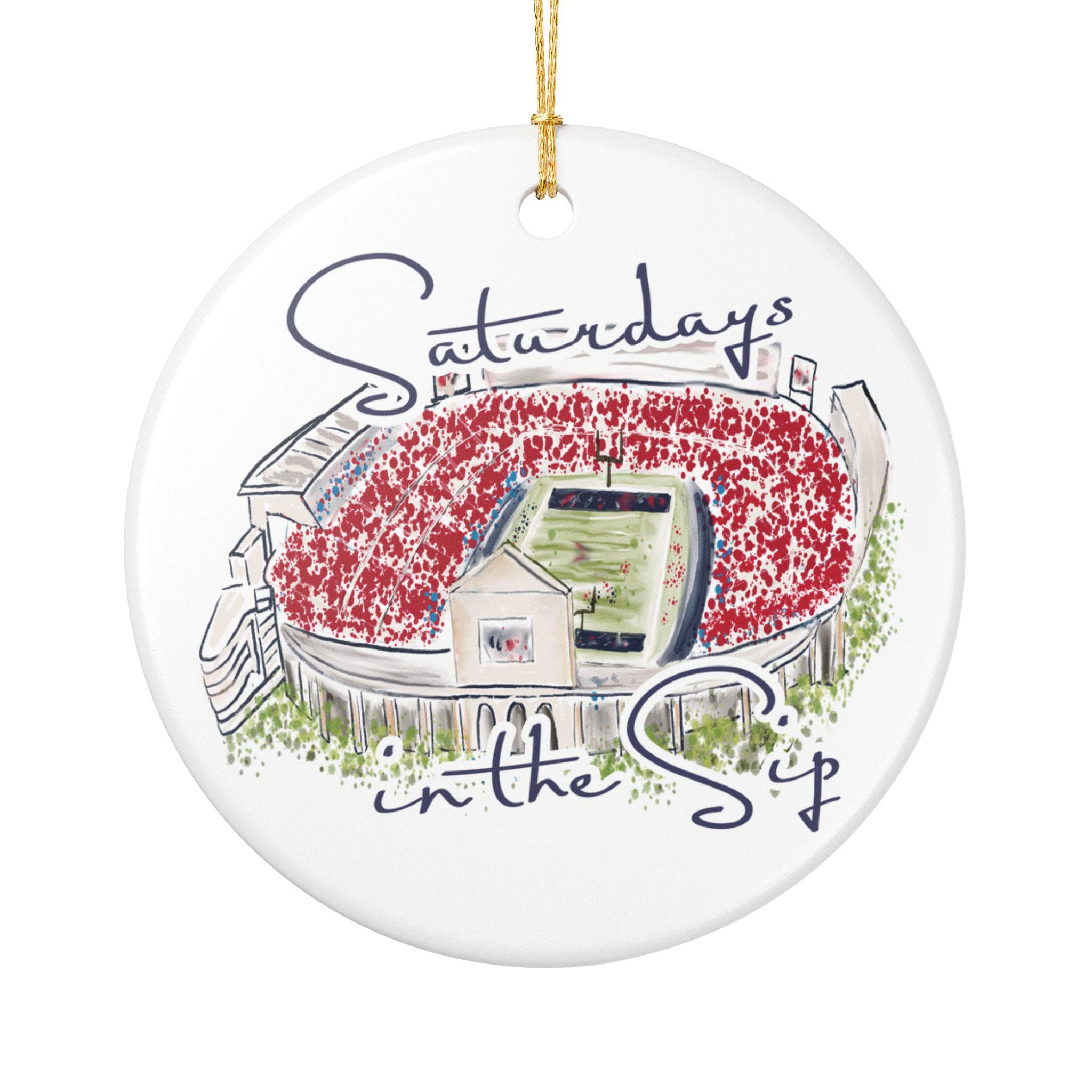 Celebrate the spirit of Mississippi gamedays with this beautifully illustrated “Saturdays in the Sip” ceramic ornament. Featuring a hand-drawn watercolor-style rendering of Vaught-Hemingway Stadium filled with a sea of red, this keepsake brings SEC football pride straight to your holiday décor.